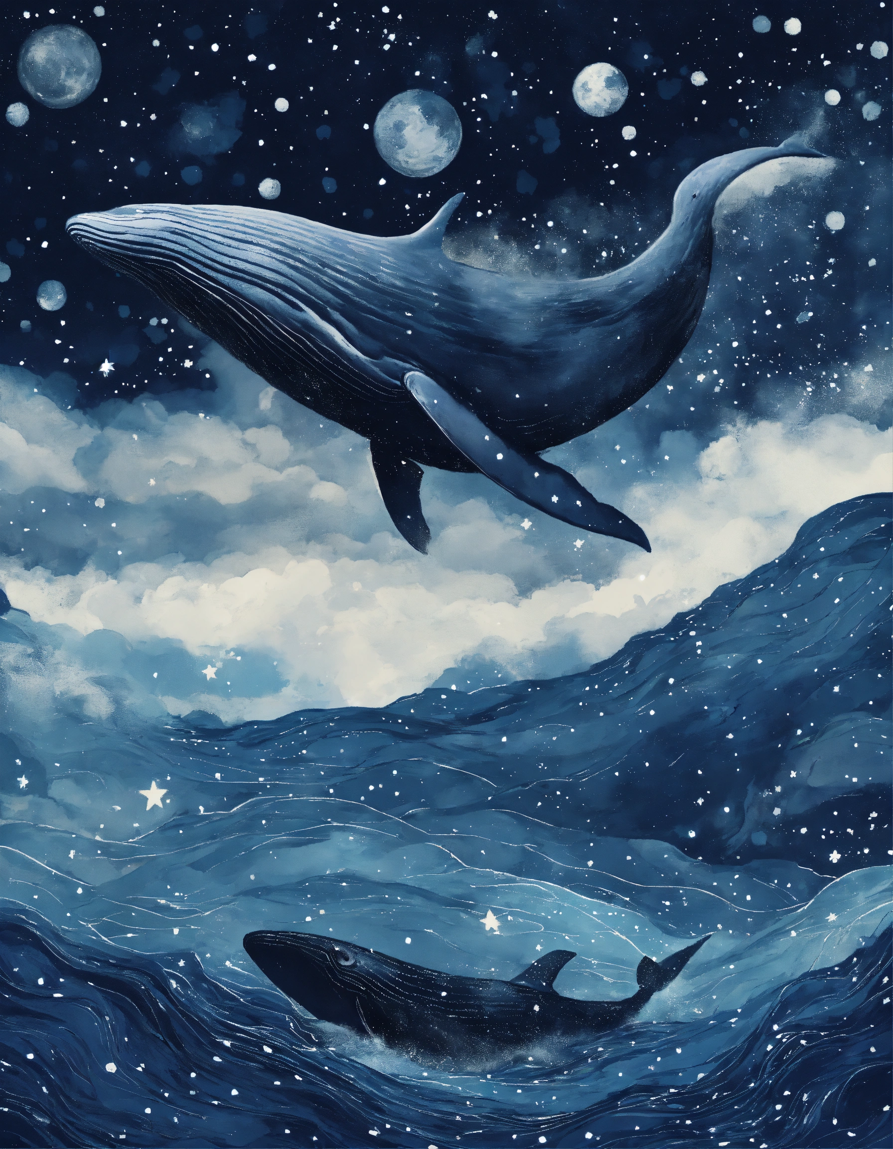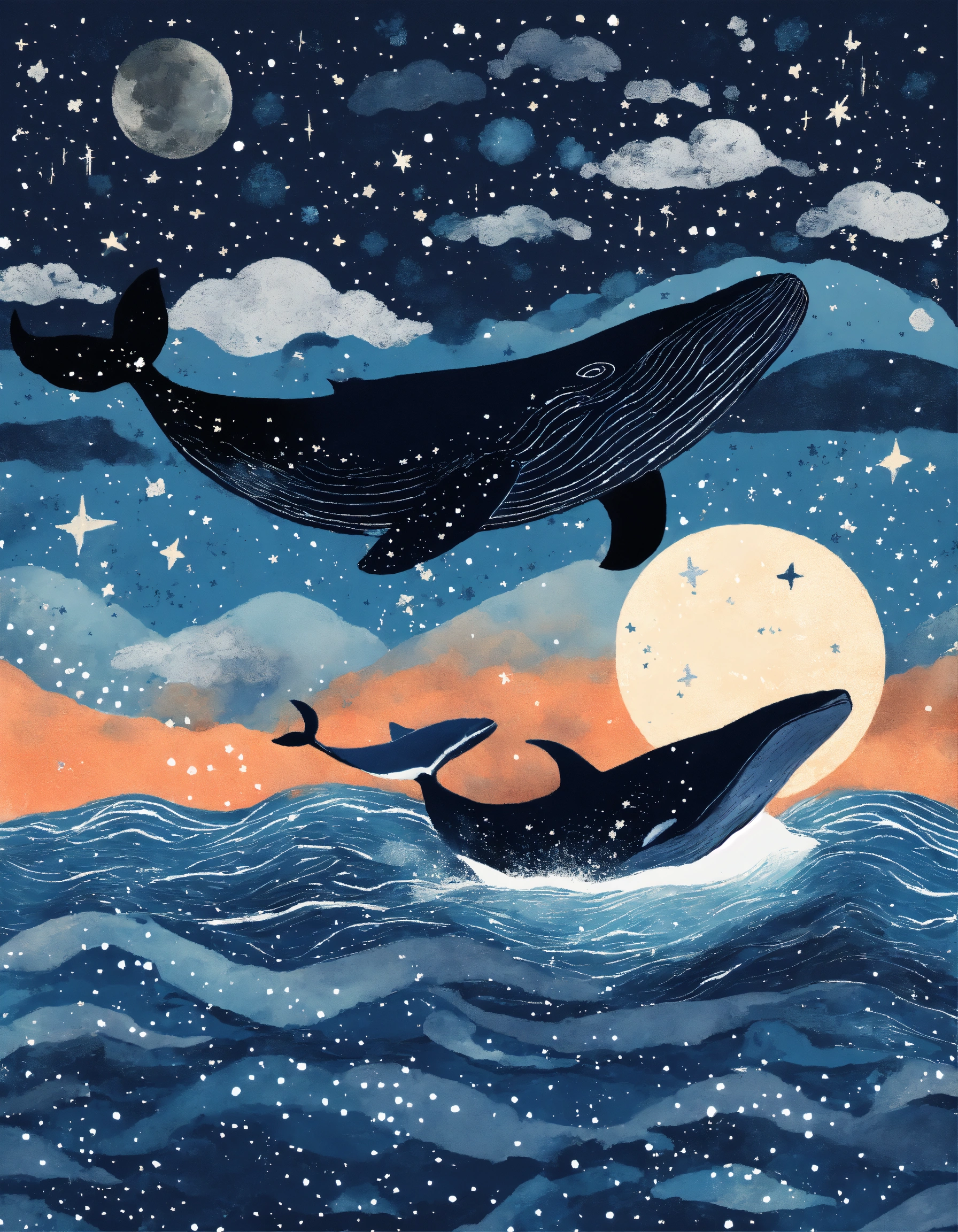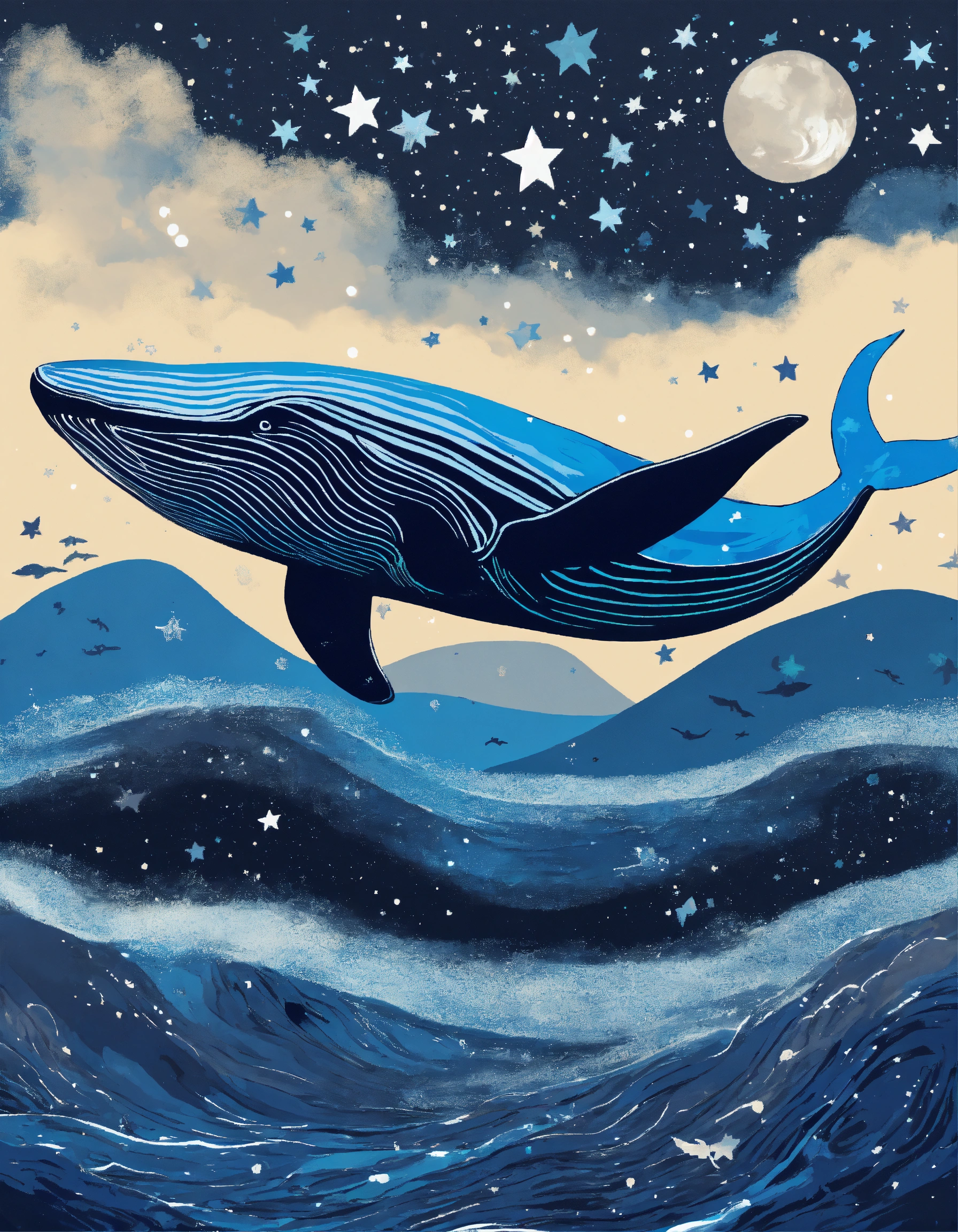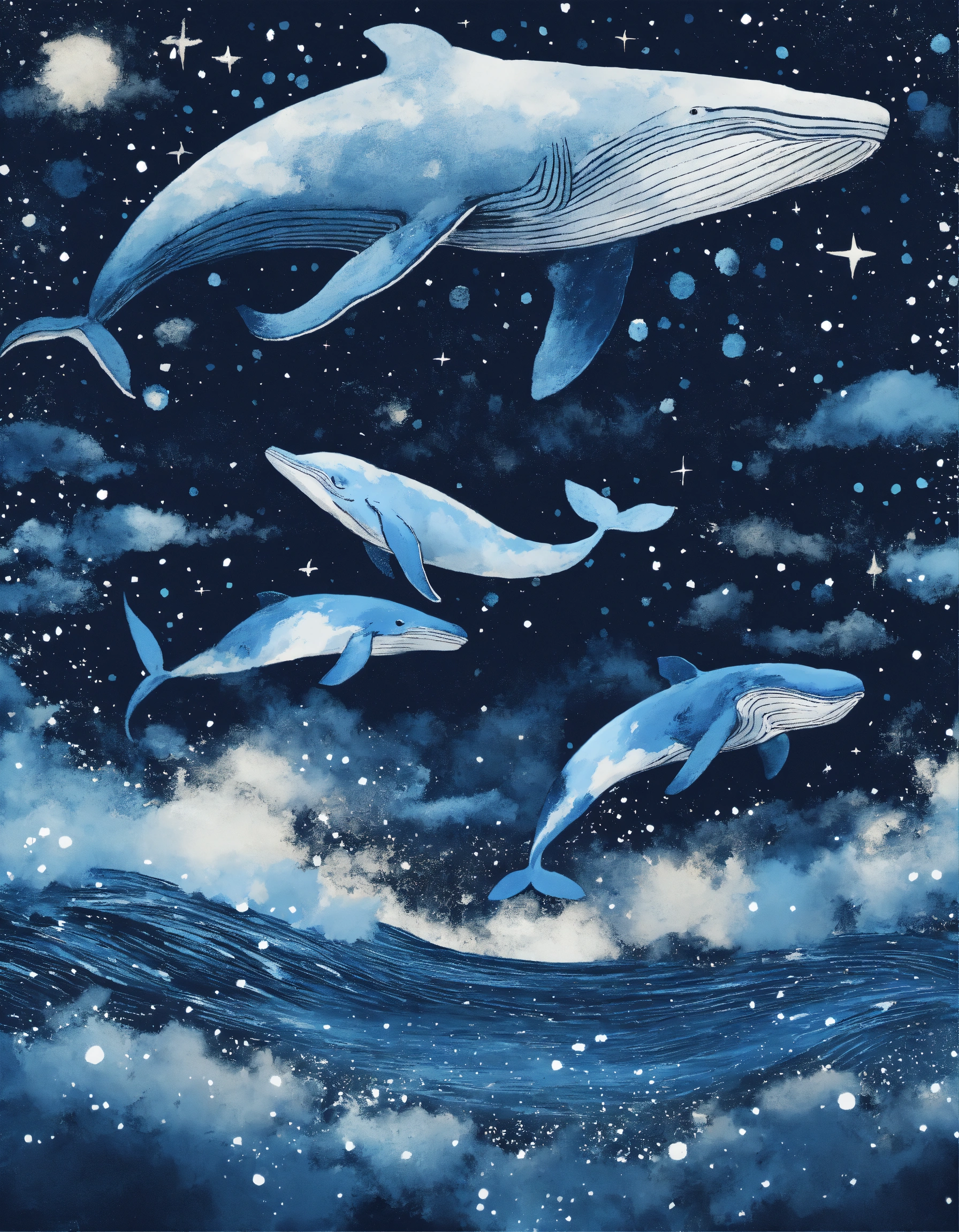 Gigantic whales are flying in starry night, simple stile, texture painting, texture vector illustration, dreamy blue colors, black white and gray colors, lots of brush texture