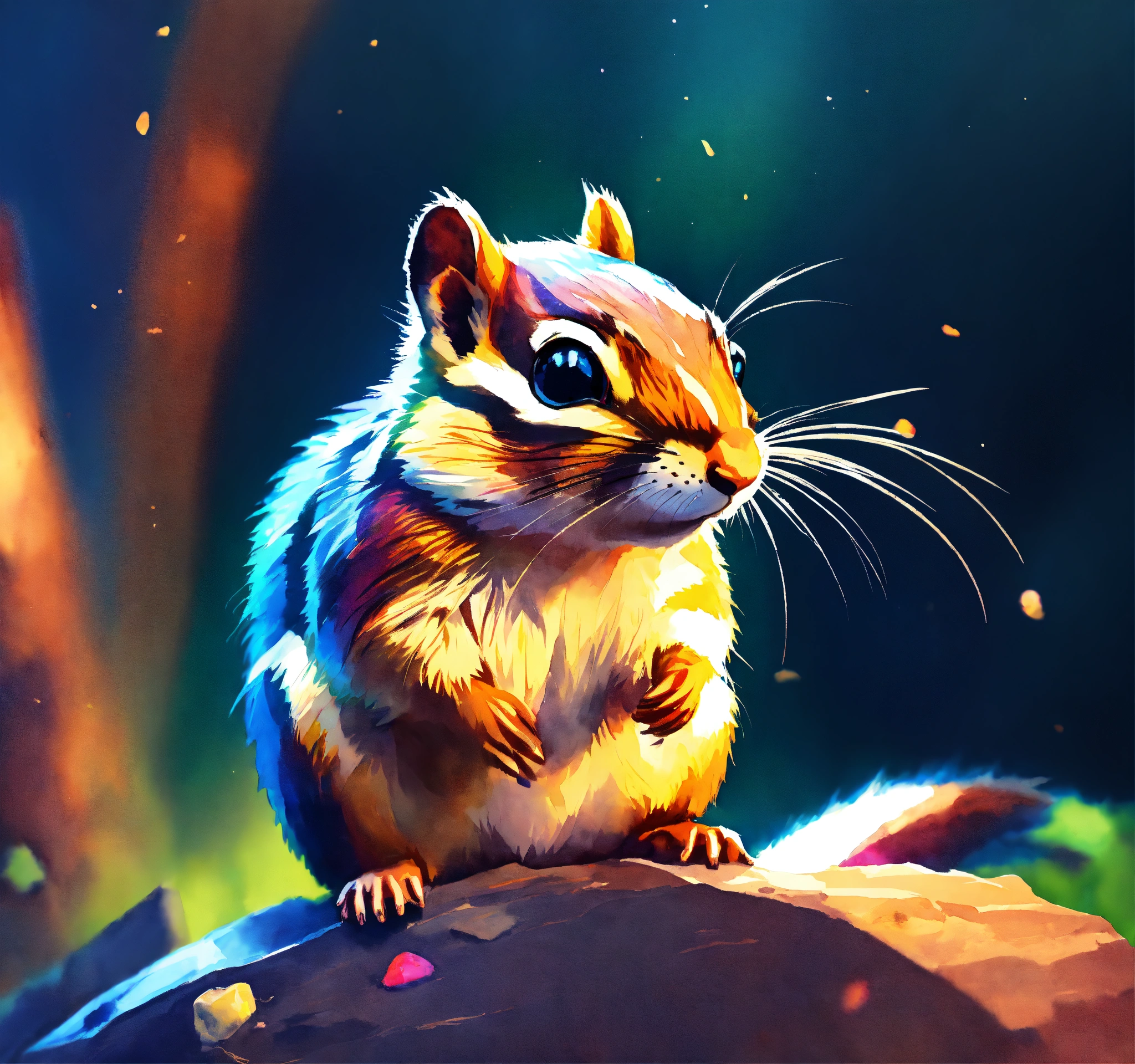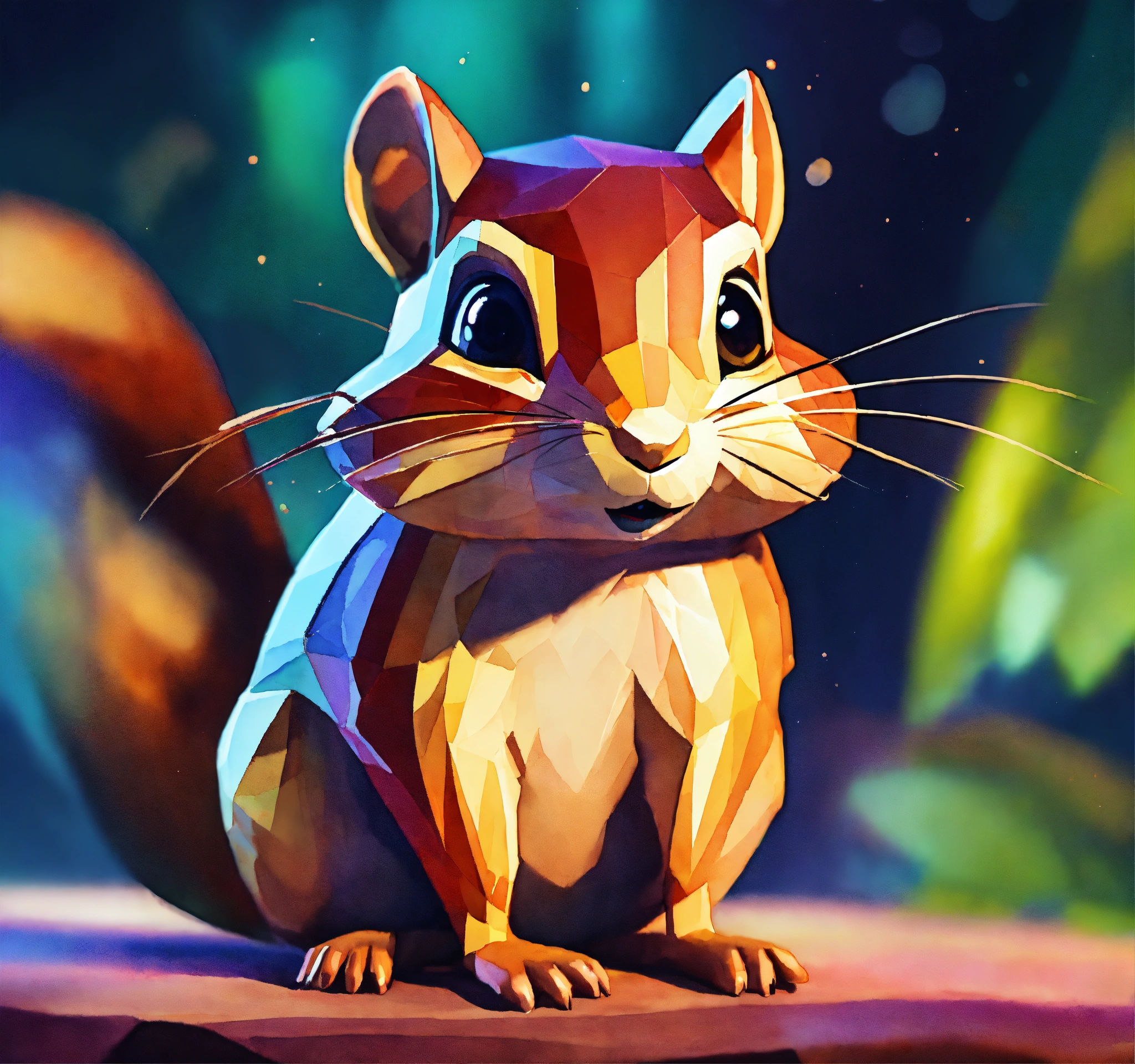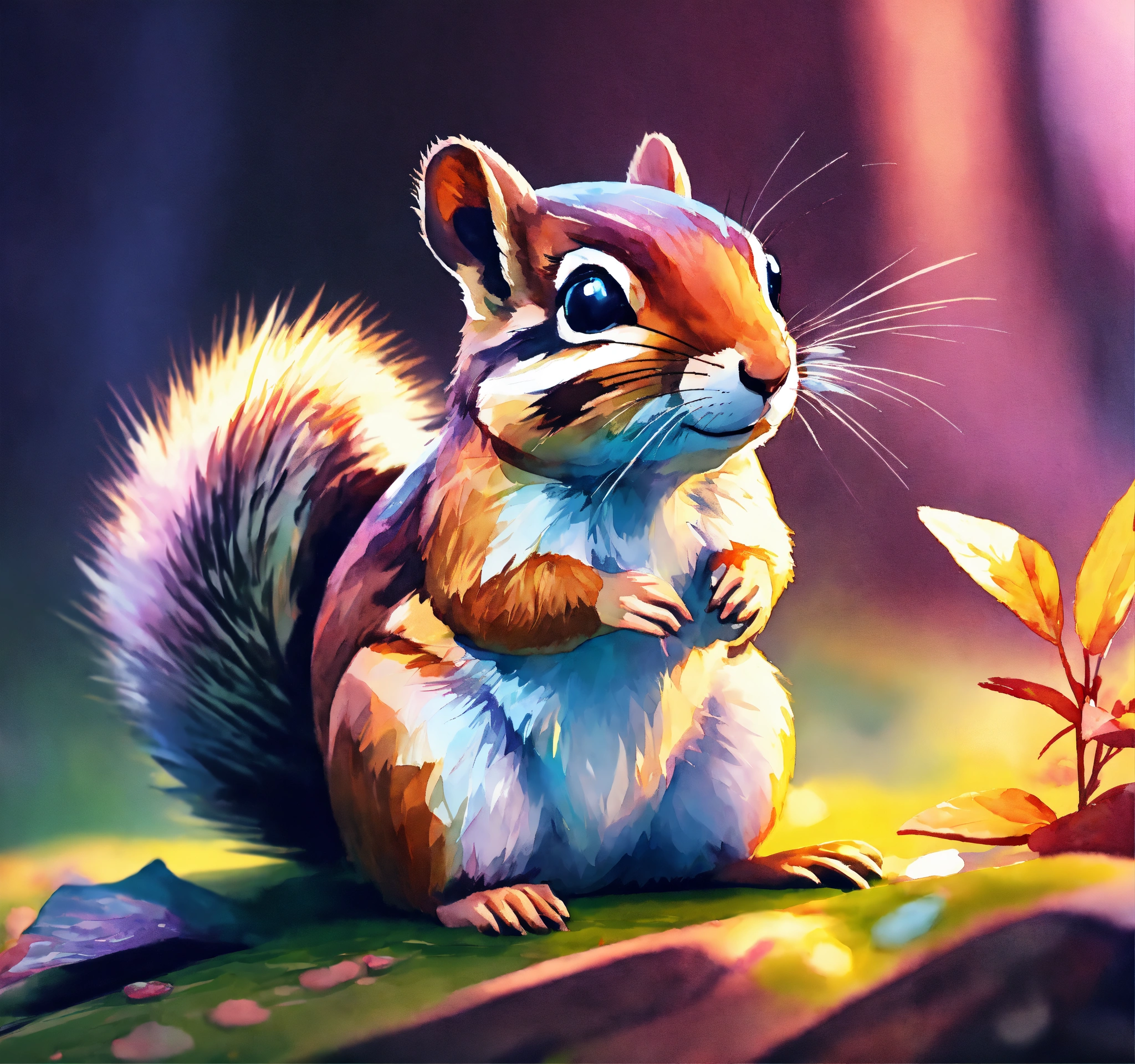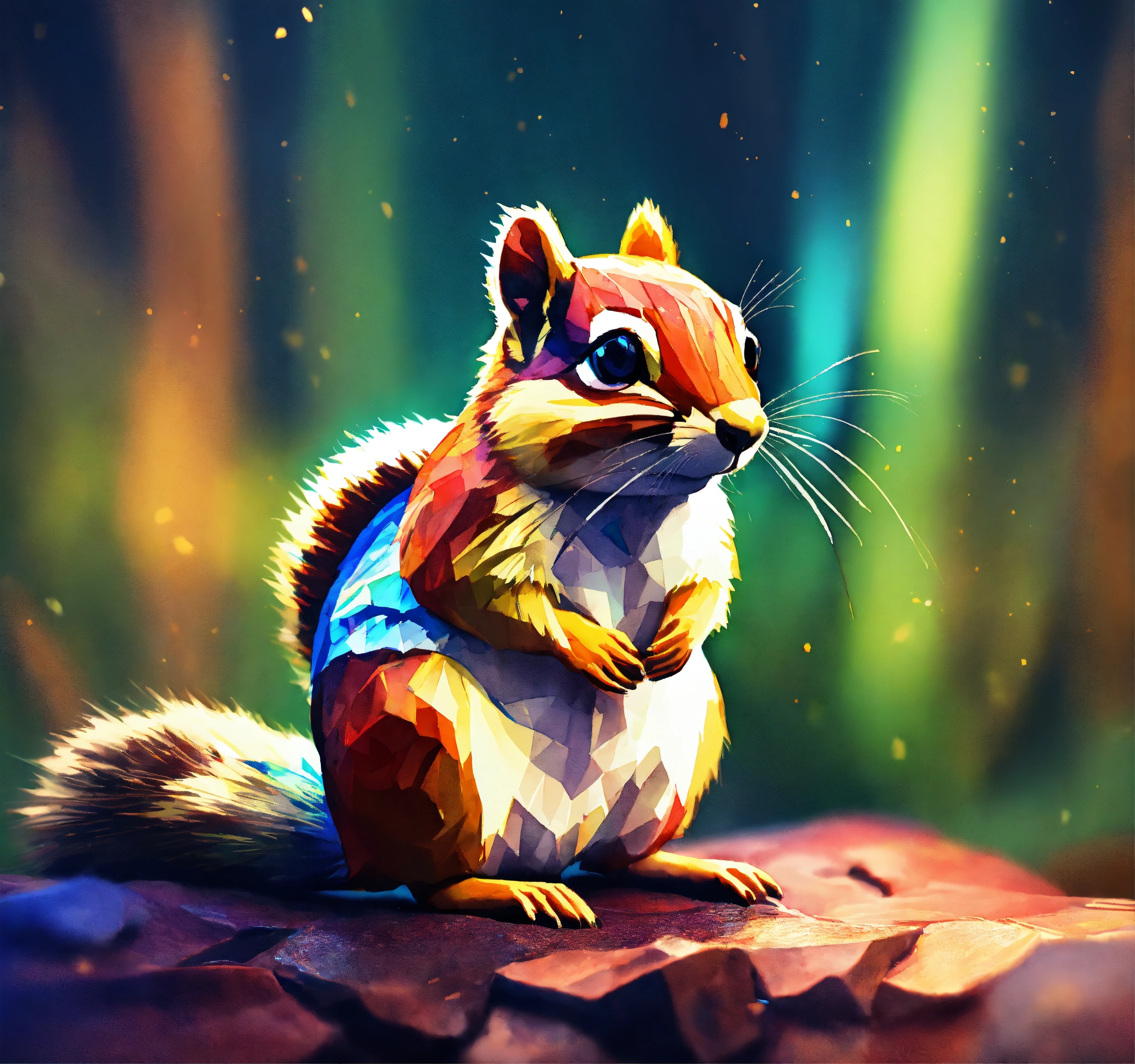 Stylized chipmunk, vignette cinematic lighting, iridescent strobe lighting effects, mid poly style, hyper abstract watercolor, storybook, illustration, v3, 5