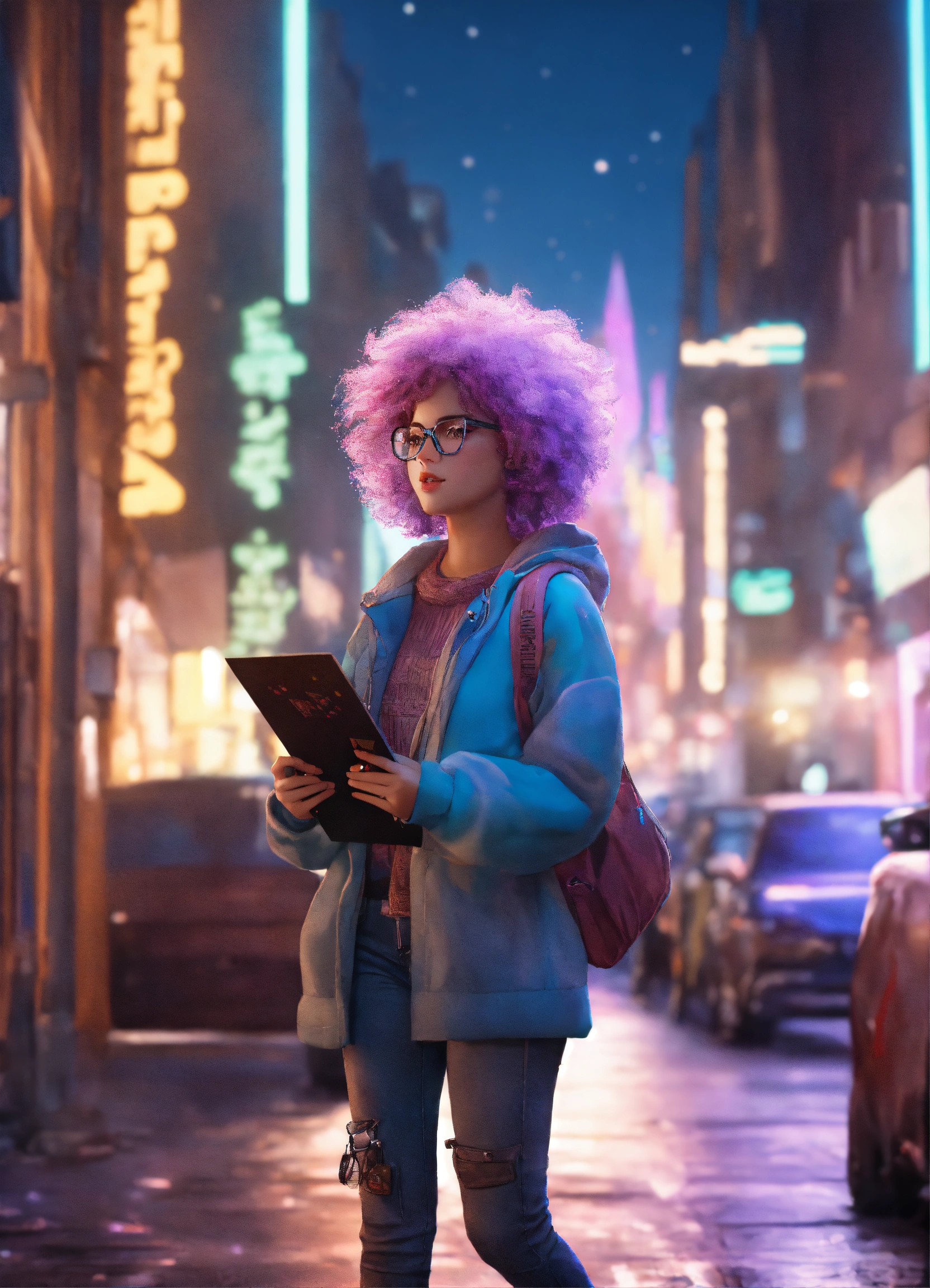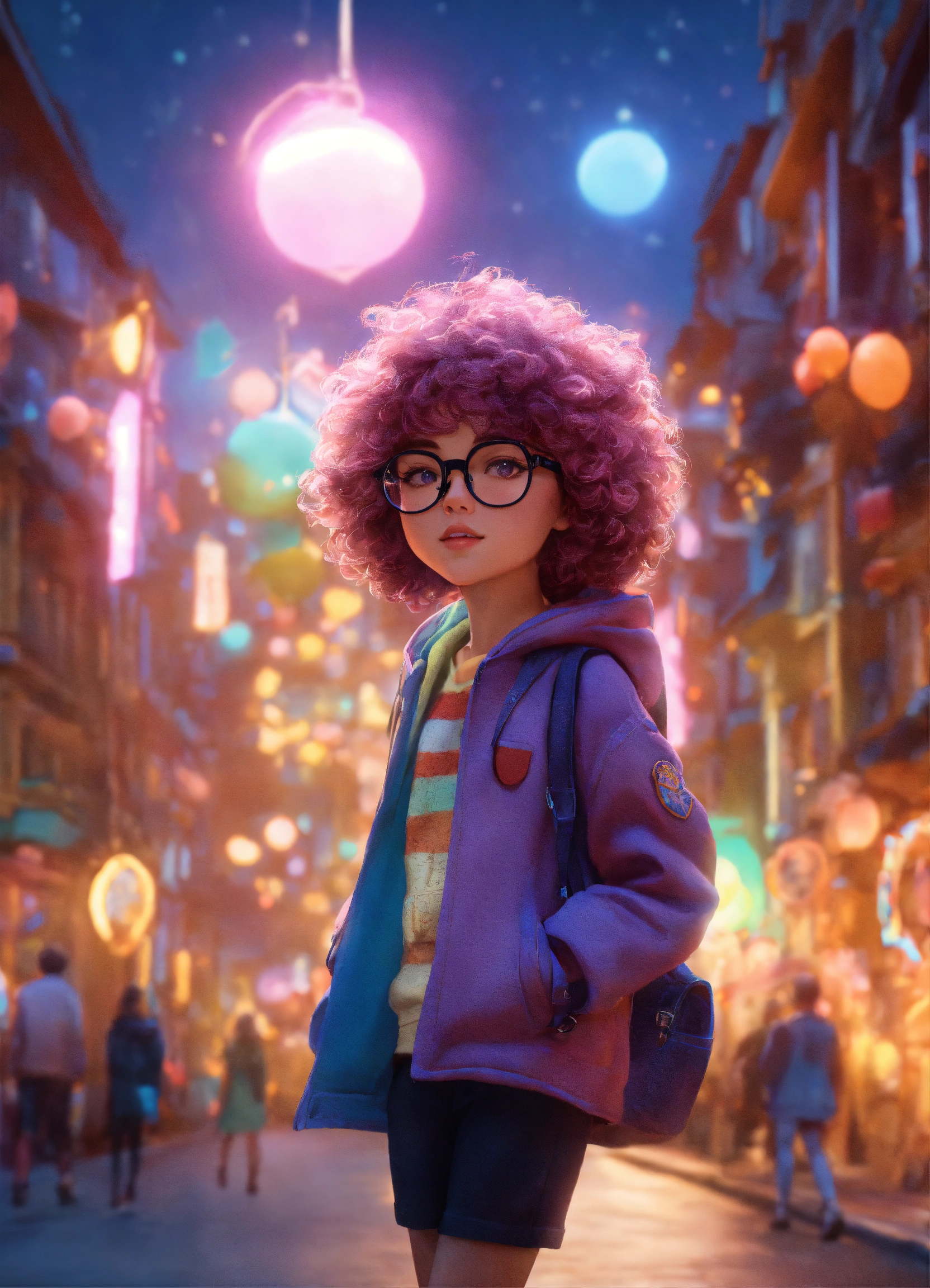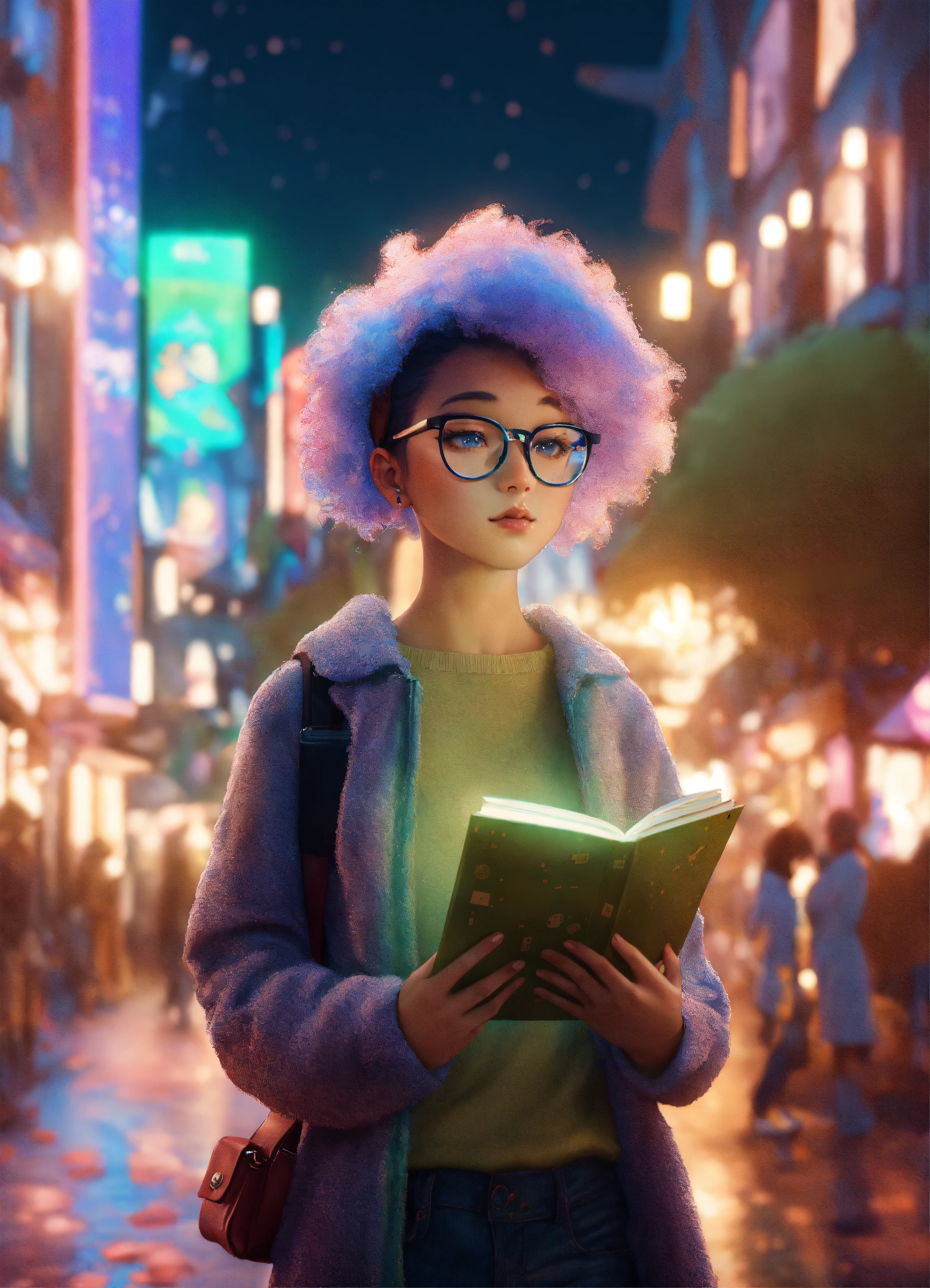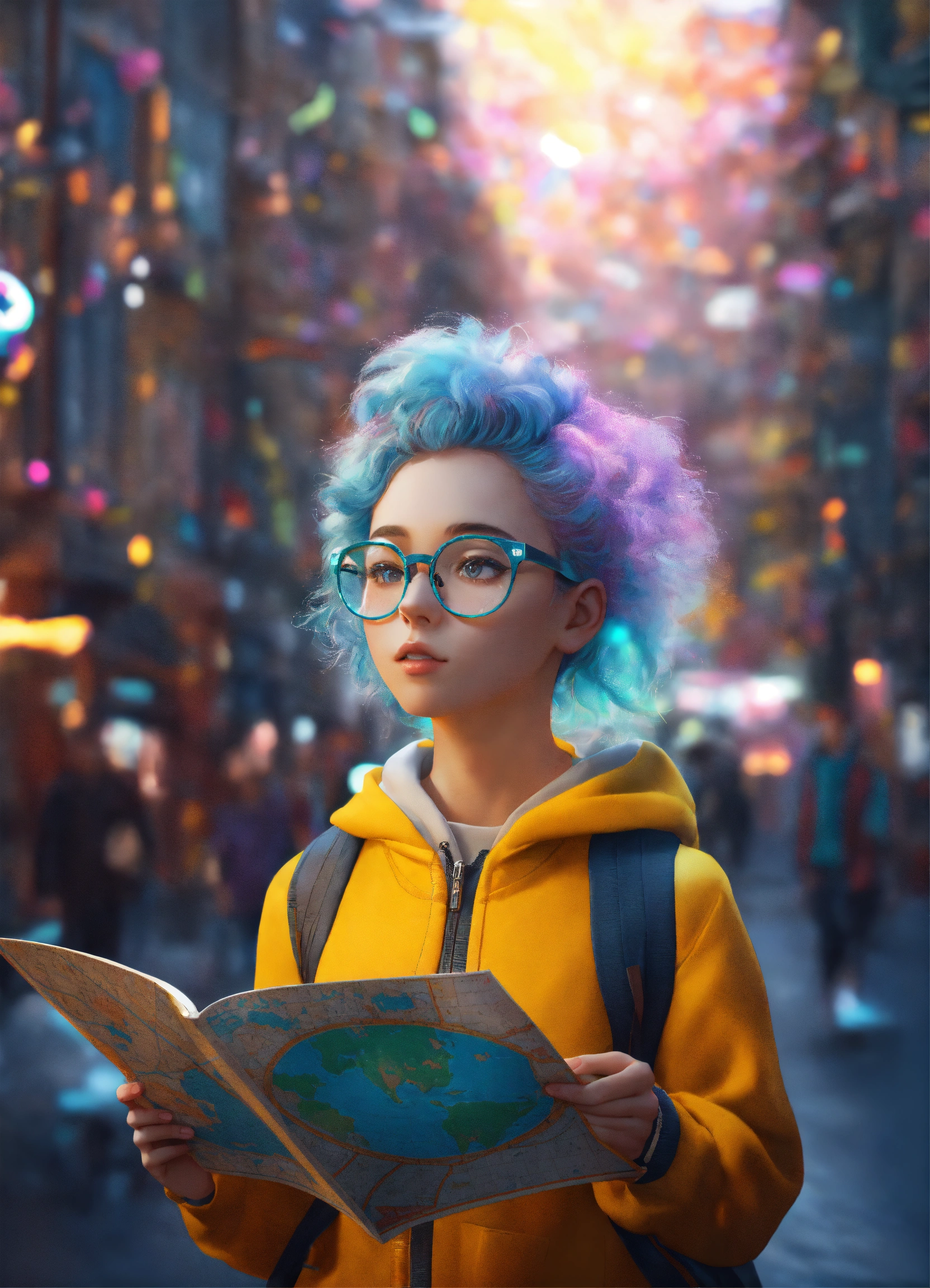 Cute people looking for maps all over street from another universe, wearing glasses, magical and dreamy, cute, octane render, 8k, ornamental cenary, fantasy colors, ultra realistic, fluffy, soft texture, high quality, futuristic cute, cute little fluffy hair