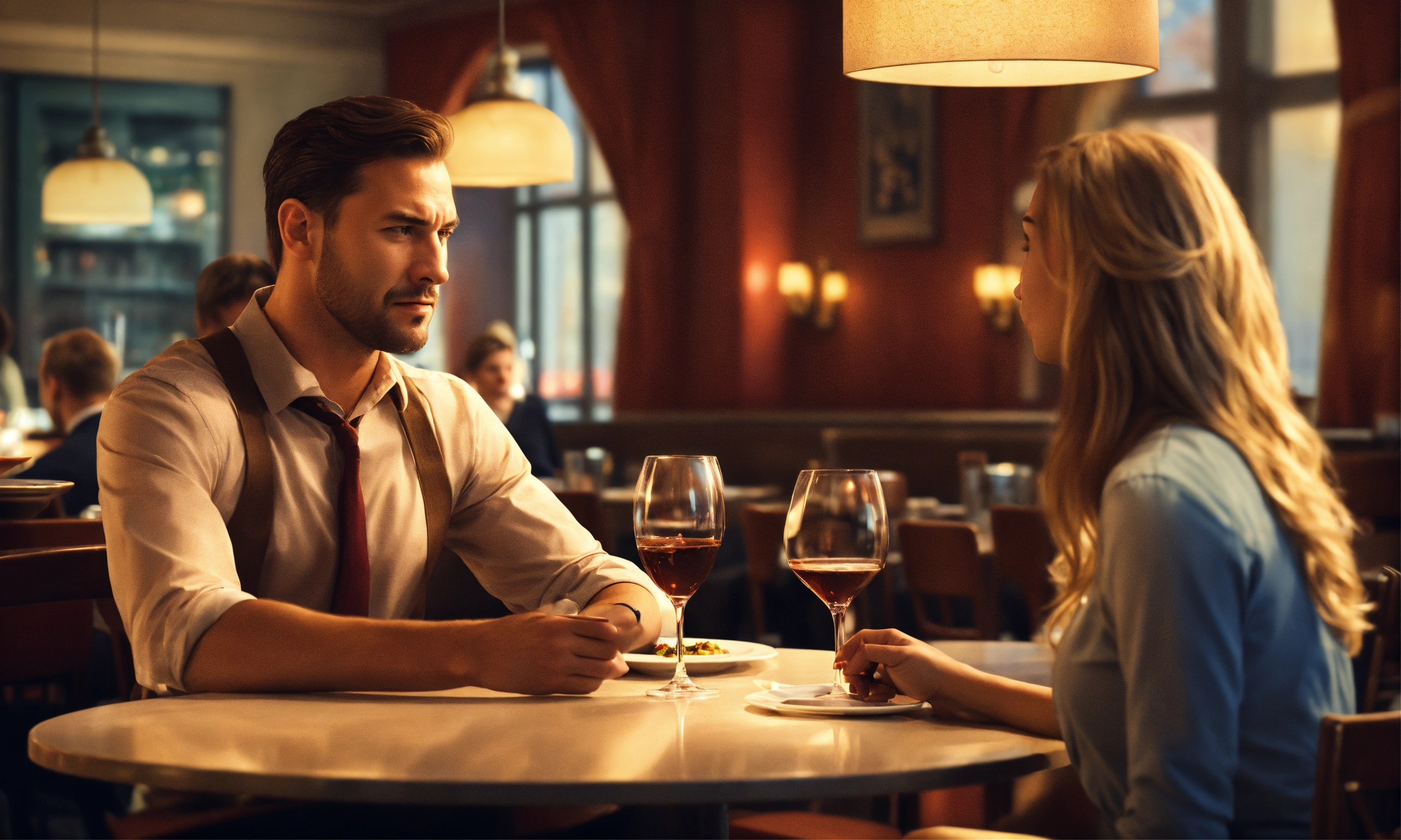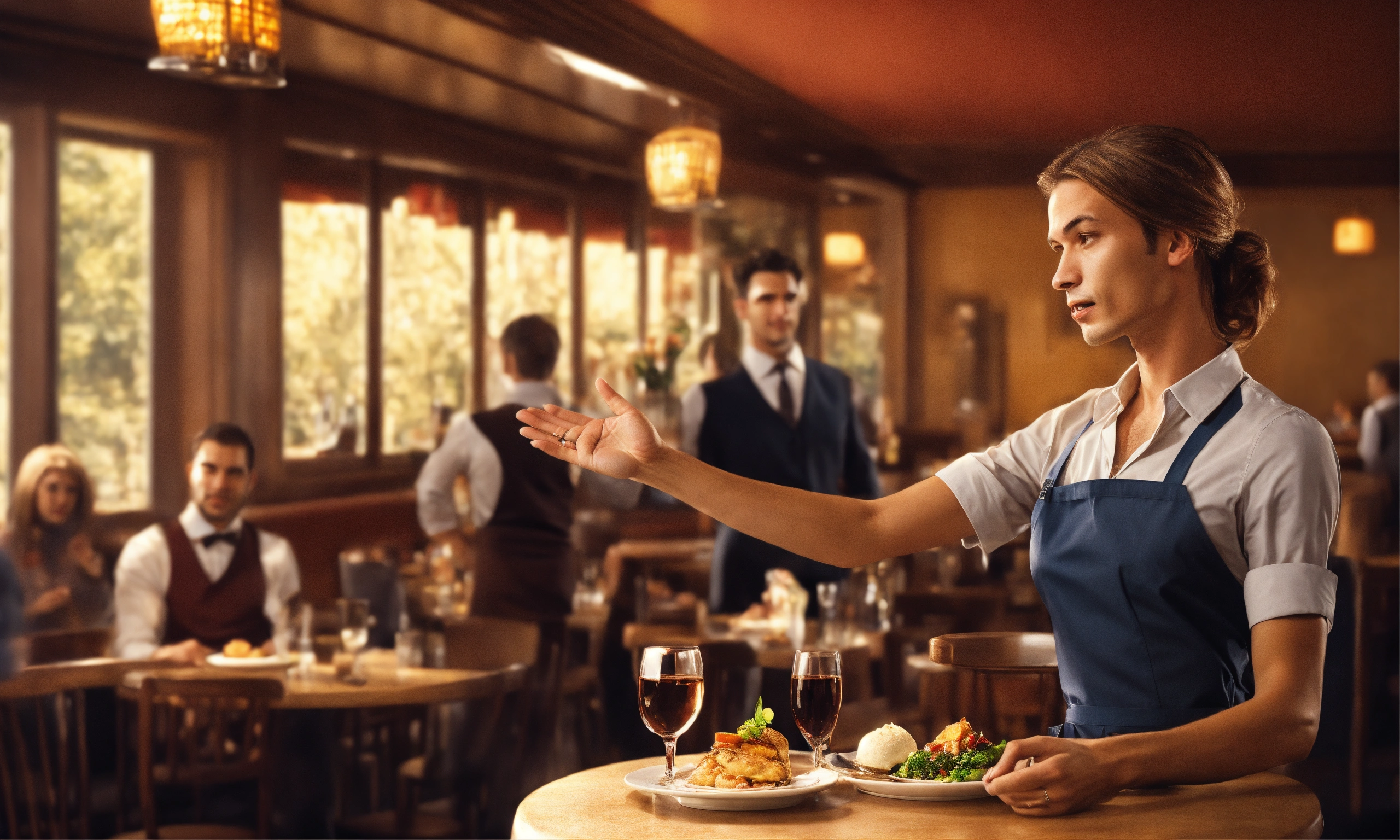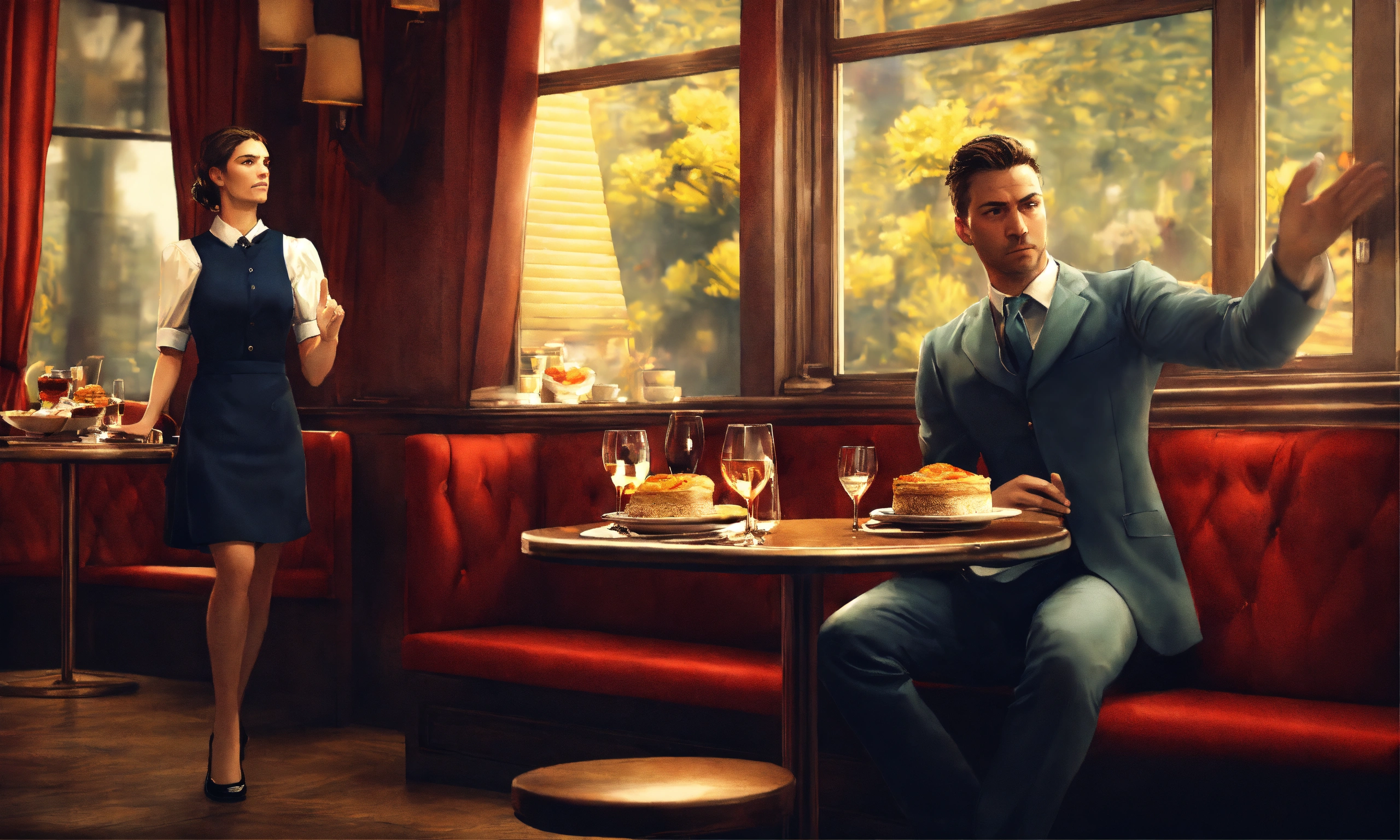 An artistic photo realistic picture of an unhappy man waving down a beautiful female waitress, waitress ignoring man at table