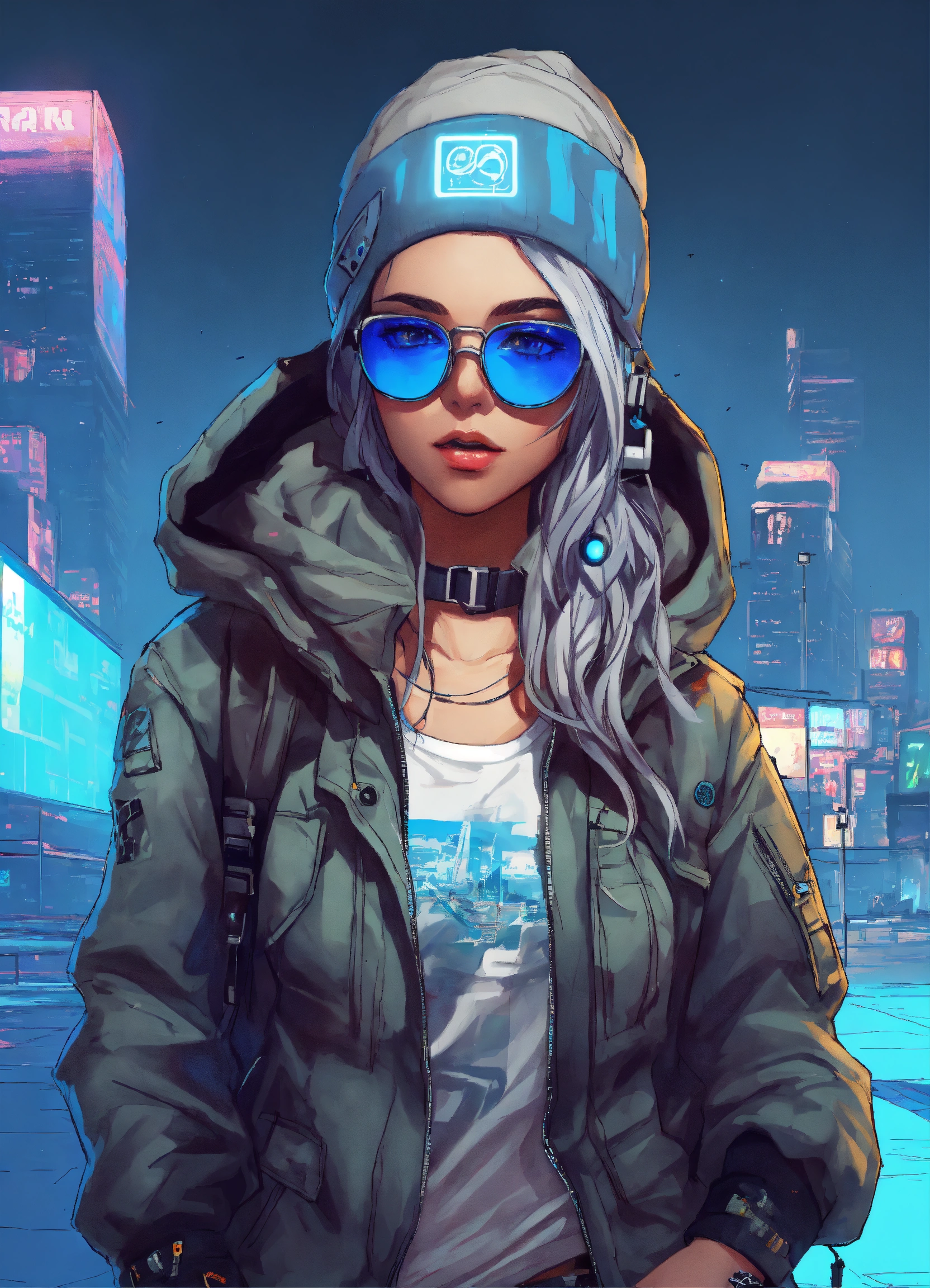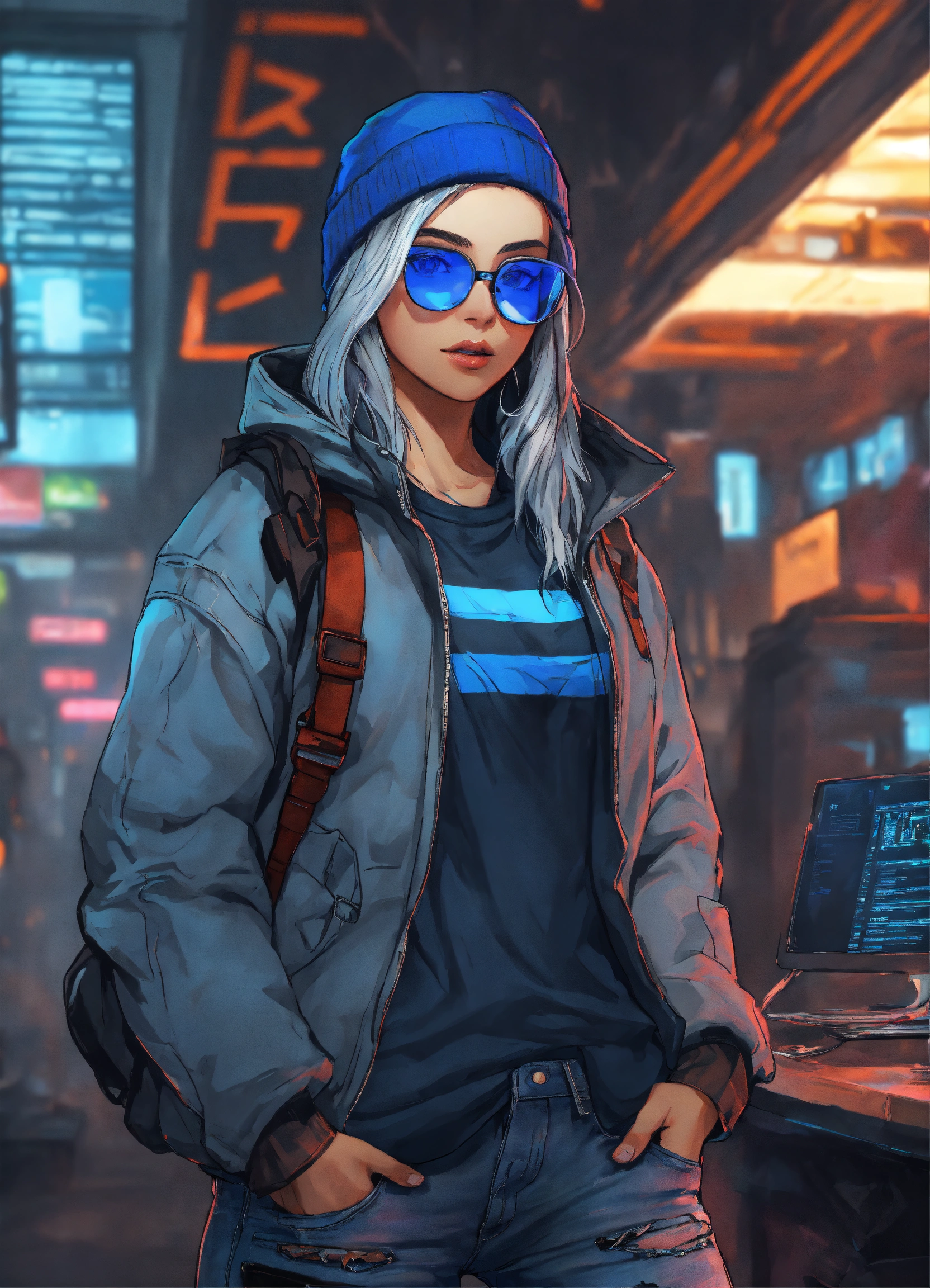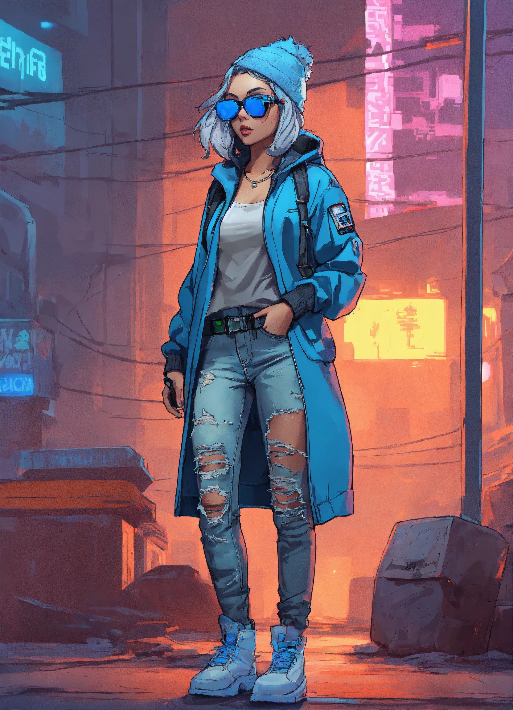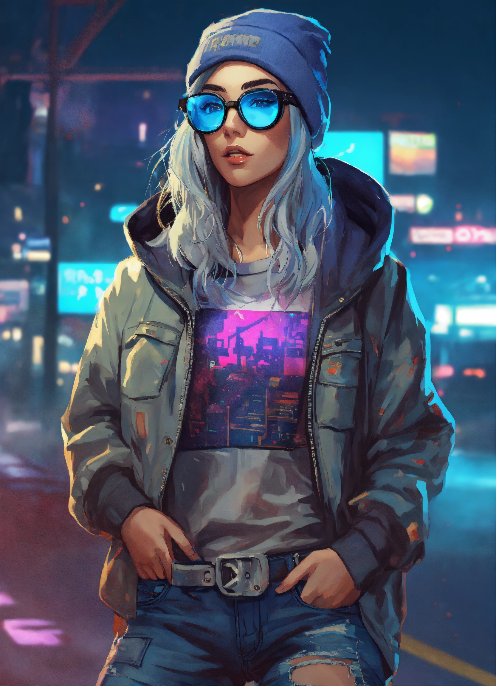 Cute female cyberpunk hacker with blue colored glasses, in a jacket with a beanie long grey hair half teeshirt ripped jeans gta art style