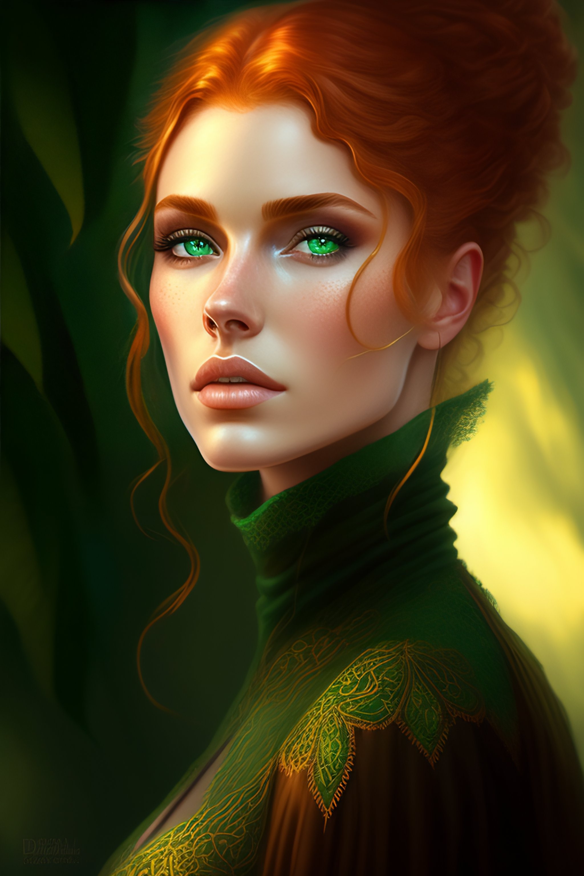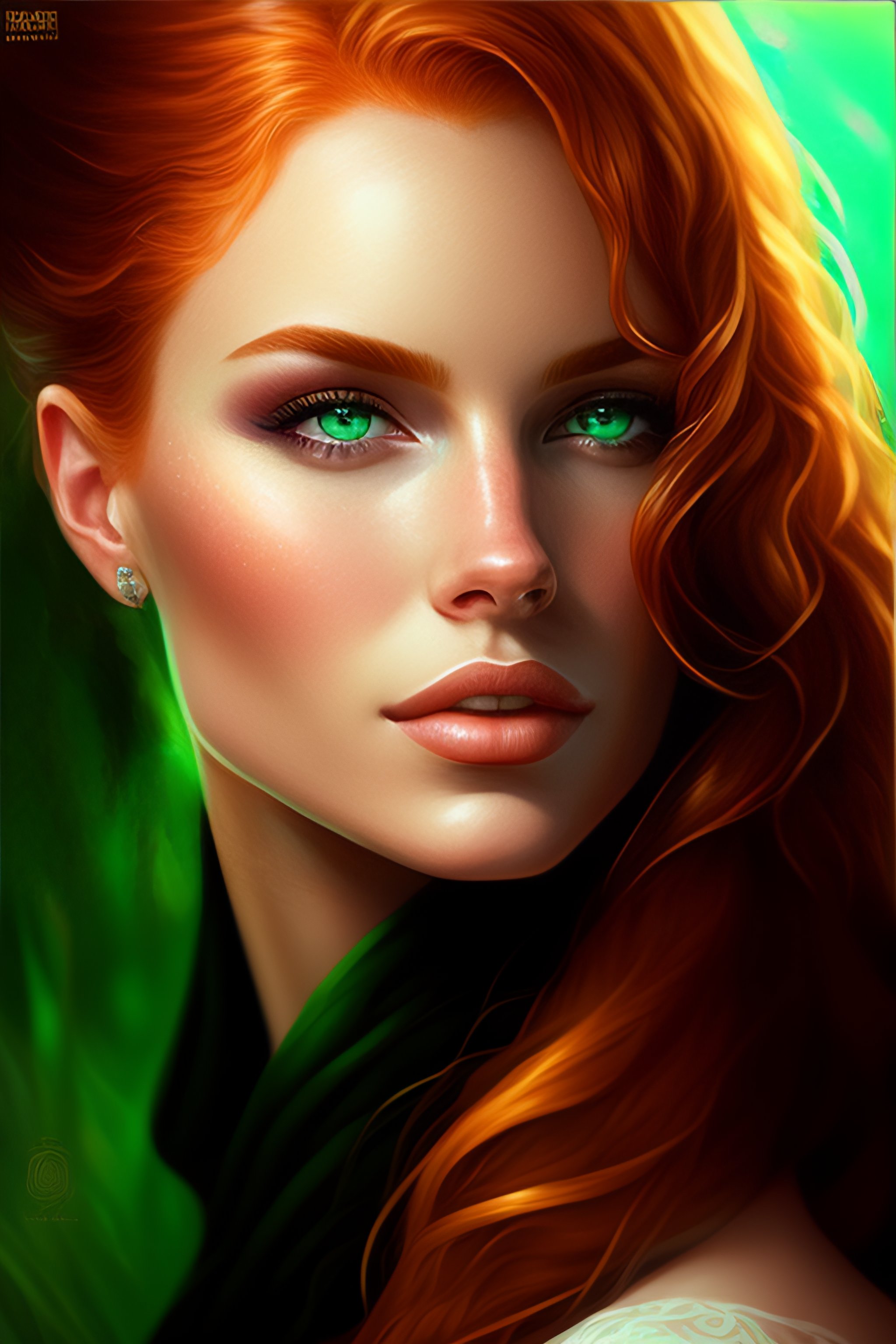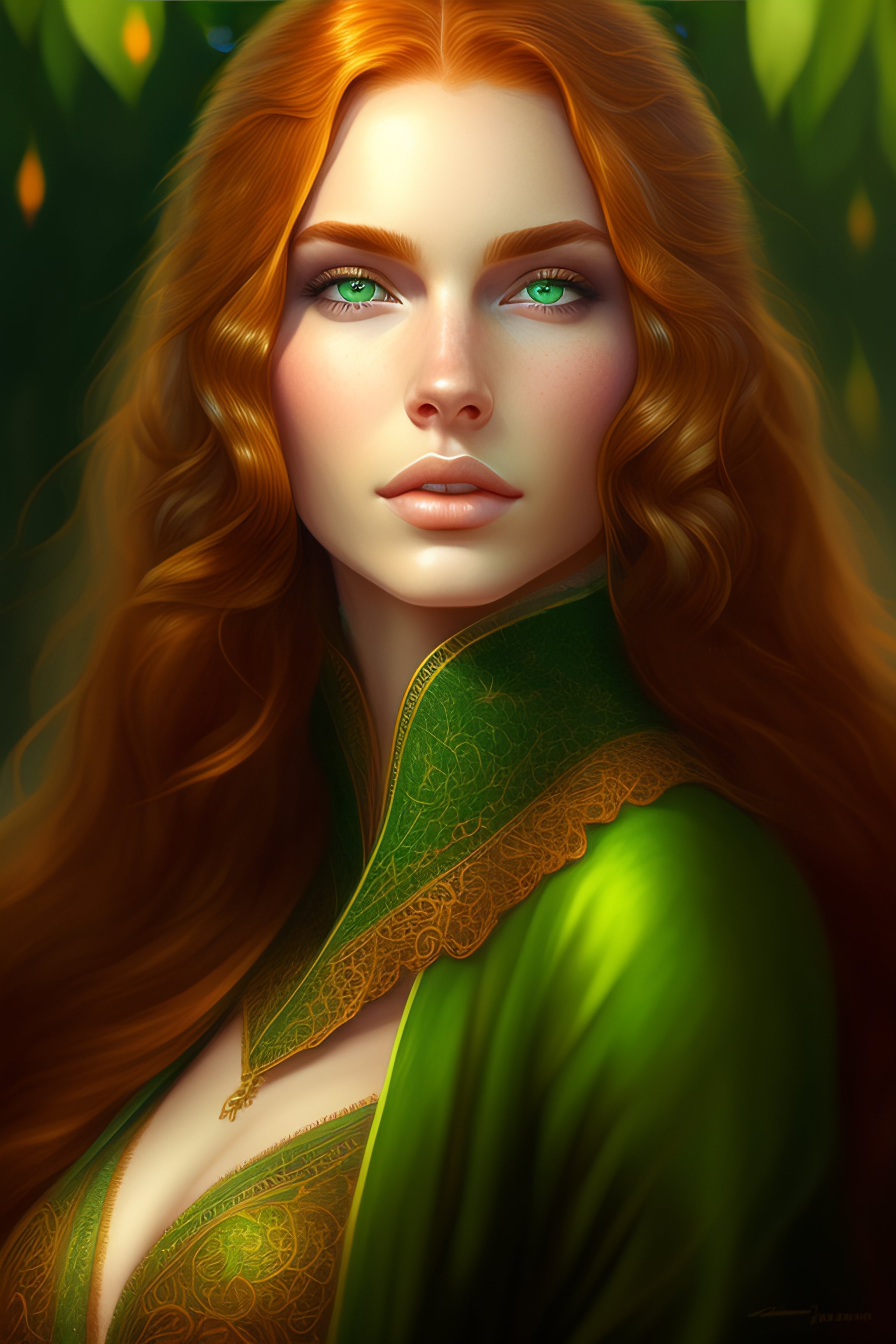Fantasy, green eyes, face, ginger hair, intricate, elegant, highly detailed, digital painting, concept art, smooth, sharp focus, illustration
