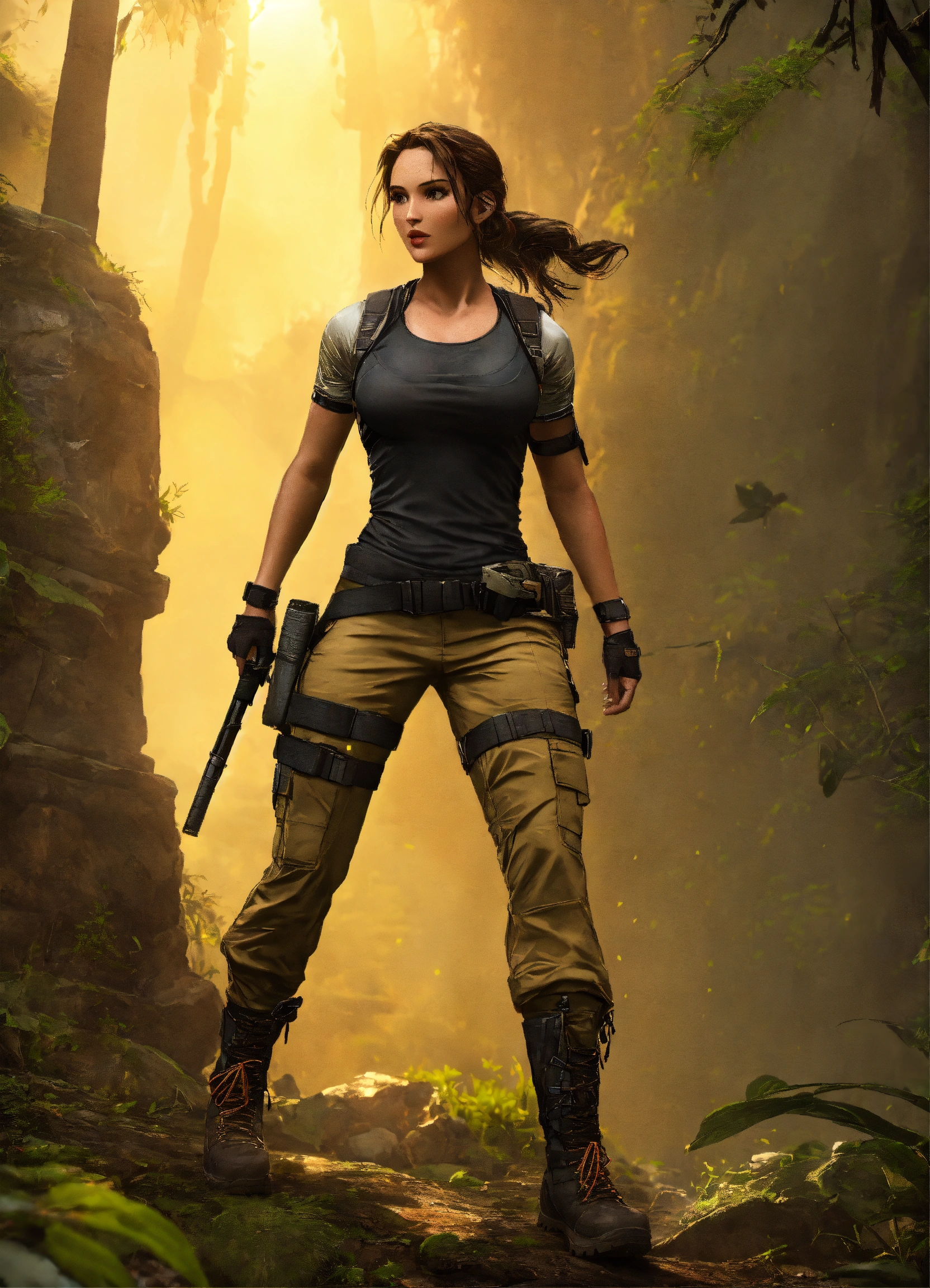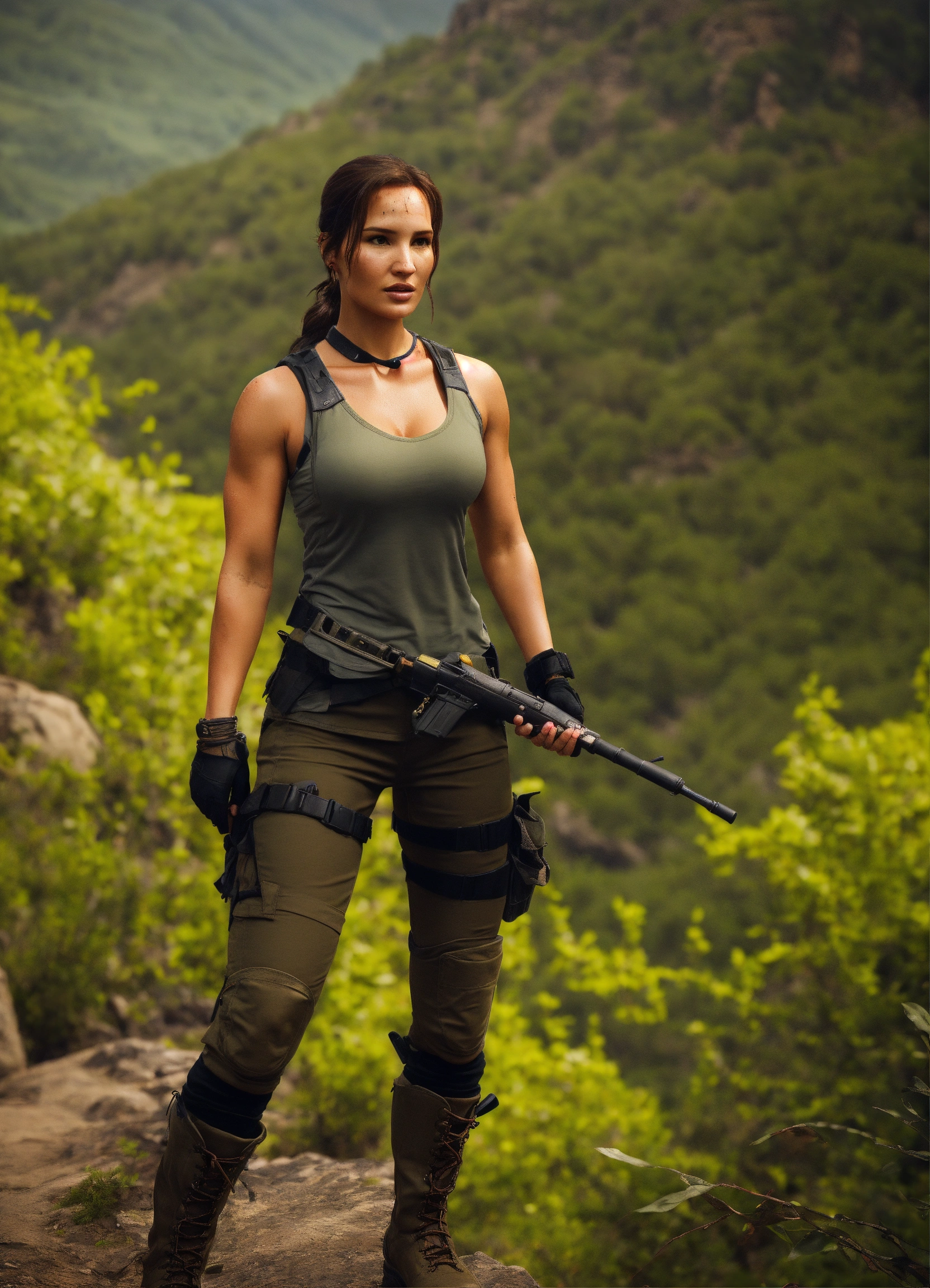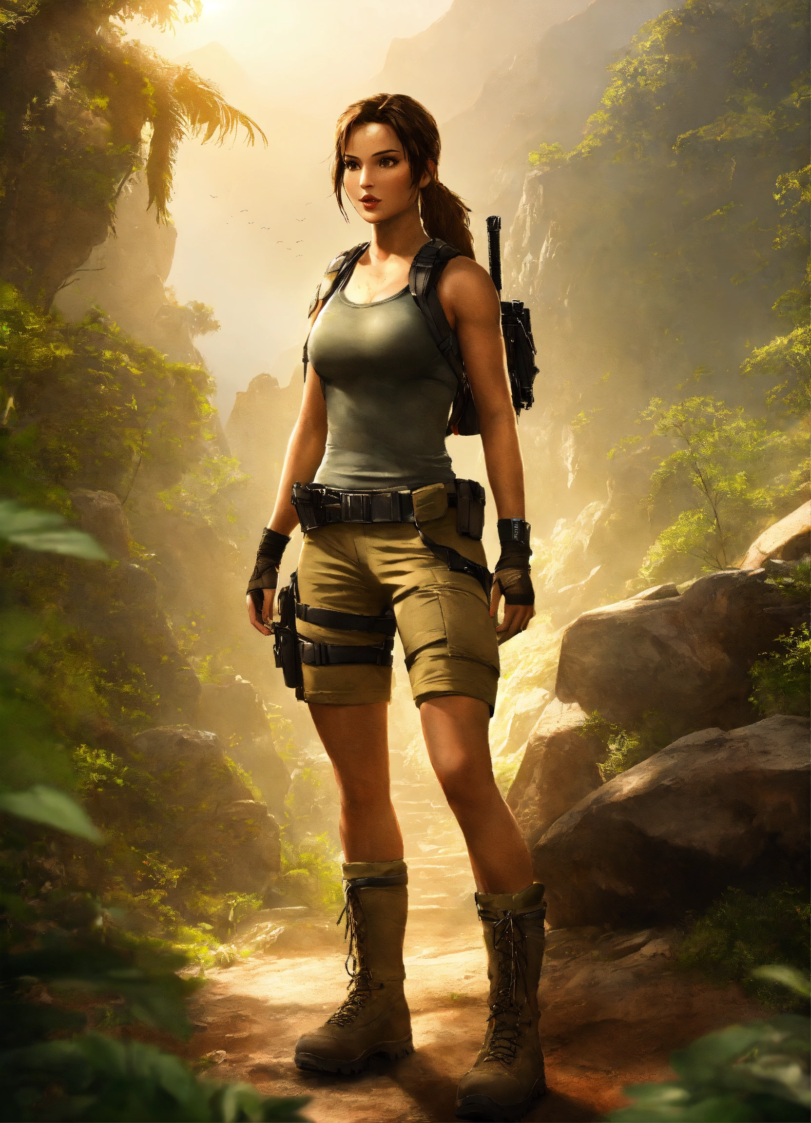 Female athletic lara croft wearing black combat armor and khaki shorts with hiking boots