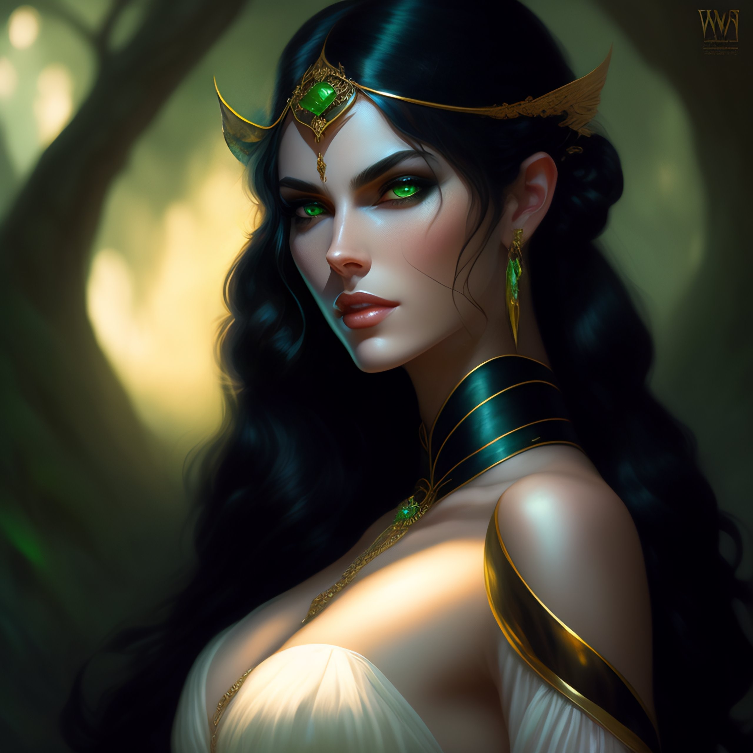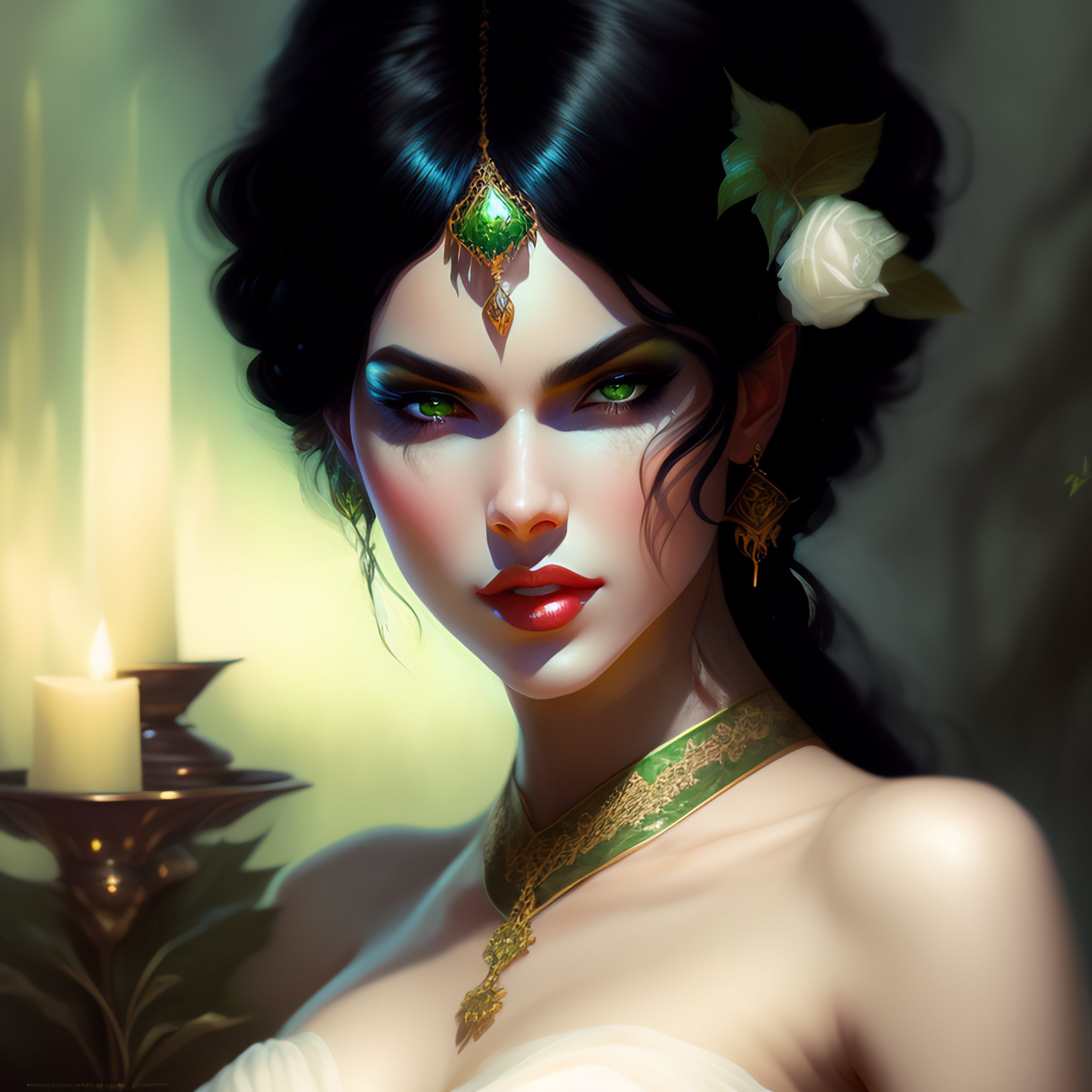 Black hair woman, vampire, white skin, pale skin, green eyes, smiling fantasy magic, dark pin-up style hair, dark light night, intricate, elegant, sharp focus, illustration, highly detailed, digital painting, concept art, matte, art by wlop and artgerm and greg rutkowski and alphonse mucha, masterpiece, black background