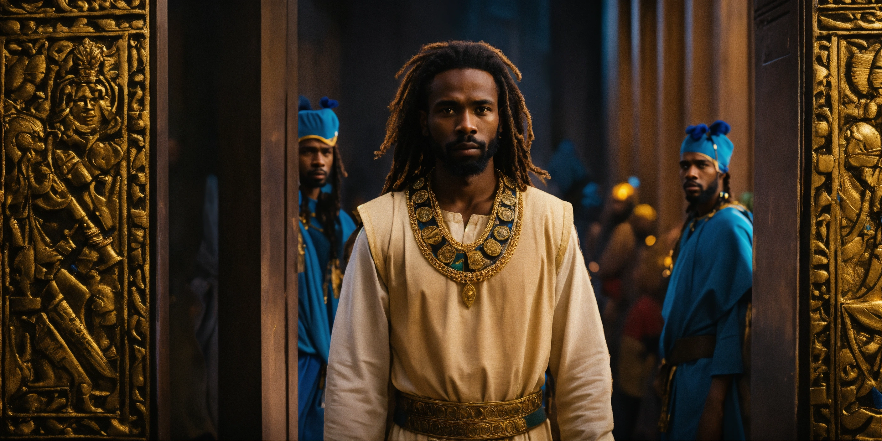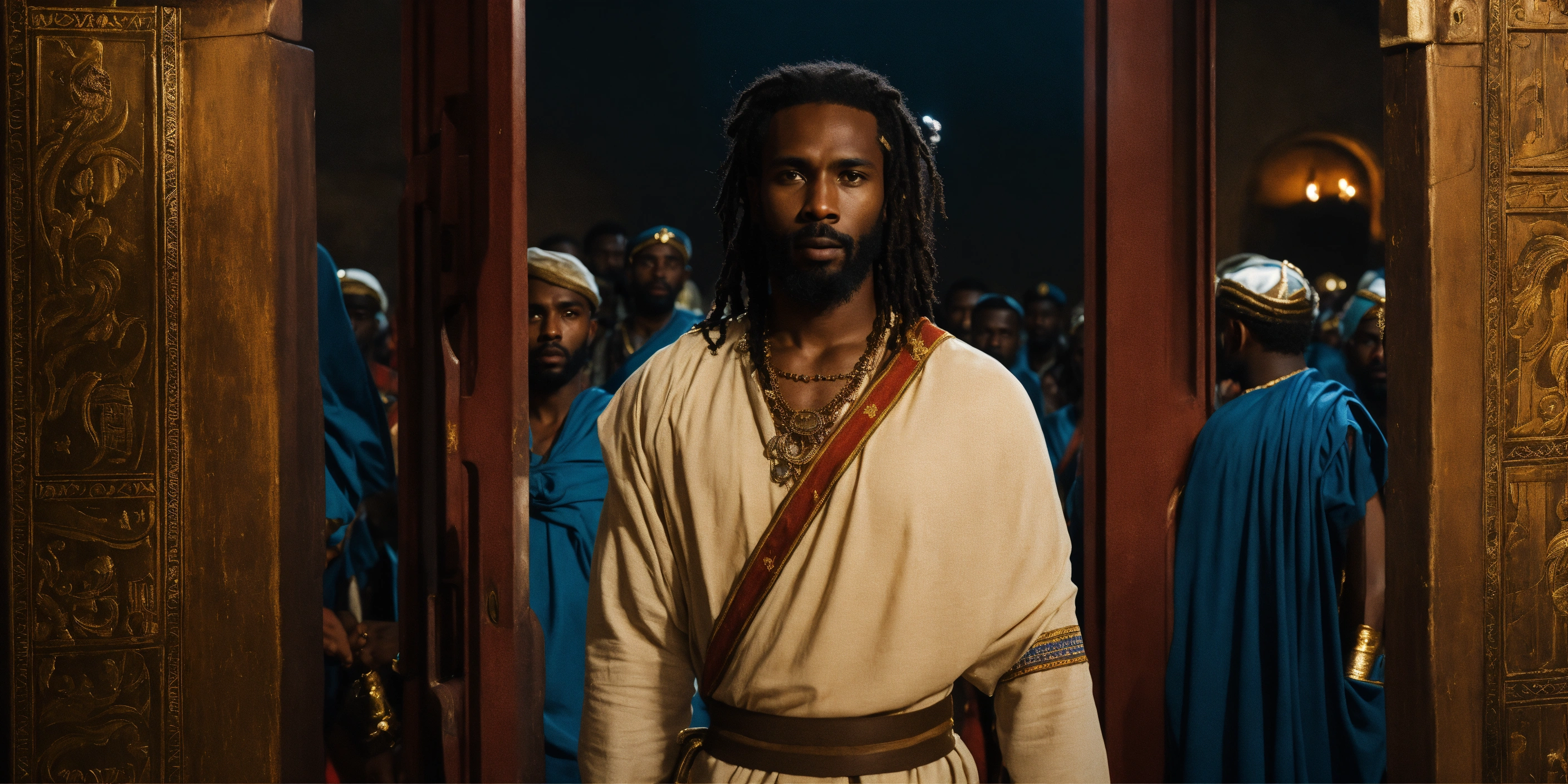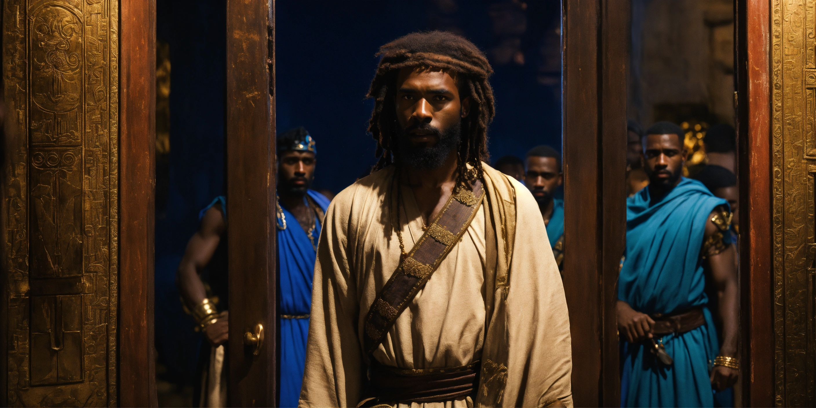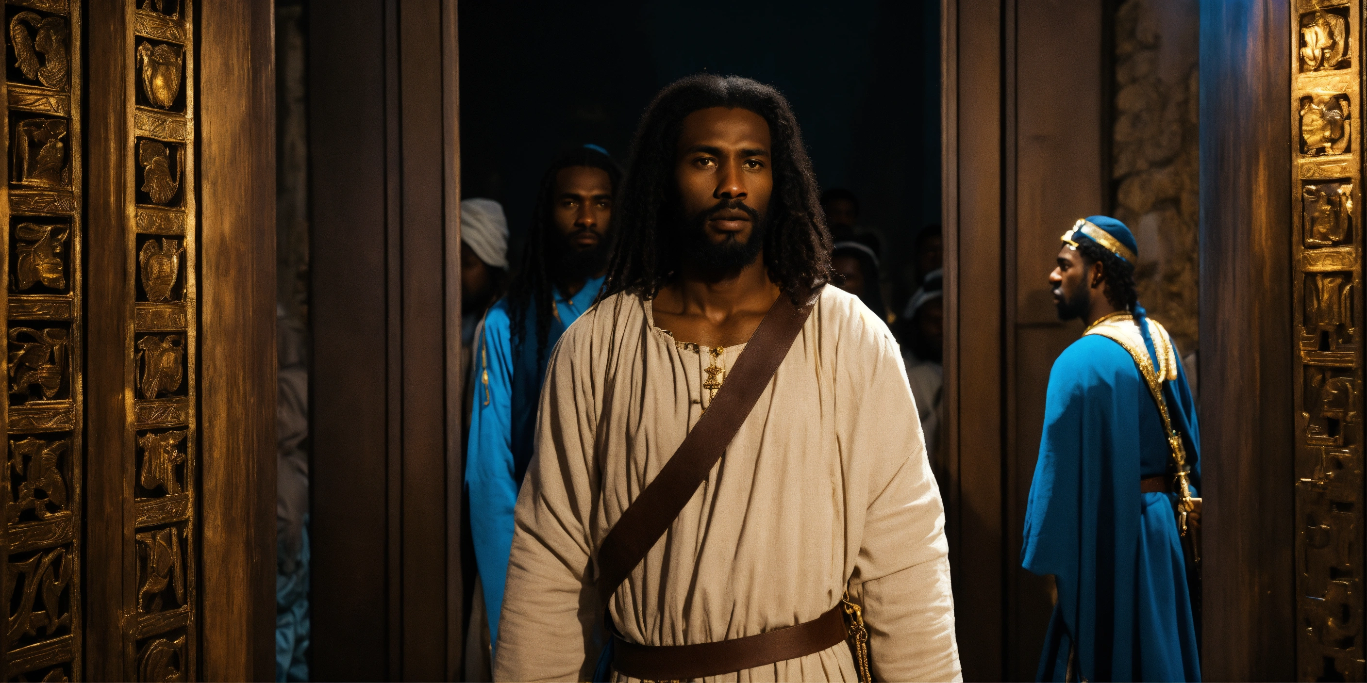 Illustrate a black ethiopian man hiding behind a door looking afraid, he has this long hair and a long beard, there are 5 white roman soldiers standing nearby, another ethiopian black man with shoulder length hair is being captured and stands apart in the crowd, they are between 20 to 33 years old, they wear long white tunics with blue stripes on the borders, they do not wear jewelry, it is nighttime, no gold jewelry, fantasy photorealistic 8k
