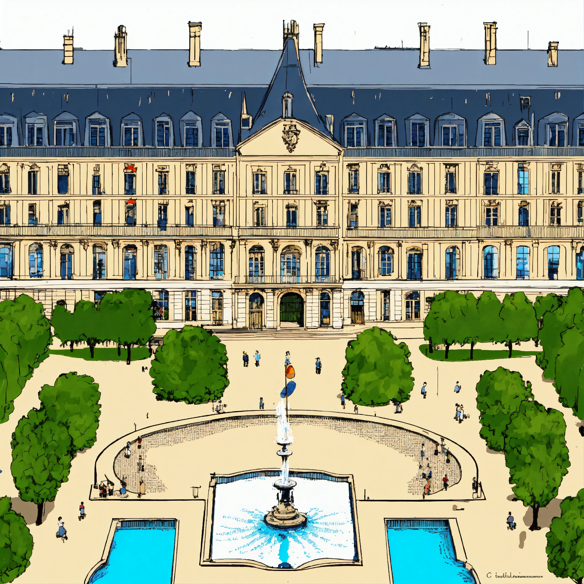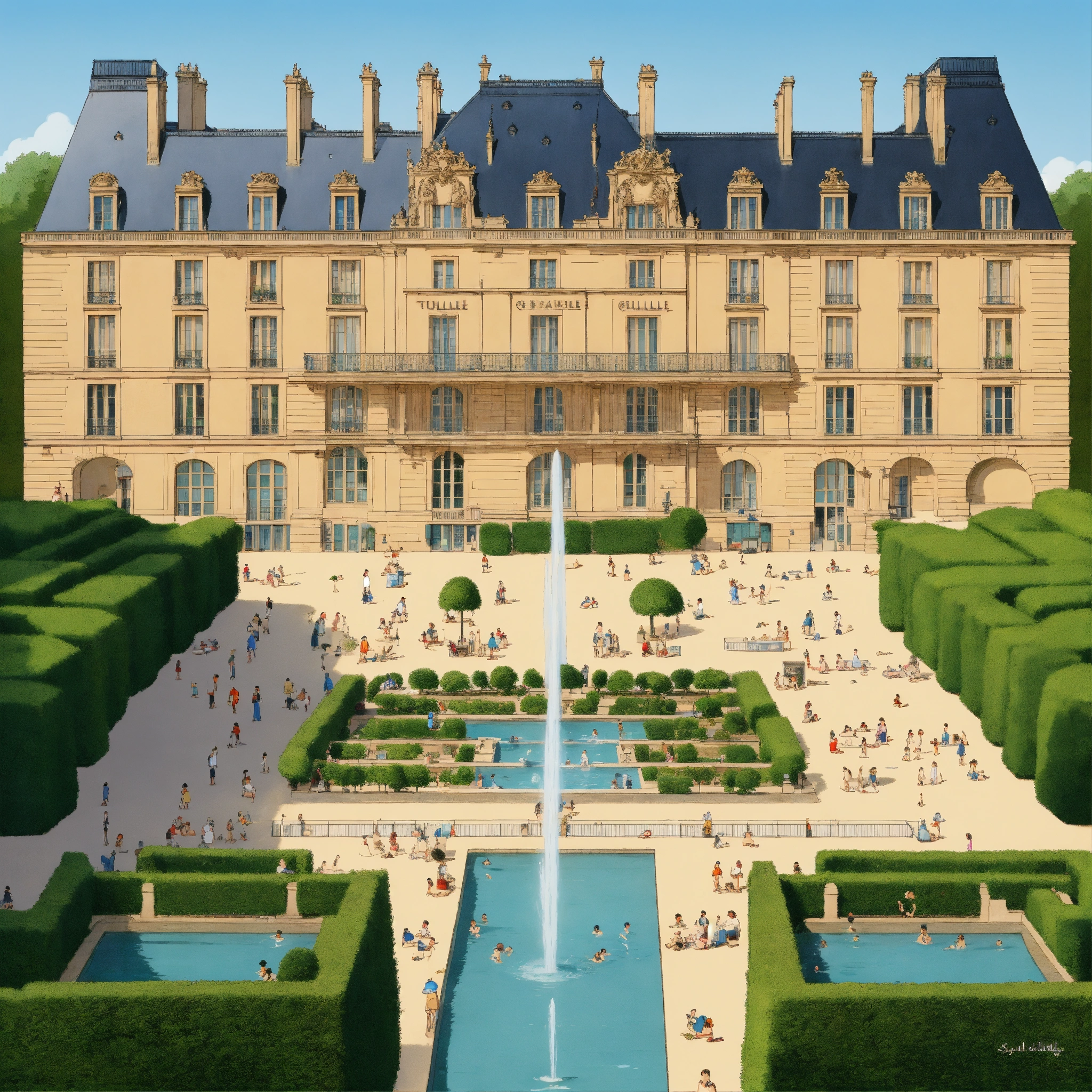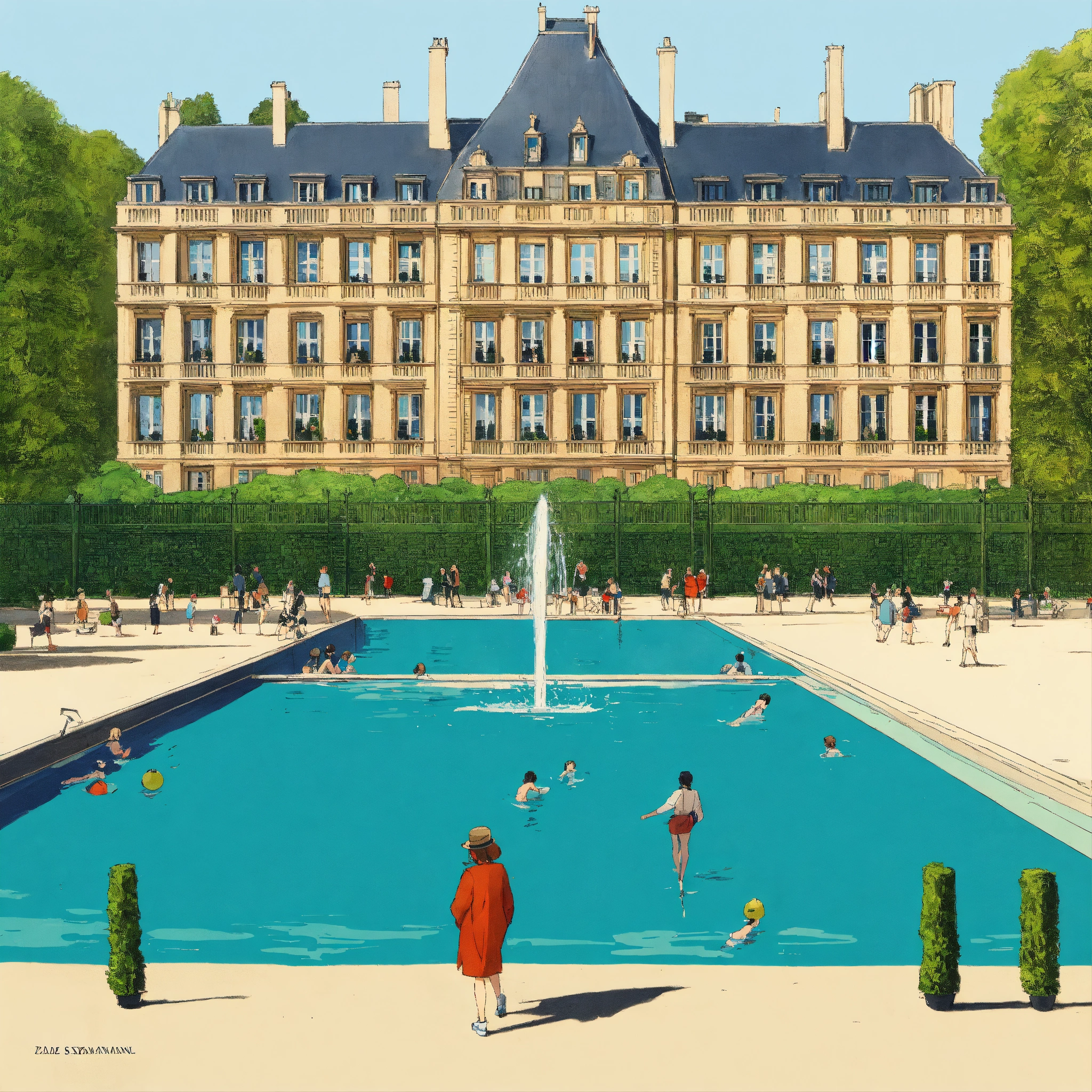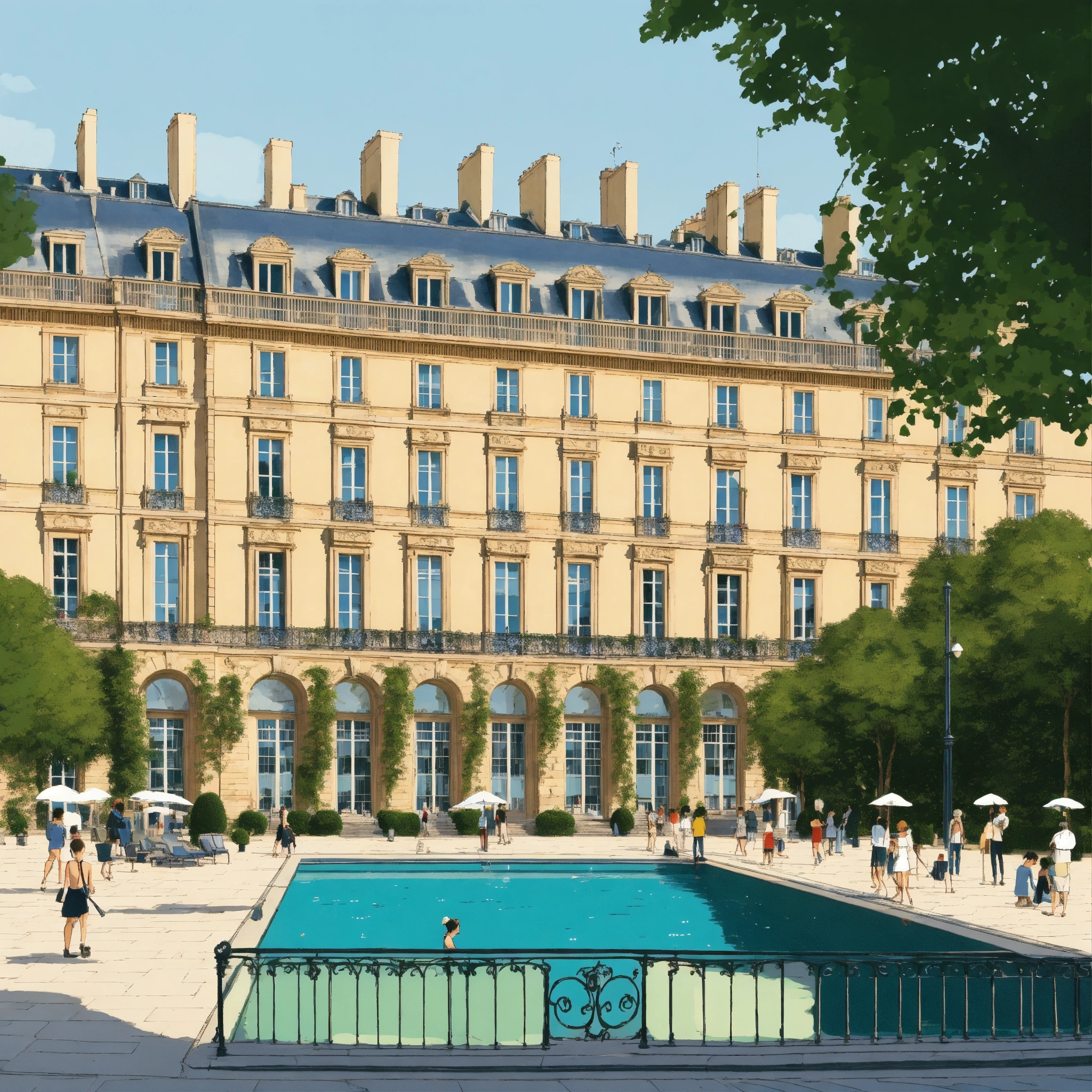 Tall building, haussmanian skyscraper, place de vosges, jardins de luxembourg tuilleries palais royale, fountain, maze, herge illustration, swimming pool, grand hotel
