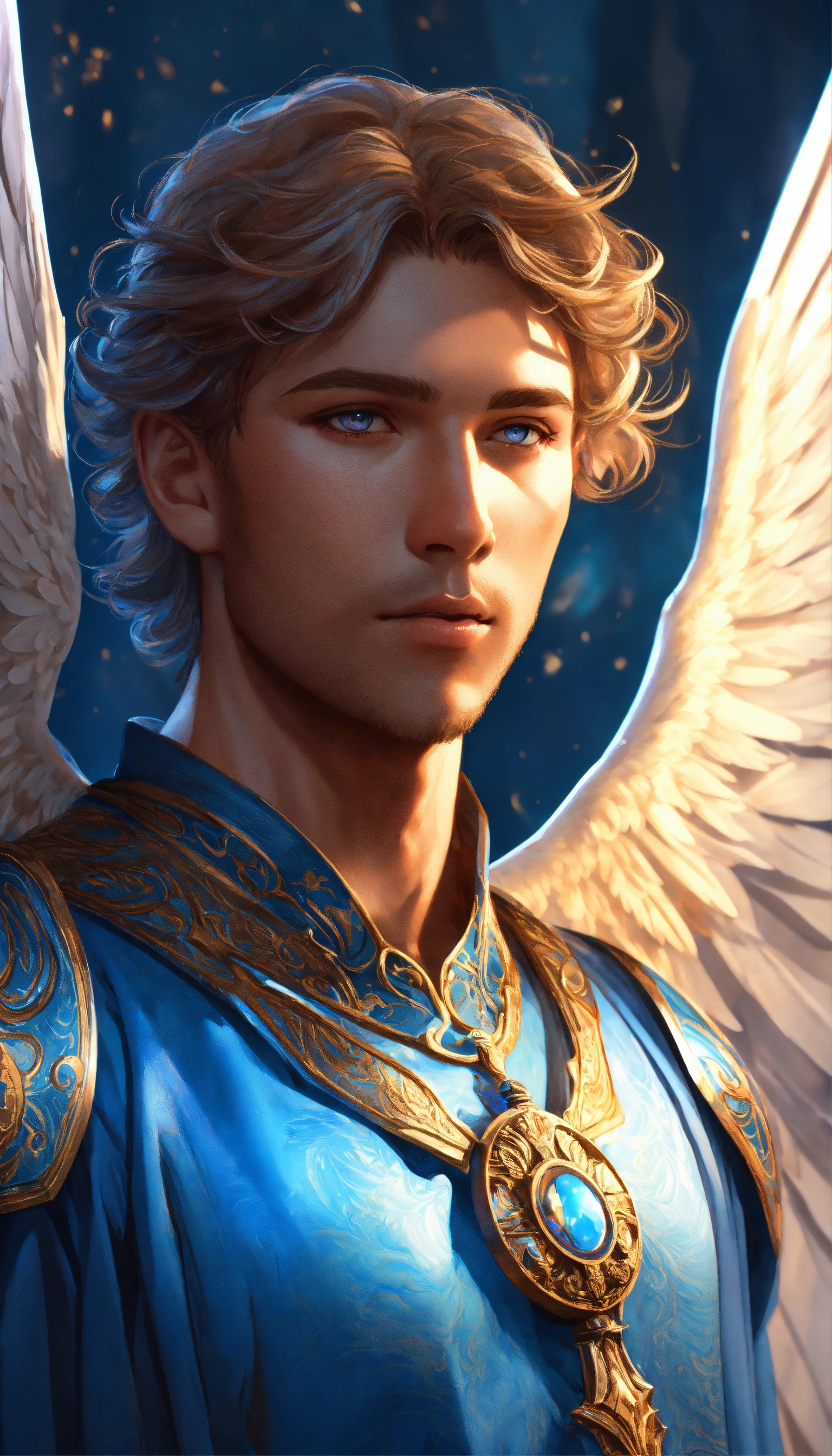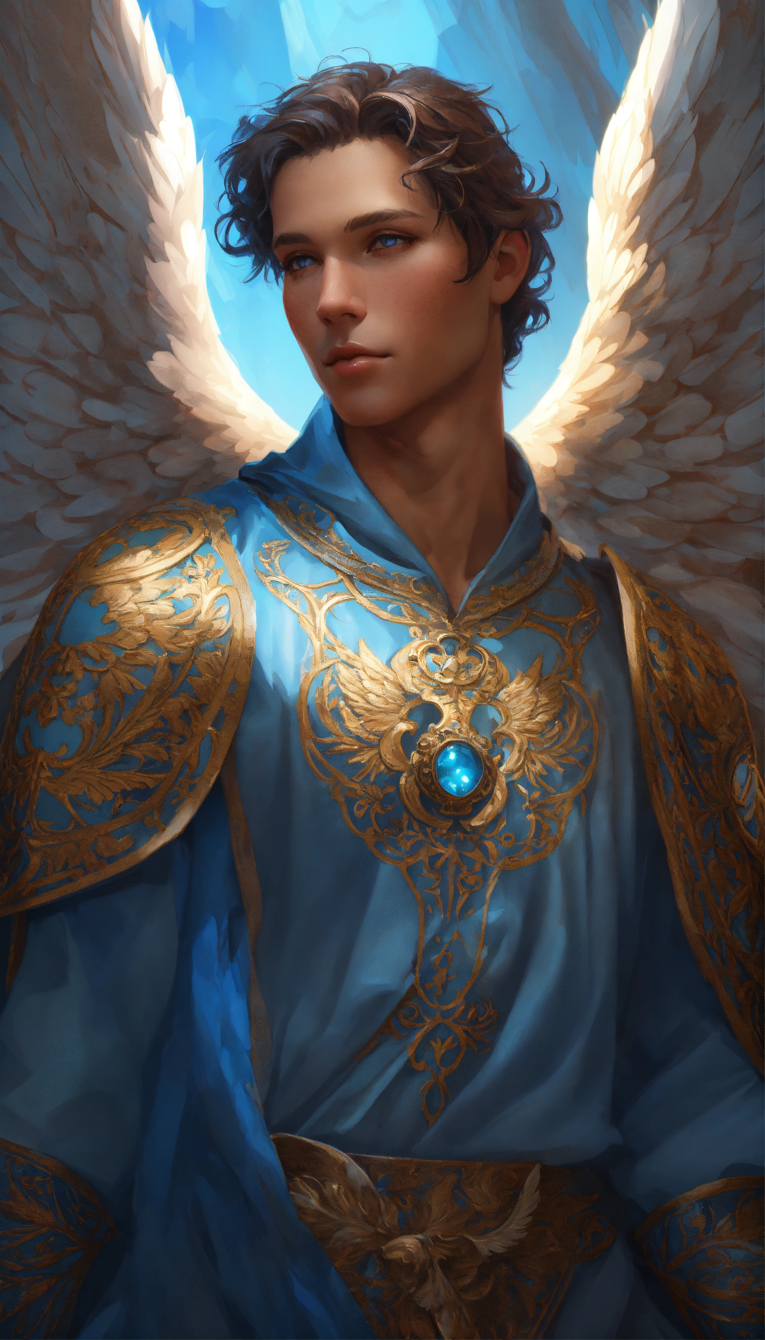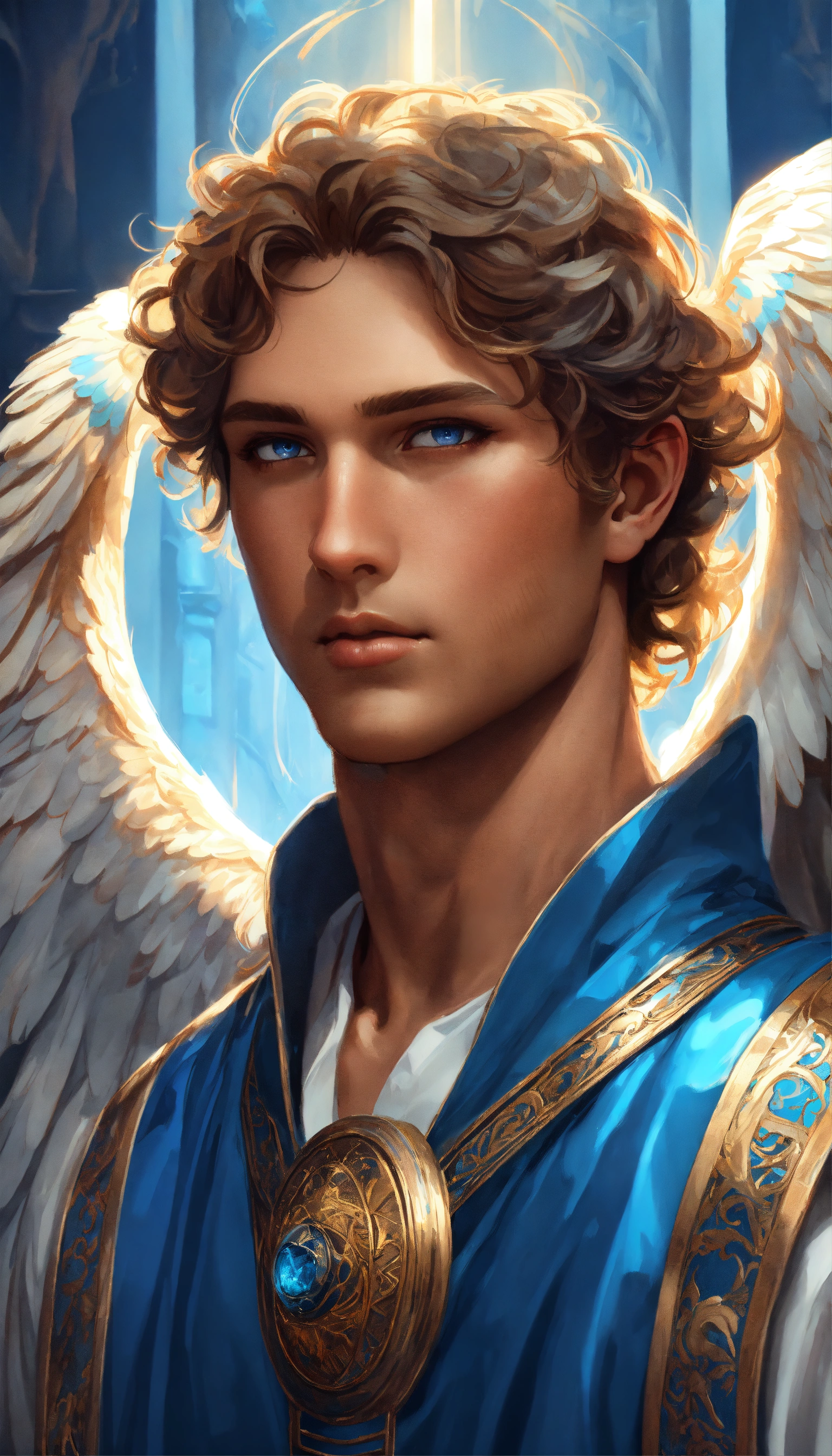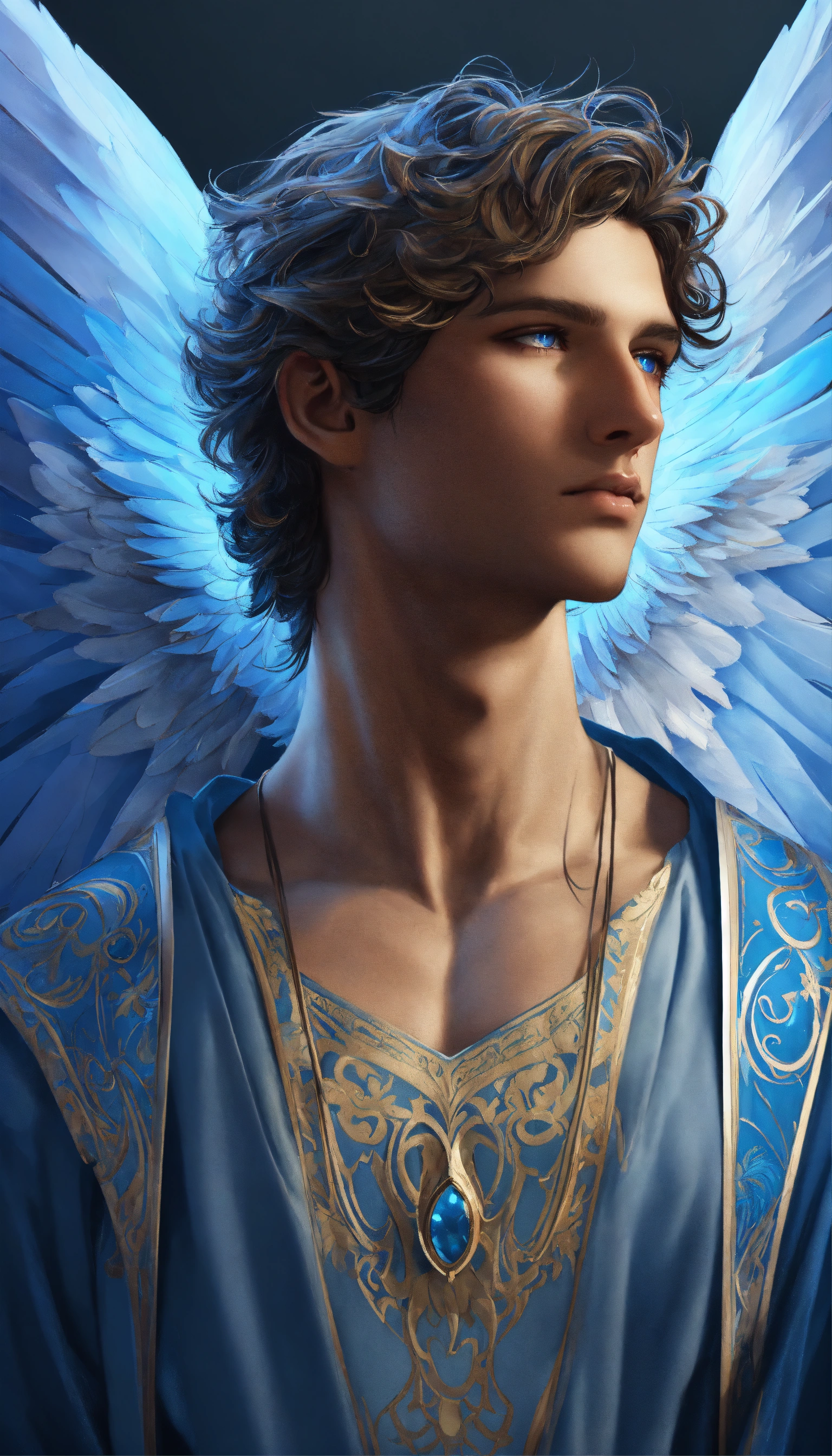 Male angel, wings, intricate, headshot, highly detailed, digital painting, art station, real, 3d, large detailed blue wings, very light eyes and deep gaze, blue tunic, mystical, sharp focus, lighting film, 8k, illustration, art by artgerm and greg rutkowski, alphonse mucha, cgsociety