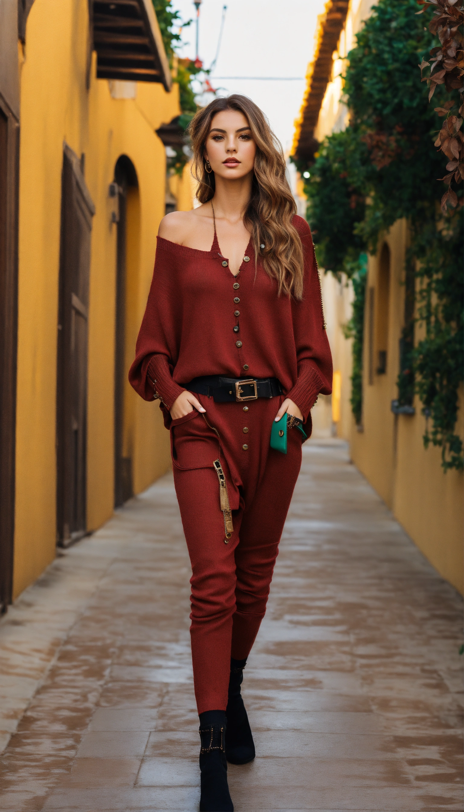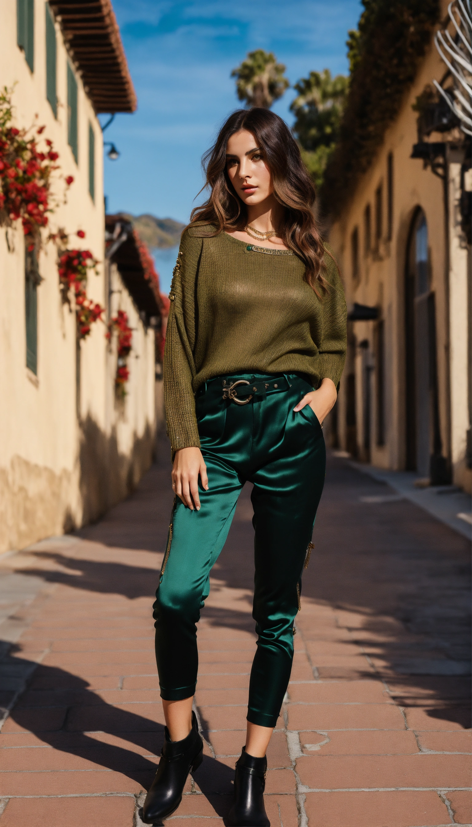 Ultra realistic full body photo of petite italian female model modeling upscale dolman sleeve travel inspired grunge knit silk outfit with cool metallic elements zippers buttons clips in santa barbara