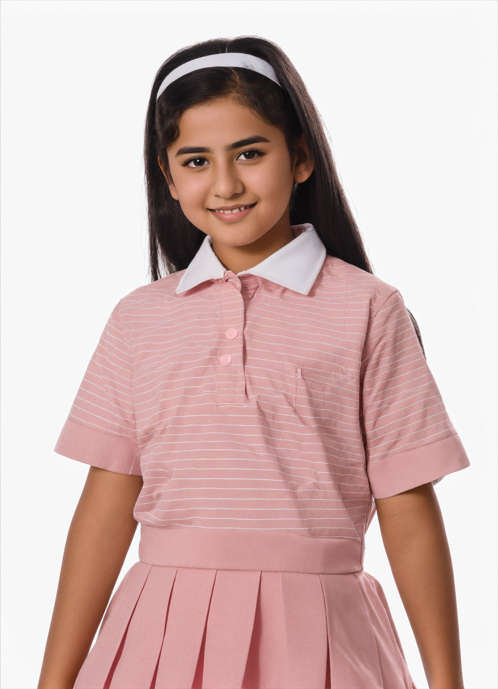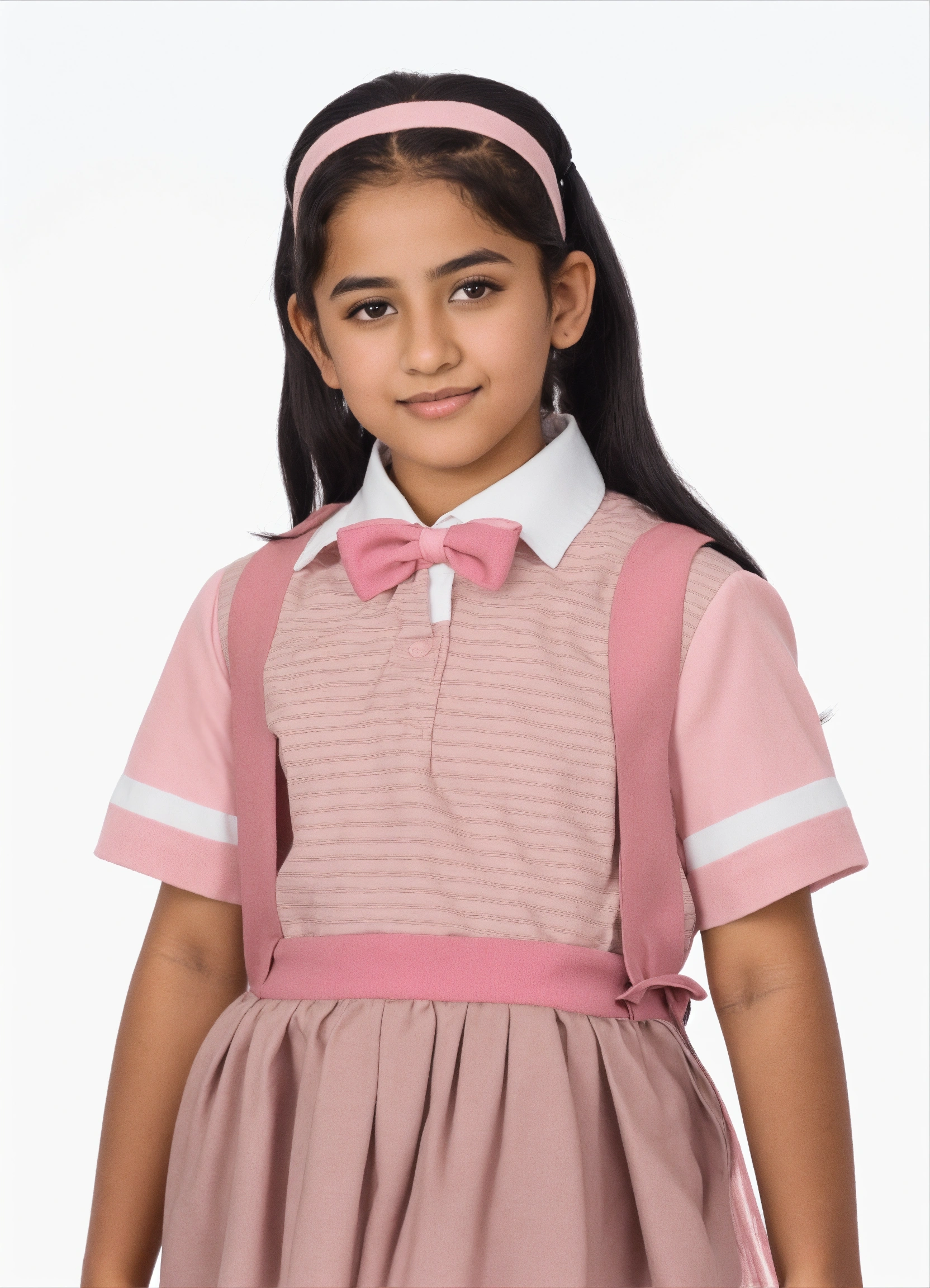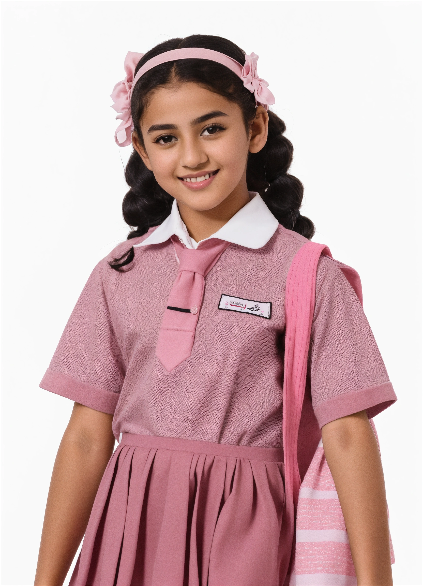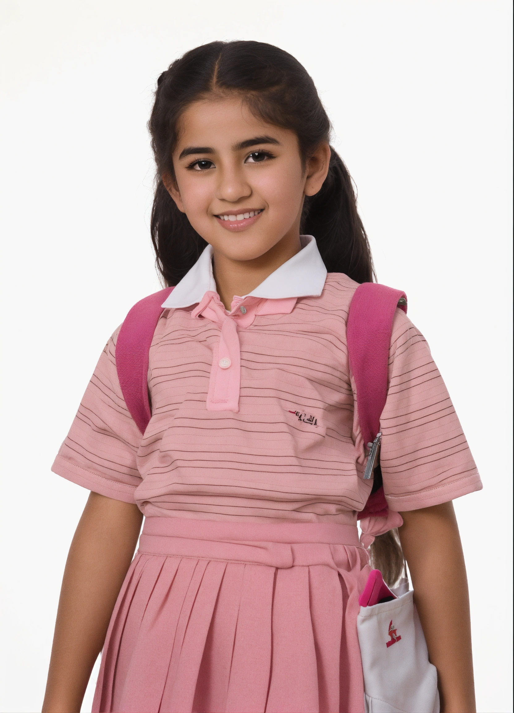A student from the state of kuwait in the primary stage appears in a school photo in which she wears a school uniform consisting of a long-sleeved, light pink shirt with white stripes and a light pink dress. she has beautiful features, light skin, black eyes, and black hair with a ponytail. she wears black school shoes and white socks.