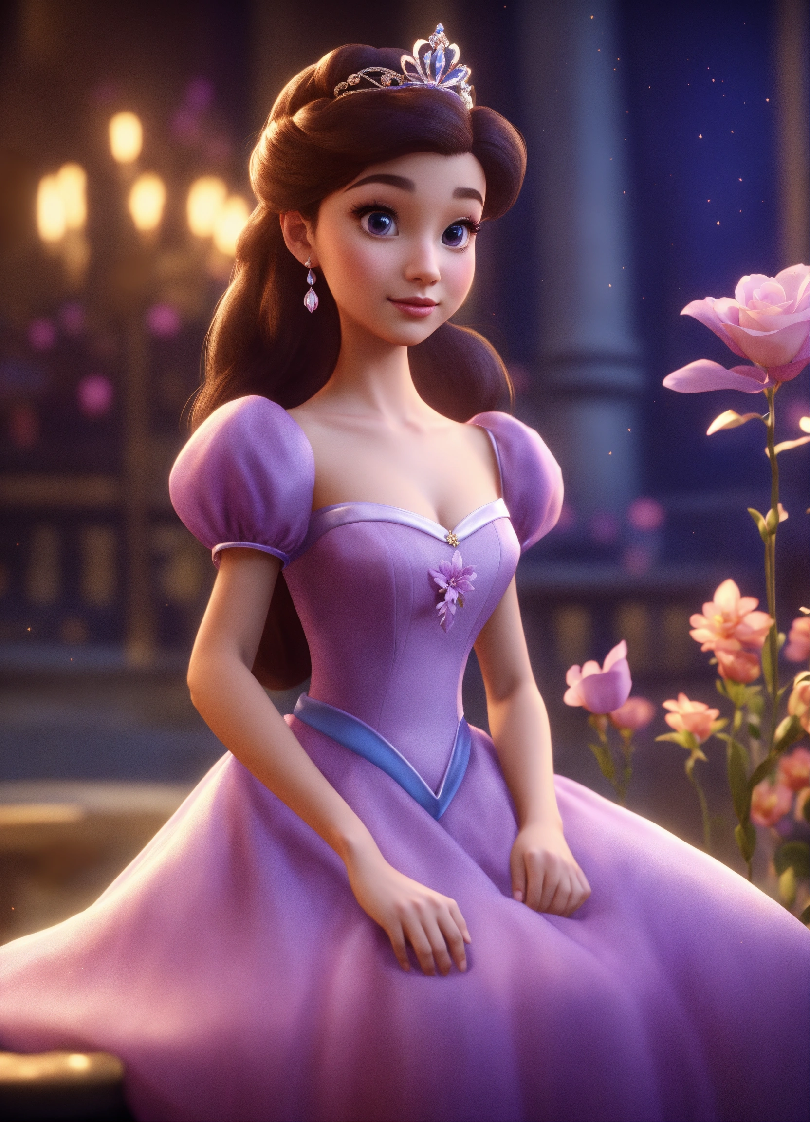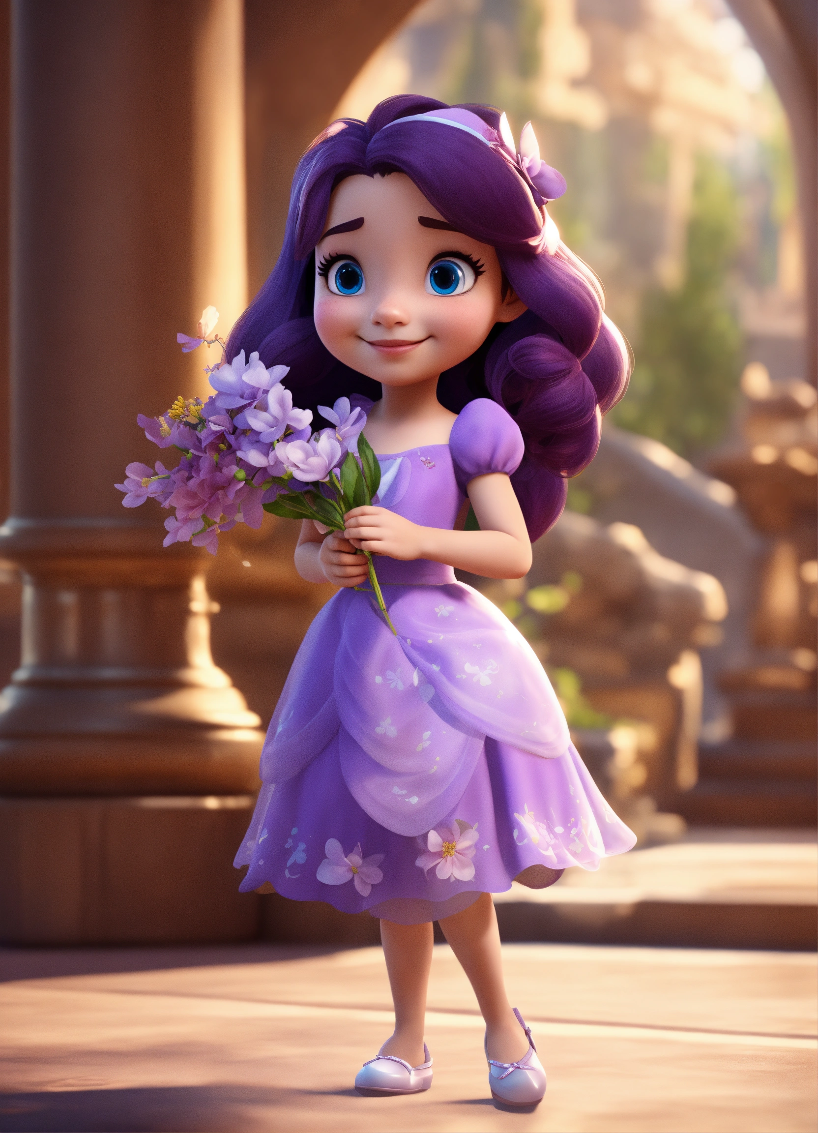 Disney cute and beautiful princess wearing a purple dress and holding a flower, rendered, blender, unrealengine5, cartoon, disney character