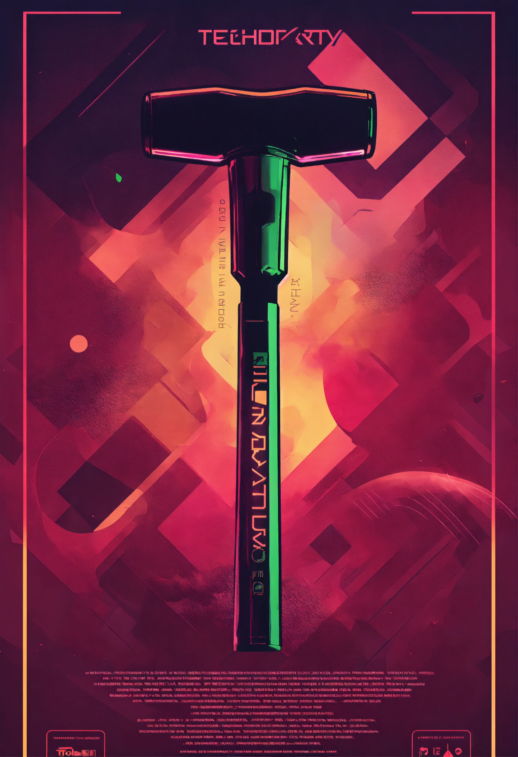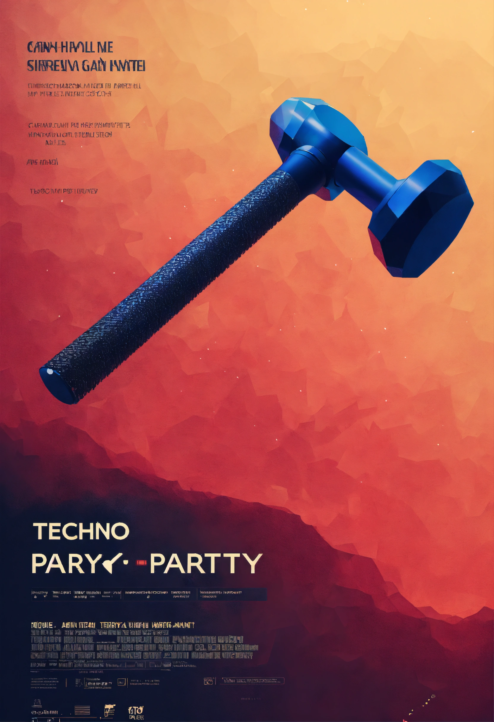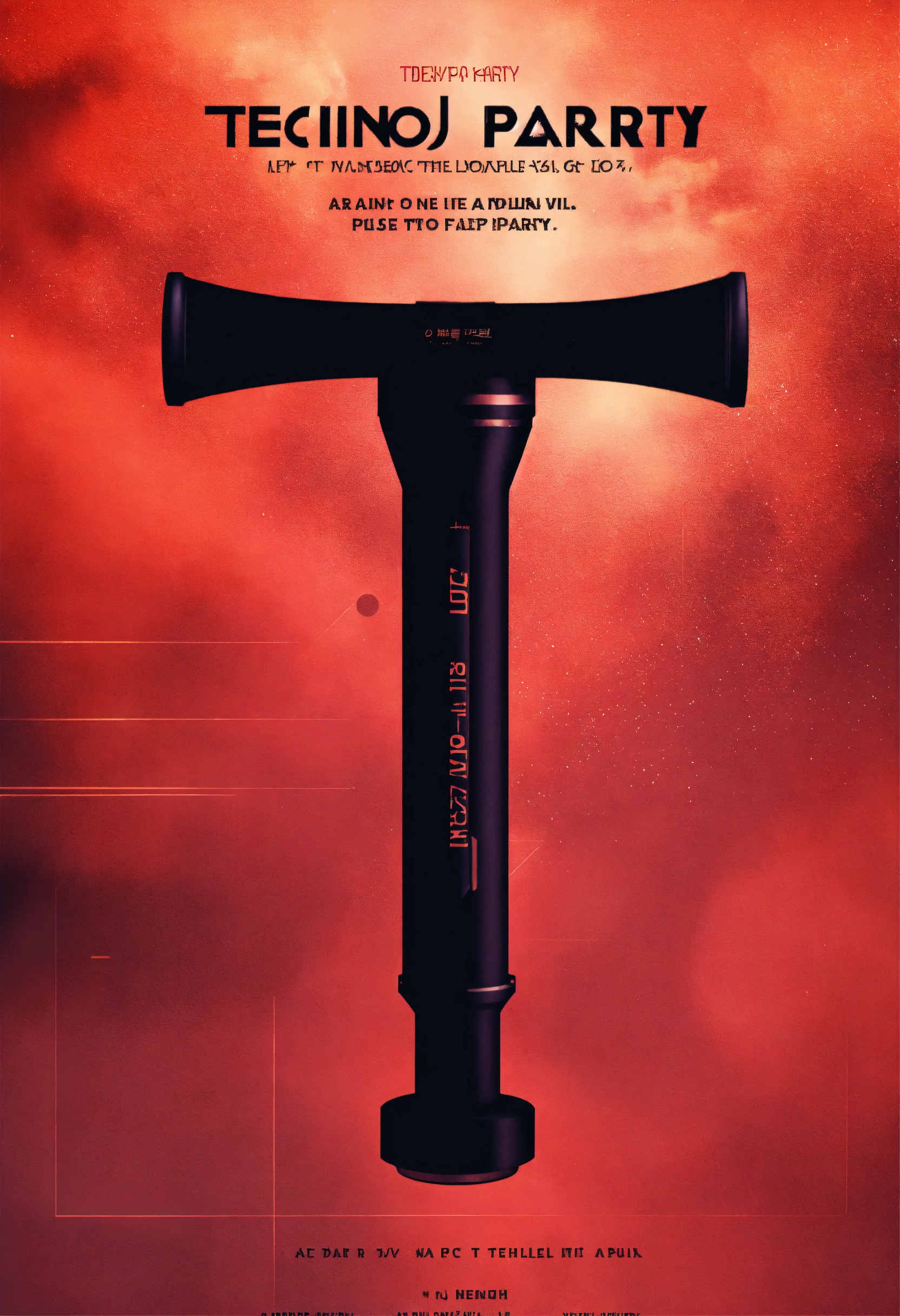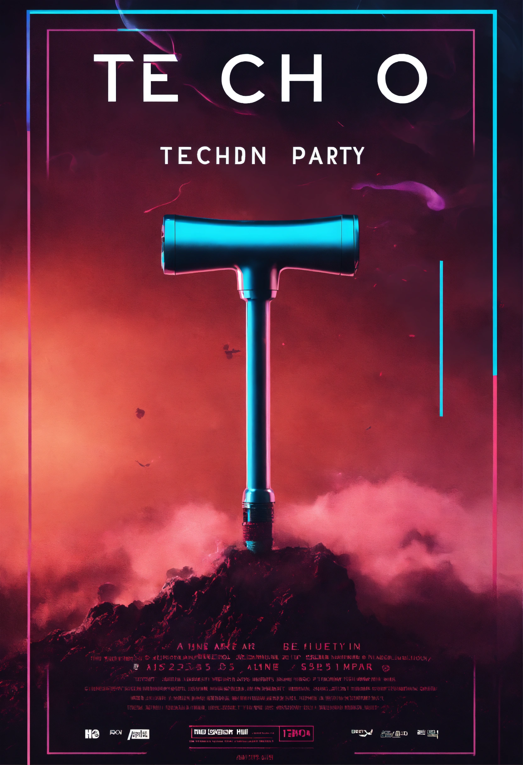 Techno party poster with a minimalistic hammer against a backdrop of vapor with dark background