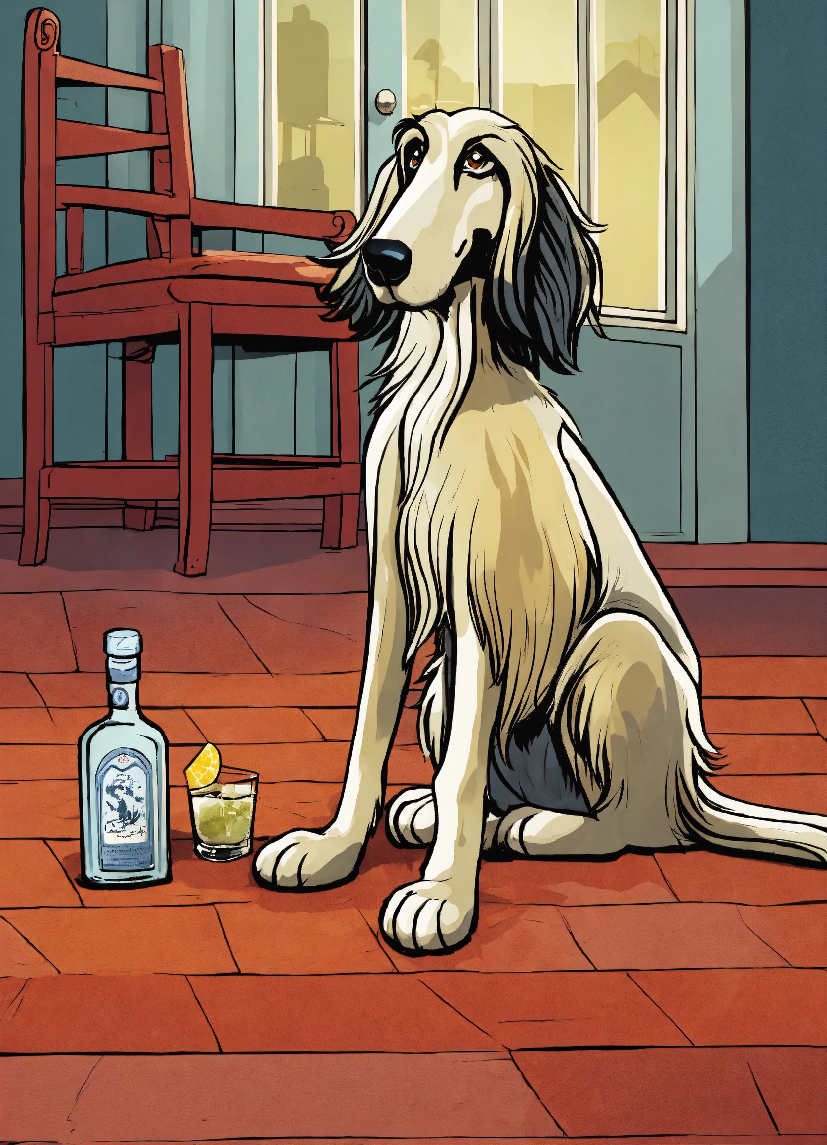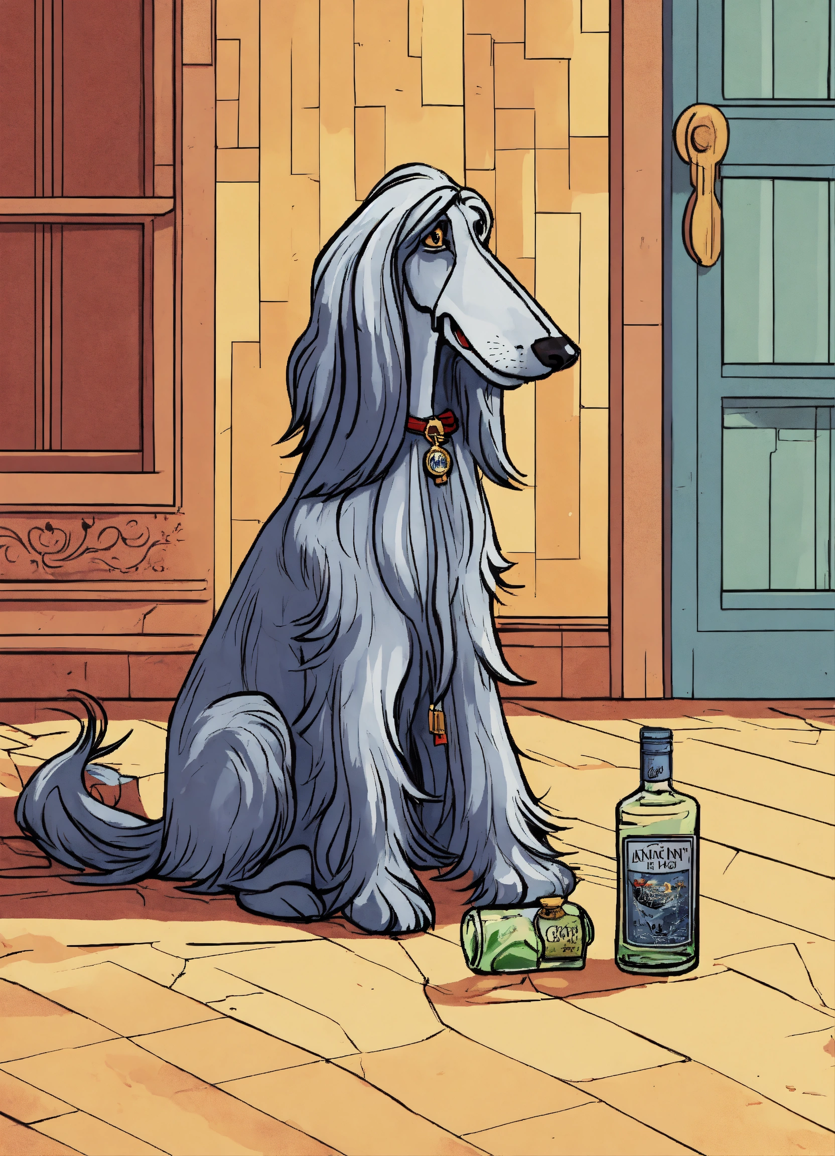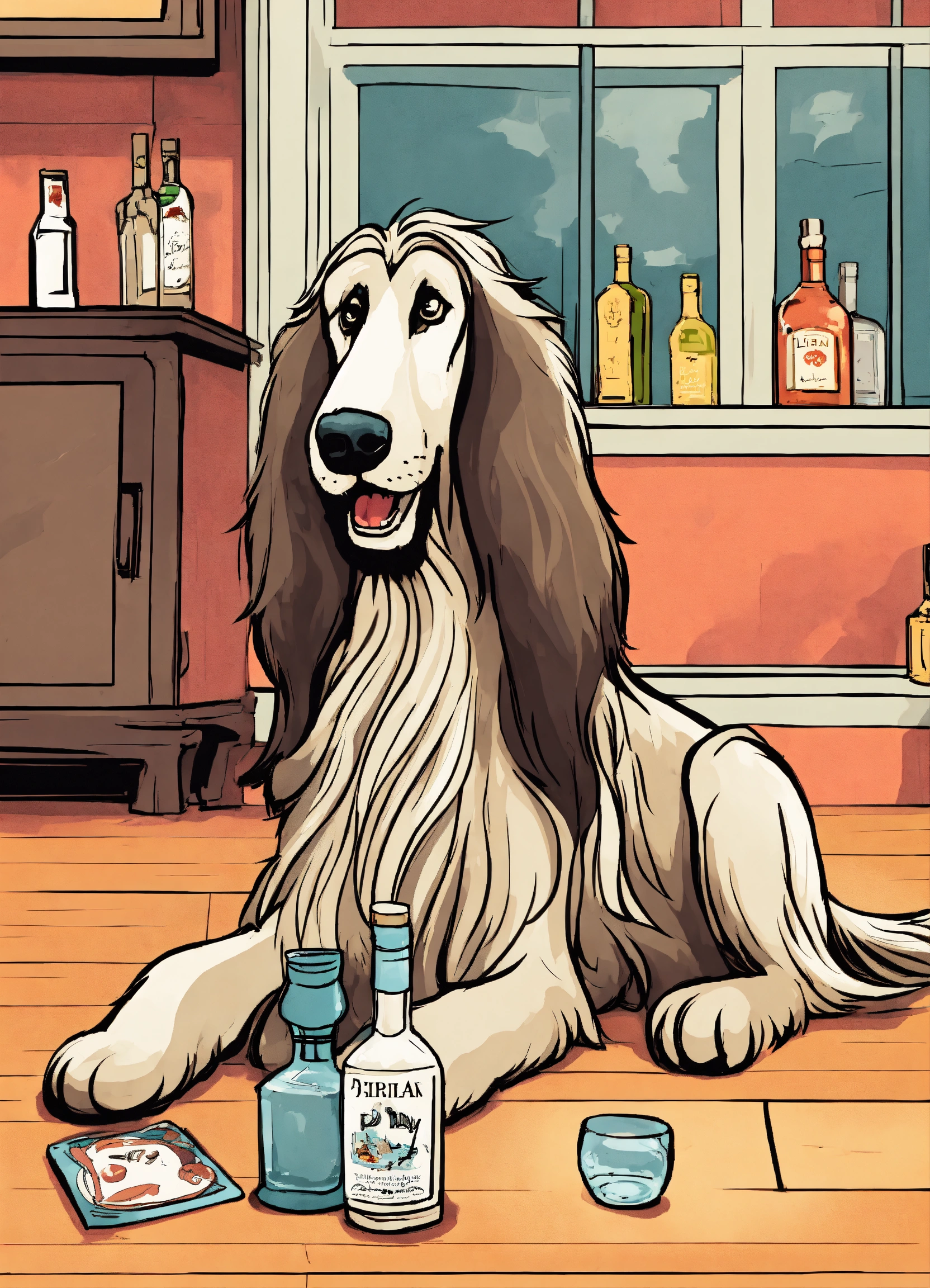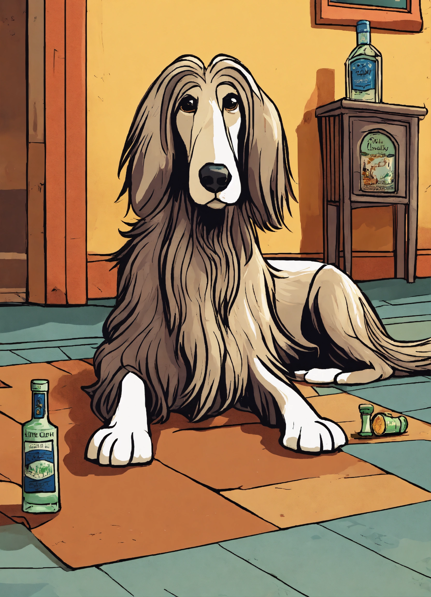 Cartoon style illustration of a life like drunk afghan hound on floor with bottle of gin beside him, cartoon, fantasy, whimsical