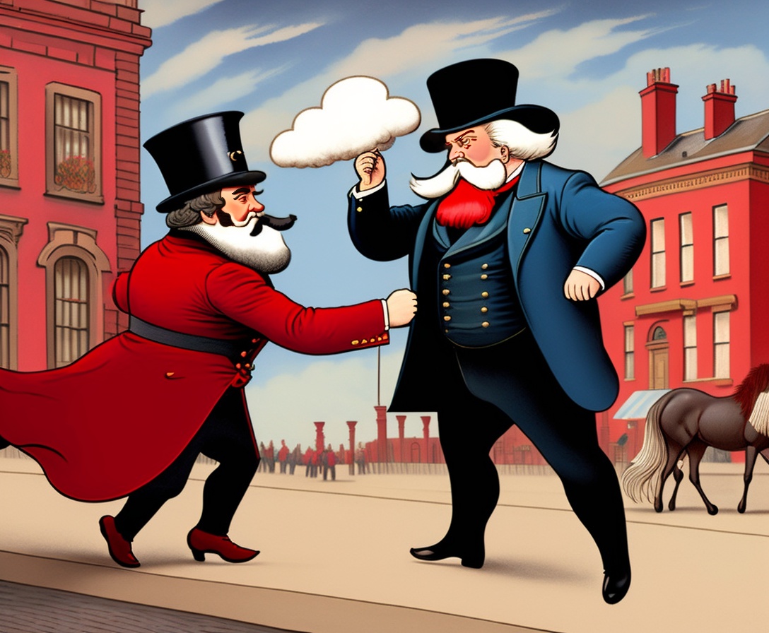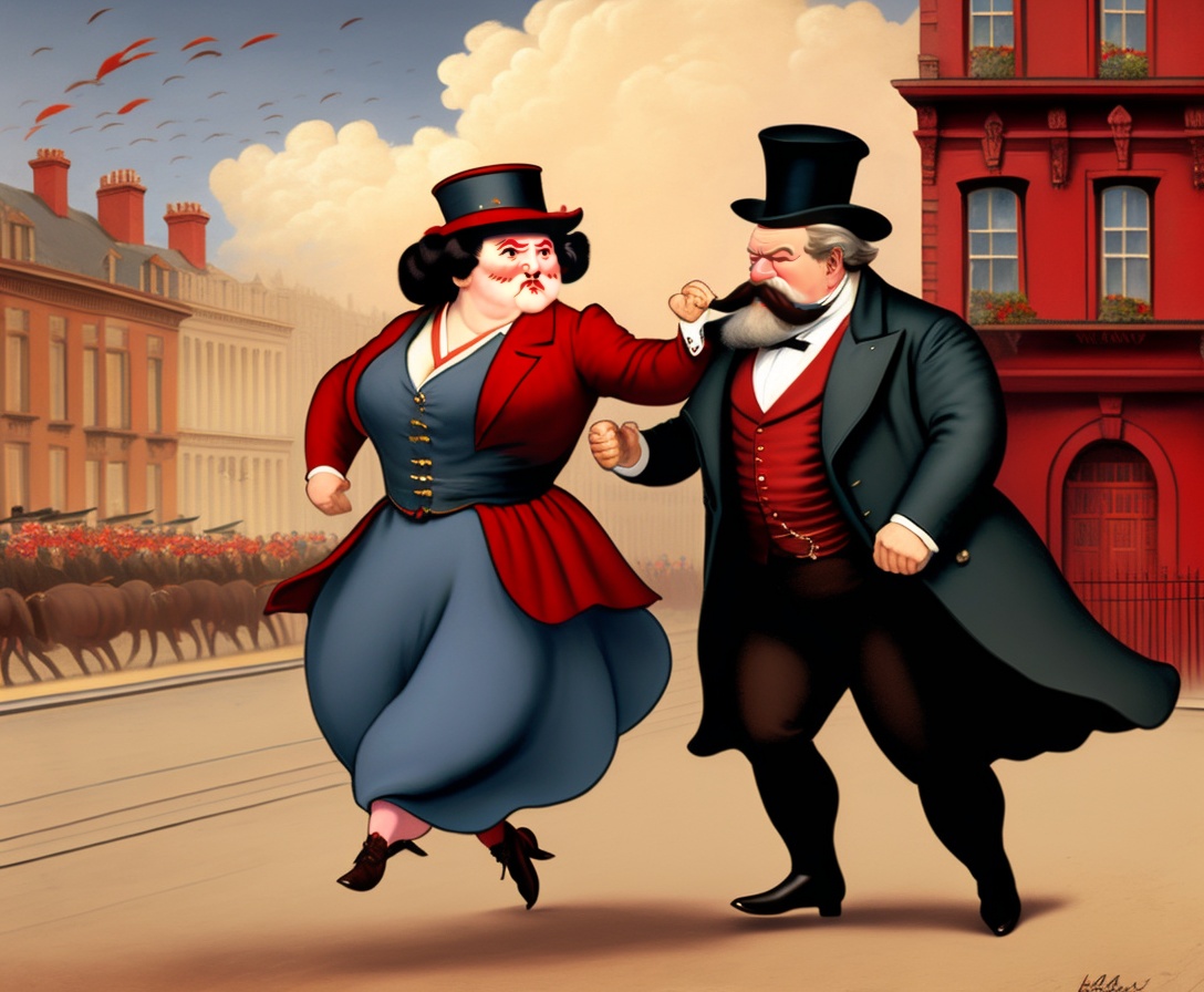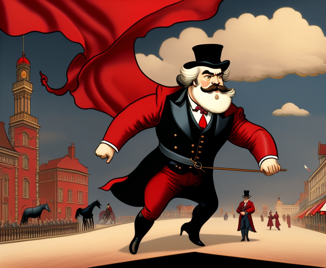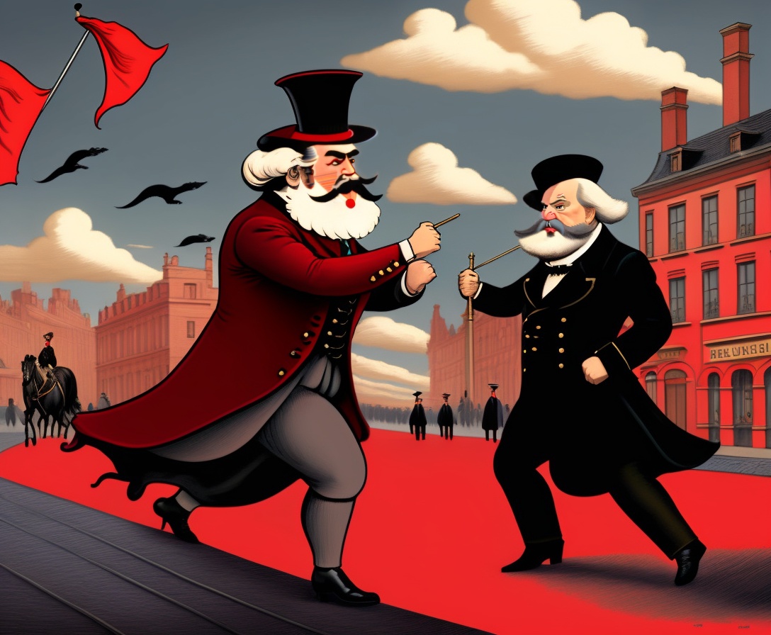 Old karl marx in a red 1930s suit fights a fat bourgeois in a black victorian suit in an 1800s top hat with a monocle, marx grabs him by the collar while preparing his right punch, marx look furious, bourgeois look panicked. red flags in the background flying over buildings in a victorian style, empty street with a few horse-drawn carriages in the background, black horses, blue sky, visible white clouds, tin tin comics style, pencil and ink, vintage 40's