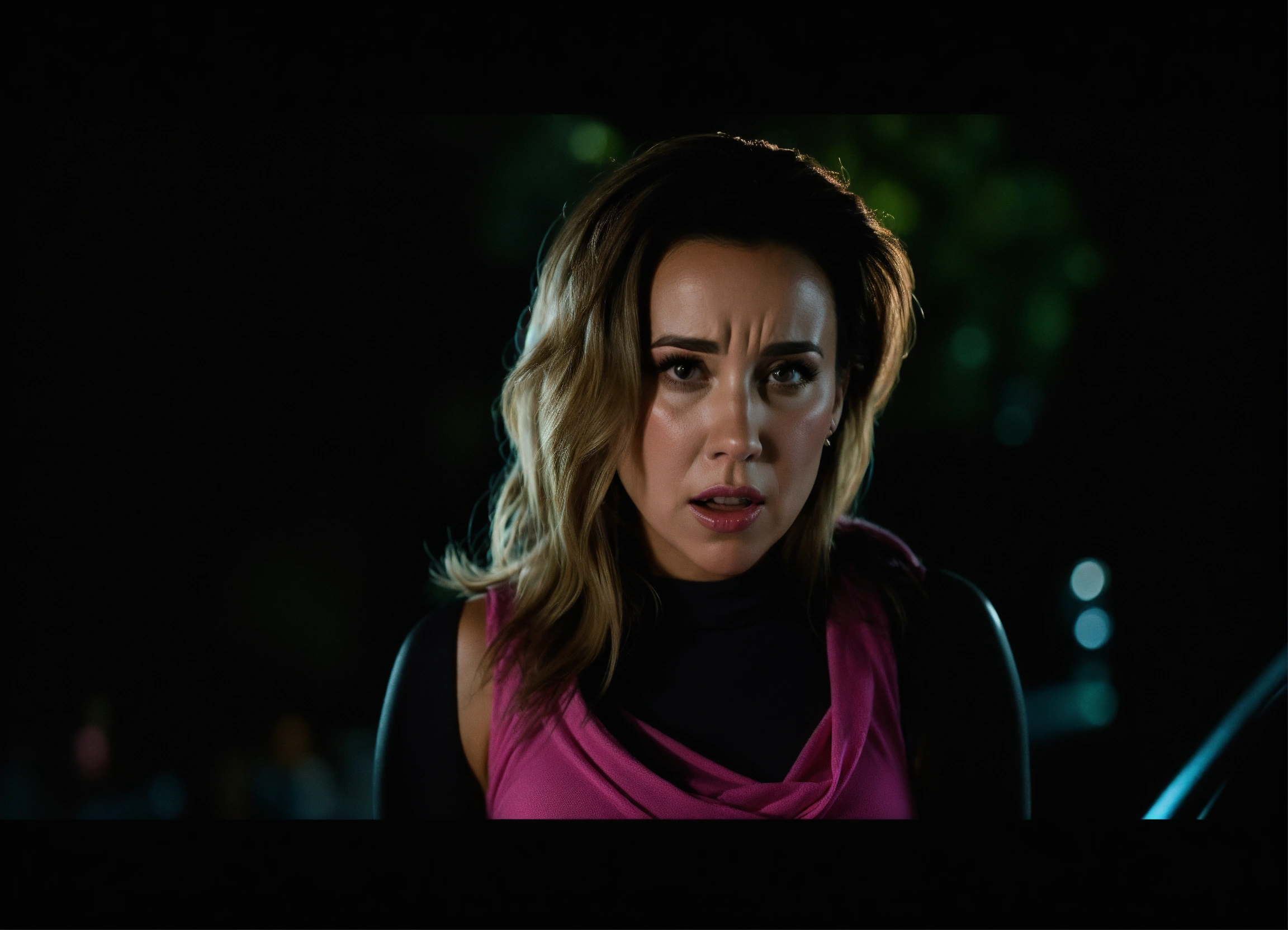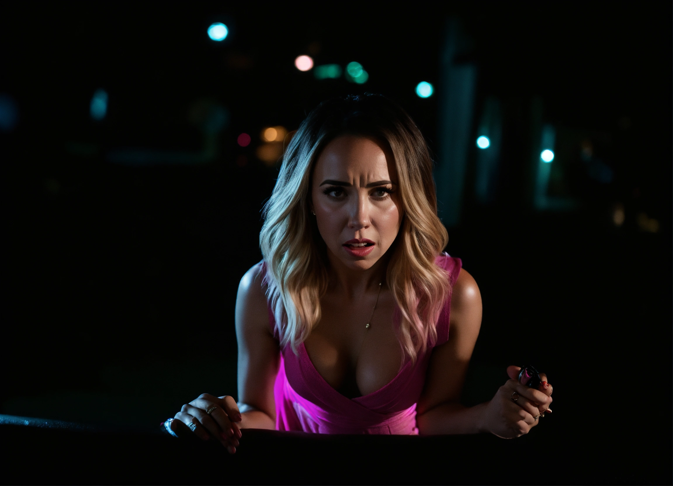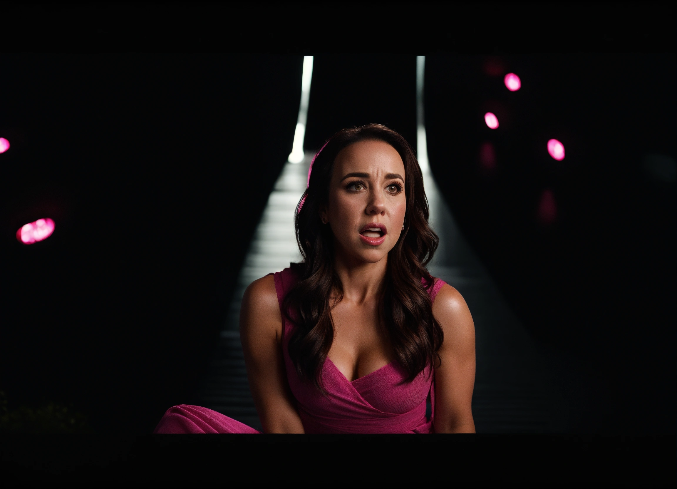 Full body 8k wide angle image of scared and shocked in pain lacey chabert wearing a tight sleeveless dark pink cotton wrap over mini dress pink tight gogo,