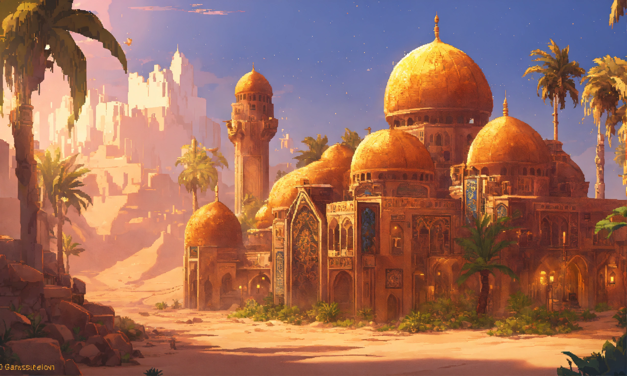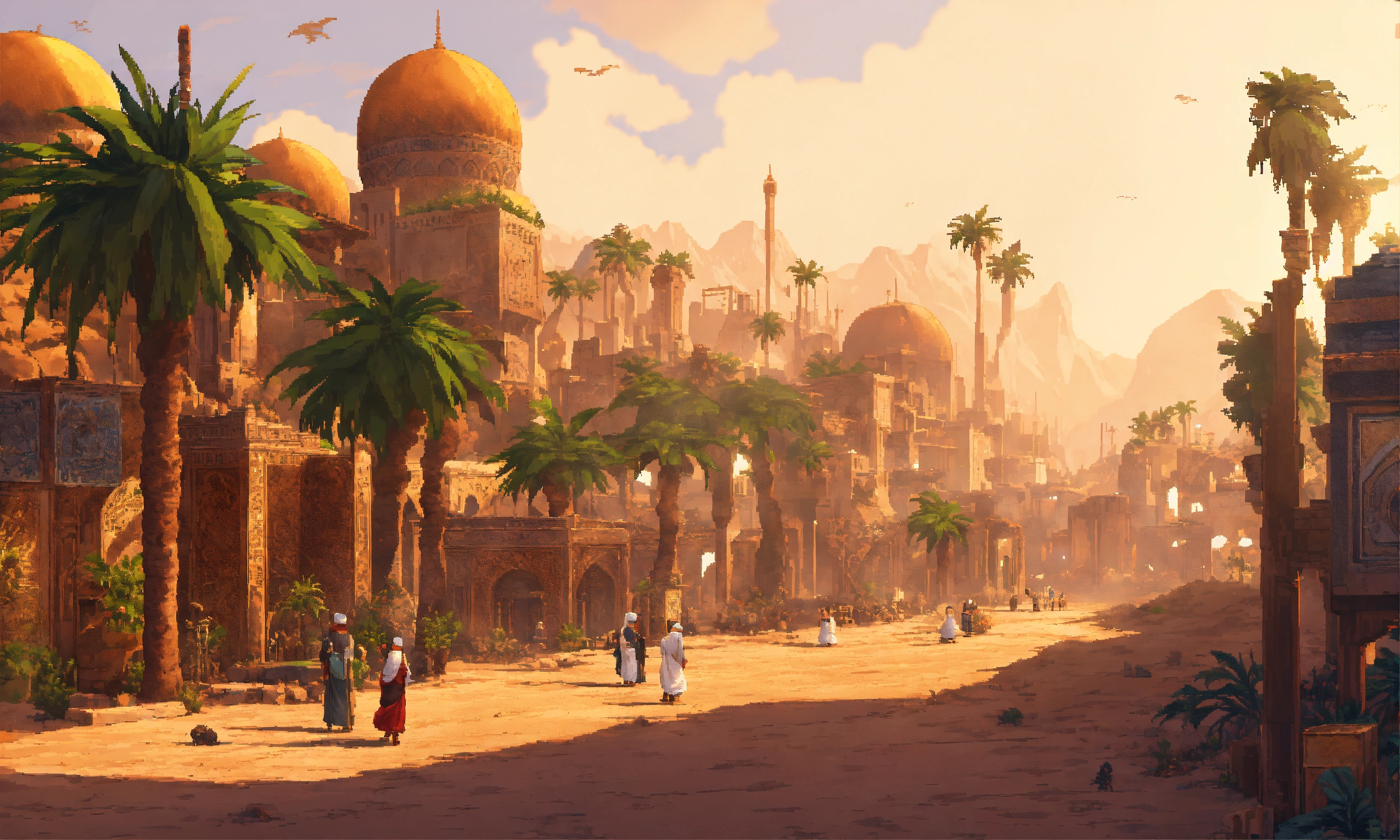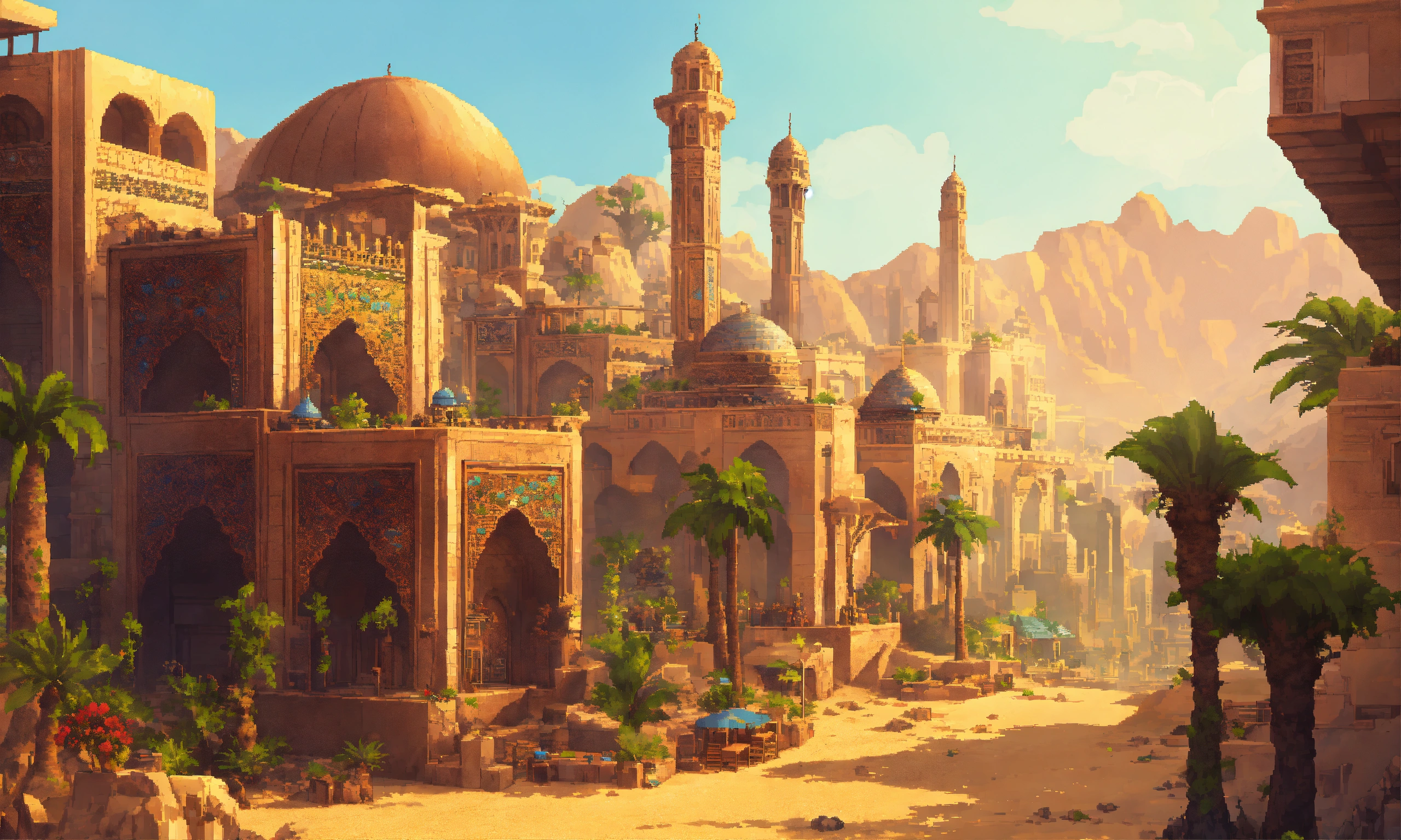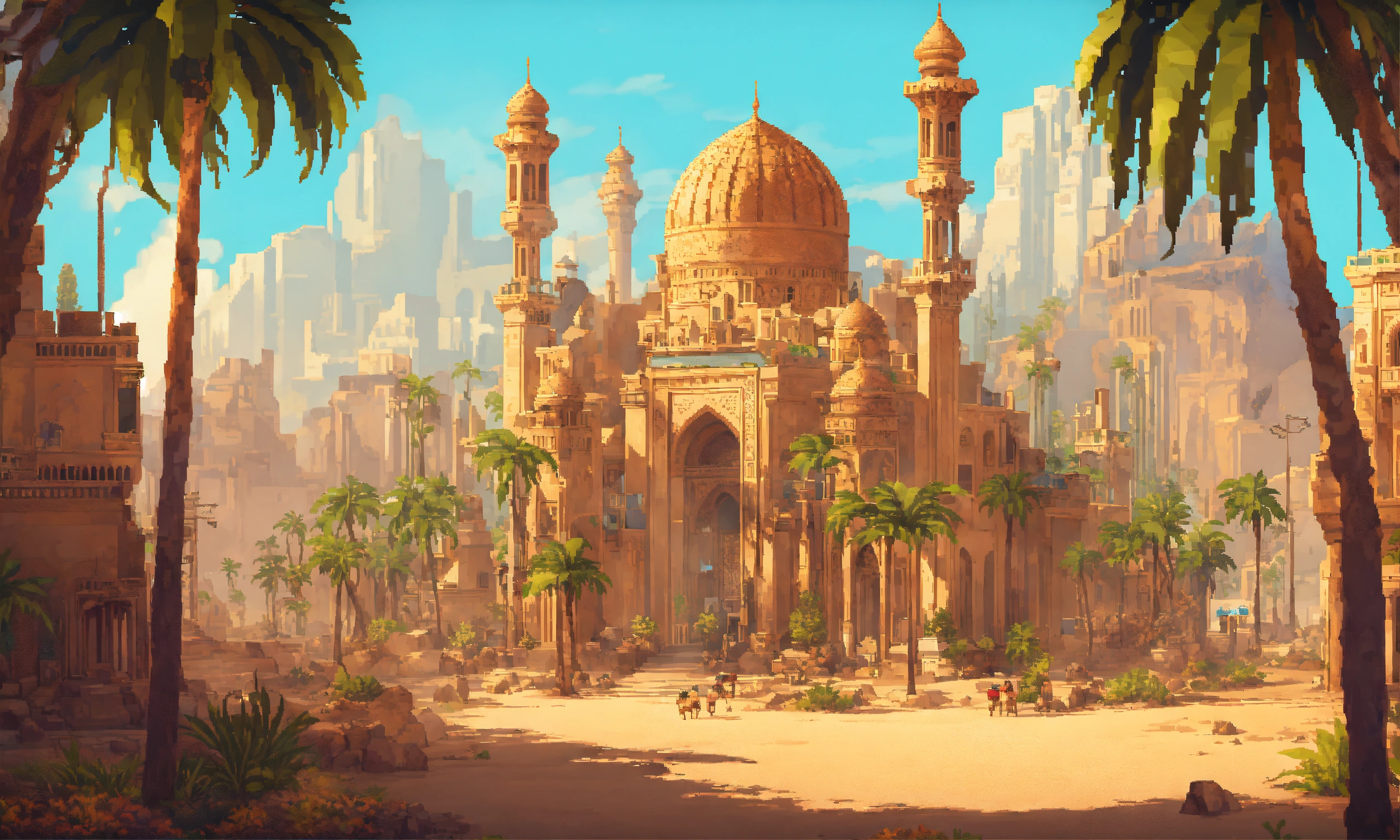 Desert city, pixel art detailed, intricate details, bustling city, islamic architecture, palm trees, fantasy, artstation, cinematic, pixel art, kurzgesagt