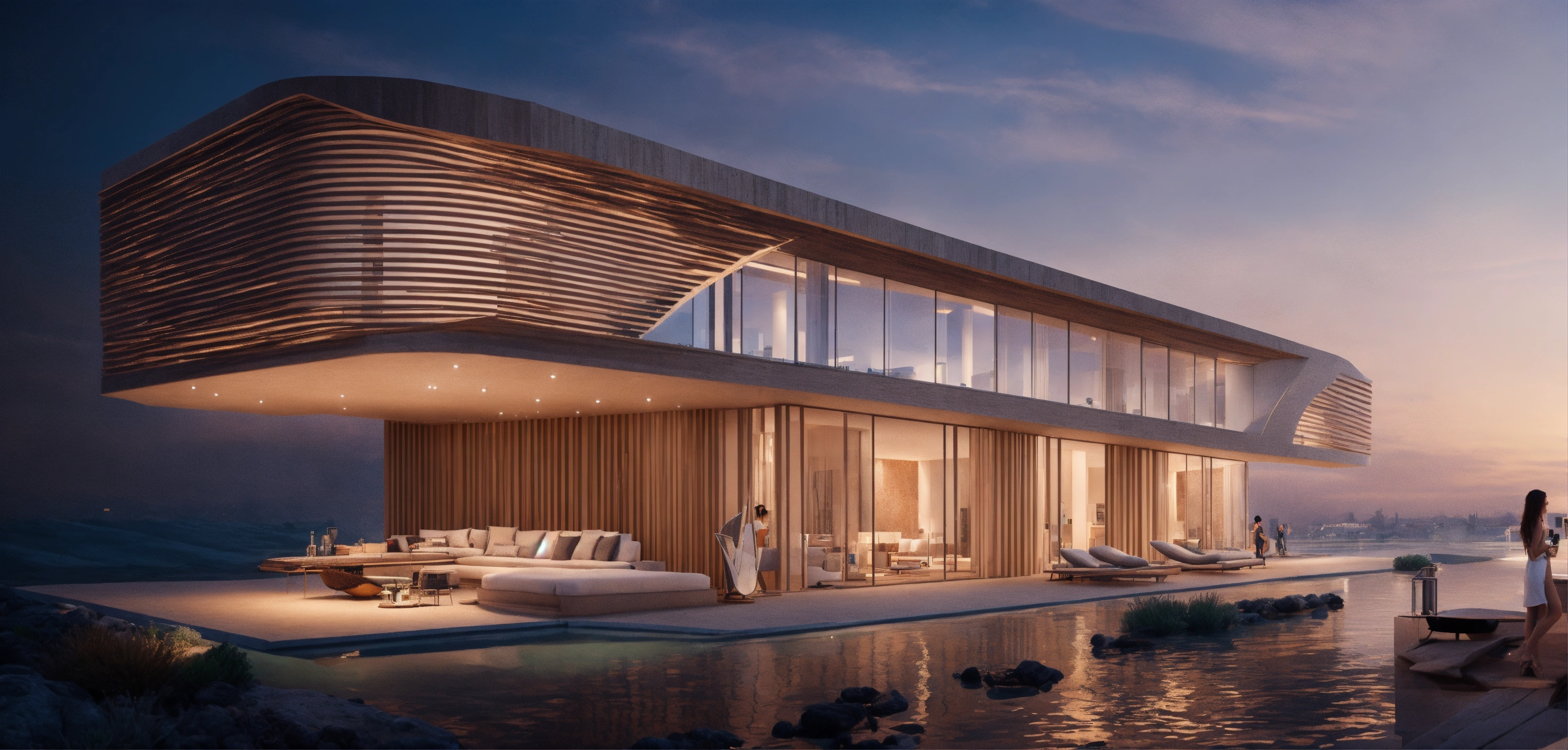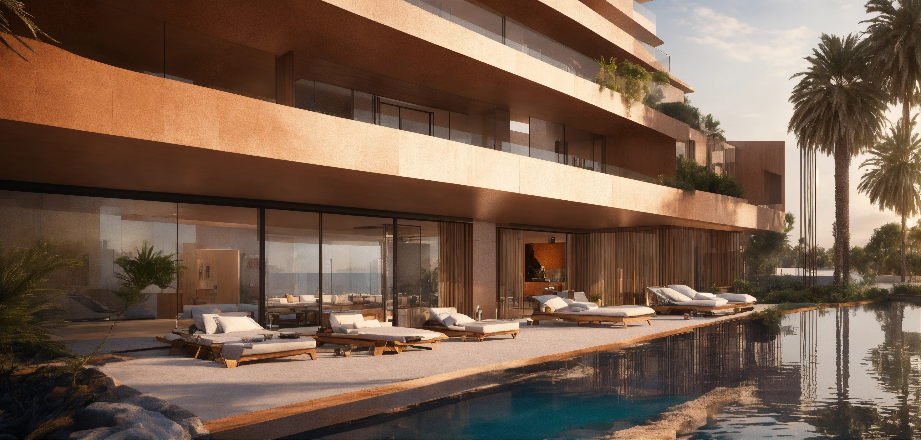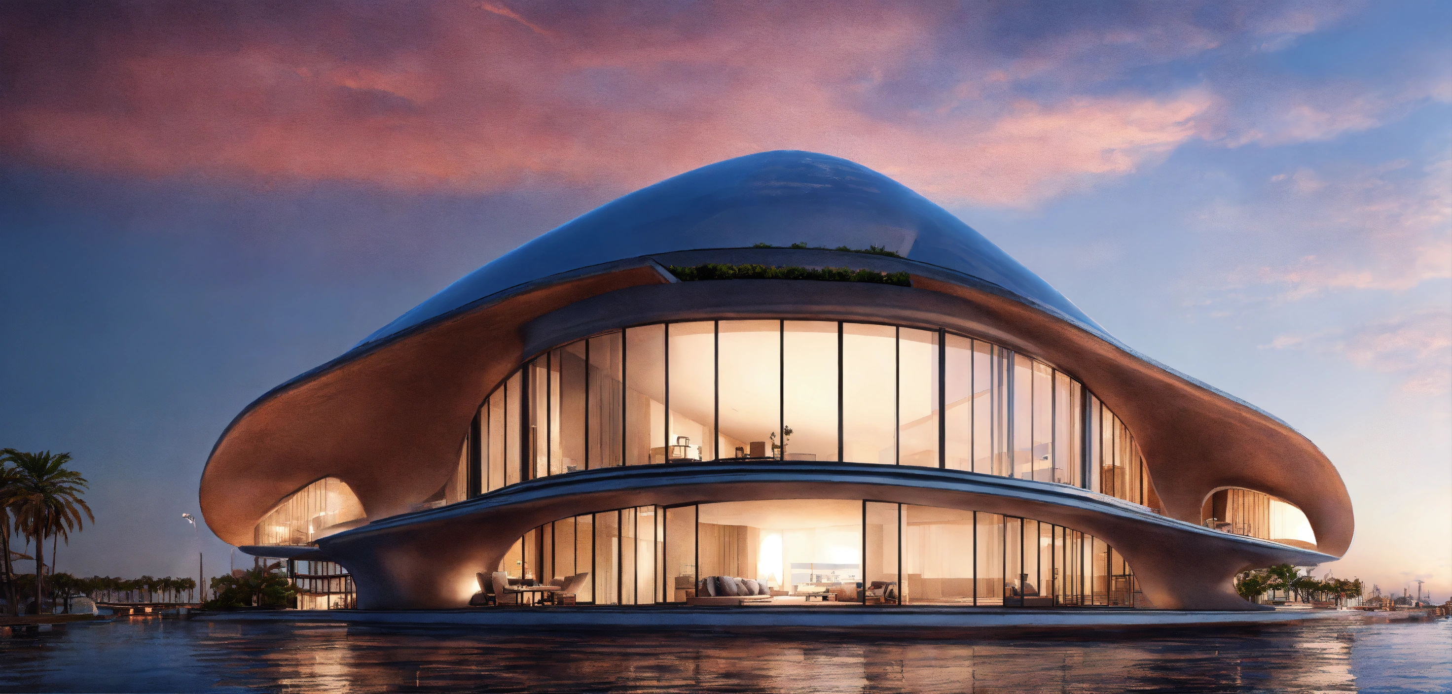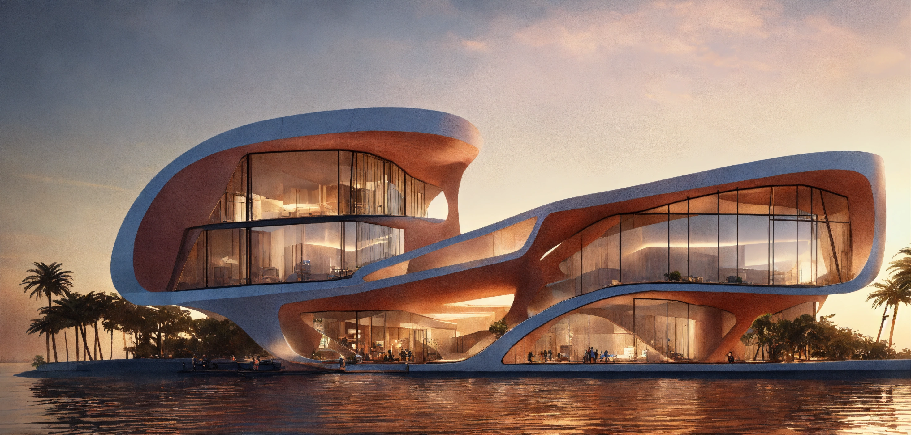 Una imagen con 5 propouestas similares de la fachada de un grupo de residencias en la nueva venecia desde el interior, en el mar arabe, construida por haha hadid