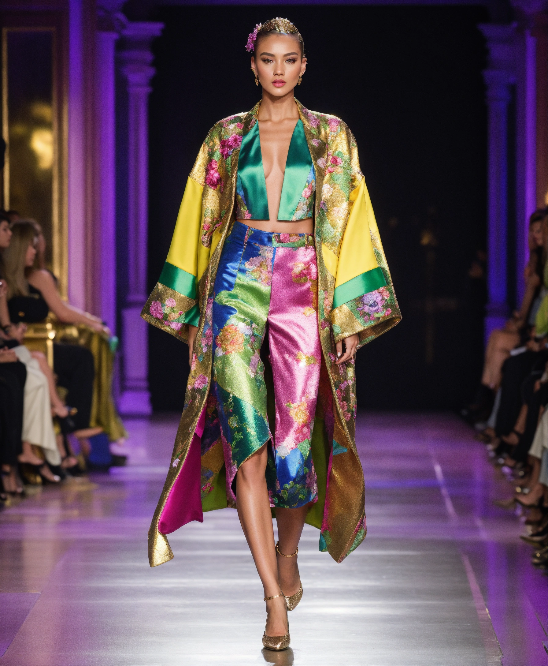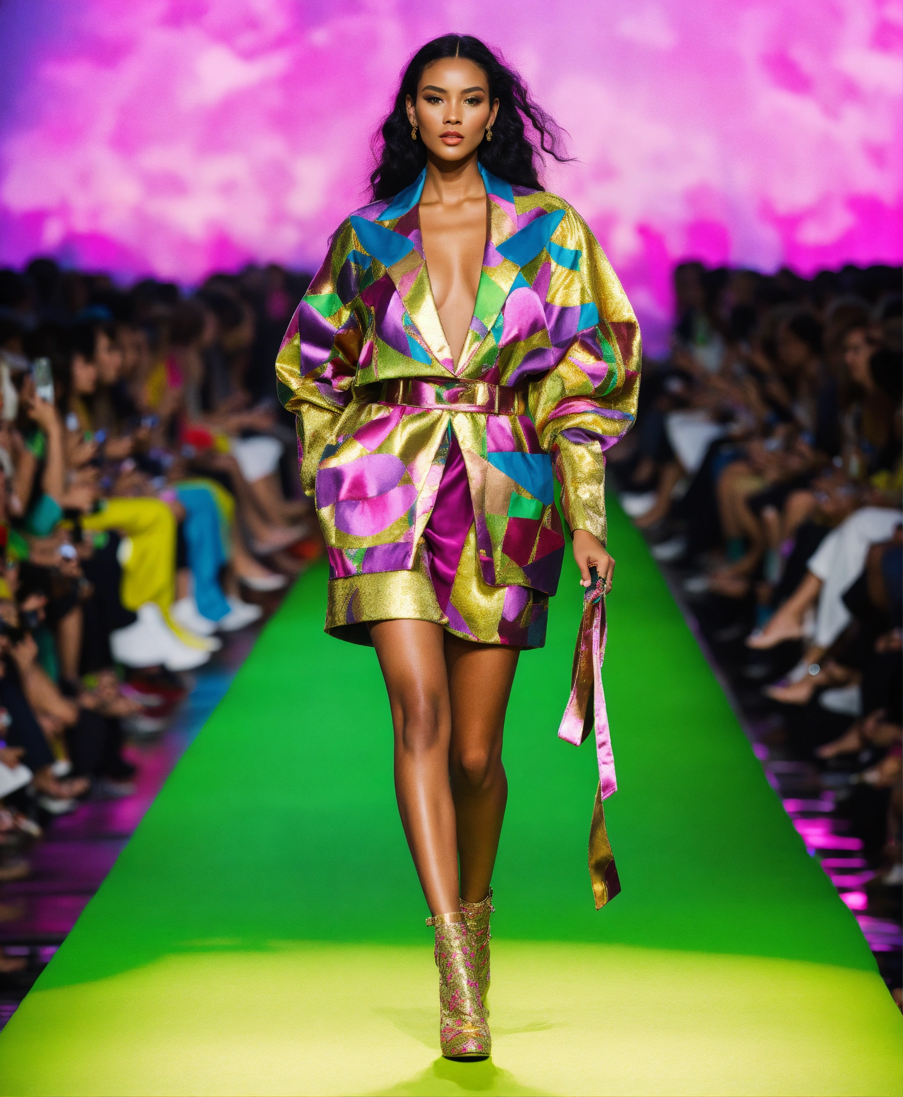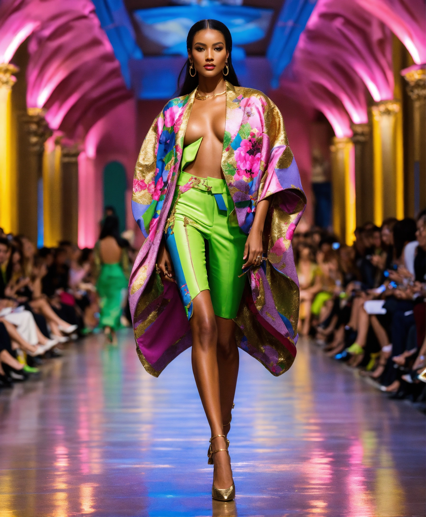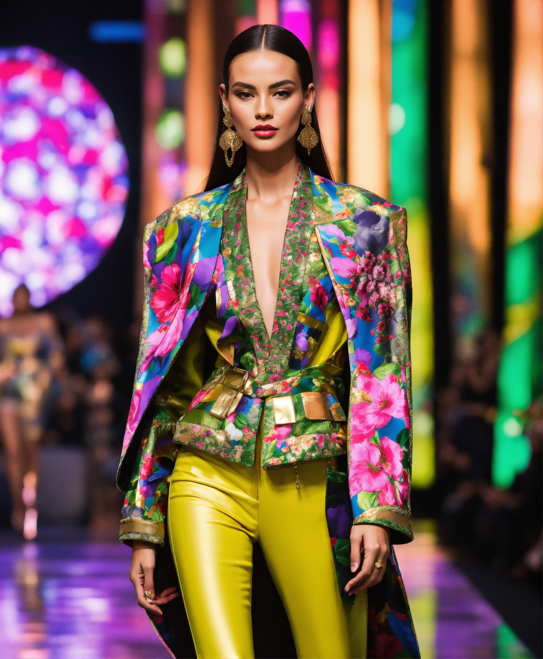 Ultra realistic full body photo of a trendy american model walking the runway modeling summer designer novelty interesting complex unusual street sporty classy modern dolman sleeve outfit brave, paris versailles details cutouts and and gold geometric pattern floral structured tailored jacket pink gold green lilac peridot silver magenta lime fuchsia yellow blue black gray copper mauve bronze haute couture ultimate elegance beautiful luxurious awesome wealthy resplendent magnificent sublime 12k