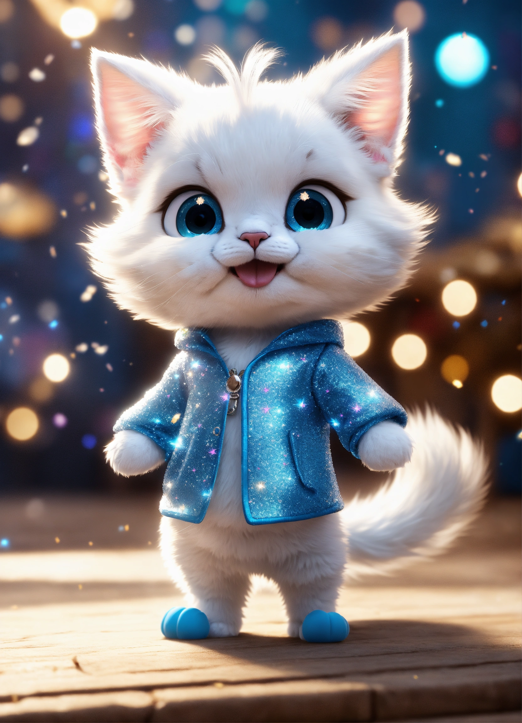 Disney cartoon character, chibi, kind fluffy white cat with shiny silver hair in glitter and blue eyes and smile, hair sprinkled with glitter dust, magic glitter, full length, unreal engine render, 8k