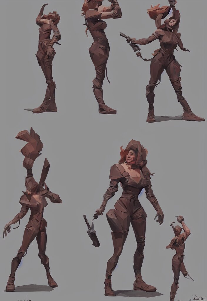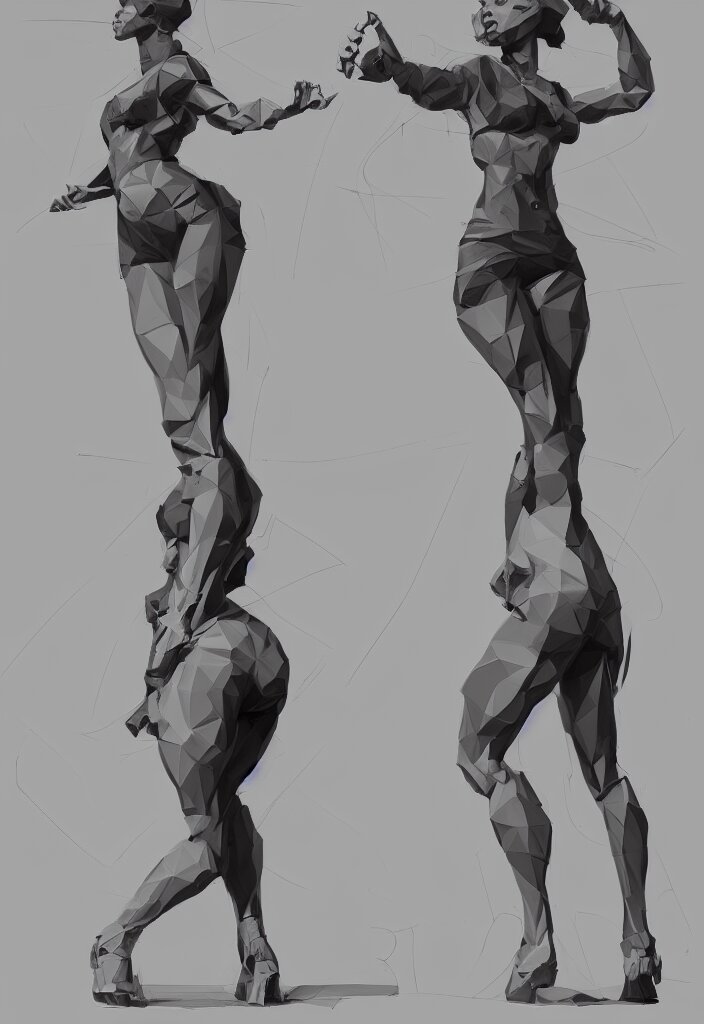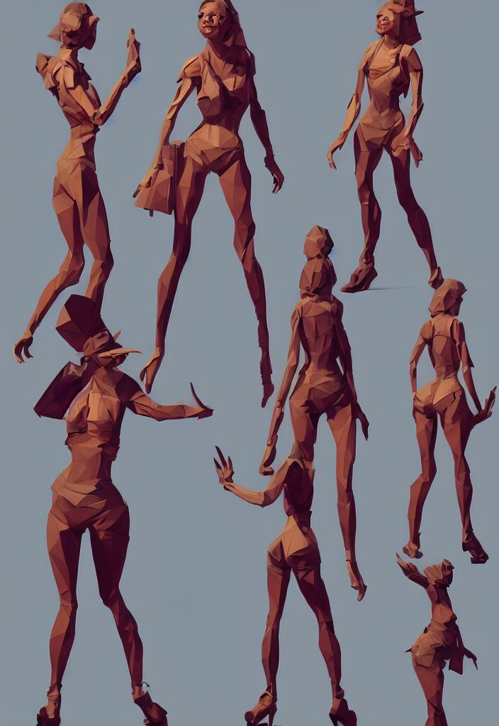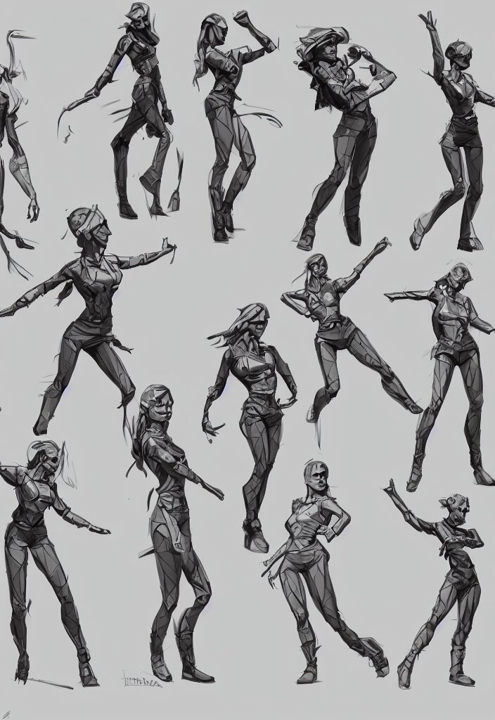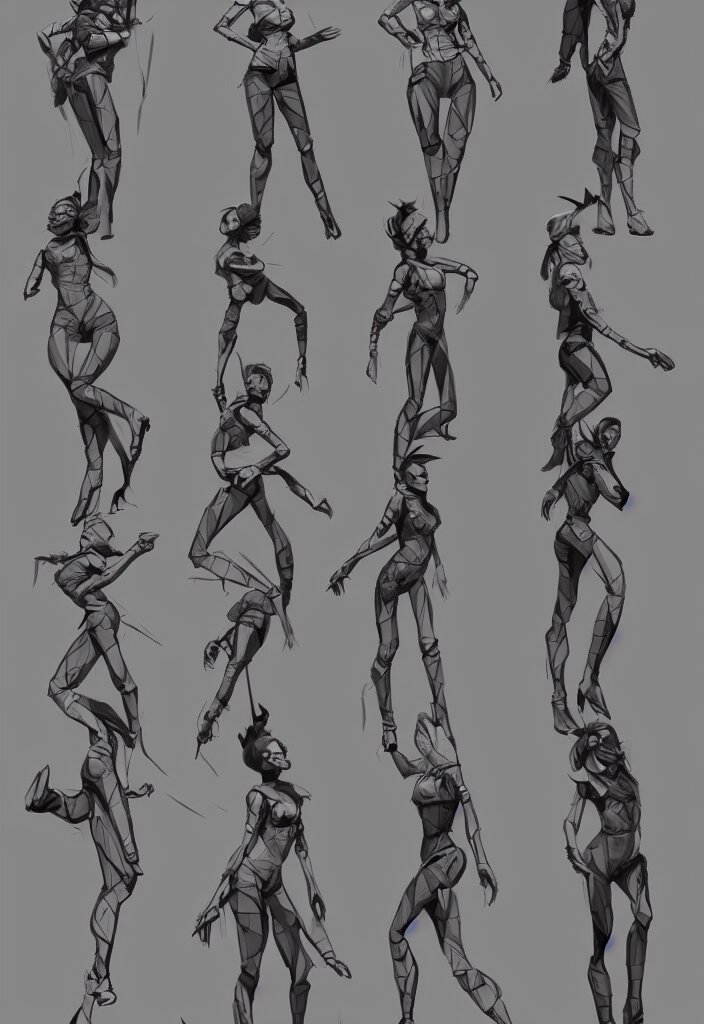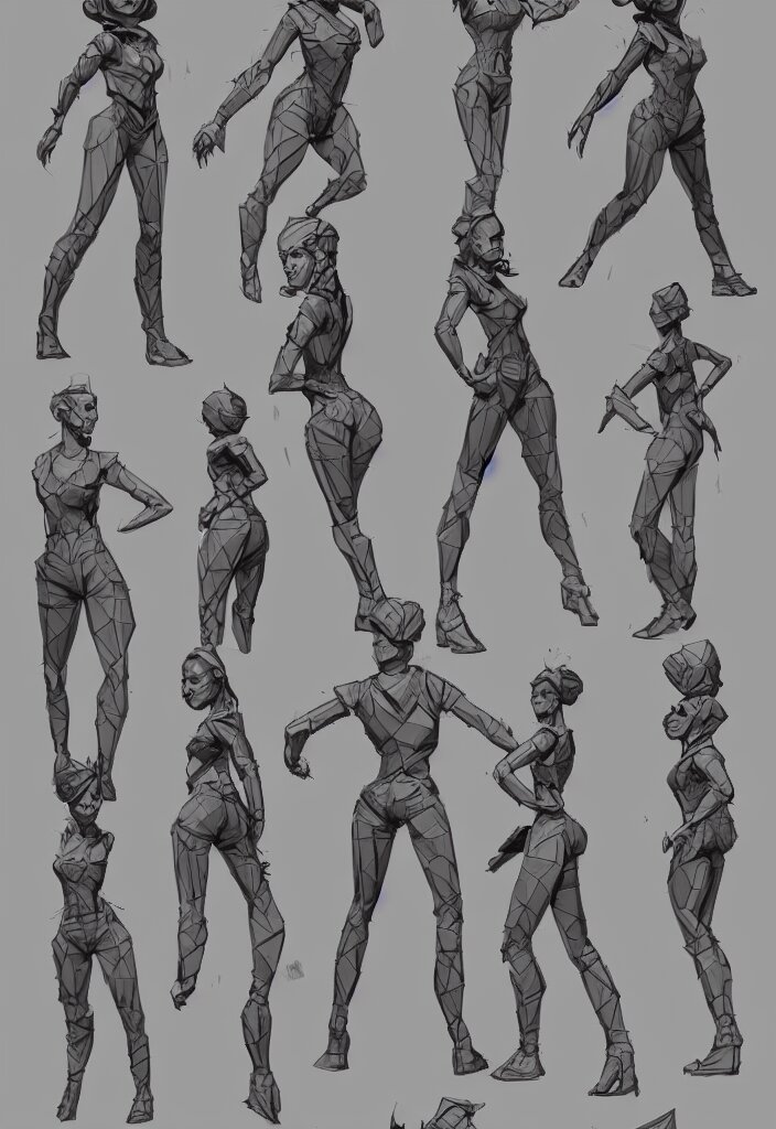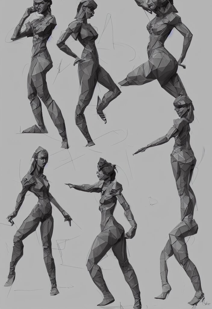 Amazing stylized random sketches of a young and strong girl by julian totino tedesco, concept art, full body with dynamic pose and correct anatomy, low-poly digital art, octane render trending on artstation, 4k, 8k, hd