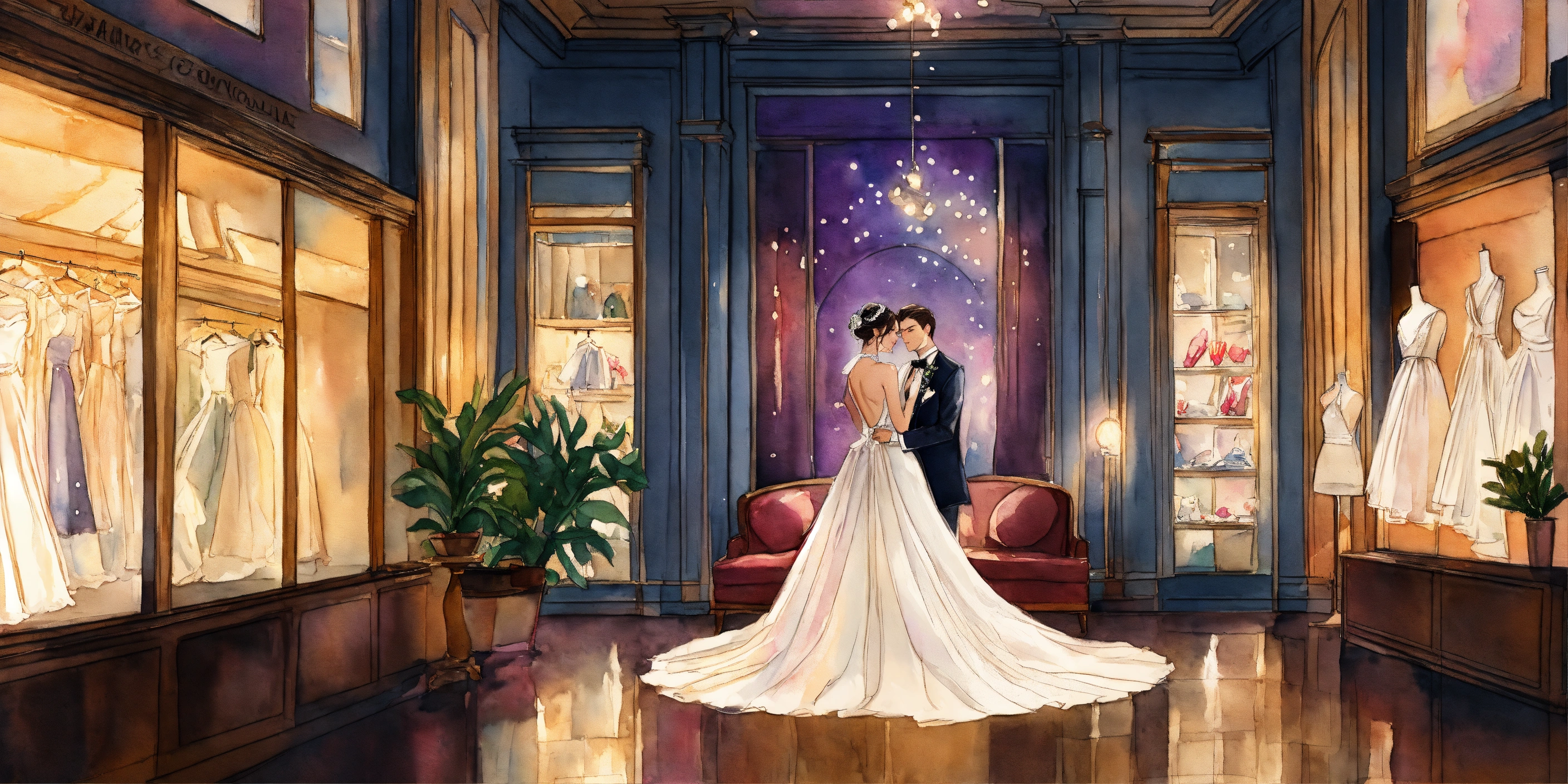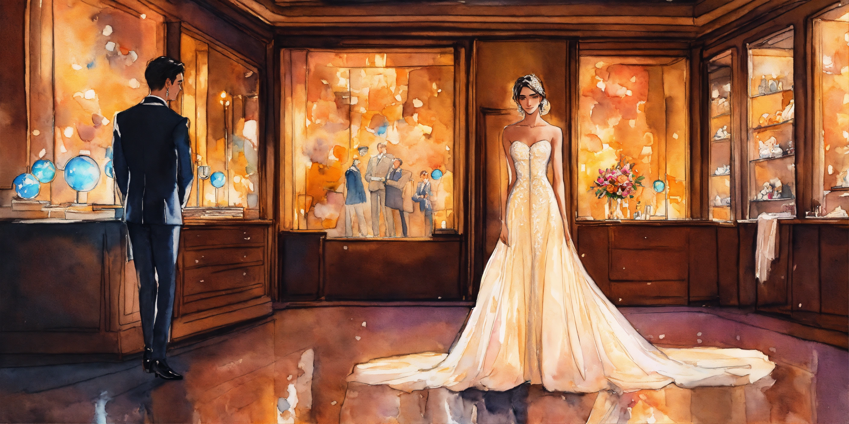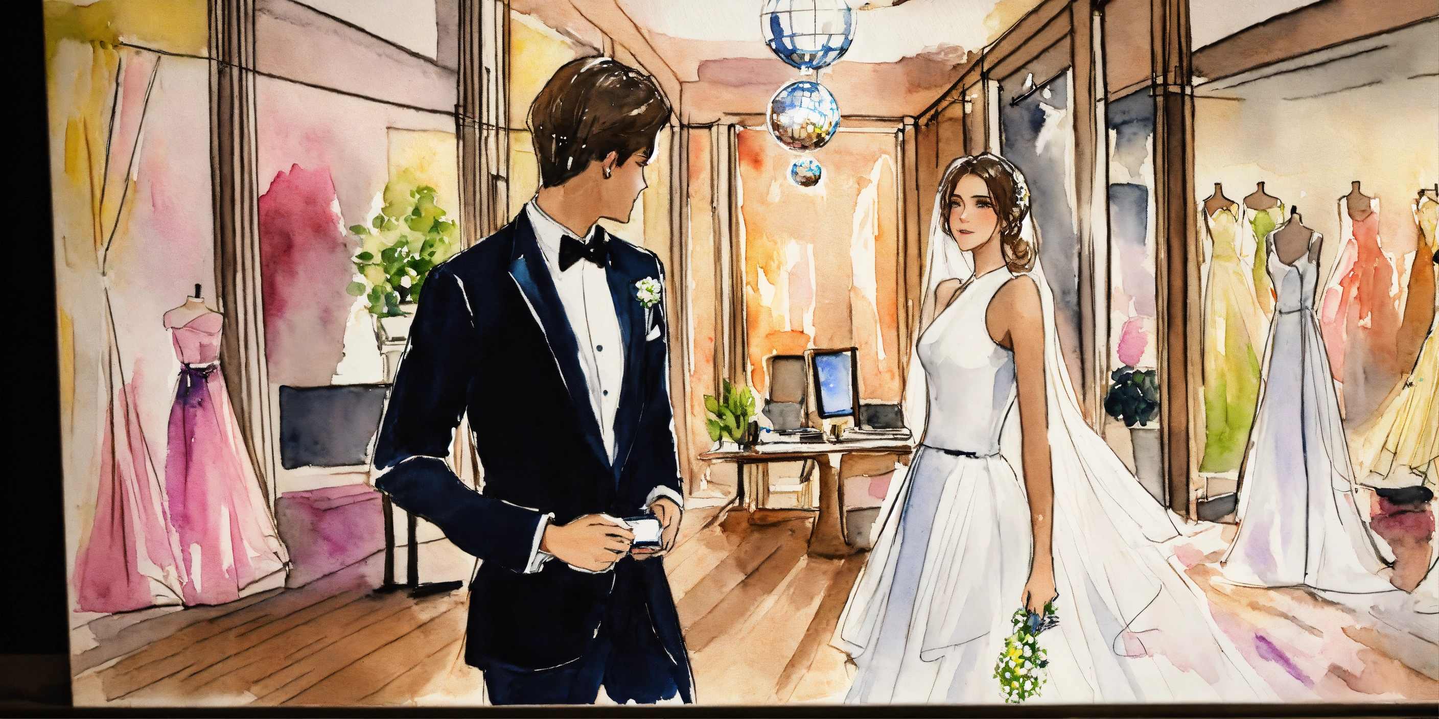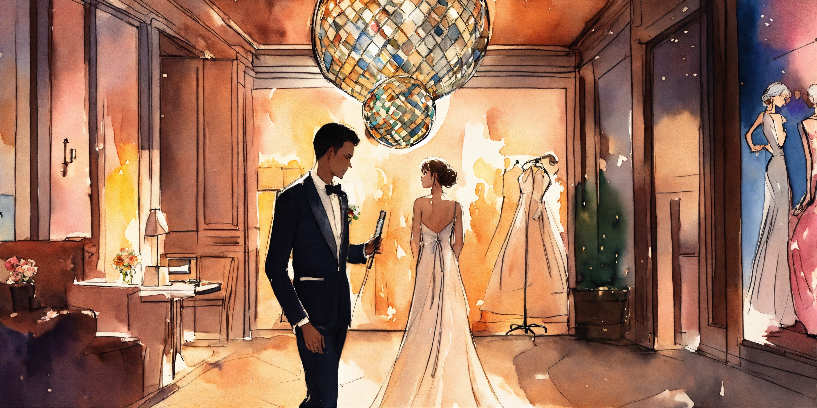 Drawing in either watercolor of a young man in a tuxedo, illuminated by a disco ball, with a soothing warmth surrounding him. they are in the luxury designer bridal shop. the year is in the digital era and the world is ruled by cats. he is in a super chic, upscale, beautiful designer bridal shop on madison ave. wedding gowns are displayed. he is styling the bride for her wedding day.