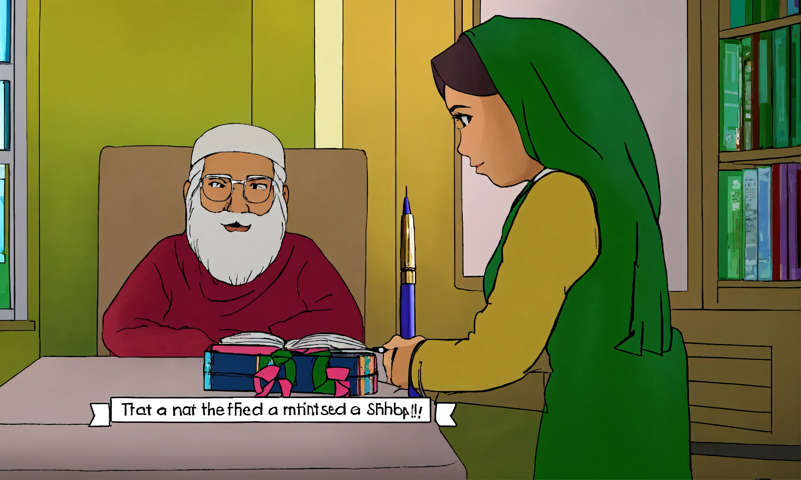 It happened that day too that a student appreciated shabnam's pen and without a moment's delay she offered me that pen as a gift. formally i refused, but then accepted. in ai cartoon image