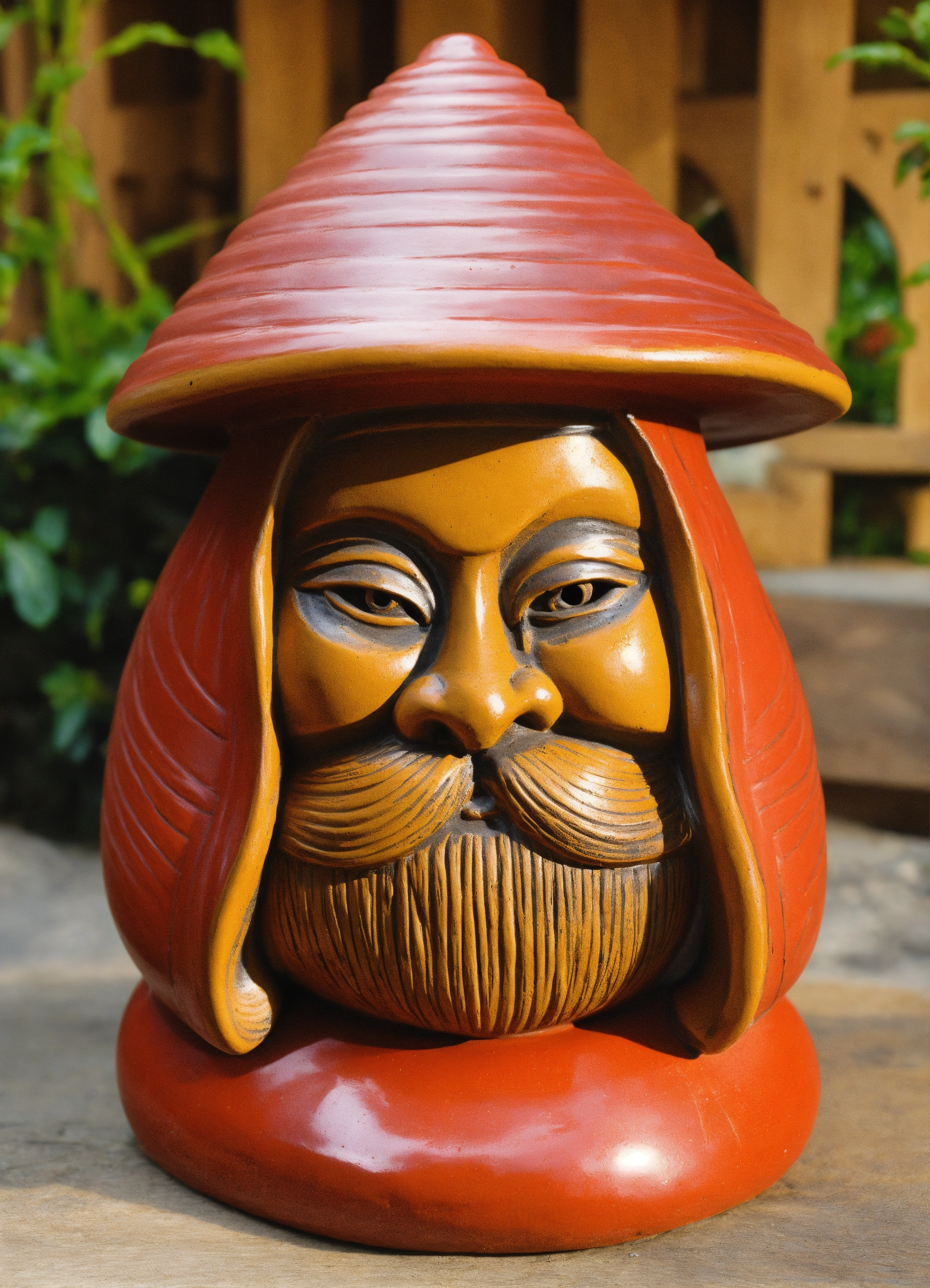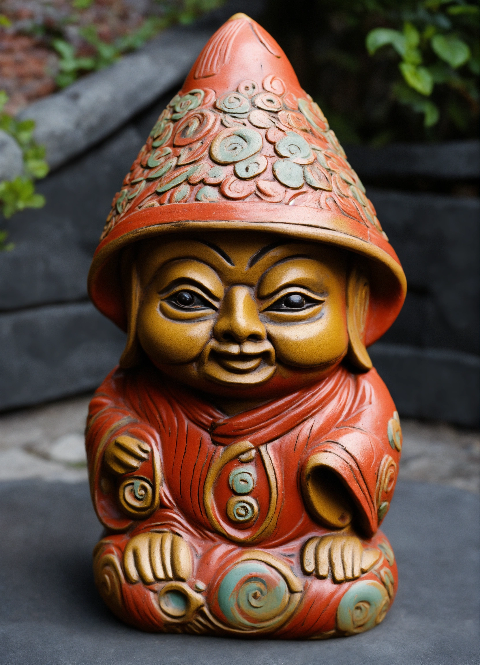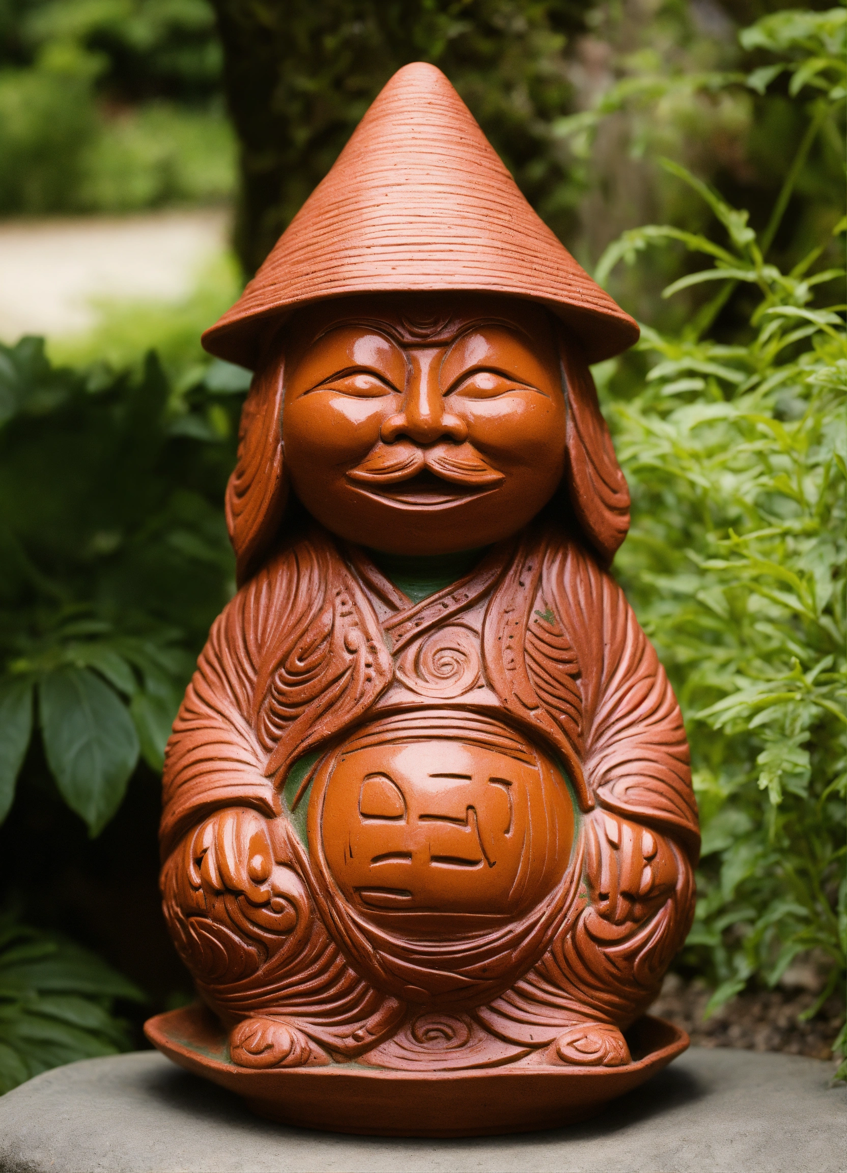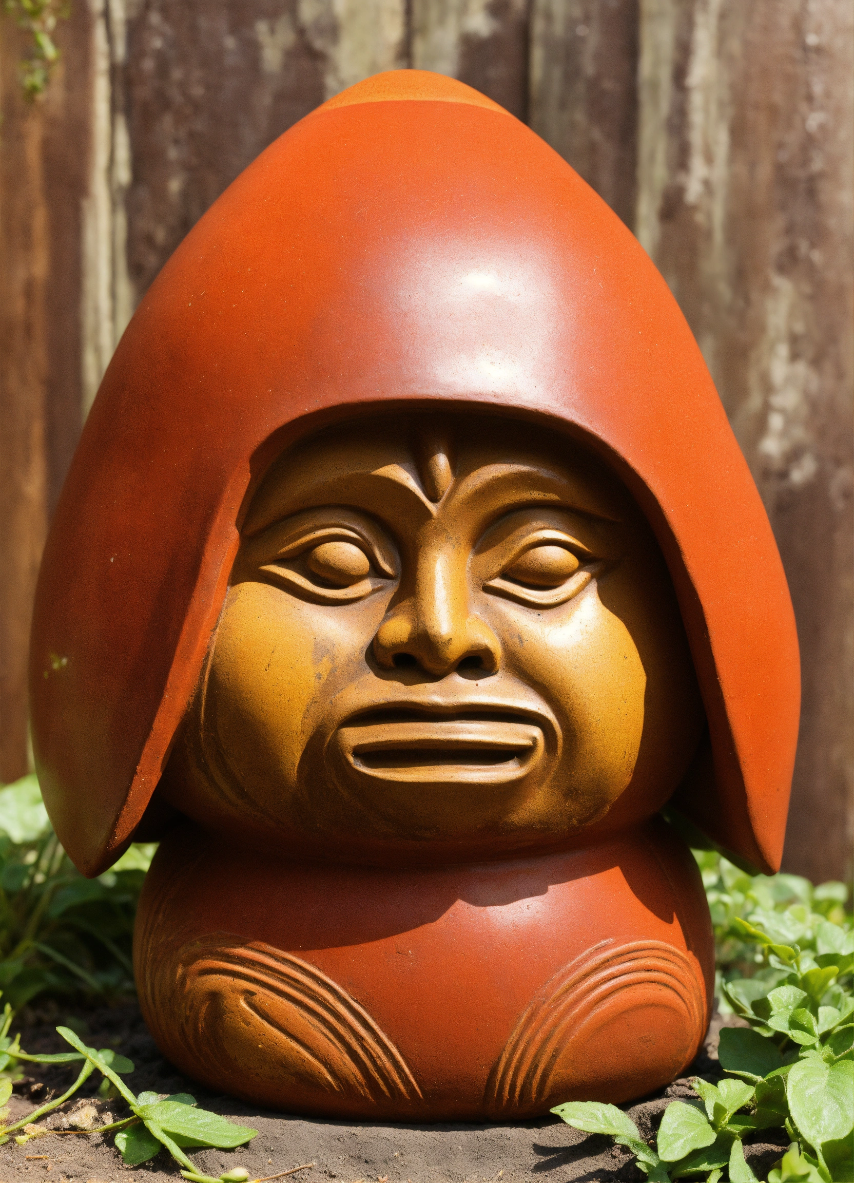 An ancient clay hooded sculptured garden gnome daruma shaped