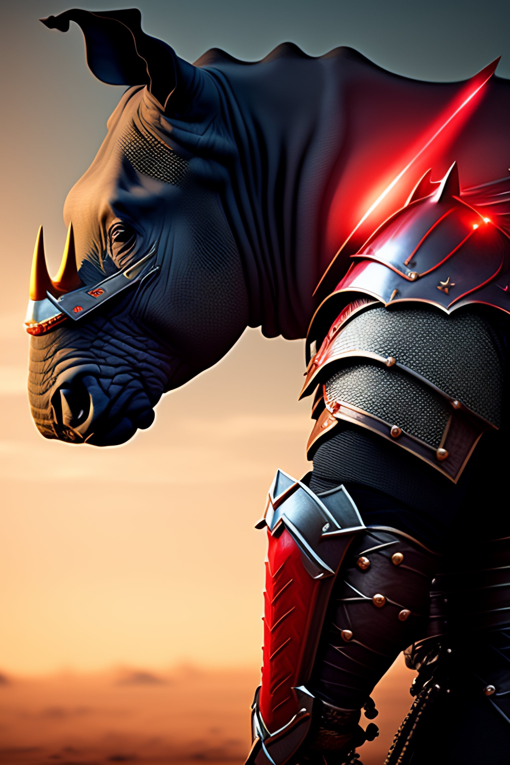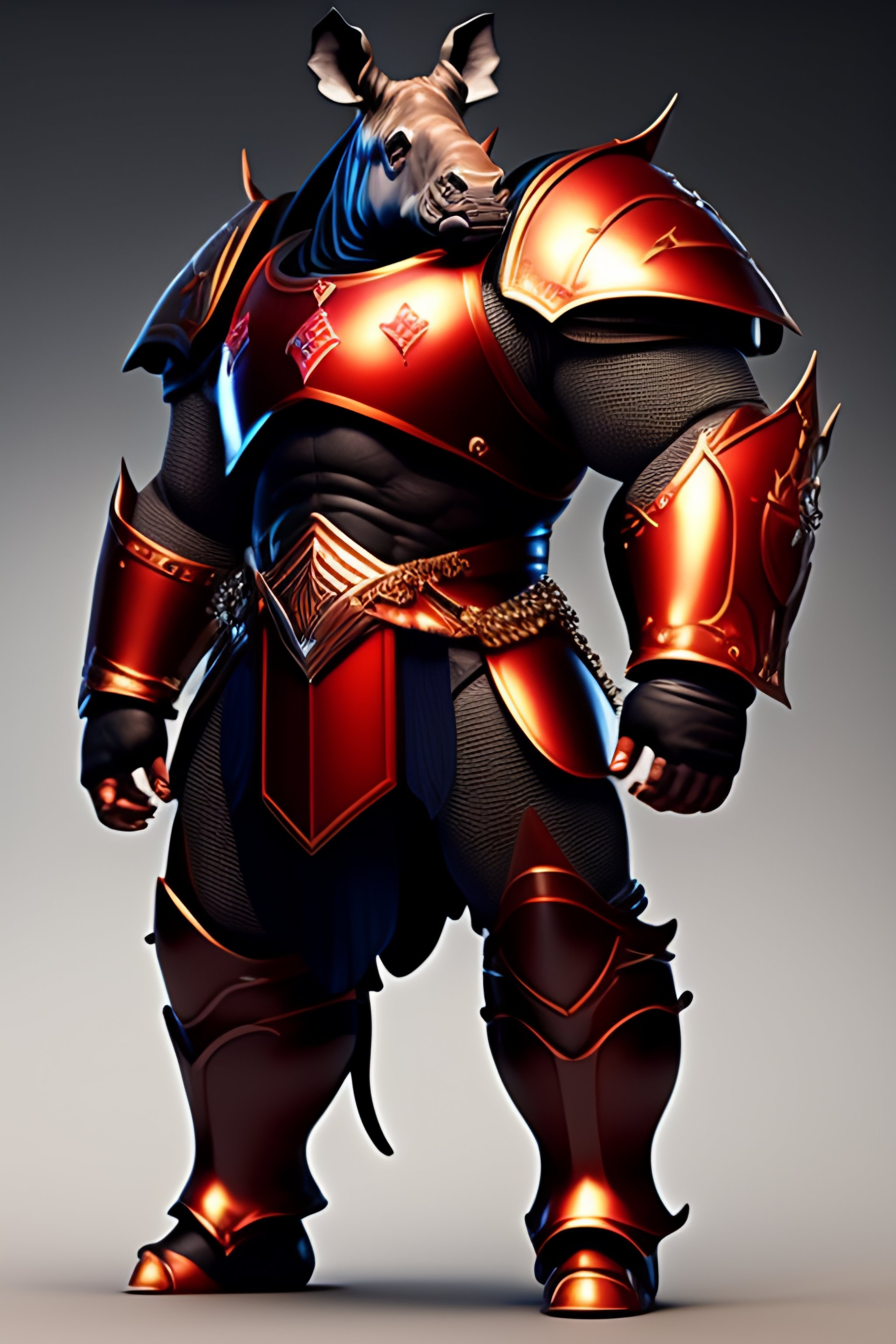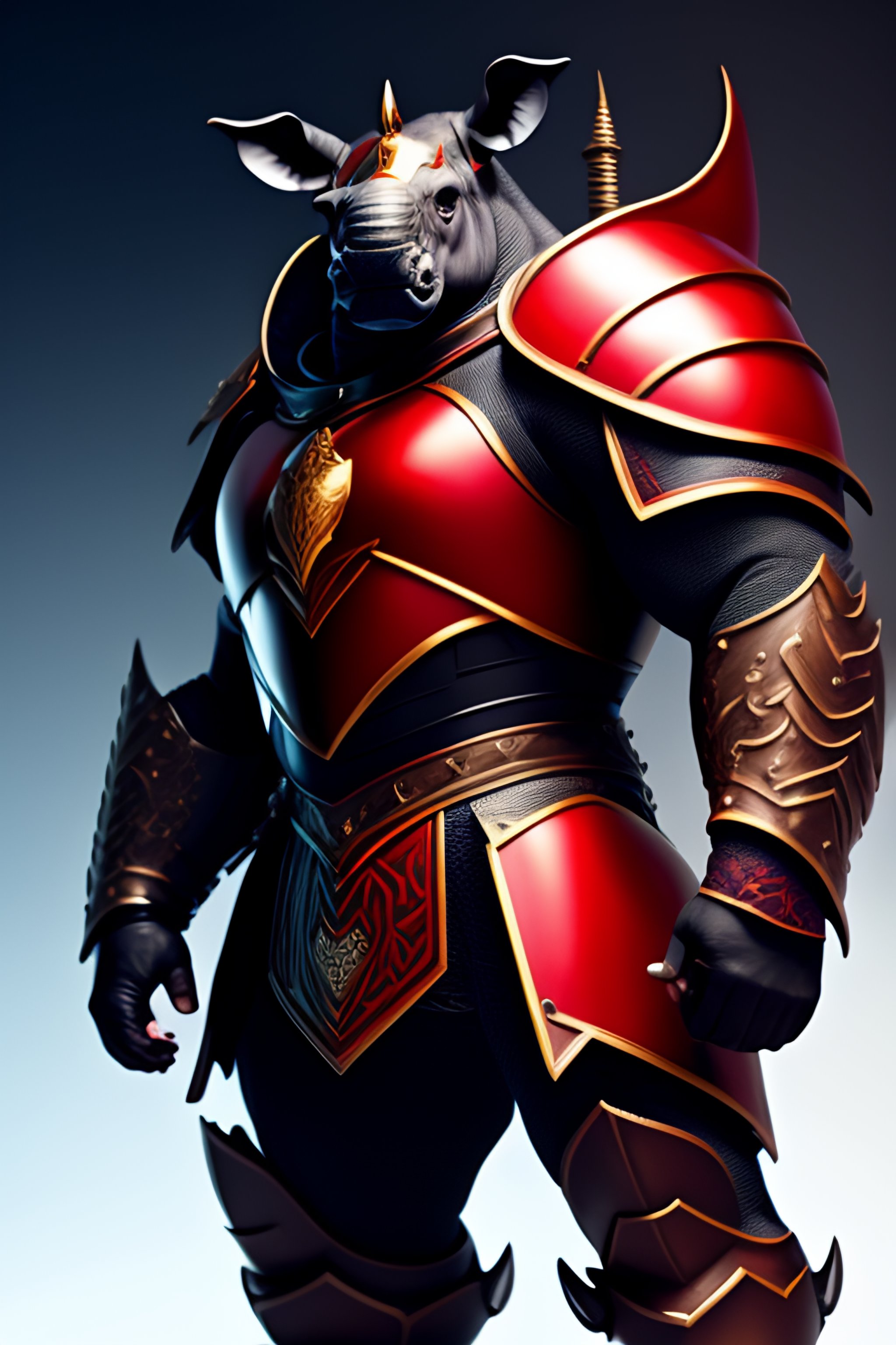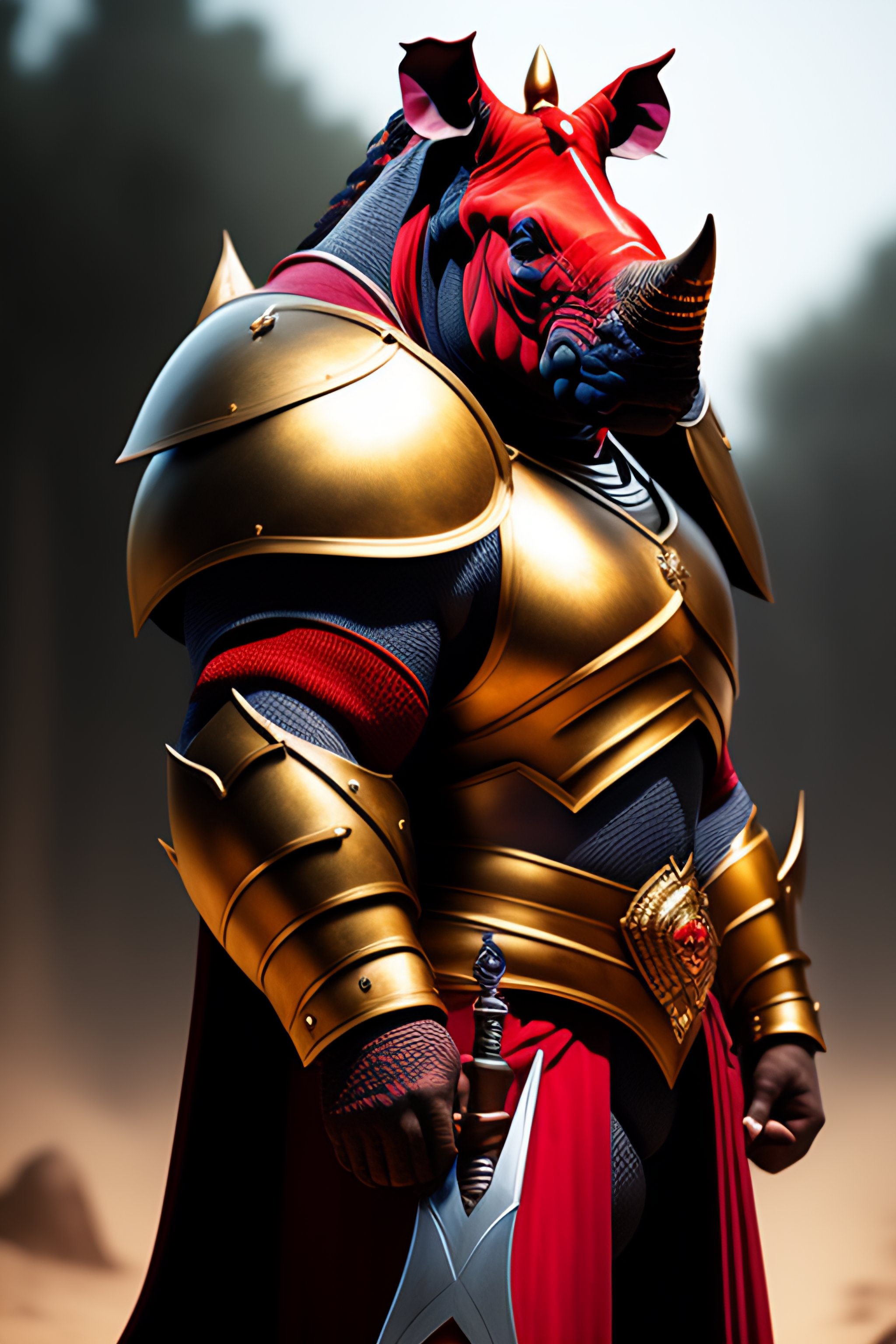 Furious humanoid rhino with knight armor sword in right arm and red energy around him realistic style