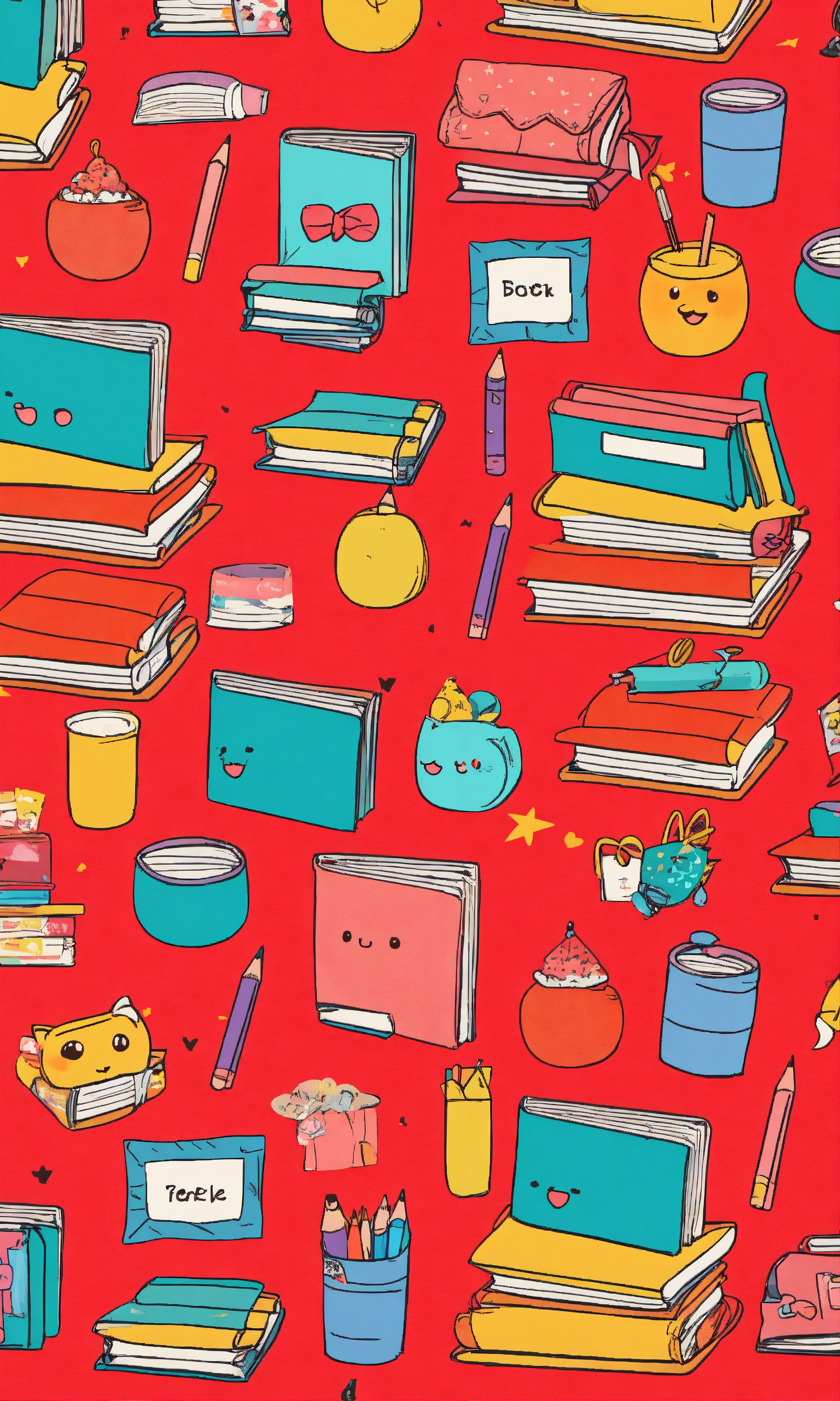 Vector clipart of cute kawaii books, cute pencils, cute notebooks, cute notebook paper in a repeating pattern on a red background