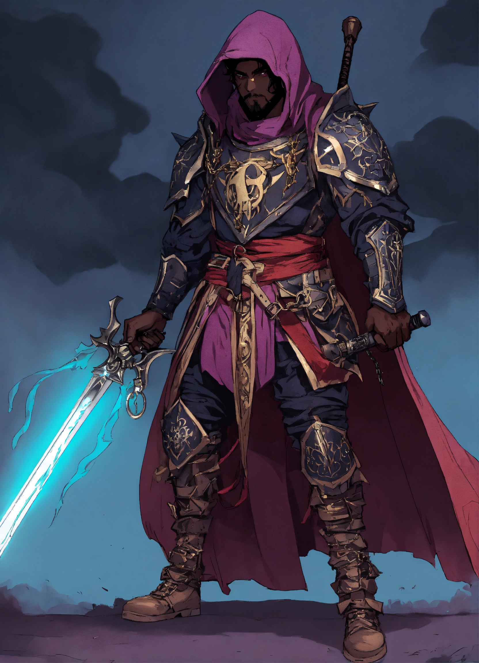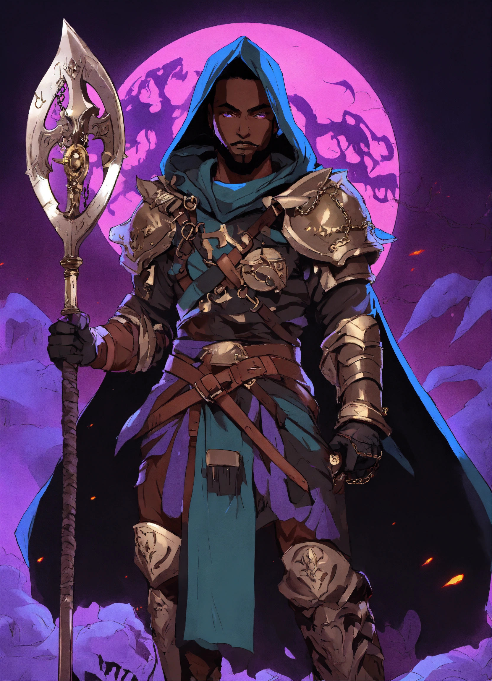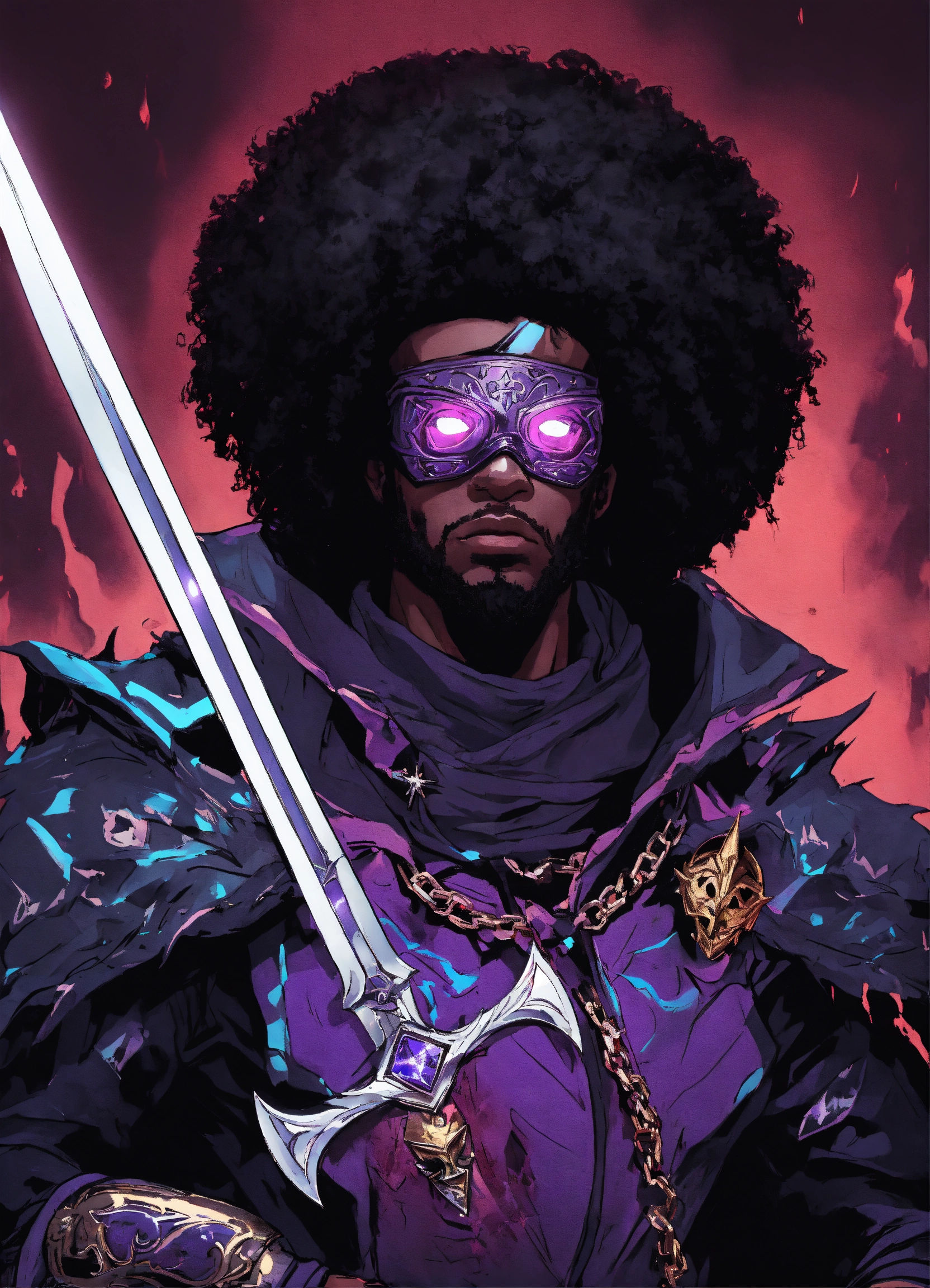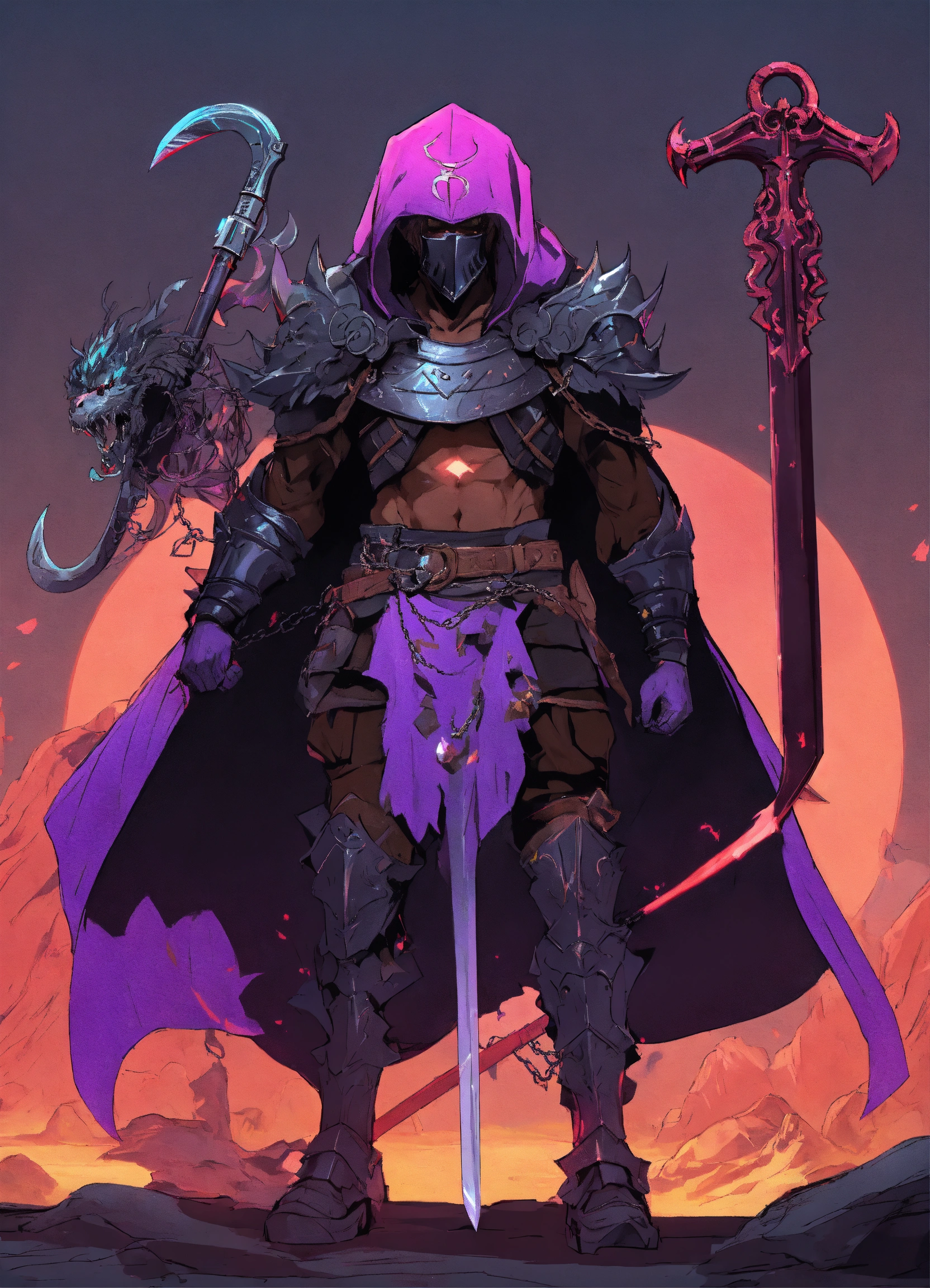 80s style anime black characters necromancer with creepy metal mask and hooded robe with light armor, claws and a scythe for a weapon and a rune embedded in his right hand. i want his eyes and magic aura to be purple and and have magical chains that extend from his arms i want him to control the dead with his magical chains and control a zombie dragon fighting heros black character knights with armor and swords and afro