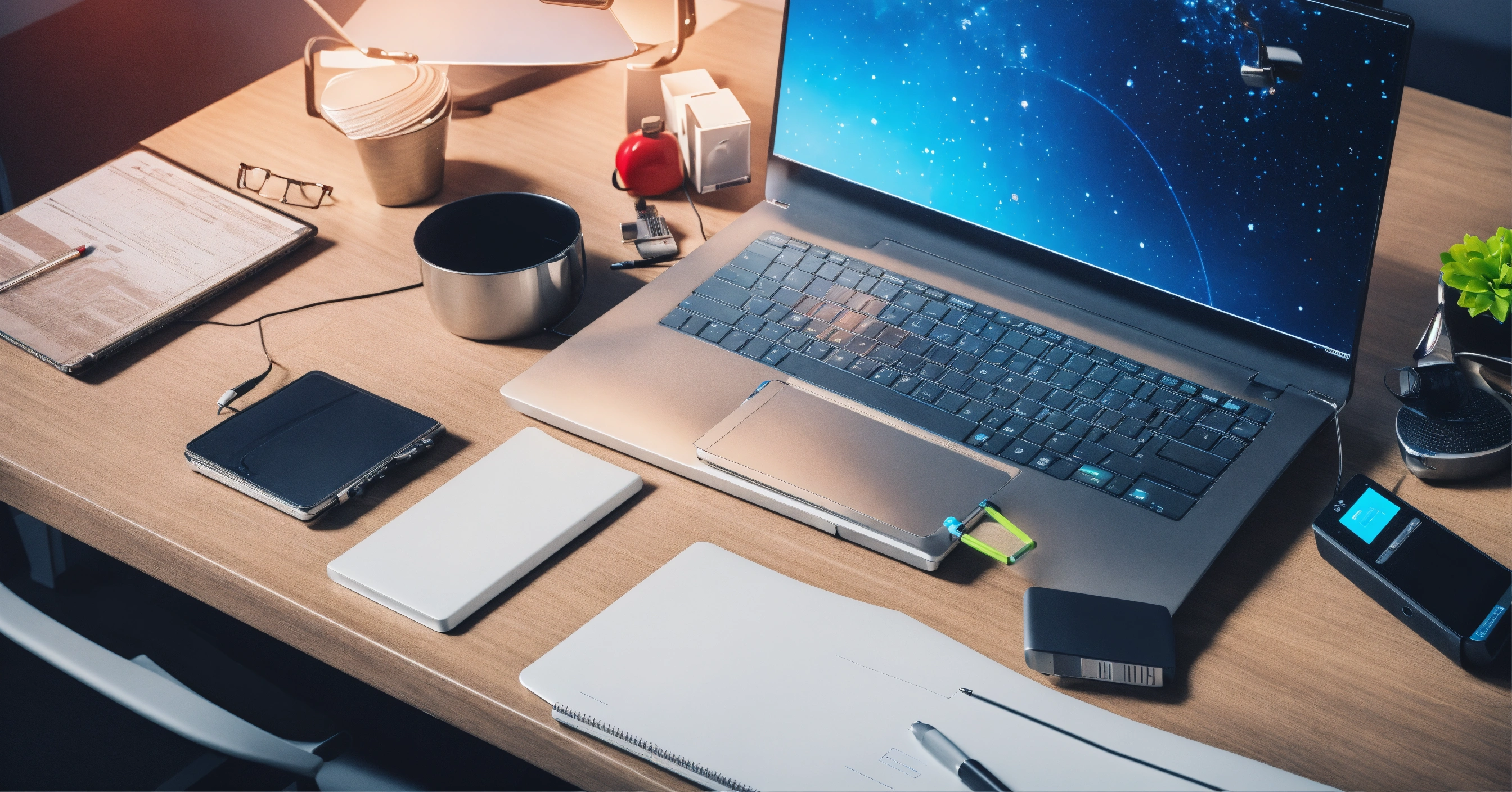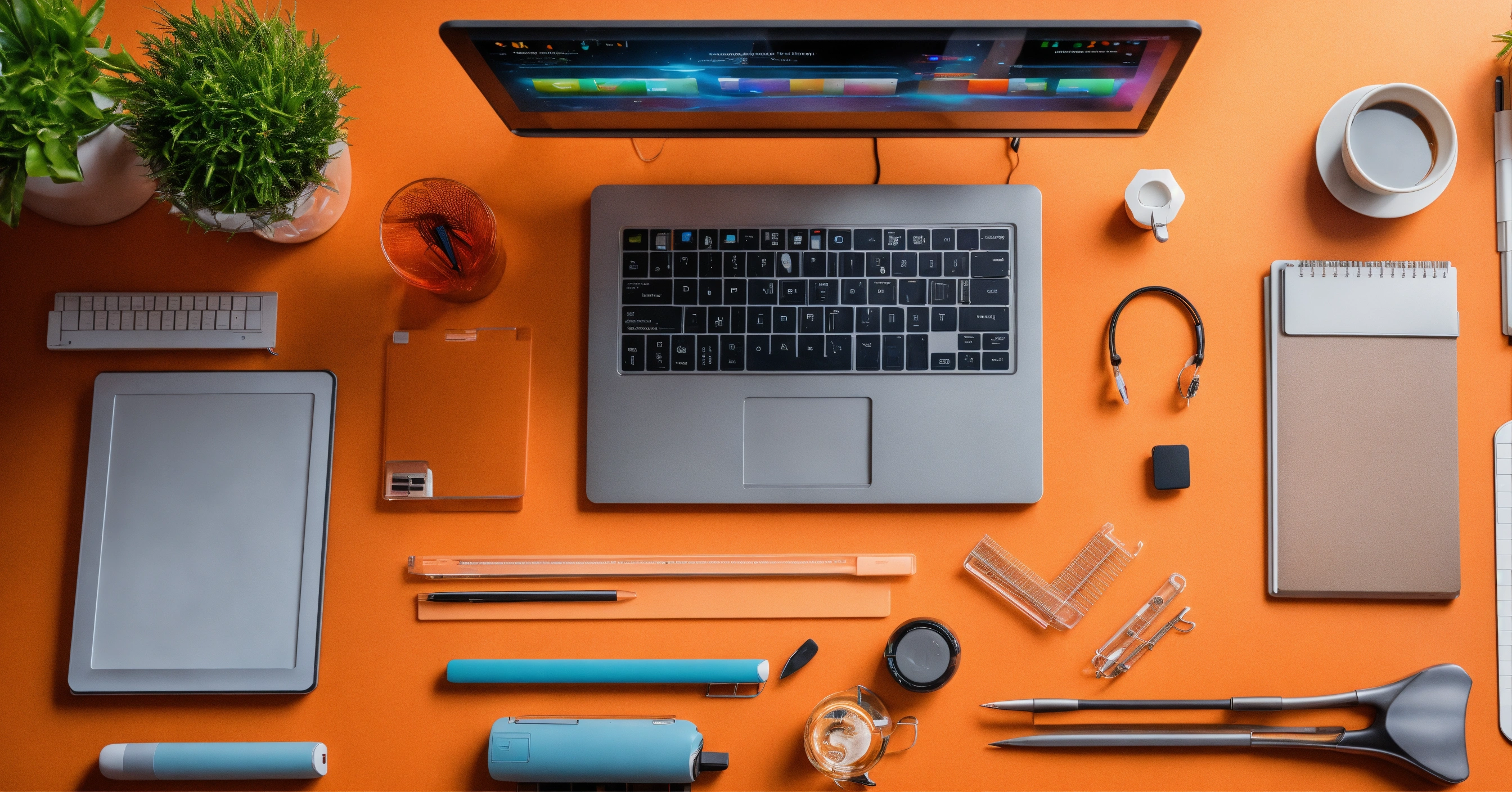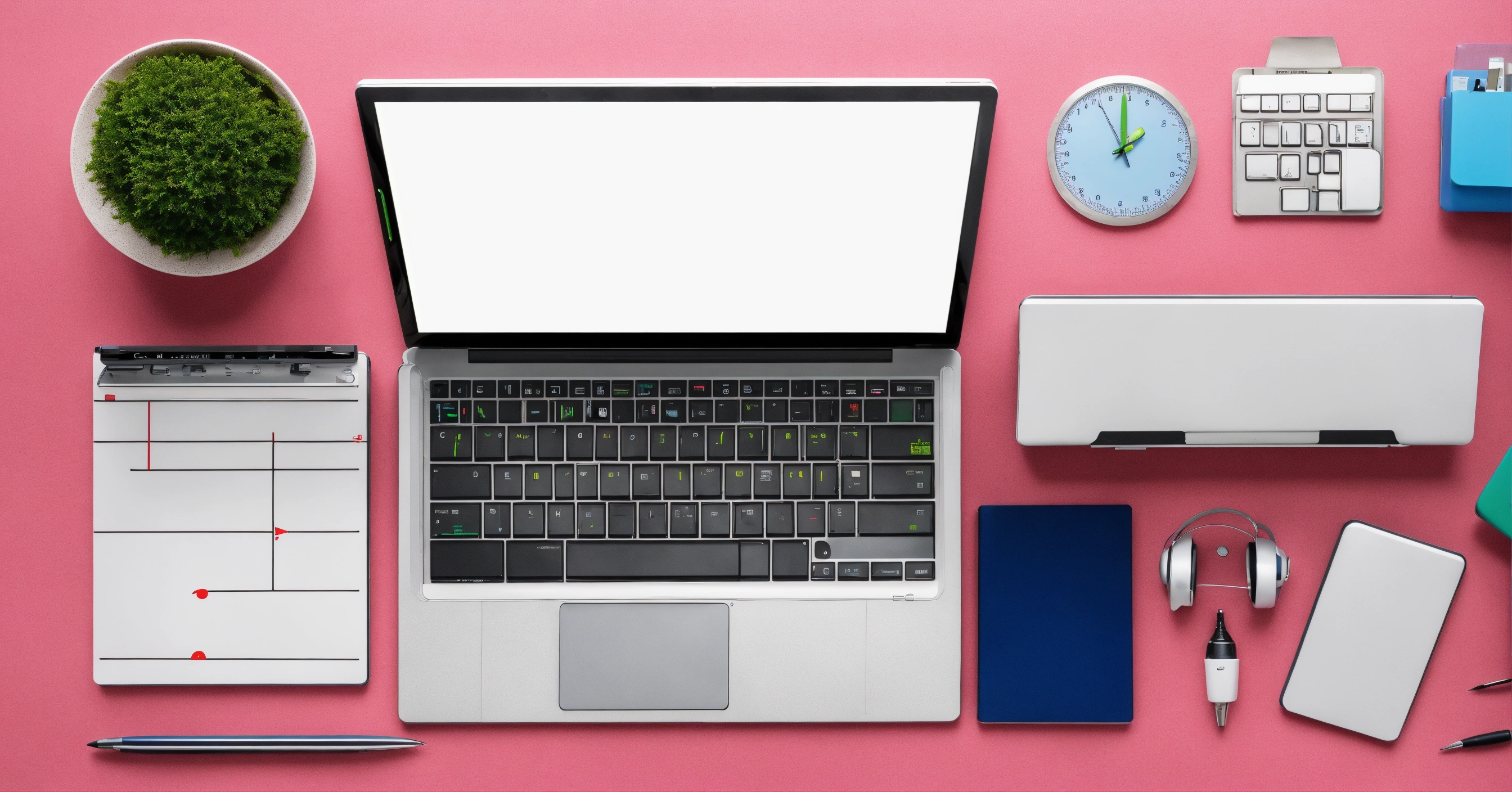 Top view futuristic office desk with office tools computer laptop on whiteboard background with copy space, cfg scale 100