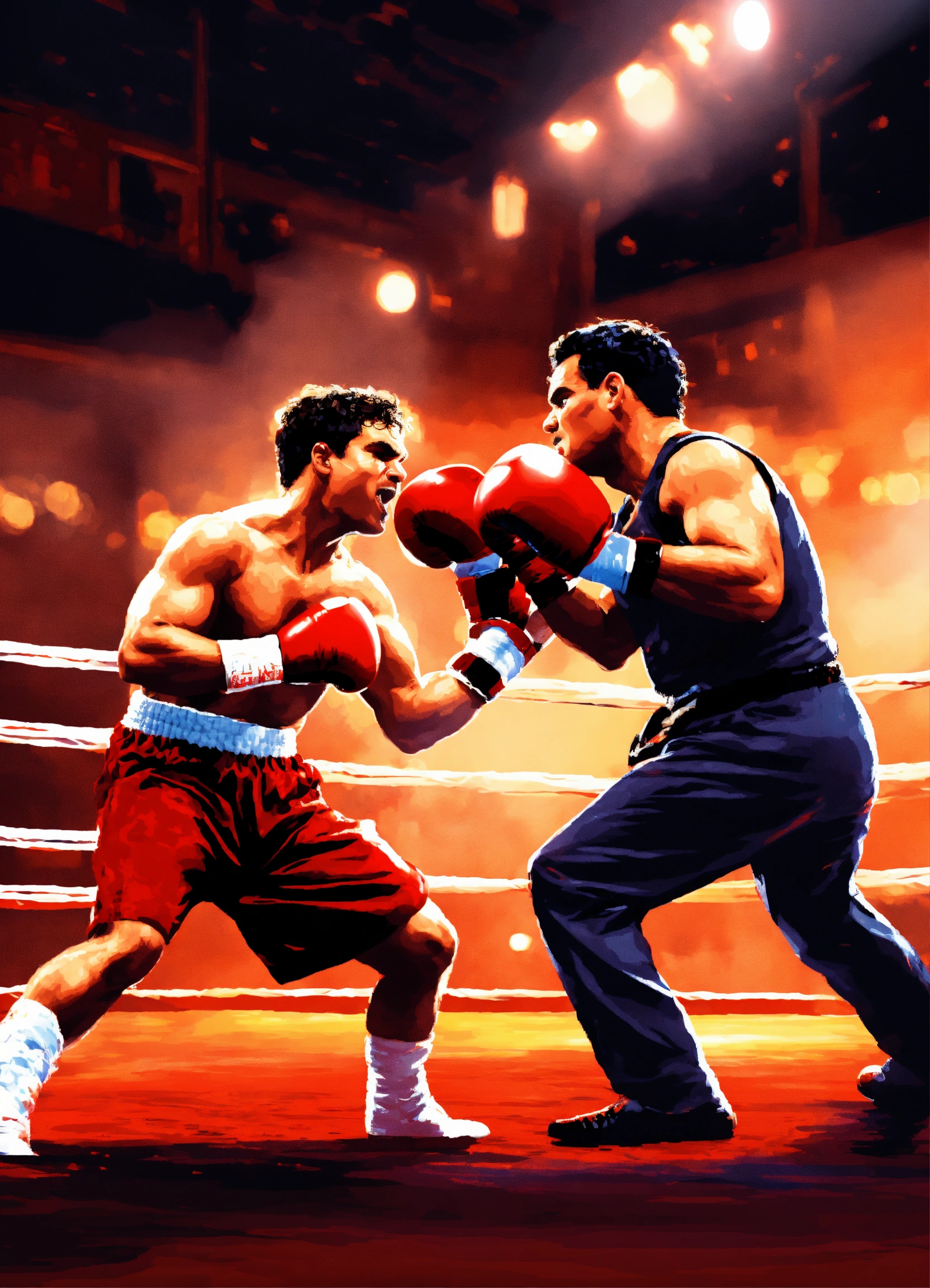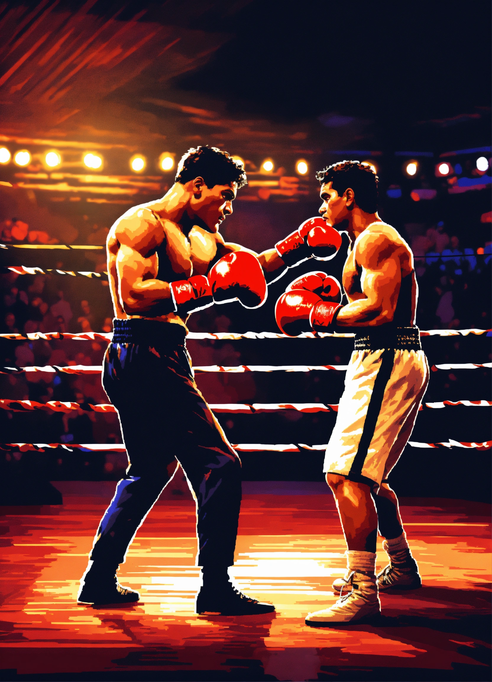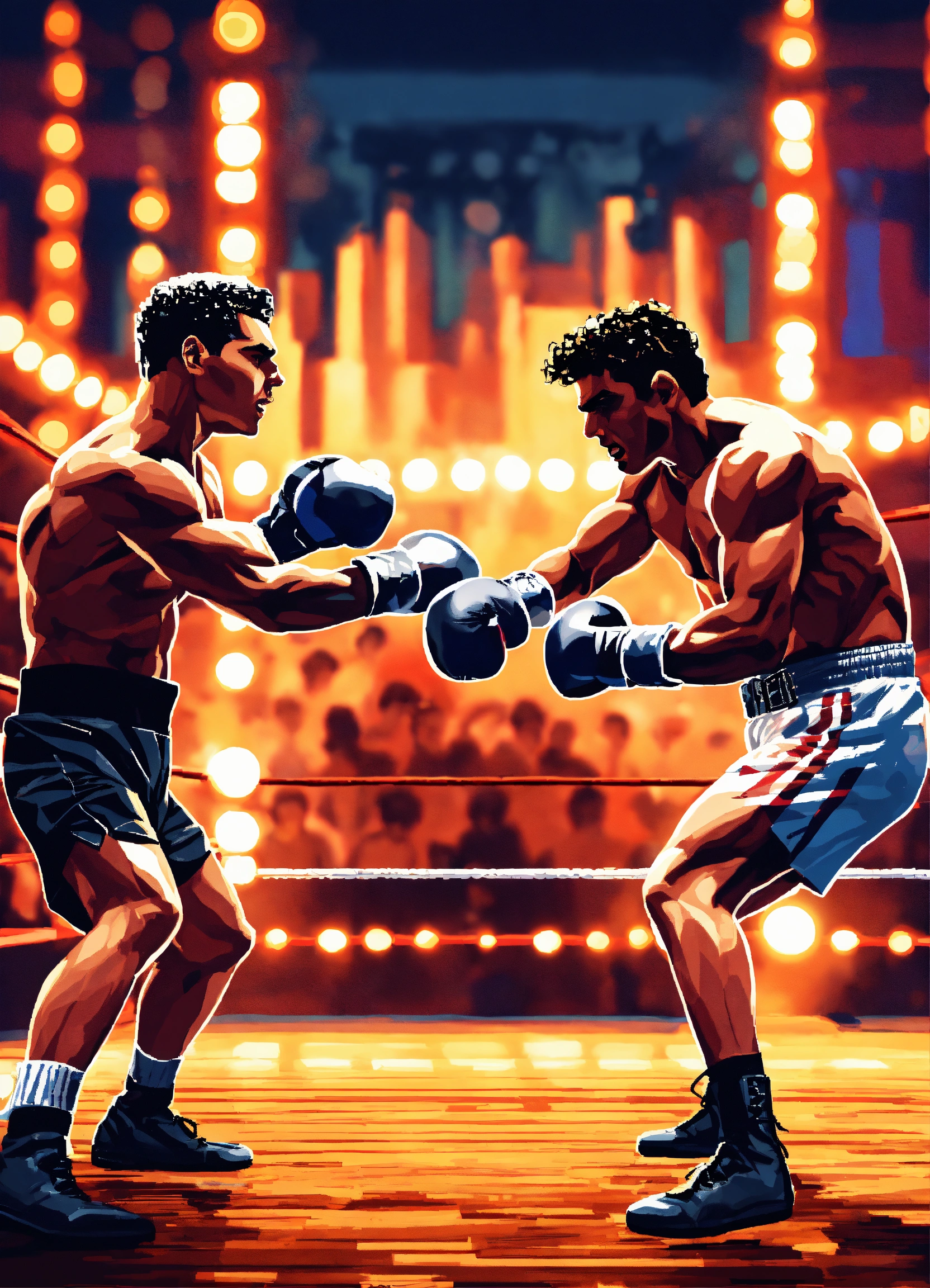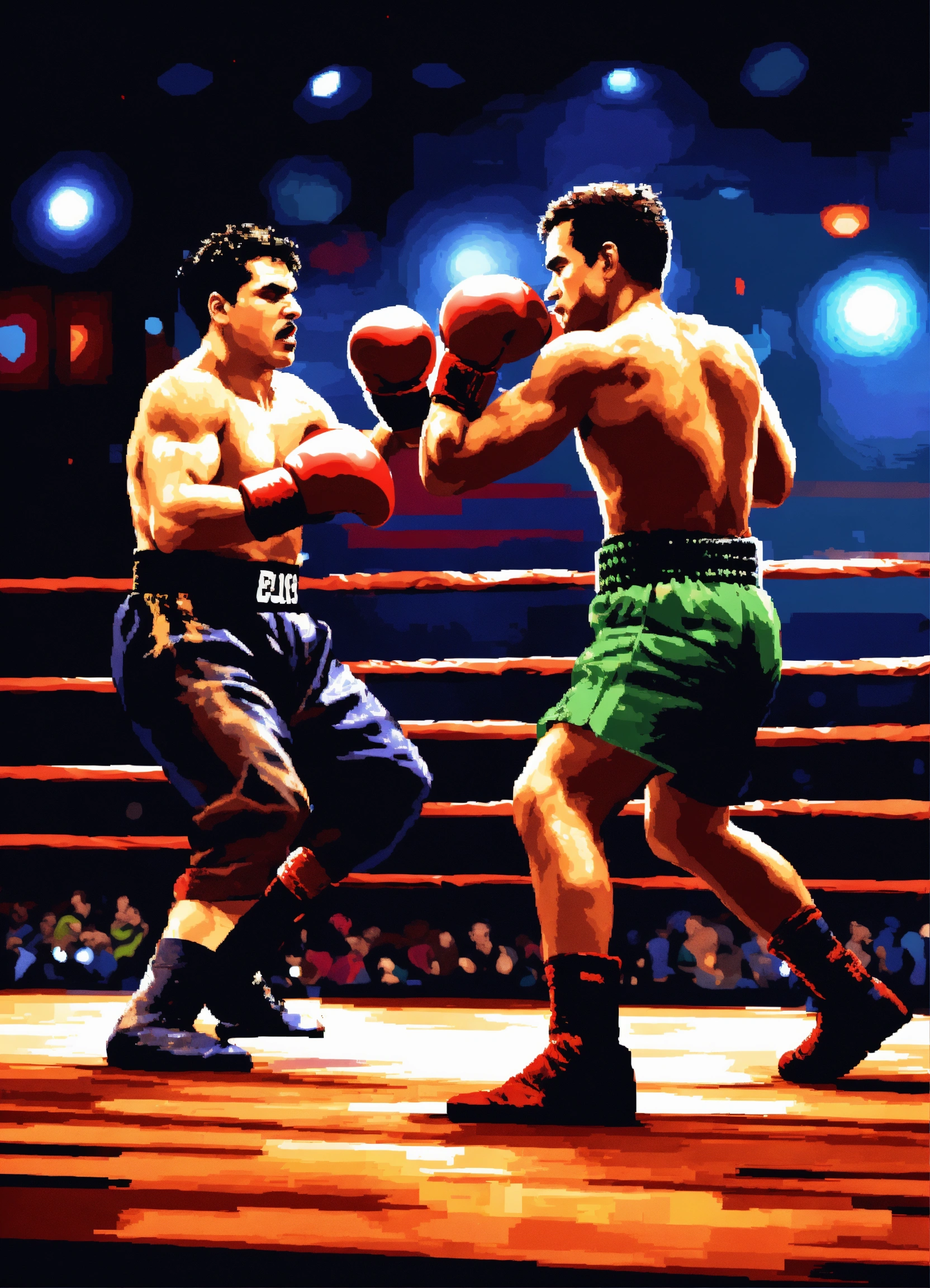 Digital art of charles chaplin and amr diab engaged in a fierce boxing match inside a ring, dramatic lighting, intense action, pixel art style, motion blur effect, dynamic composition, modern reinterpretation, 16-bit graphics, epic showdown