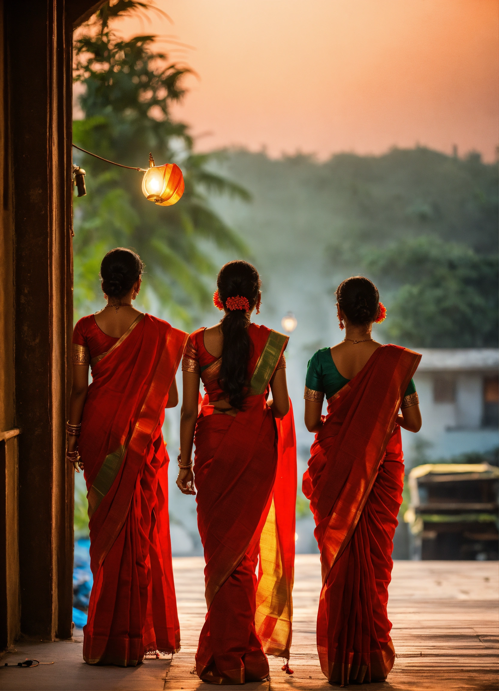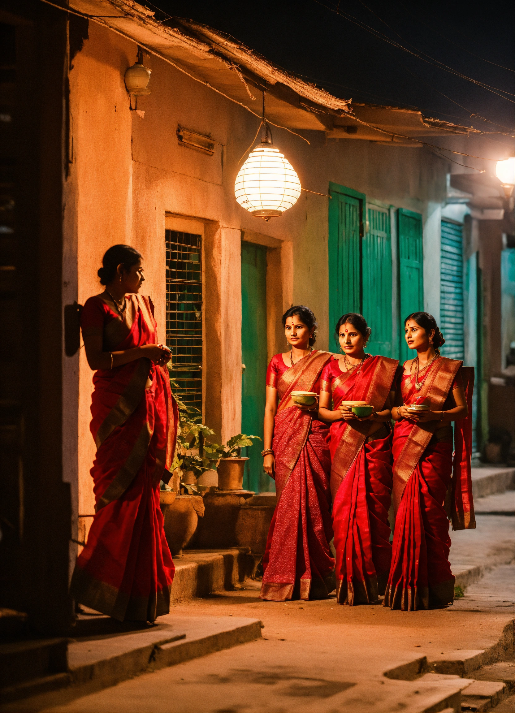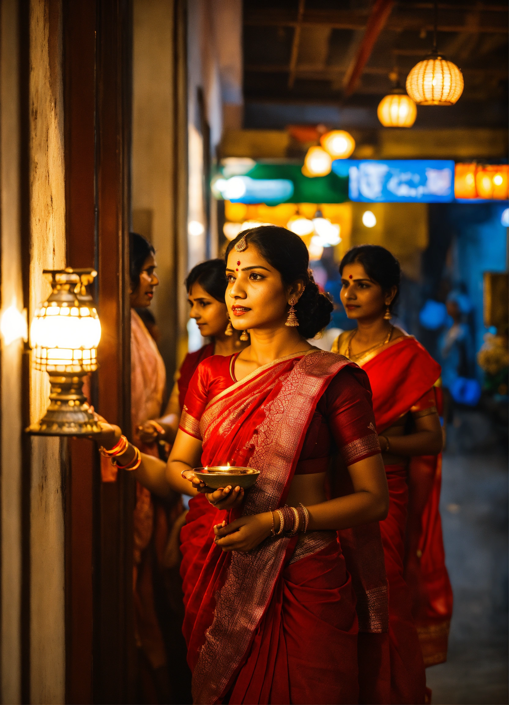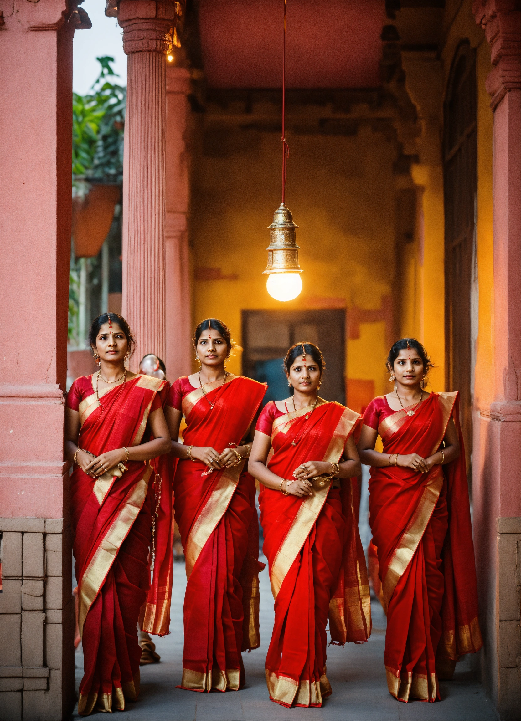 A group of womans wearing red cotton silk saree with lamp in their hands waiting for someoone in the morning at the building