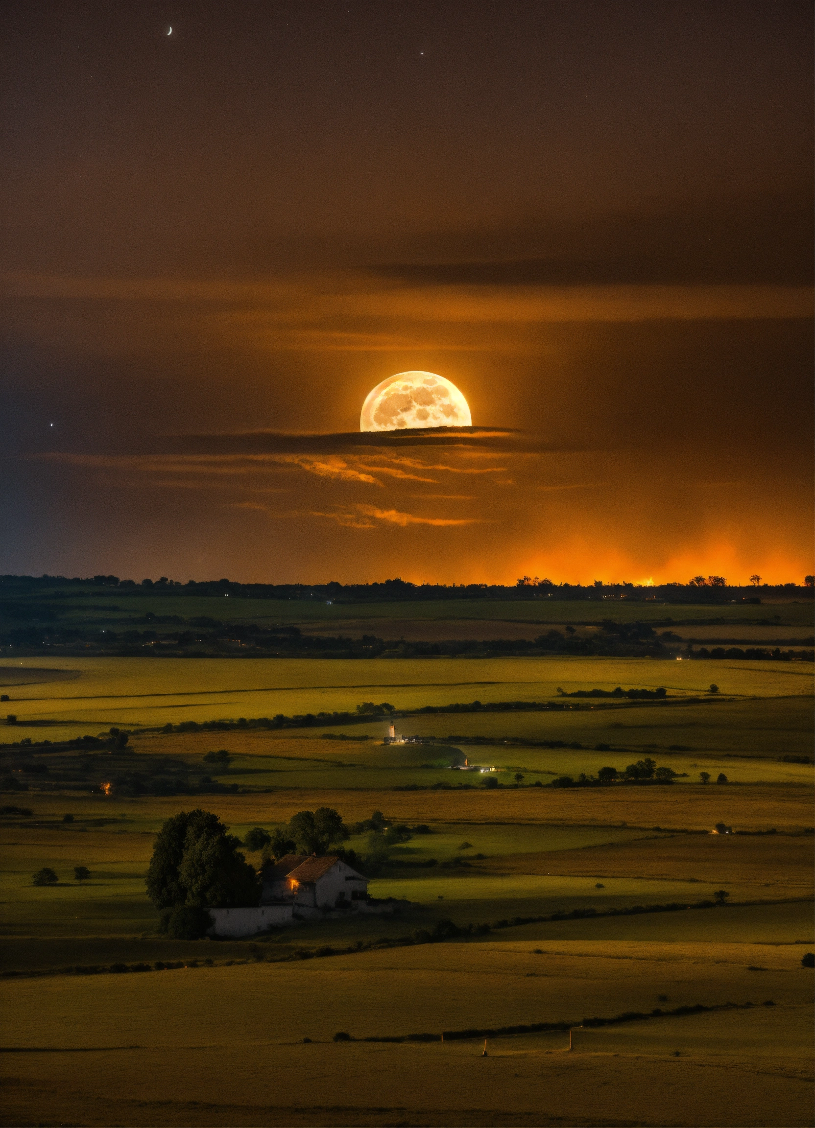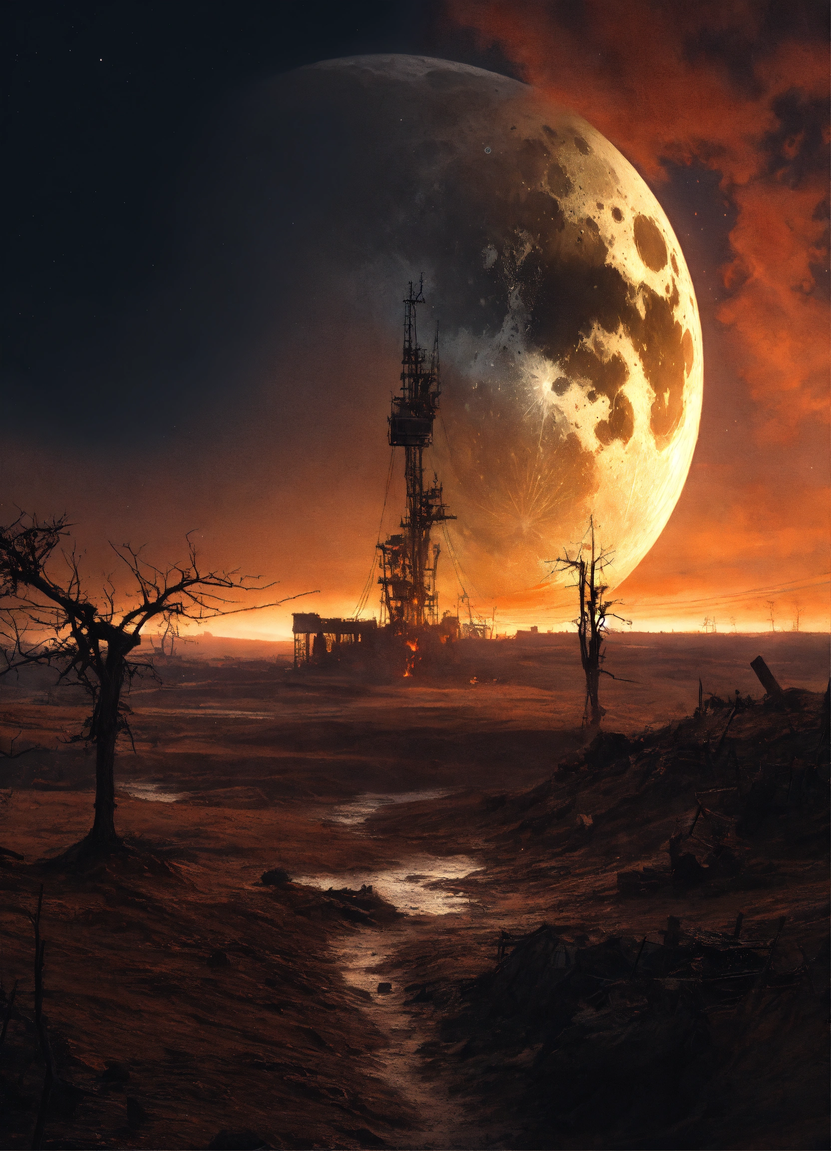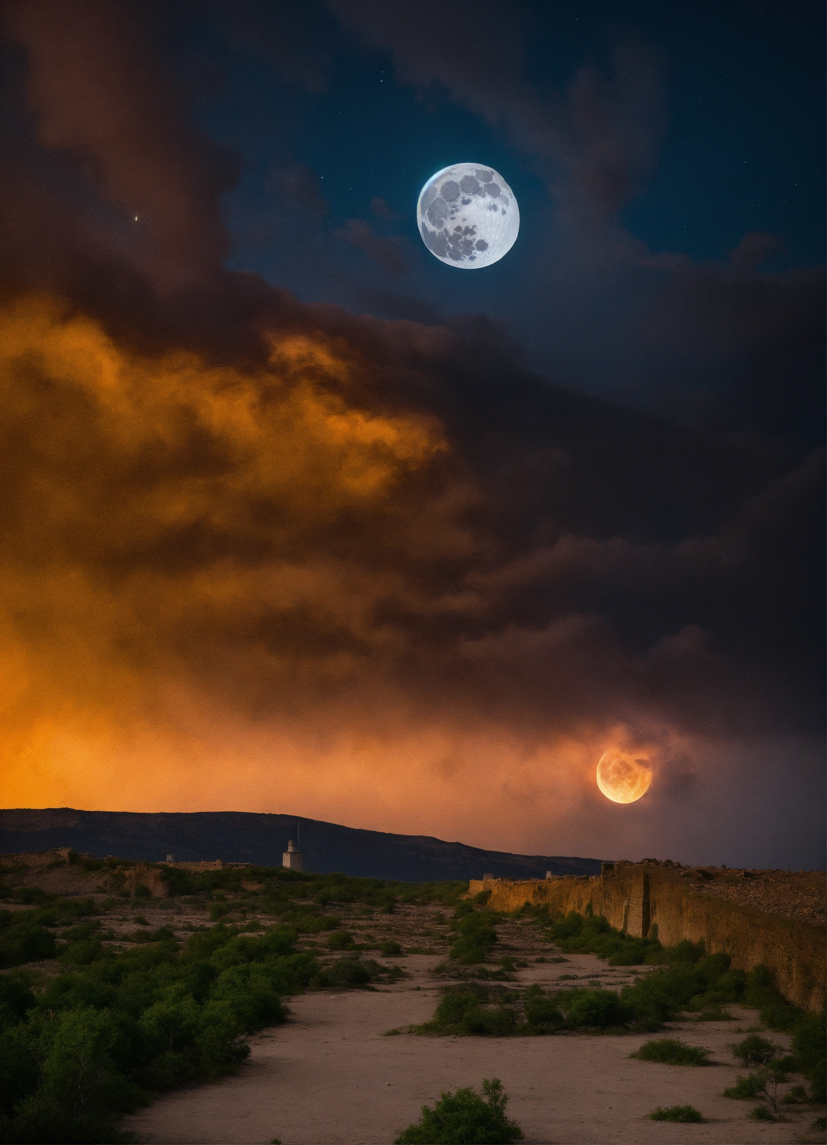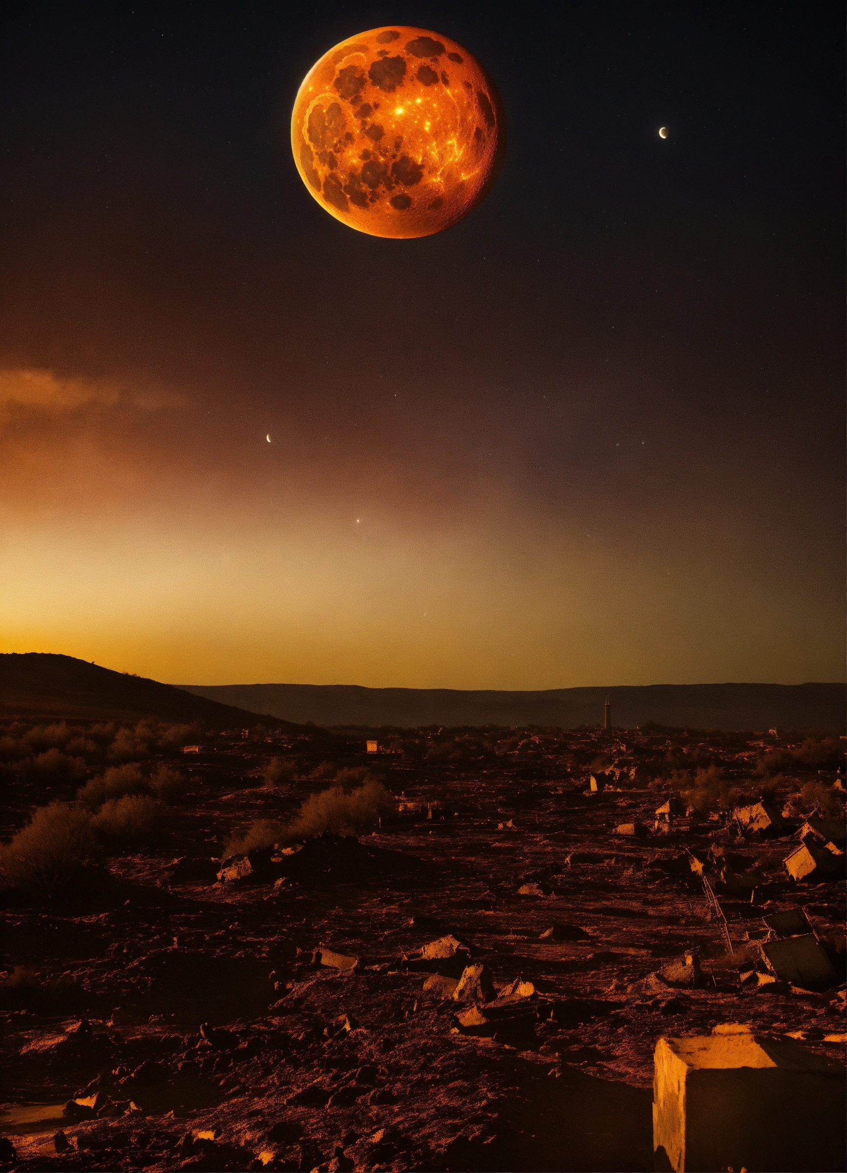 Une image éthérée se dévoile, montrant la lune dans un ciel déchiré en deux moitiés inégales. à gauche, la surface lunaire est illuminée par une lueur sinistre, tandis qu'à droite, l'obscurité profonde prévaut. le paysage terrestre en dessous est un tableau apocalyptique des bâtiments en ruine s'élèvent comme des carcasses fumantes, un horizon déformé par des flammes incandescentes, et une atmosphère chargée de poussière et de désolation. la lune coupée en deux est un présage inquiétant de la catastrophe qui s'est abattue sur cette terre dévastée