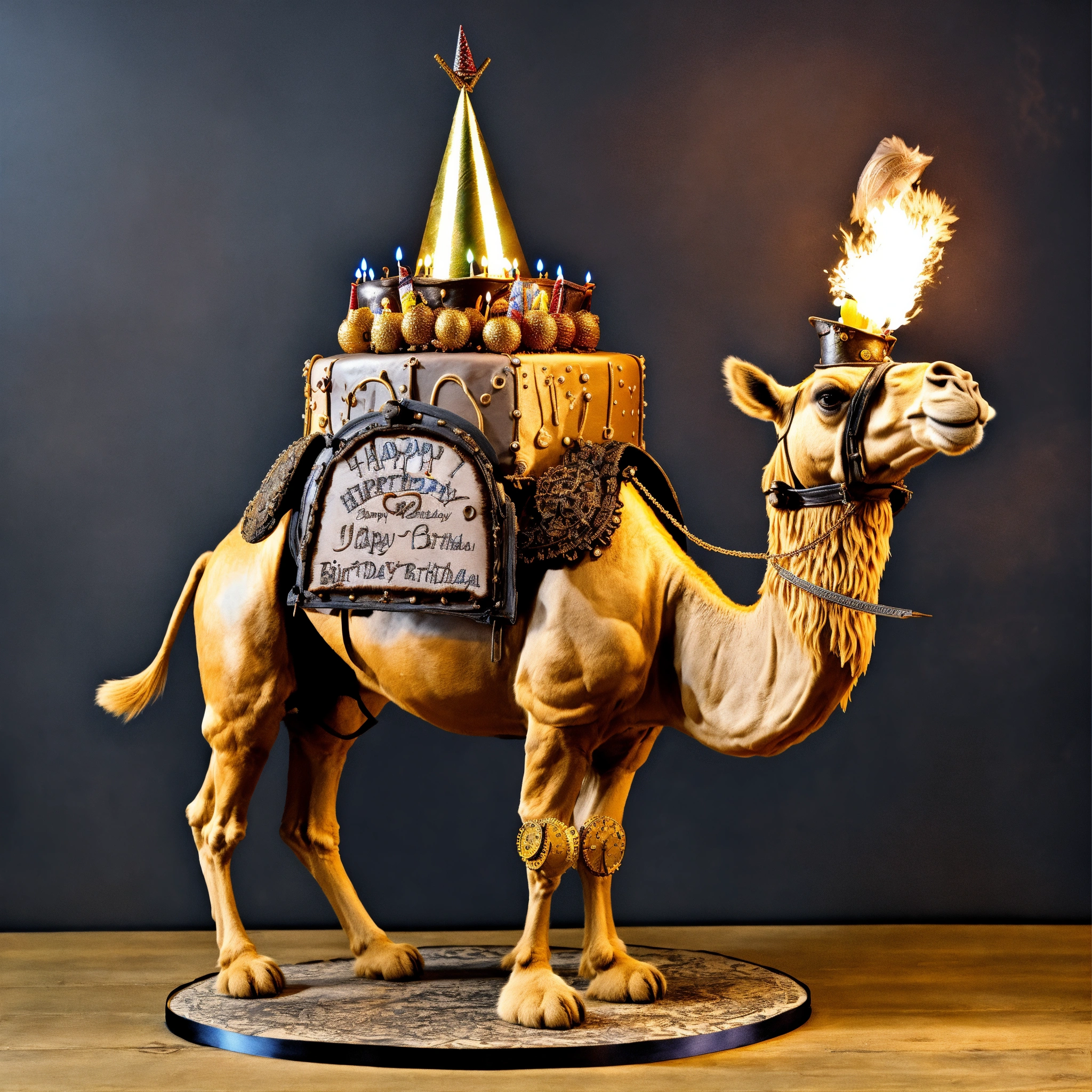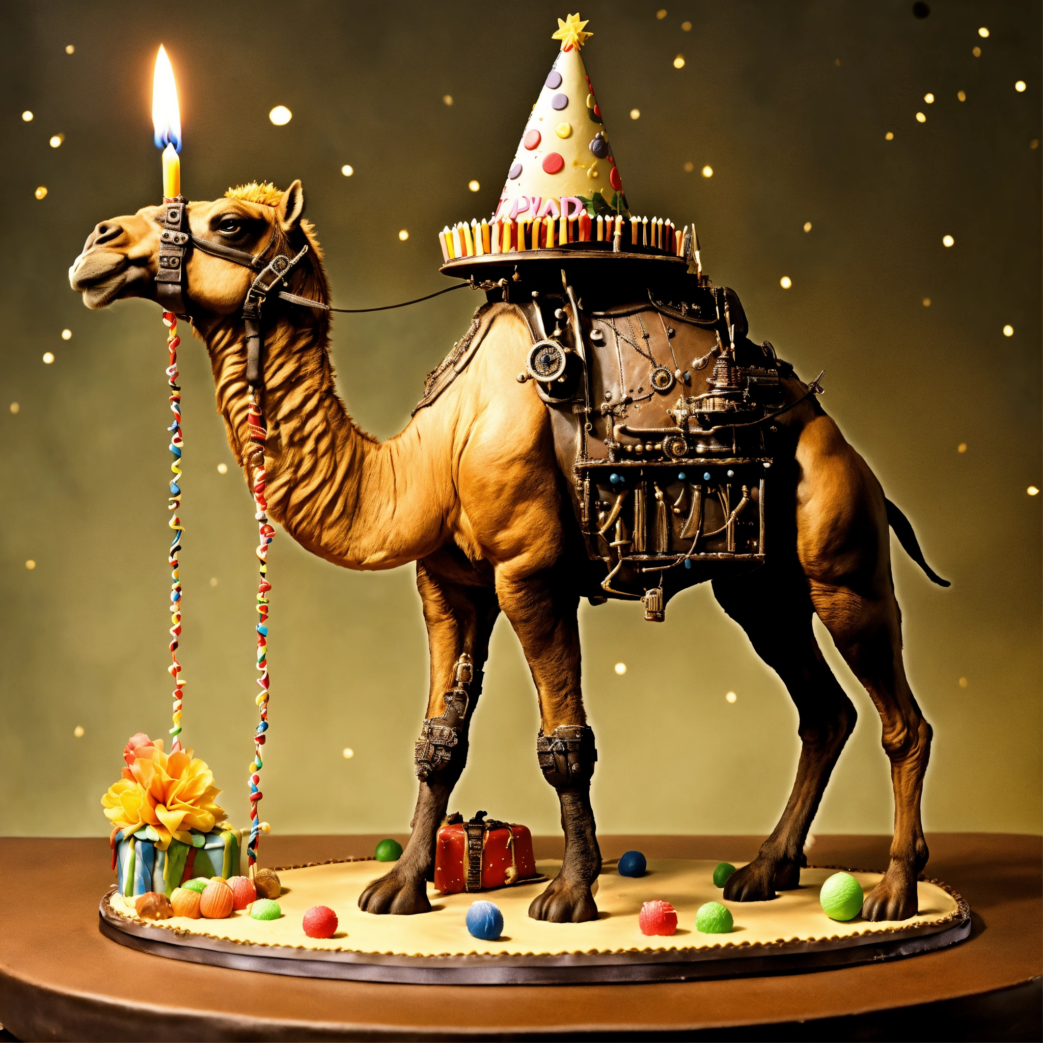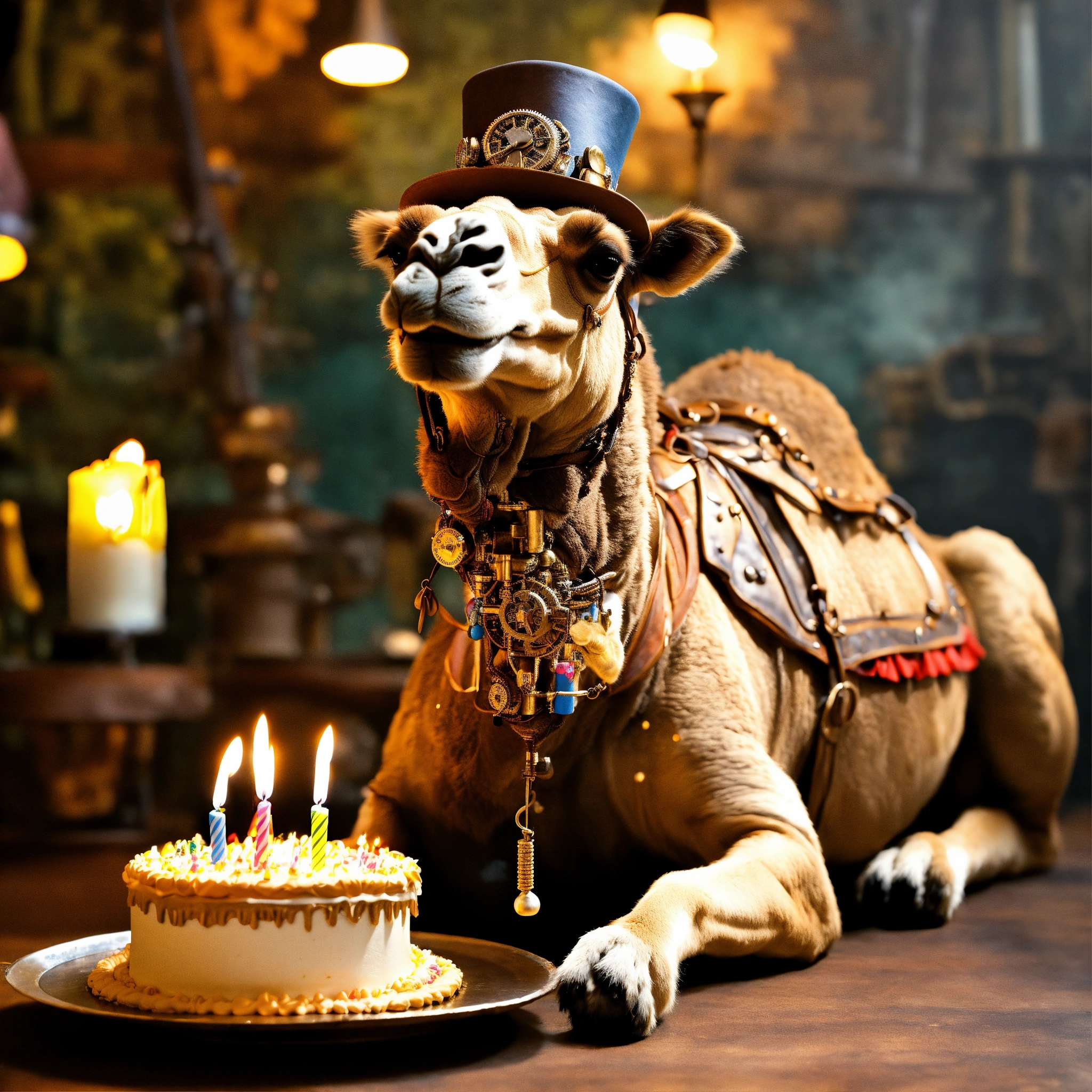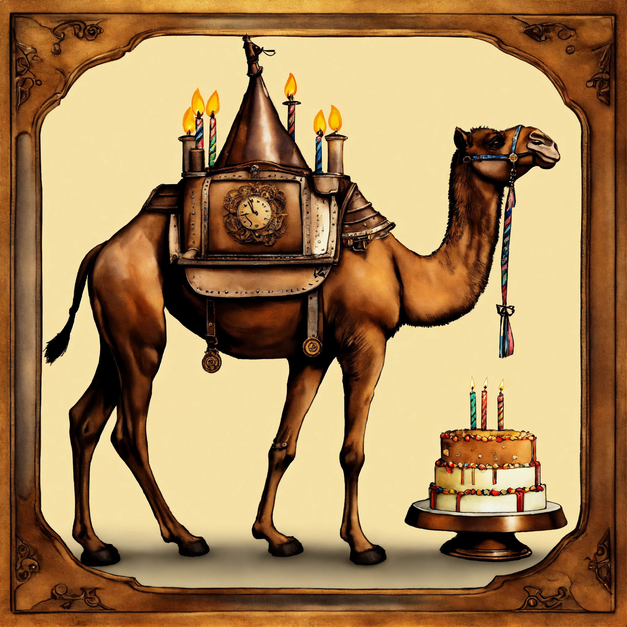 Camel wearing a birthday hat blowing out candles on a birthday cake, extremely creative and unique, highly detailed and realistic, steampunk, inspired by tim holtz, realistic happy birthday camel