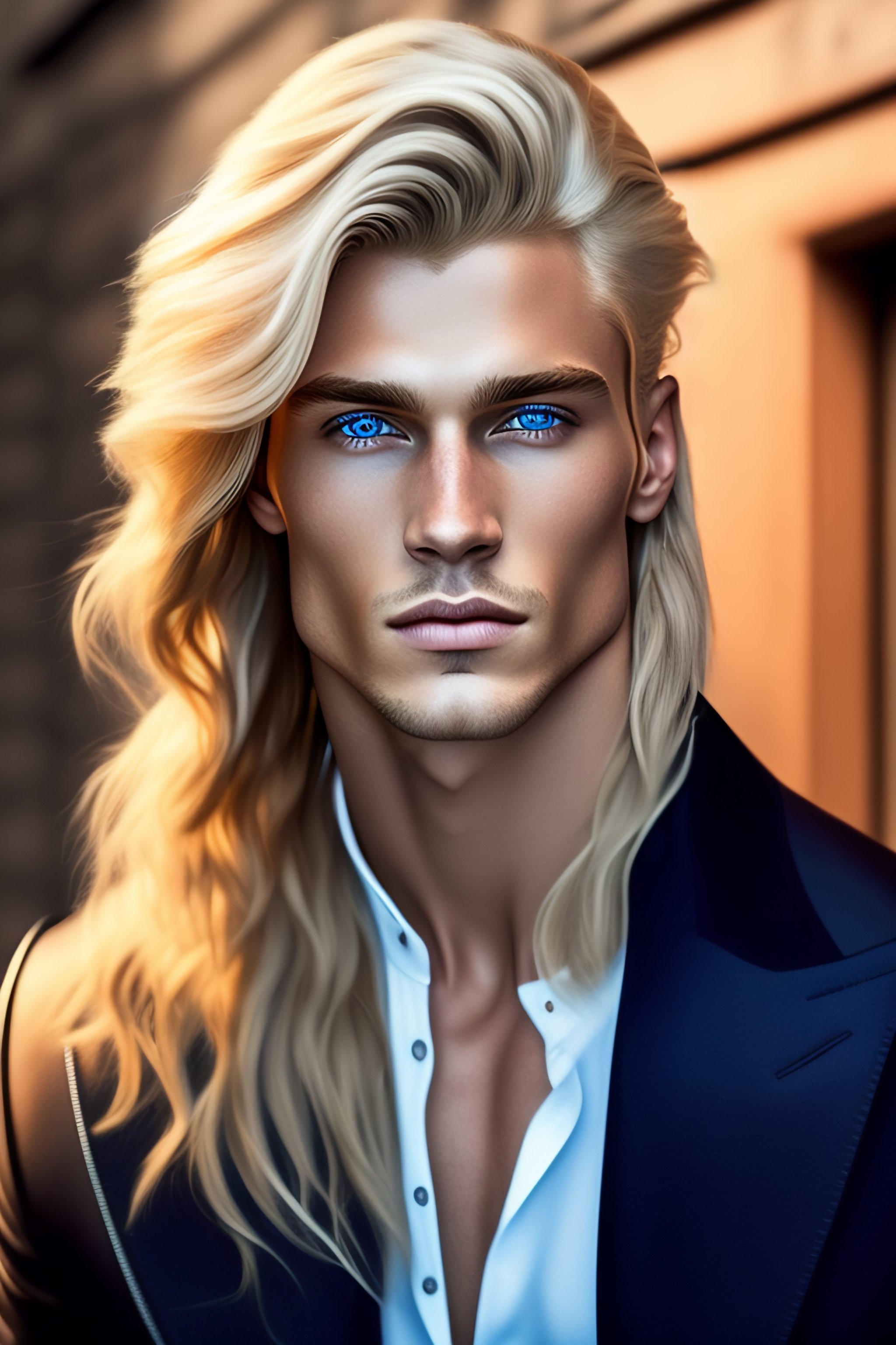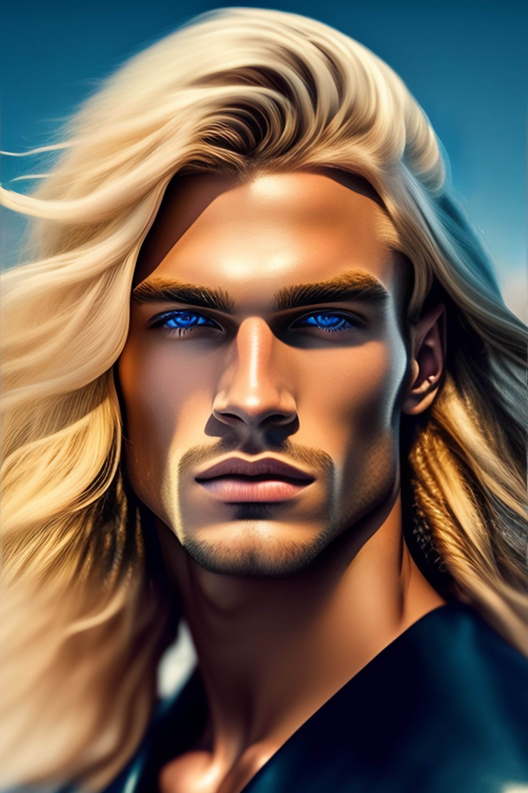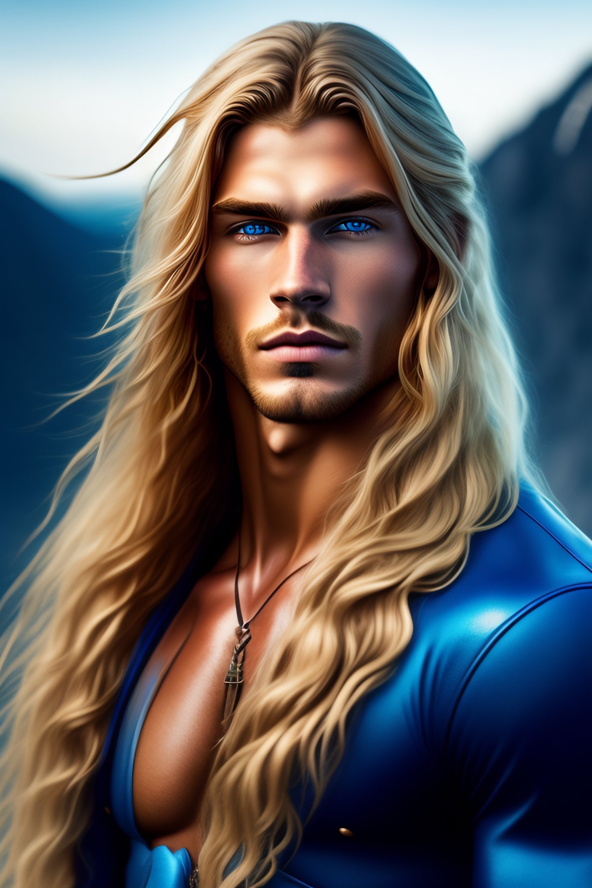 Generate a man with blonde long hair and blue eyes
