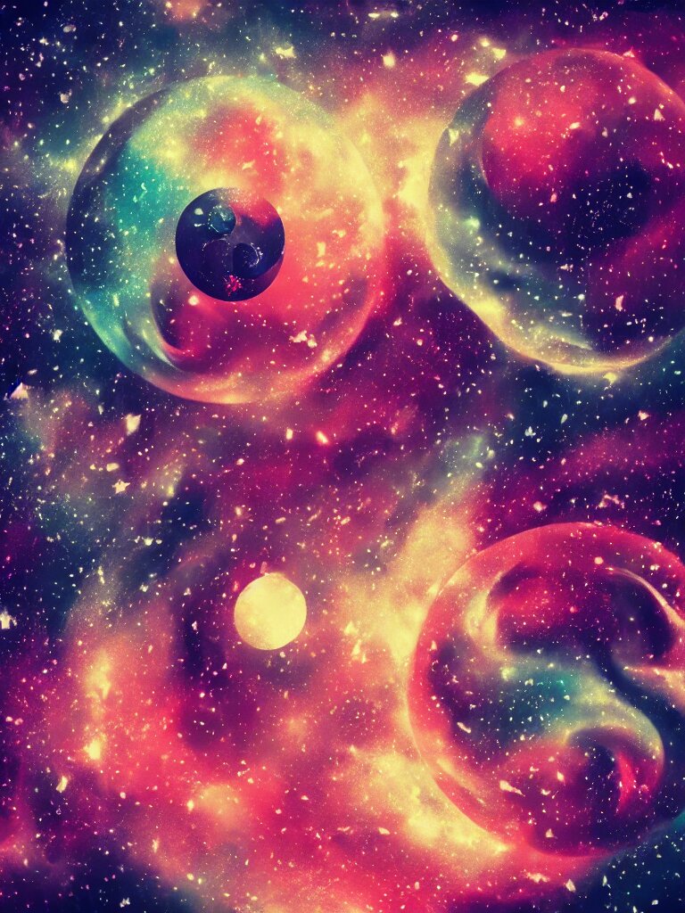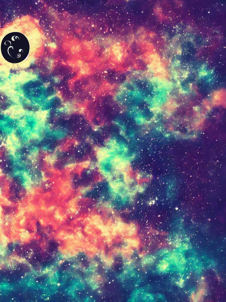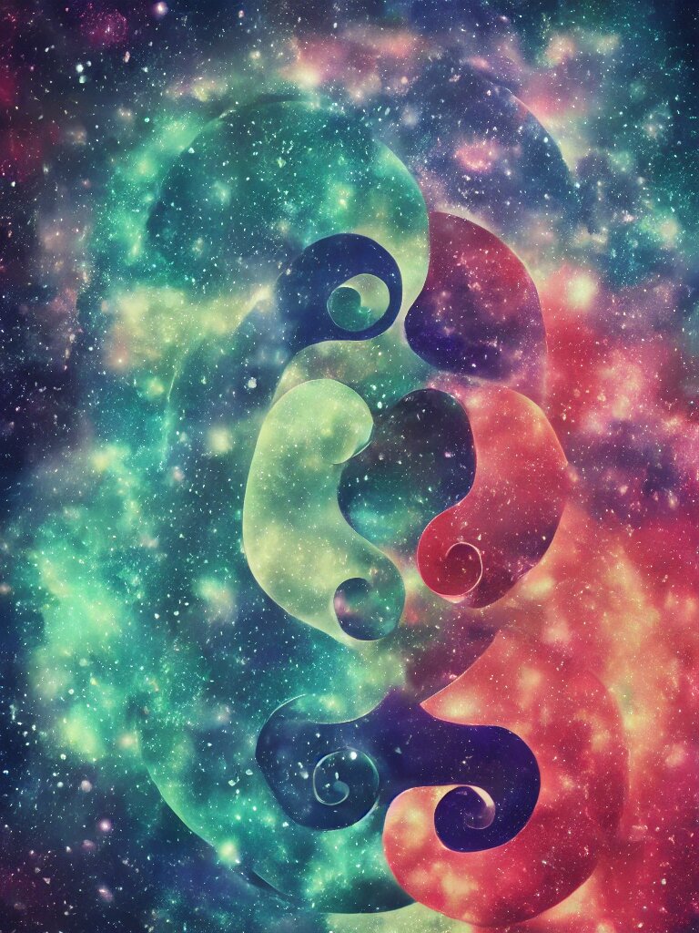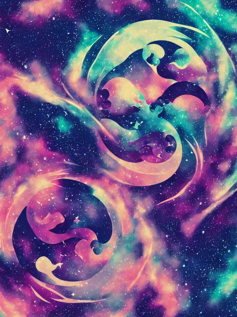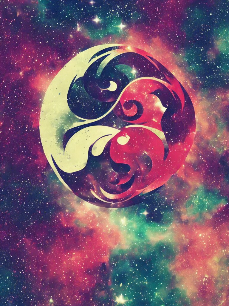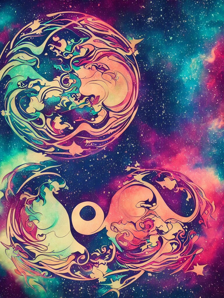 Ying yang symbol, composed of stars and colorful nebulas vintage, hokusai style, alfons mucha style, + octane render + hyper realistic