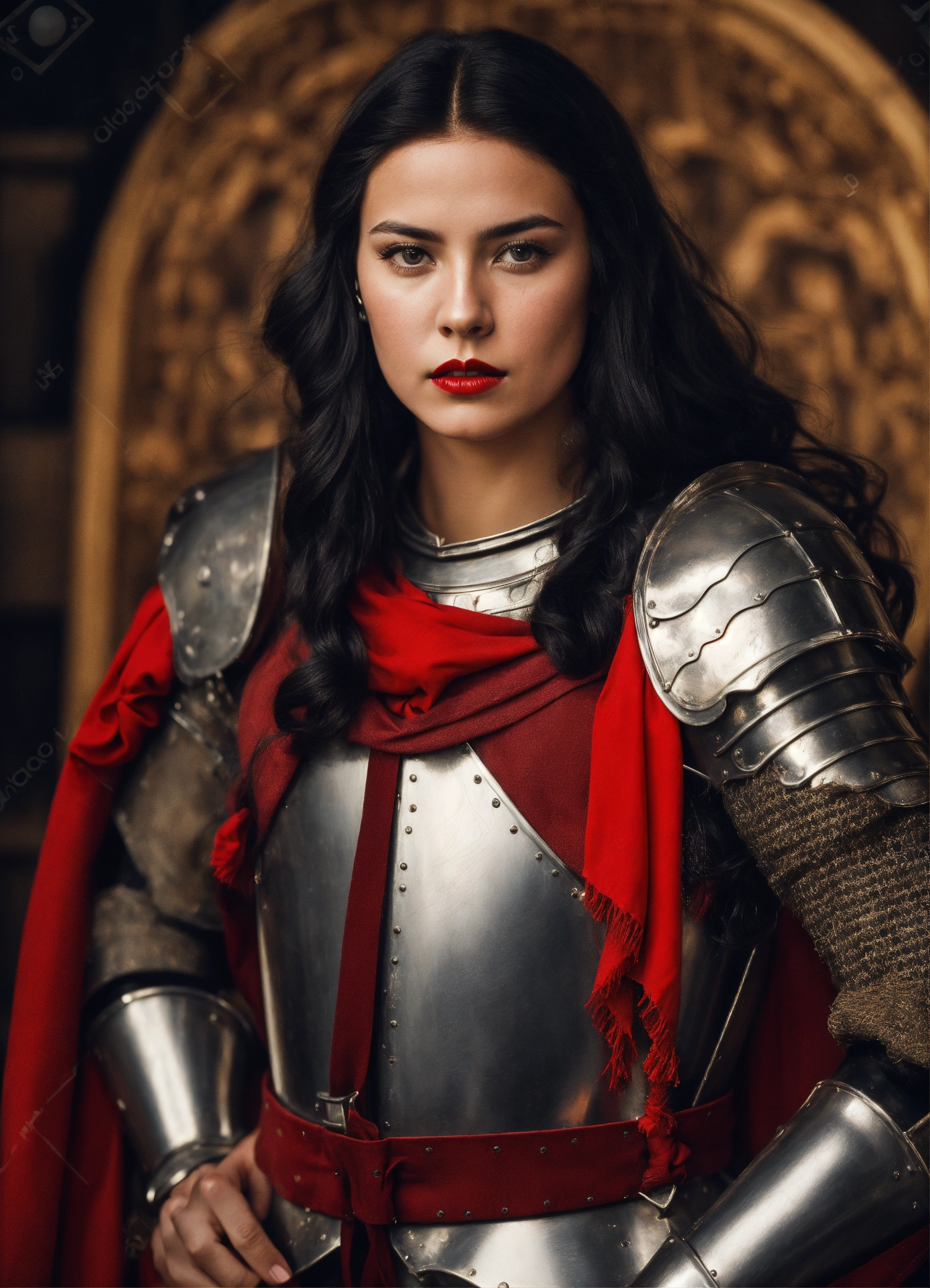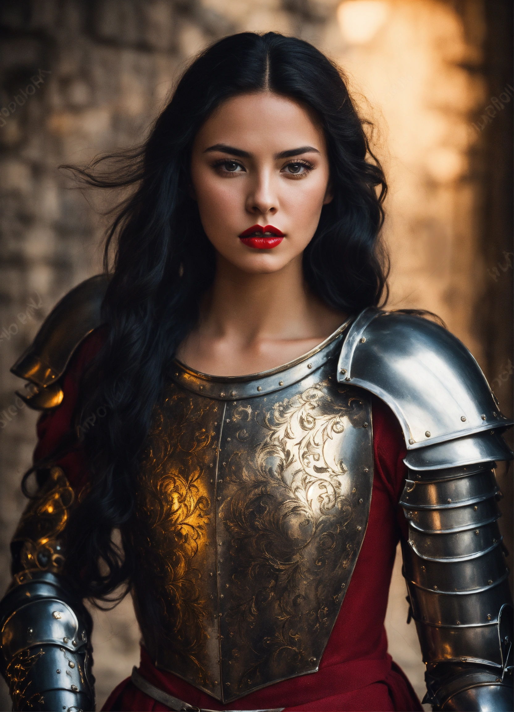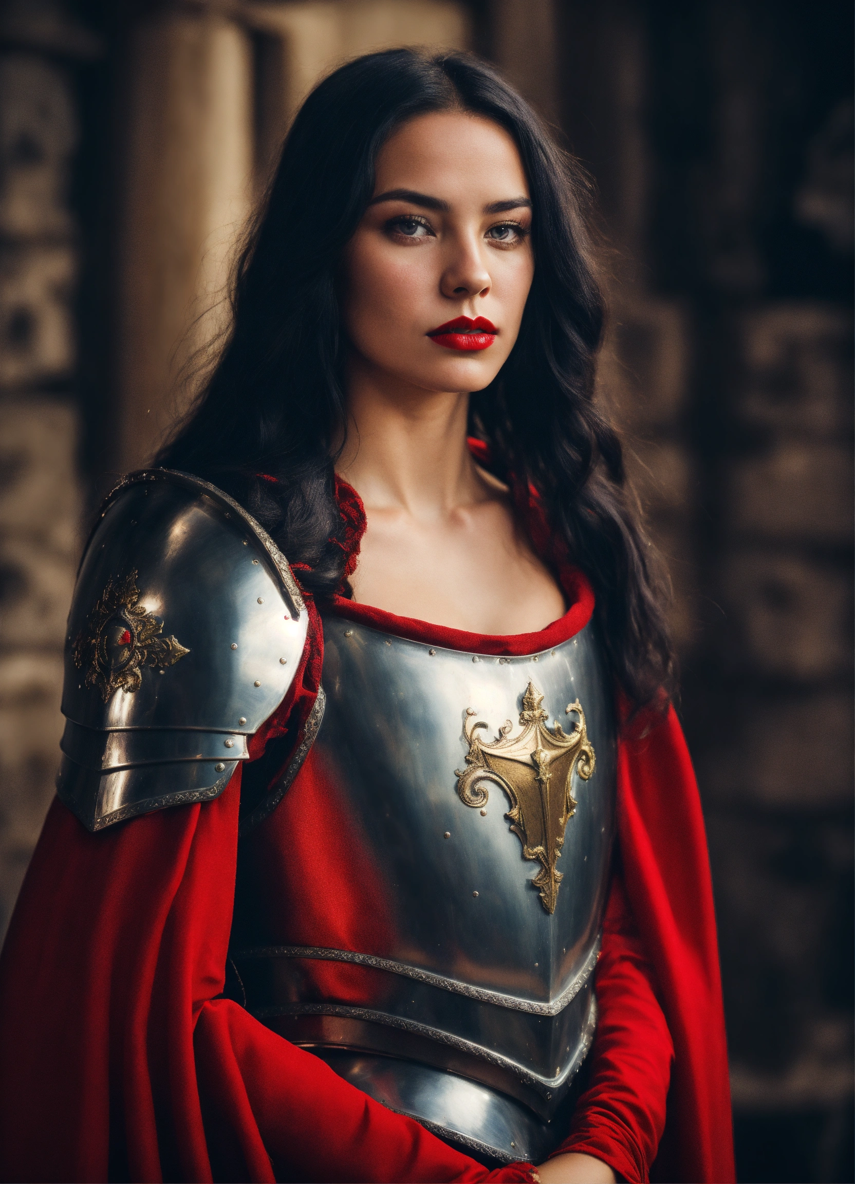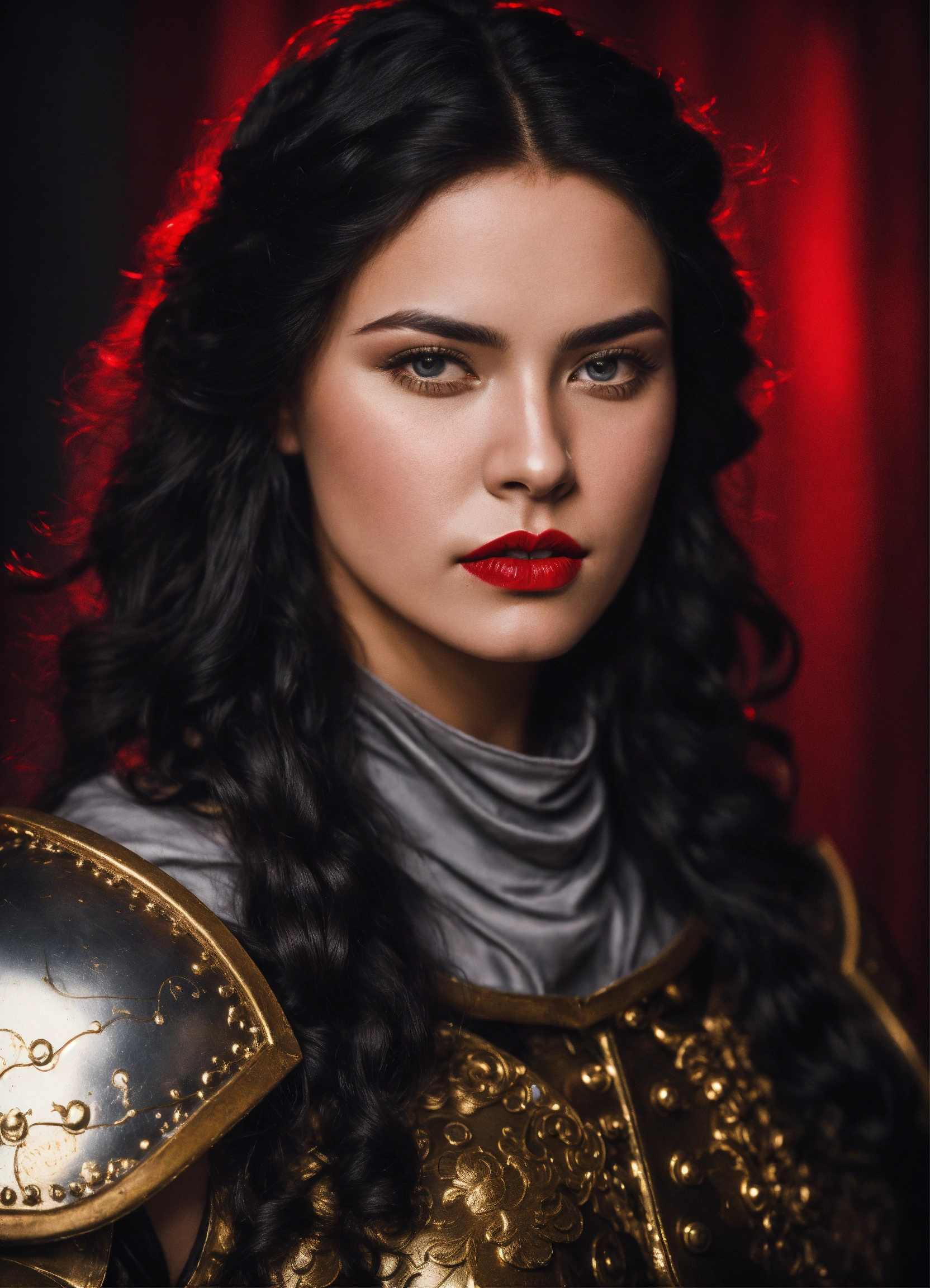 Photo quality portrait of young beautiful black-haired as a mediaeval knight in shining armor with flowing hair, red lips and a stern expression