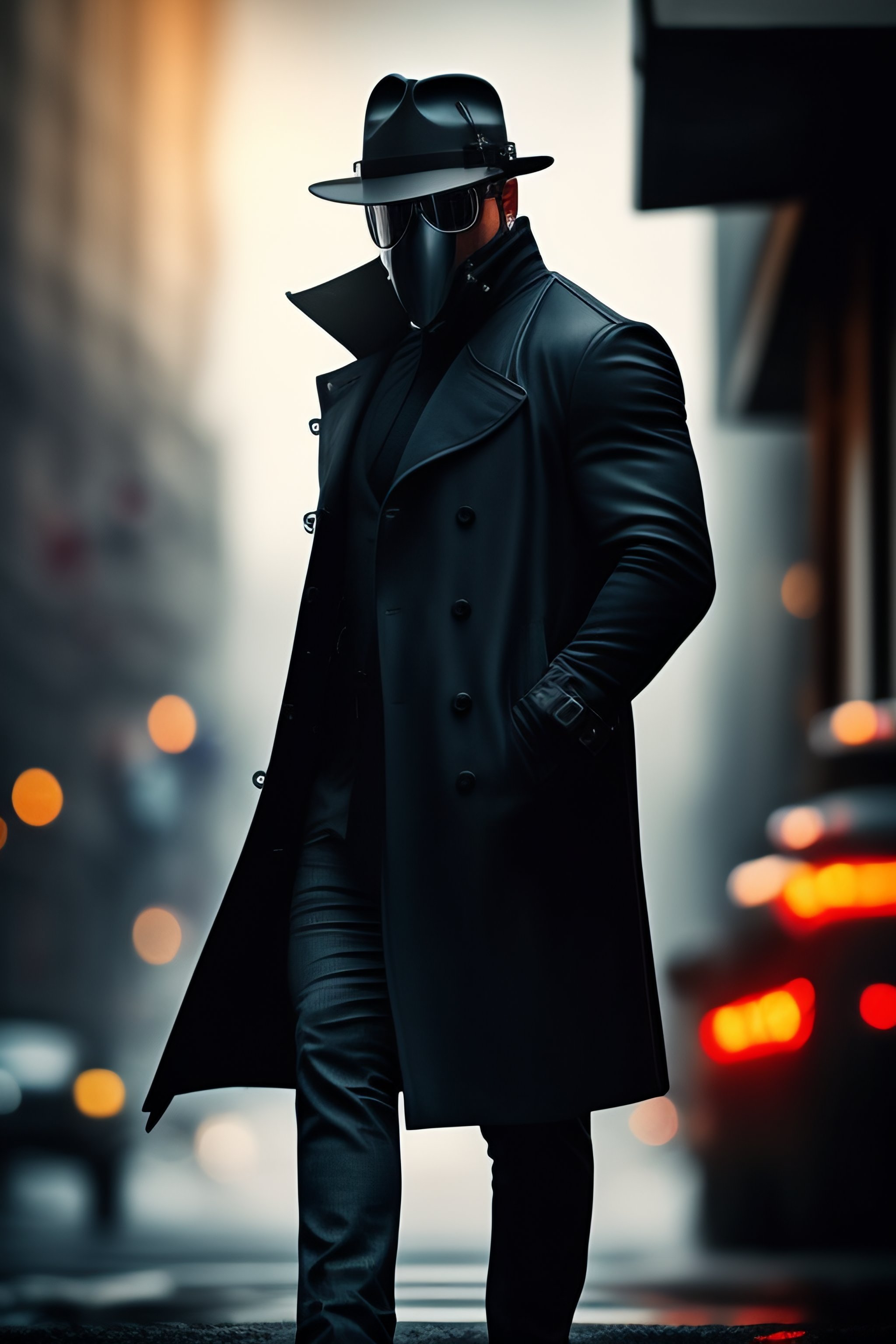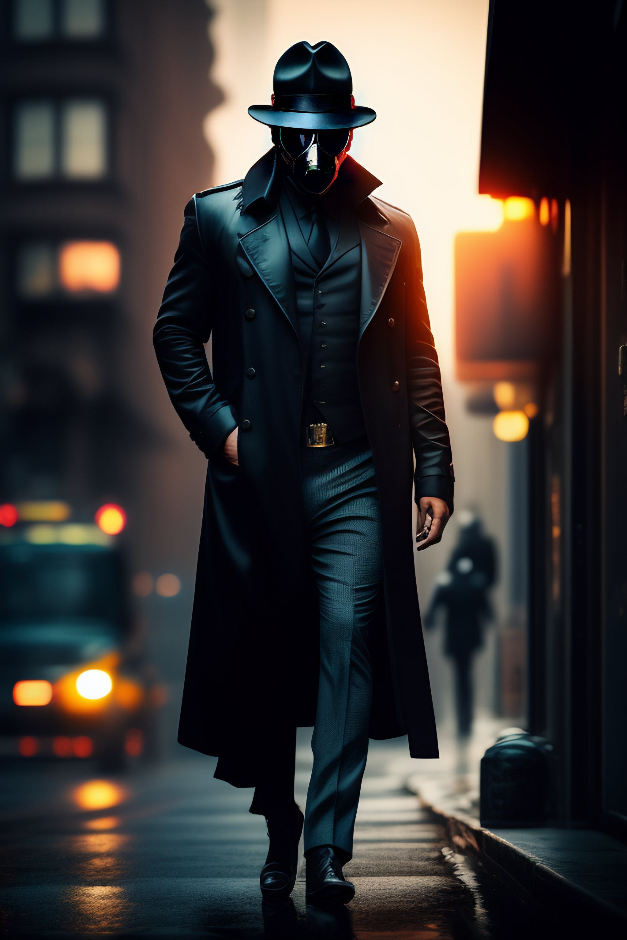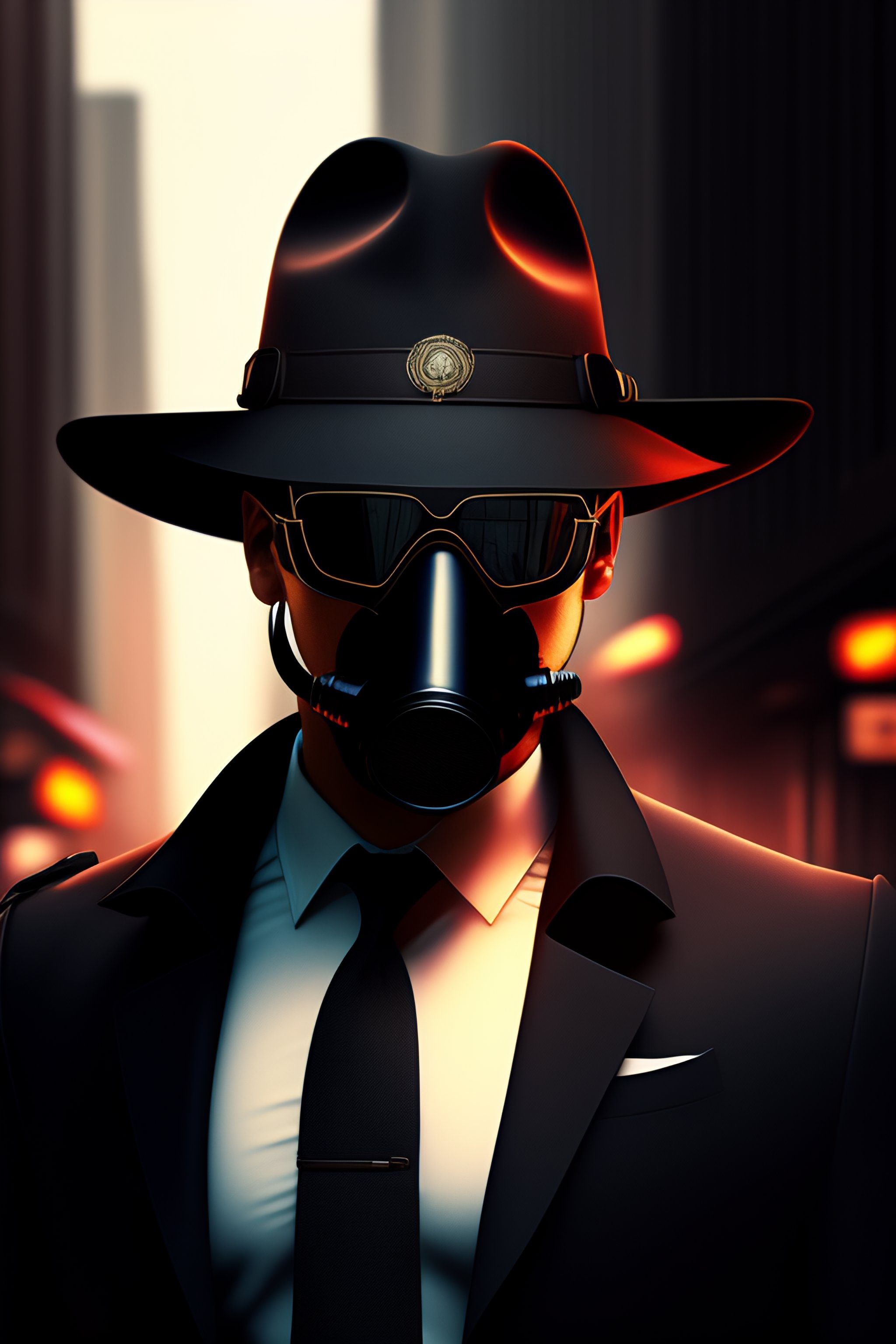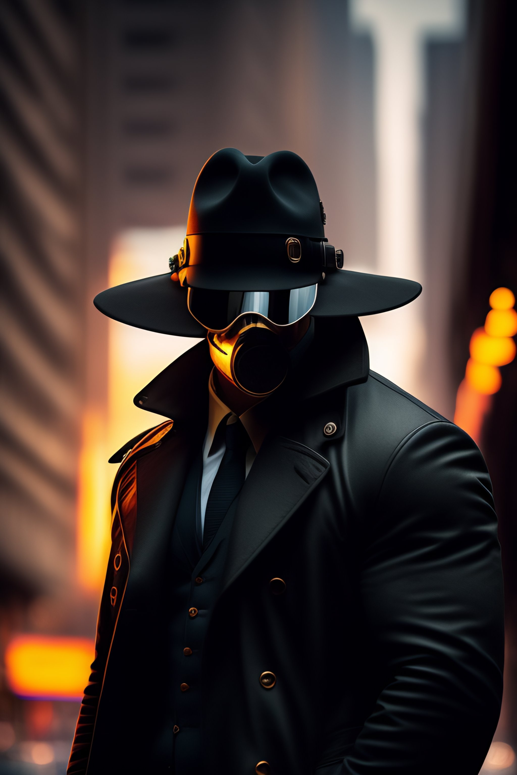 Detective, fedora hat, black trenchcoat, gasmask, sunglasses, city, technology, crime, seedy underbelly, cases, mysteries, hazardous situations, tough, mysterious, noir, intelligent, cunning, formidable, enigmatic, cyberpunk, walking between dimensions