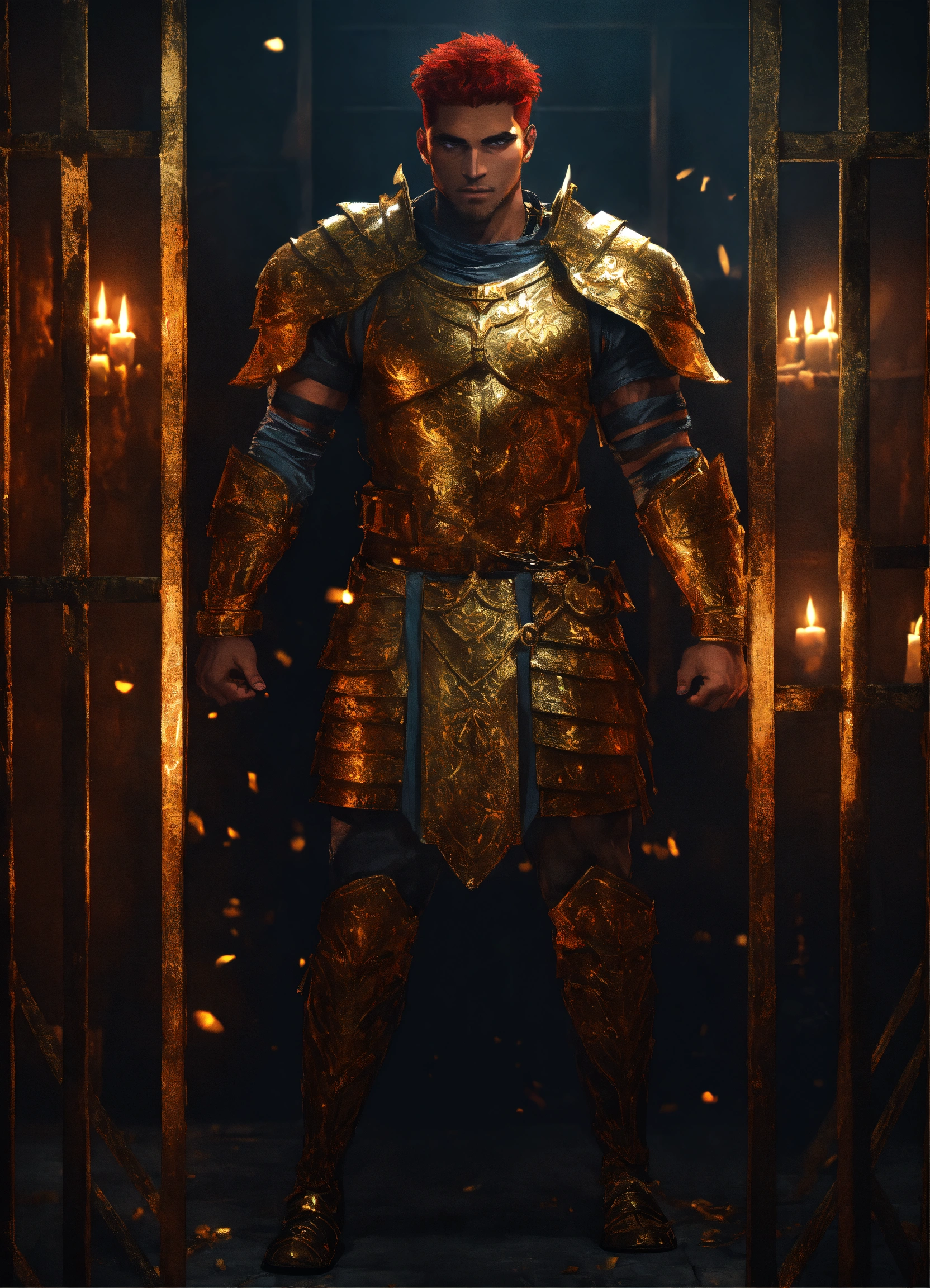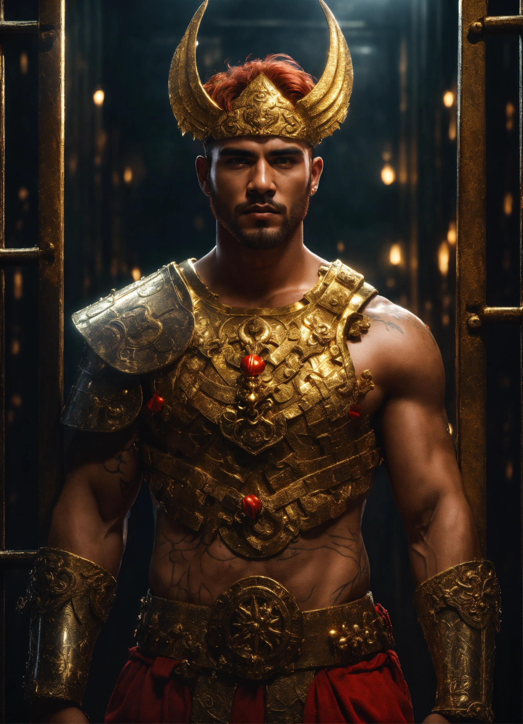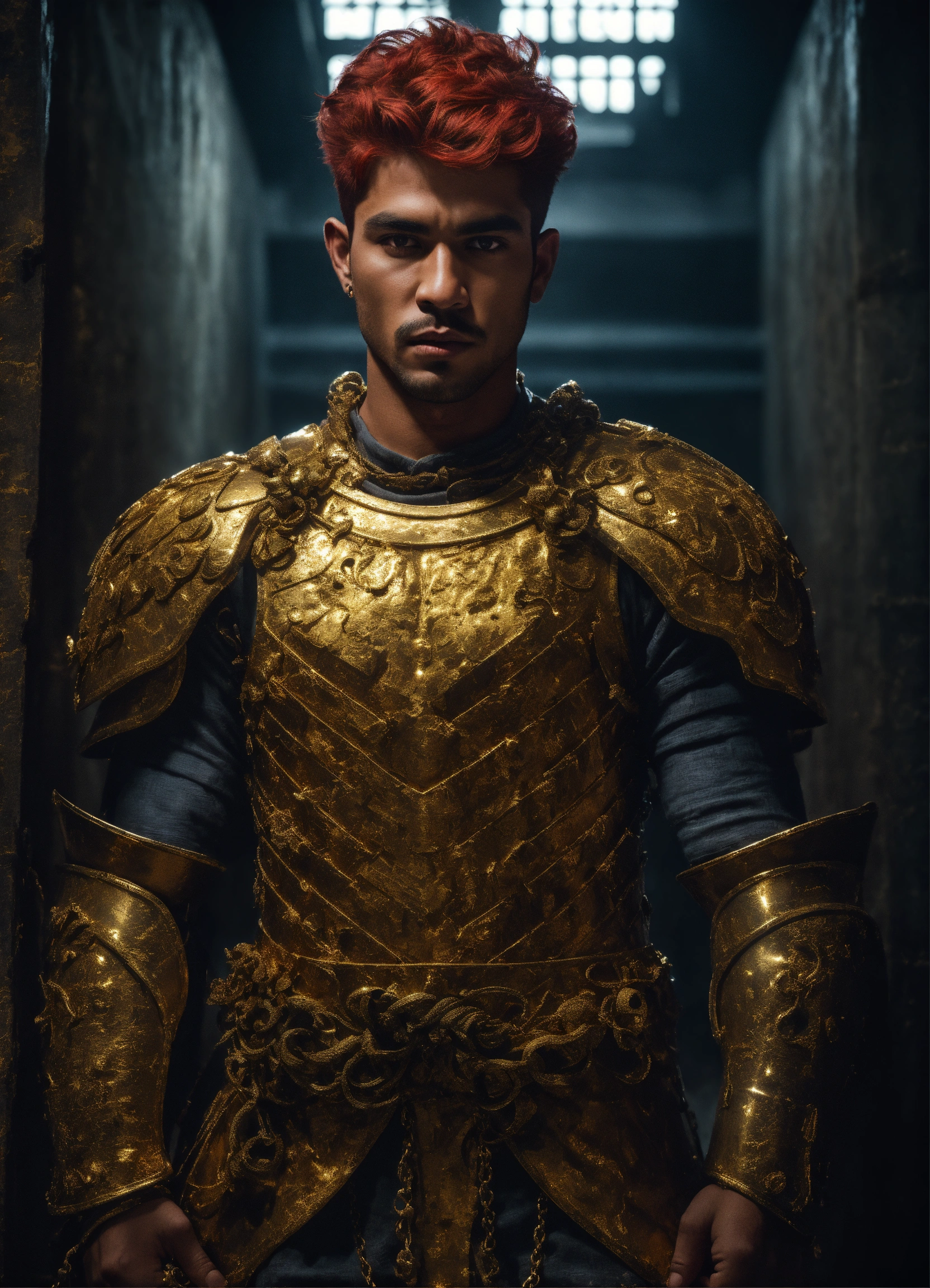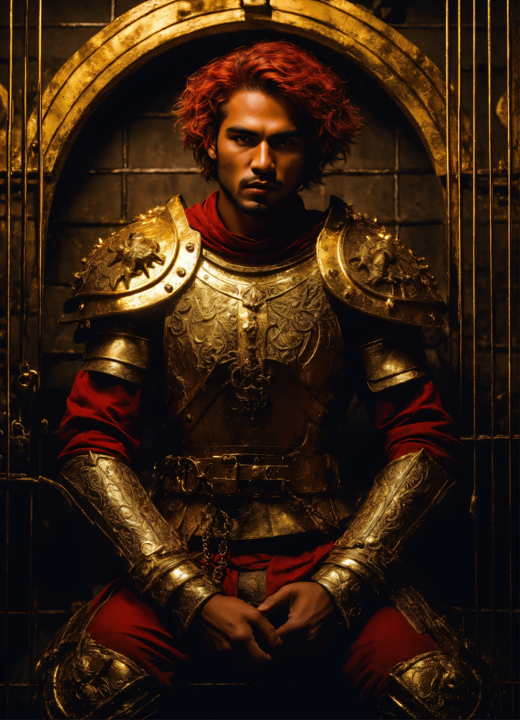 Handcuffed, a handsome ethnic male god, a strong prisoner with short red hair, wearing the remains of gold armor, held captive in a spooky dark cell with monstrous guards in the backgroundl, resolution 8k, insanely detailed