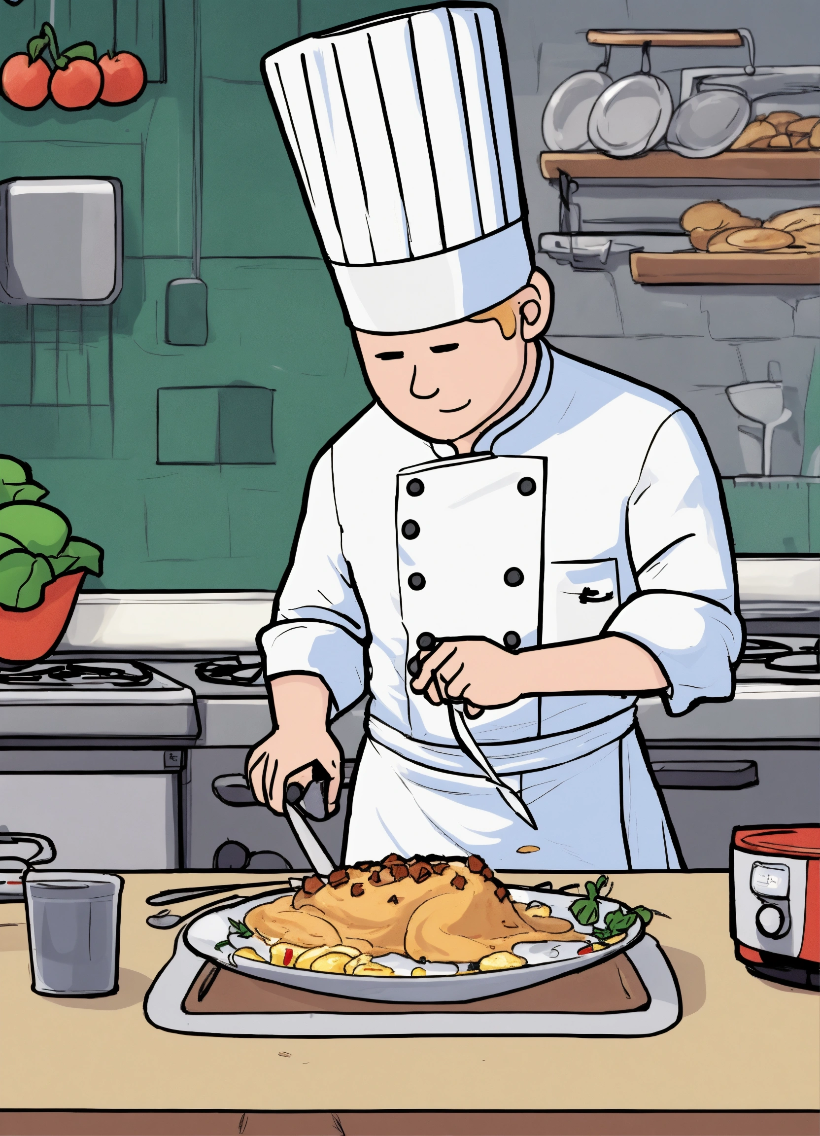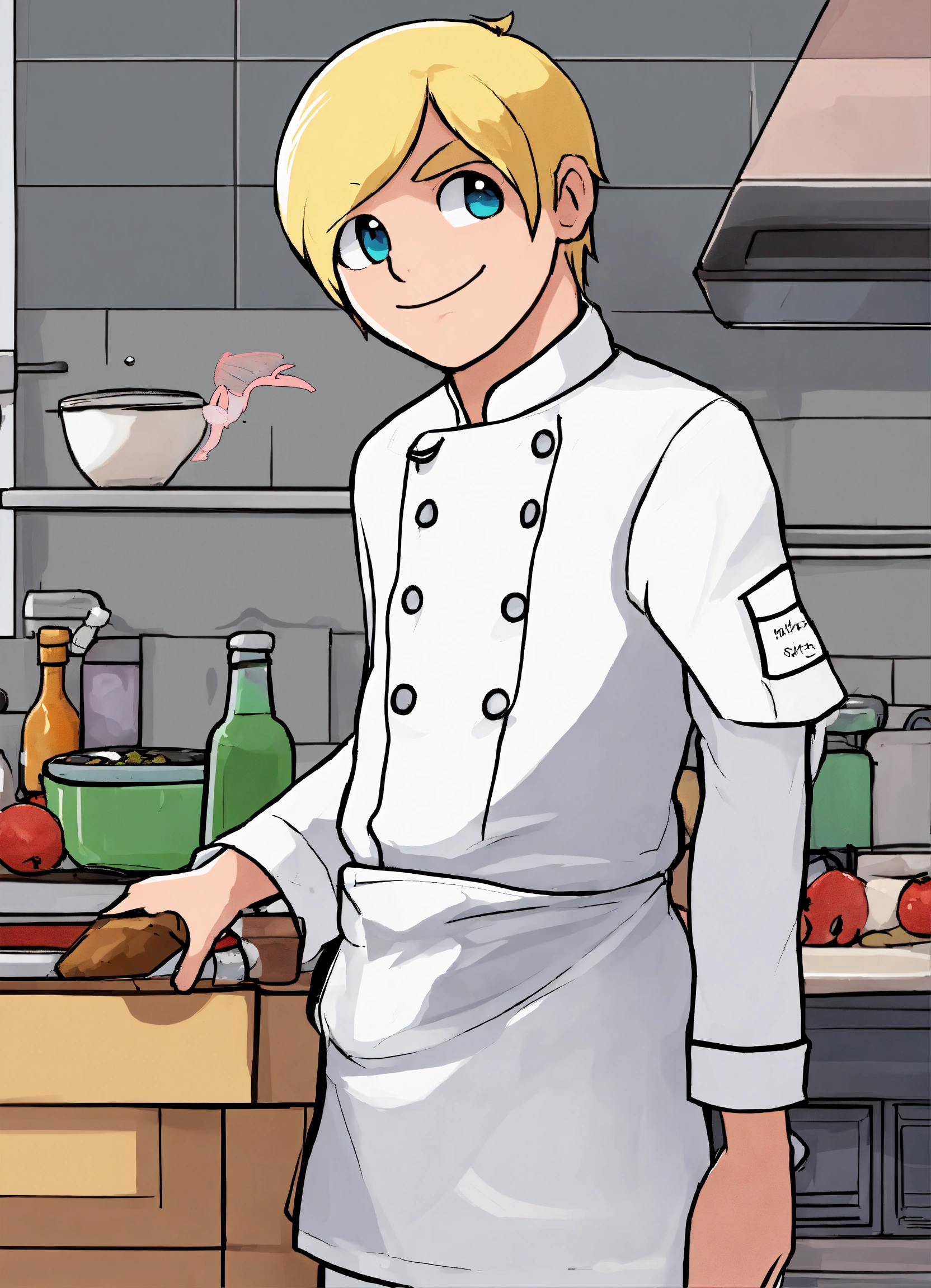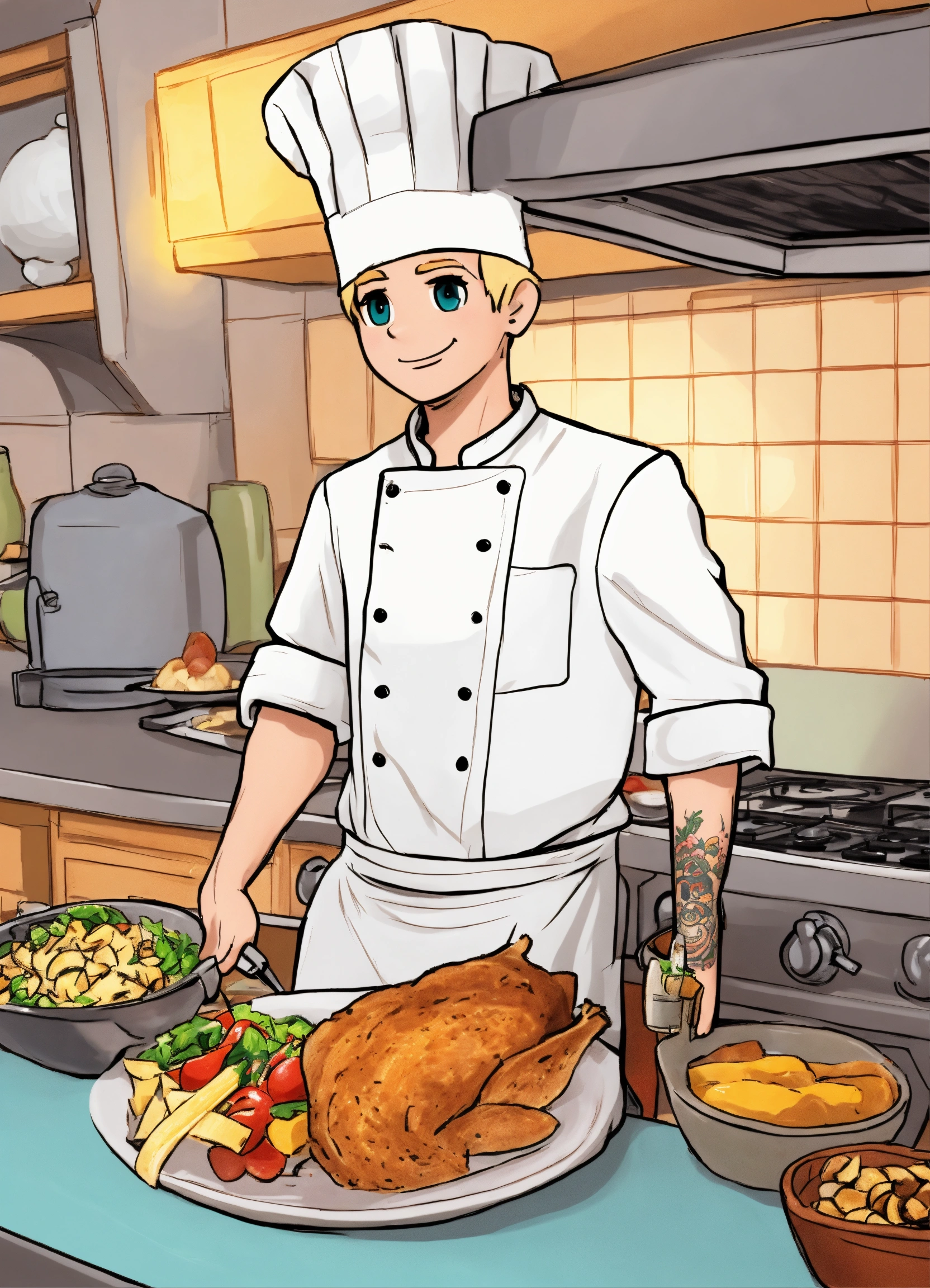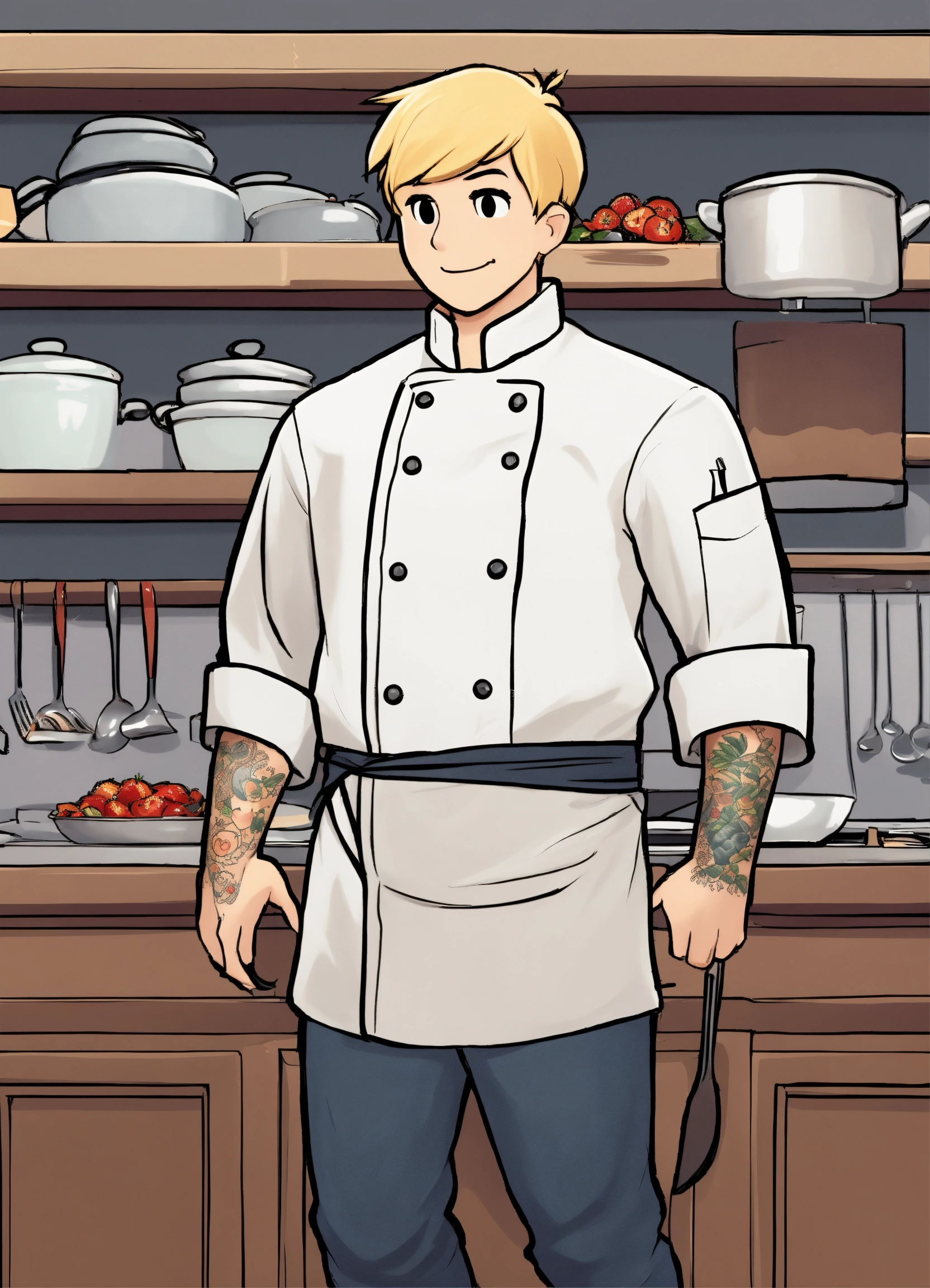 Now please take the character in this image and keep him as a template but can you make him blonde and shorter sleeves with a chef tatto on the arm make it cartoony like the odd1sout,