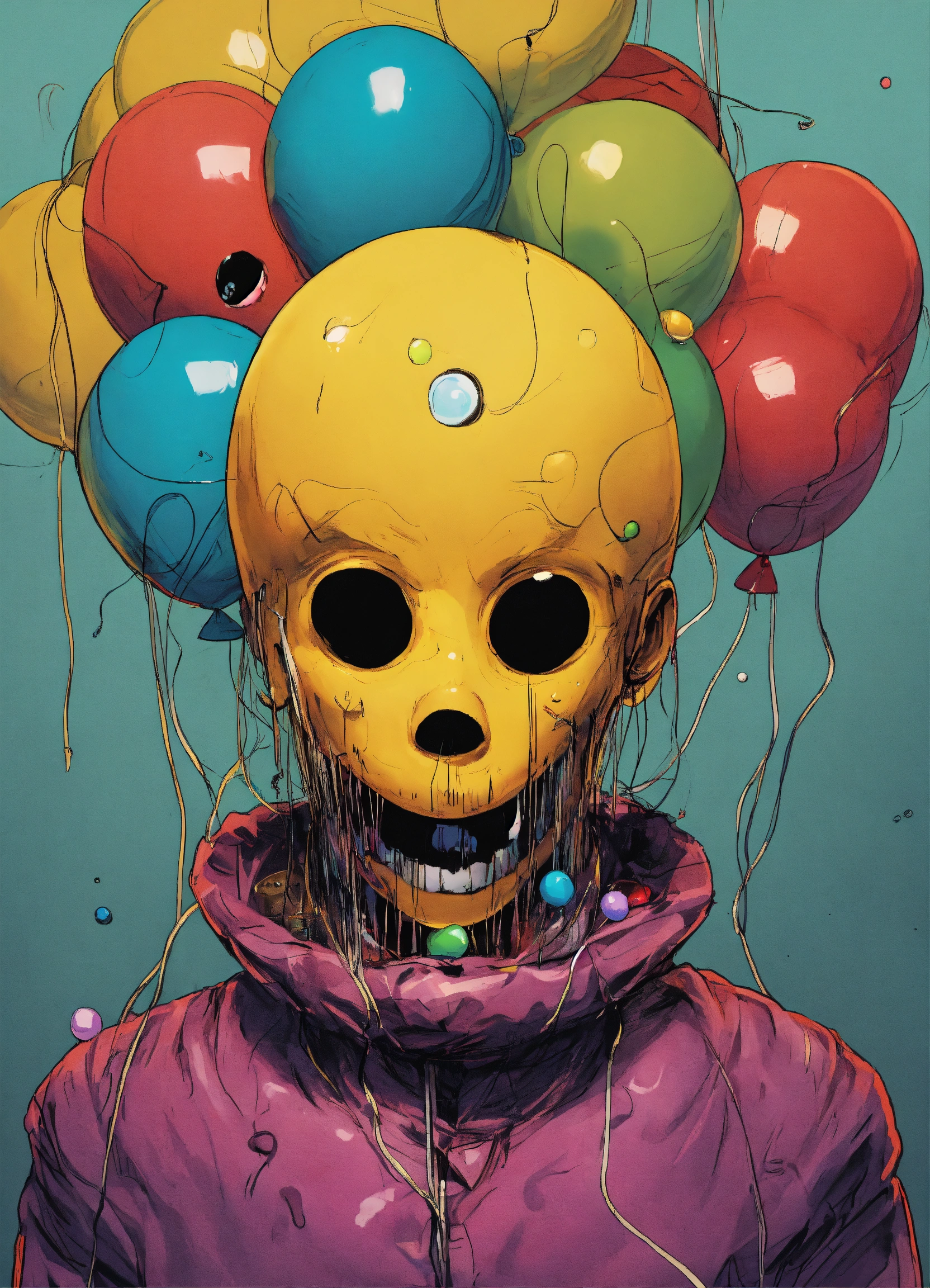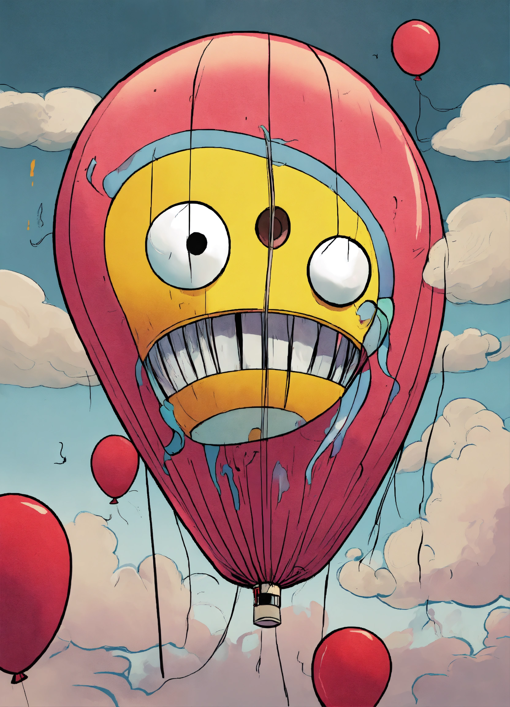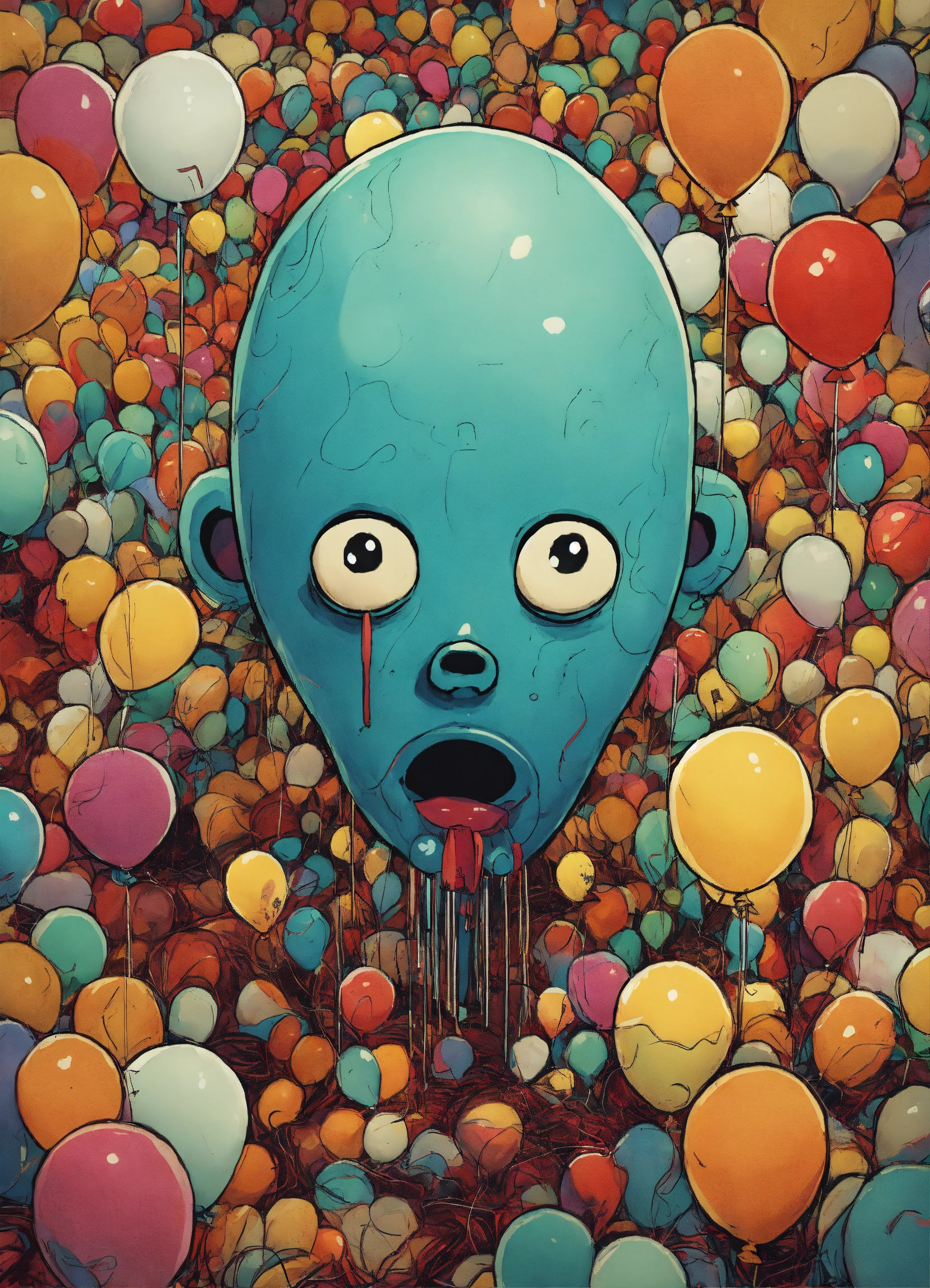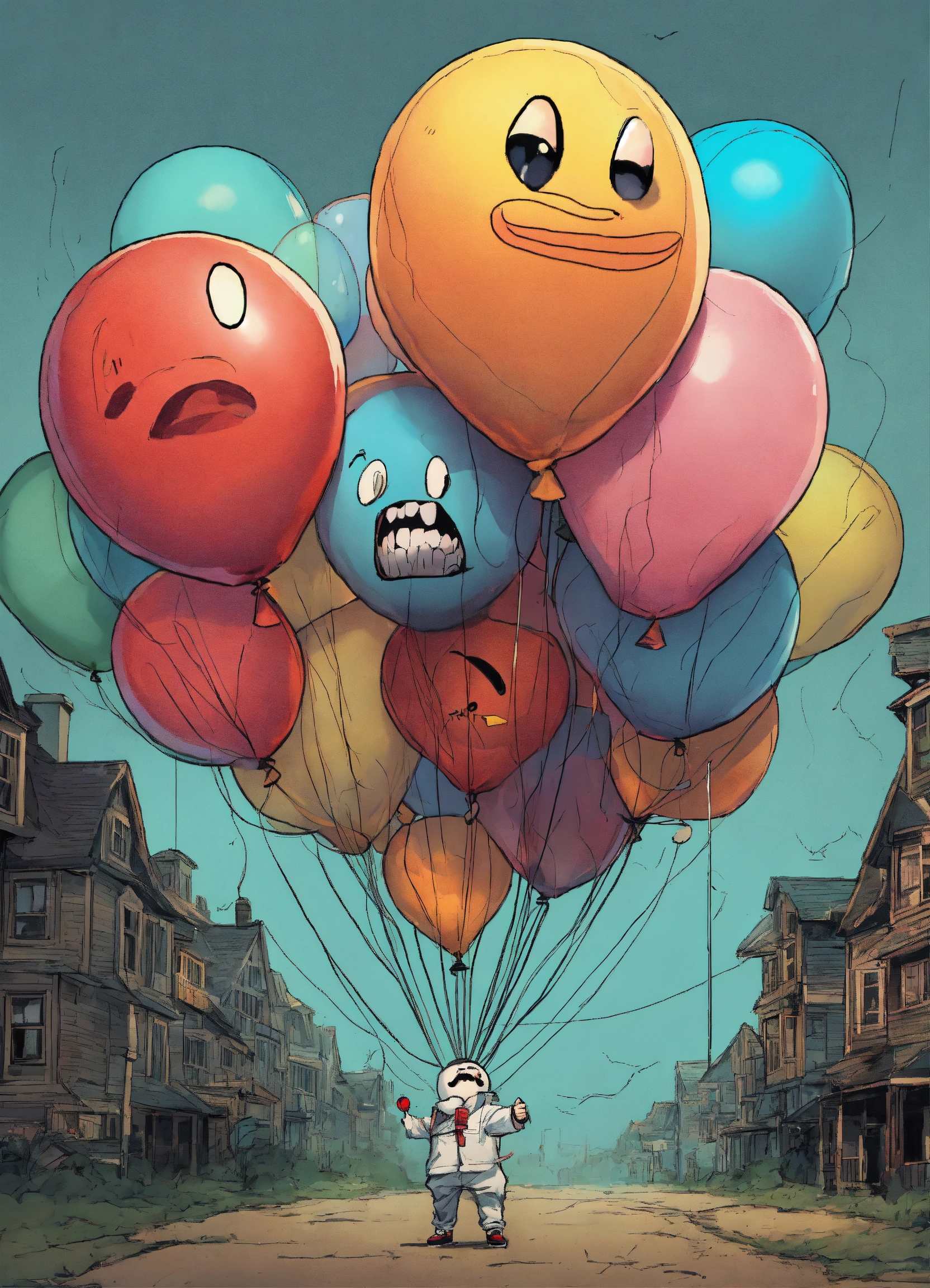 A face made of balloons that is afraid of a needle ghost that is about to stab it, comic style, future art