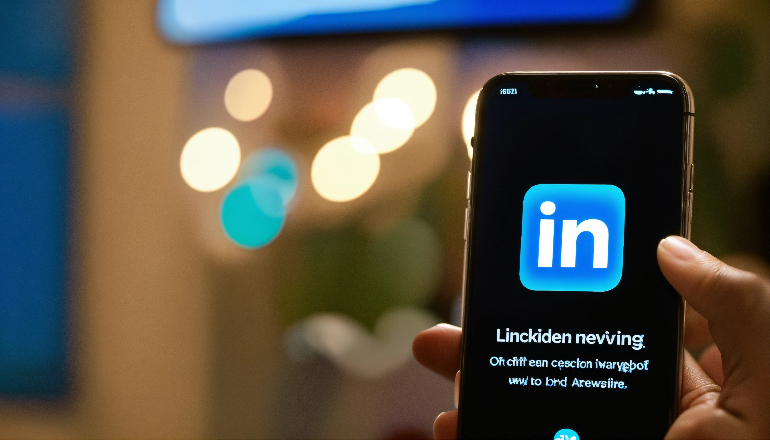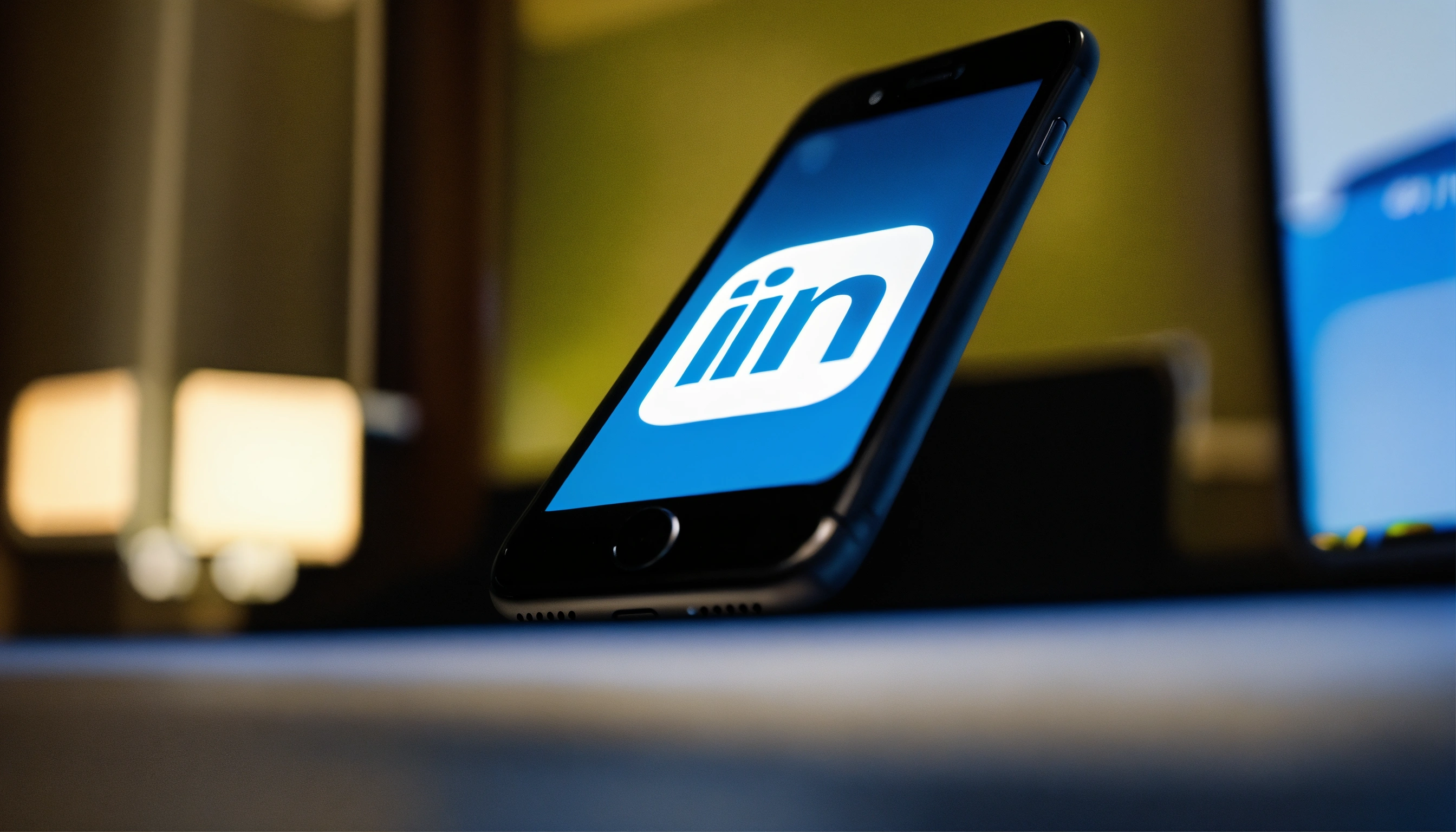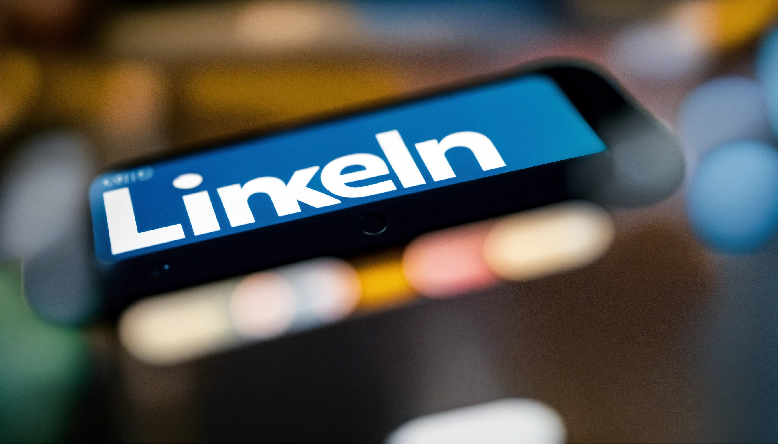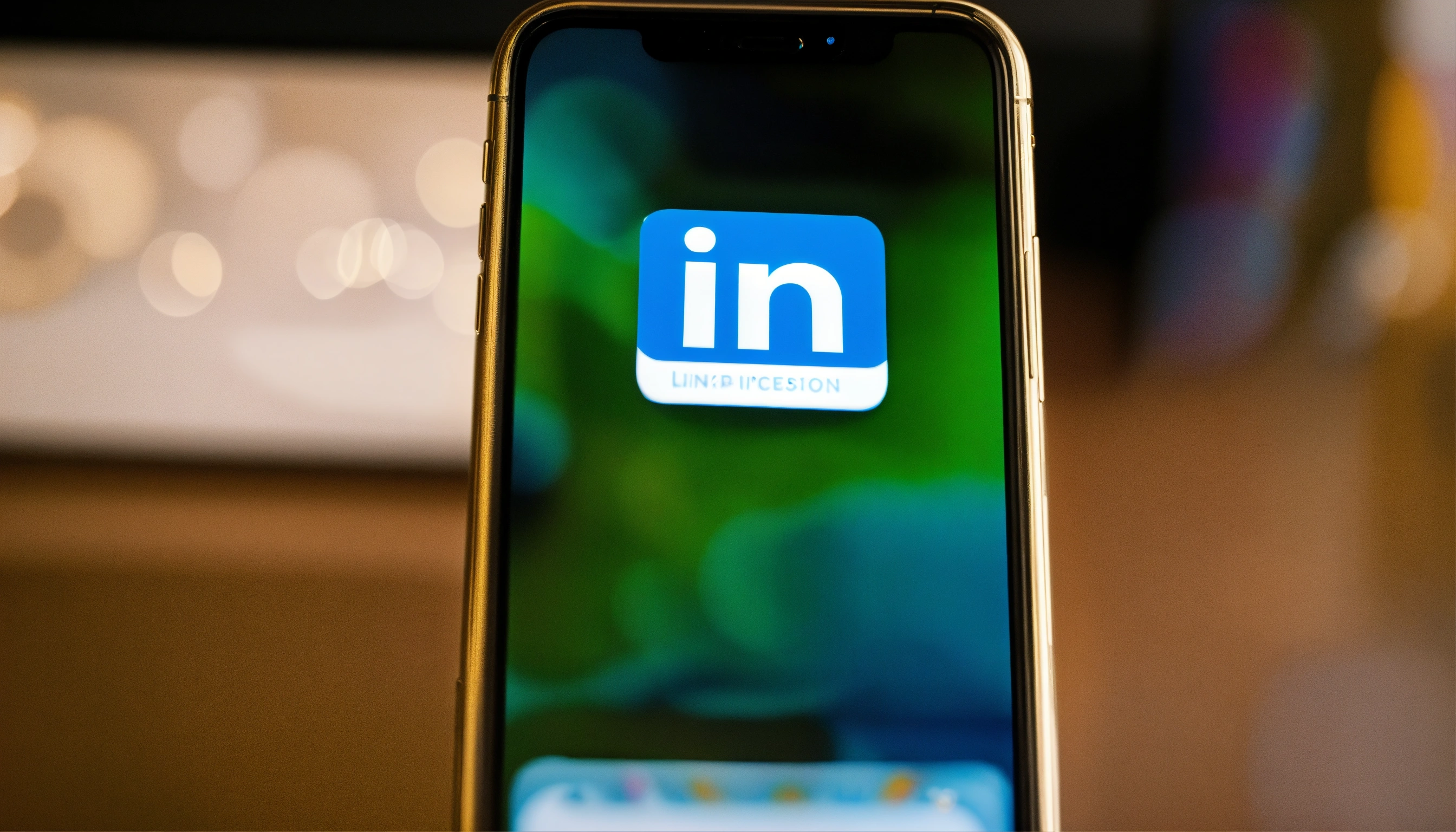 An iphone displaying the linkedin logo on the screen, everything in the background is blurry, the only clearly visible thing is the iphone and the screen