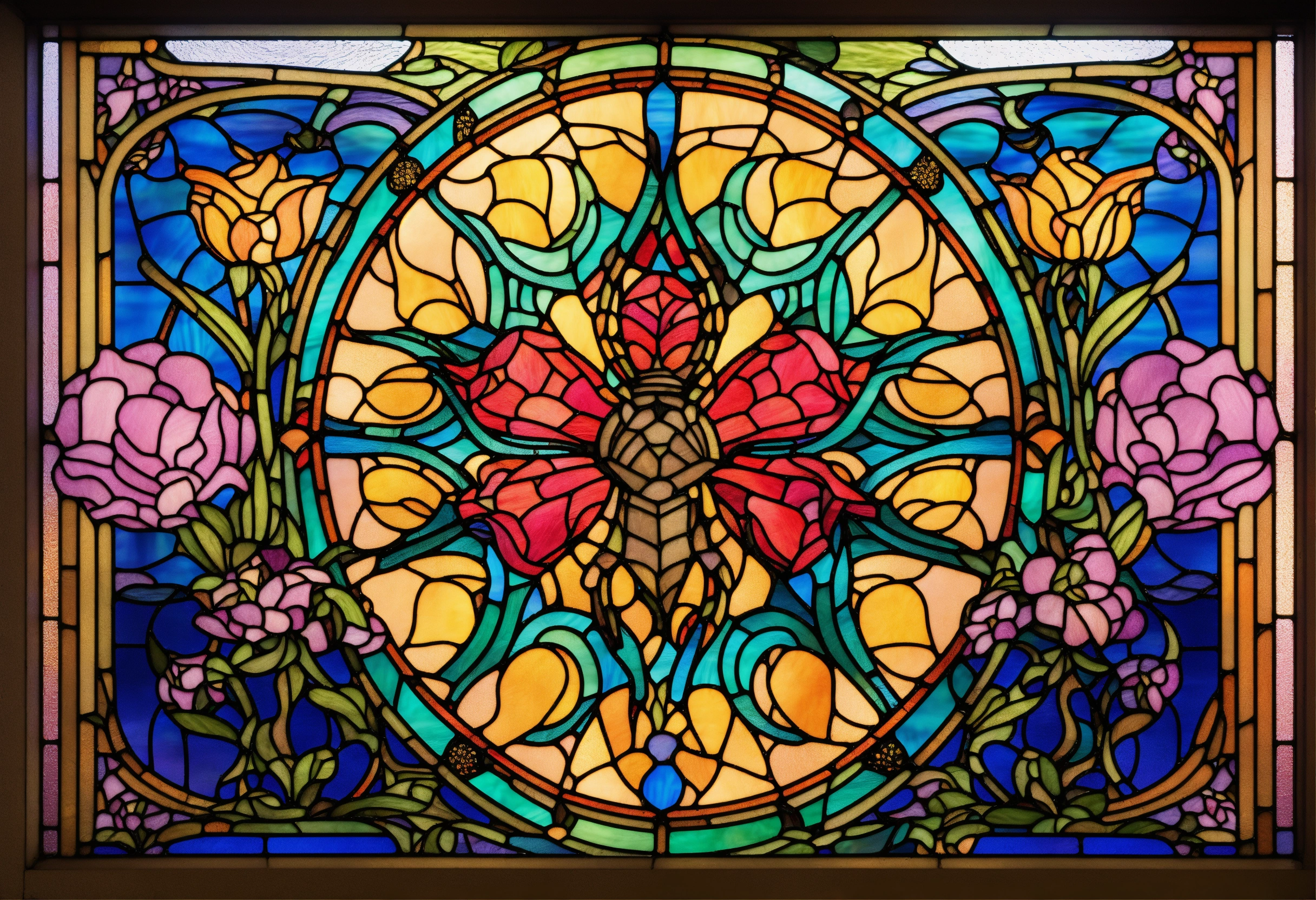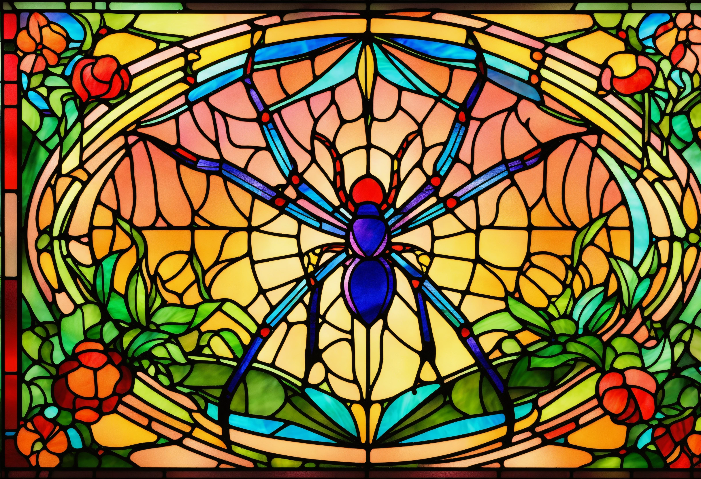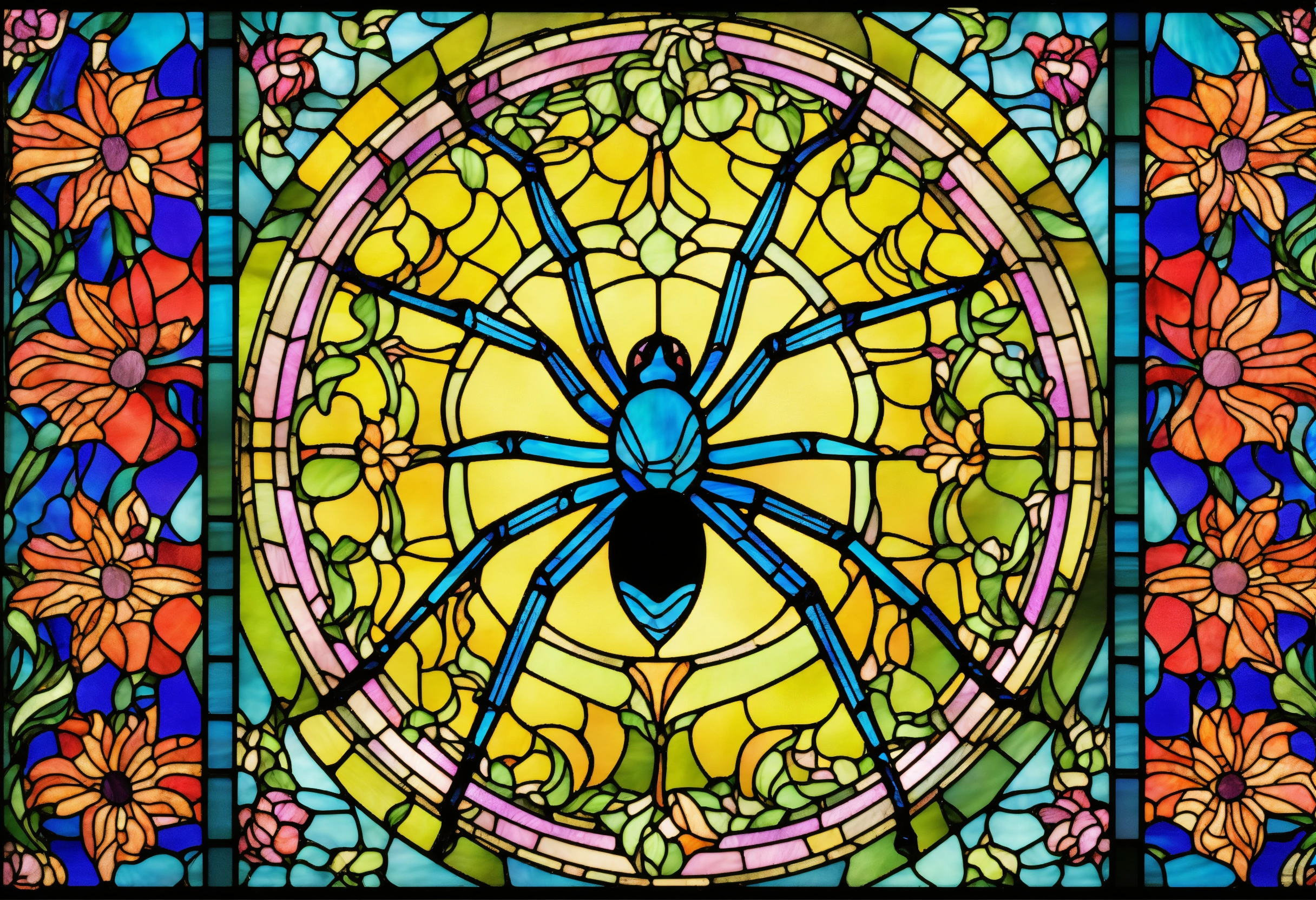 Simple psychedelic stained glass window in art nouveau style featuring large colorful spider and flowers