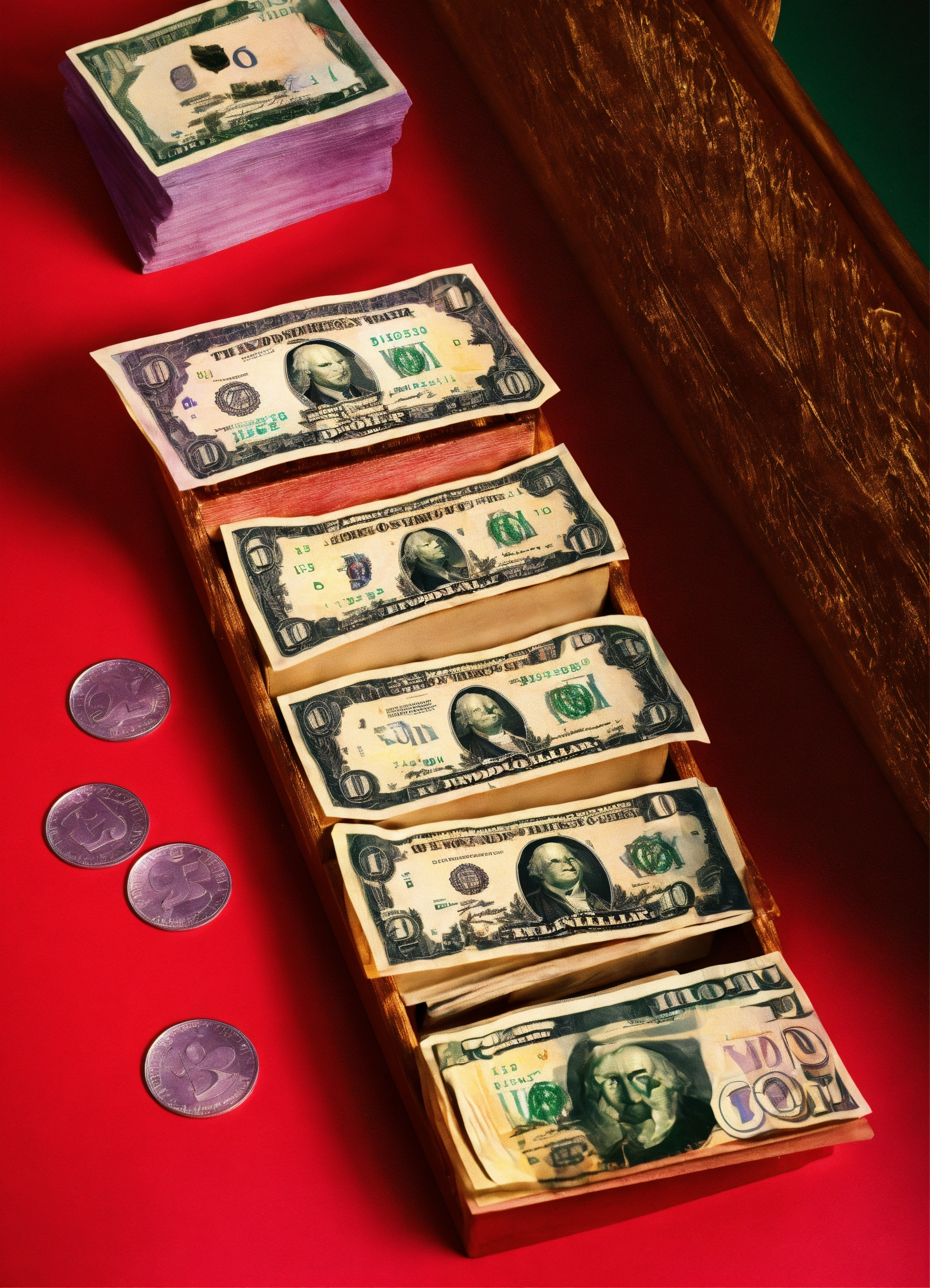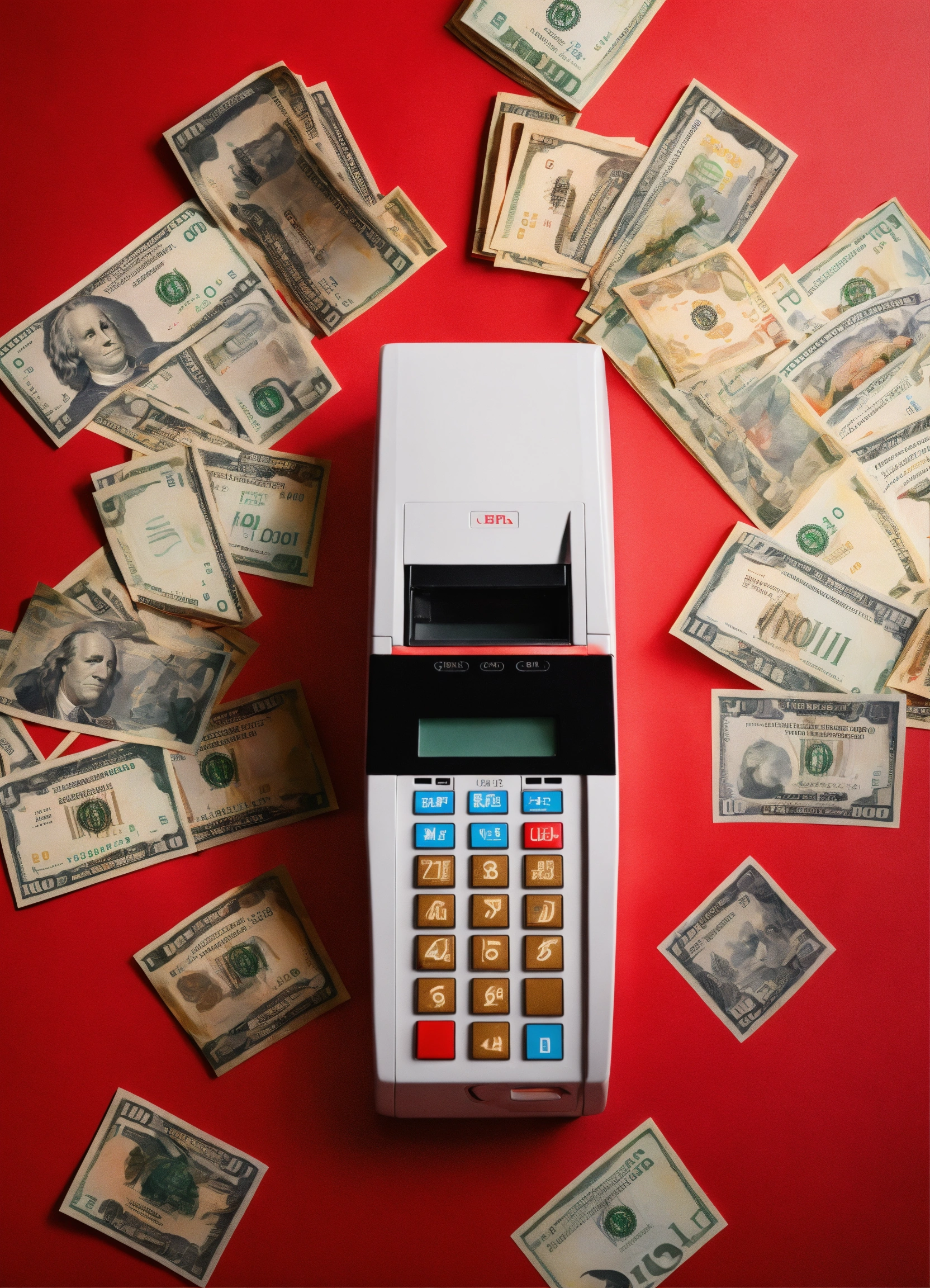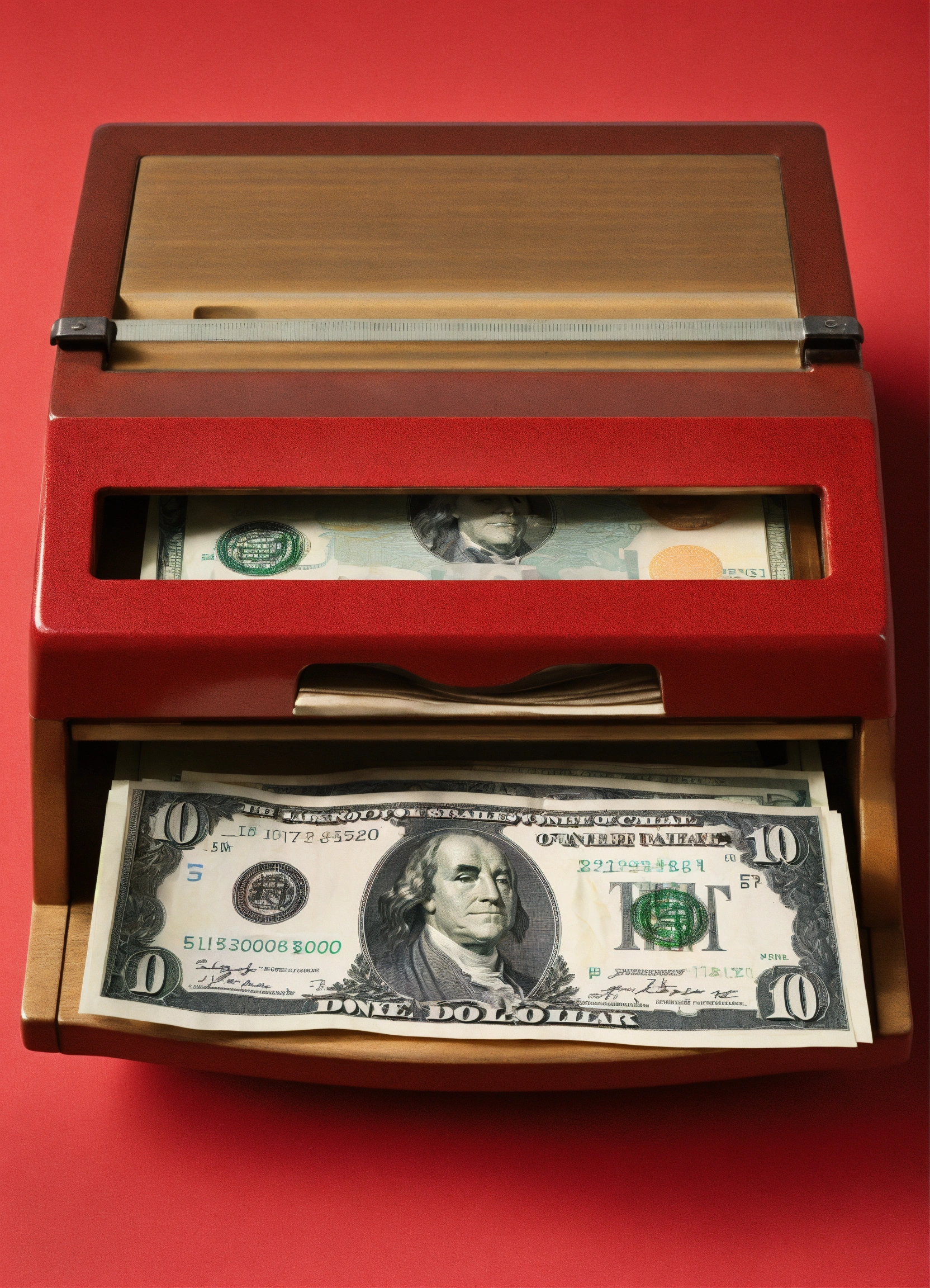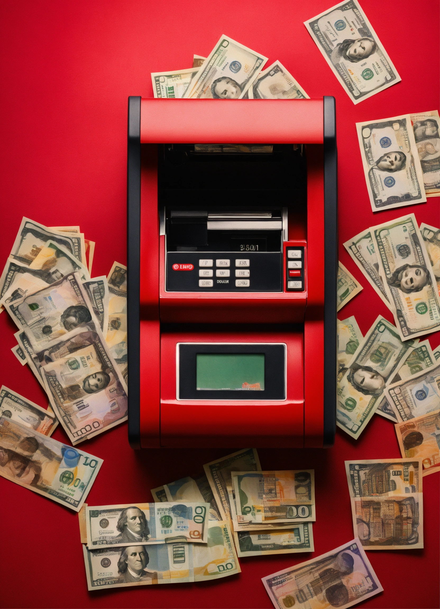 The banknote counter is on the table, from there come out us dollar banknotes, view from above, red background
