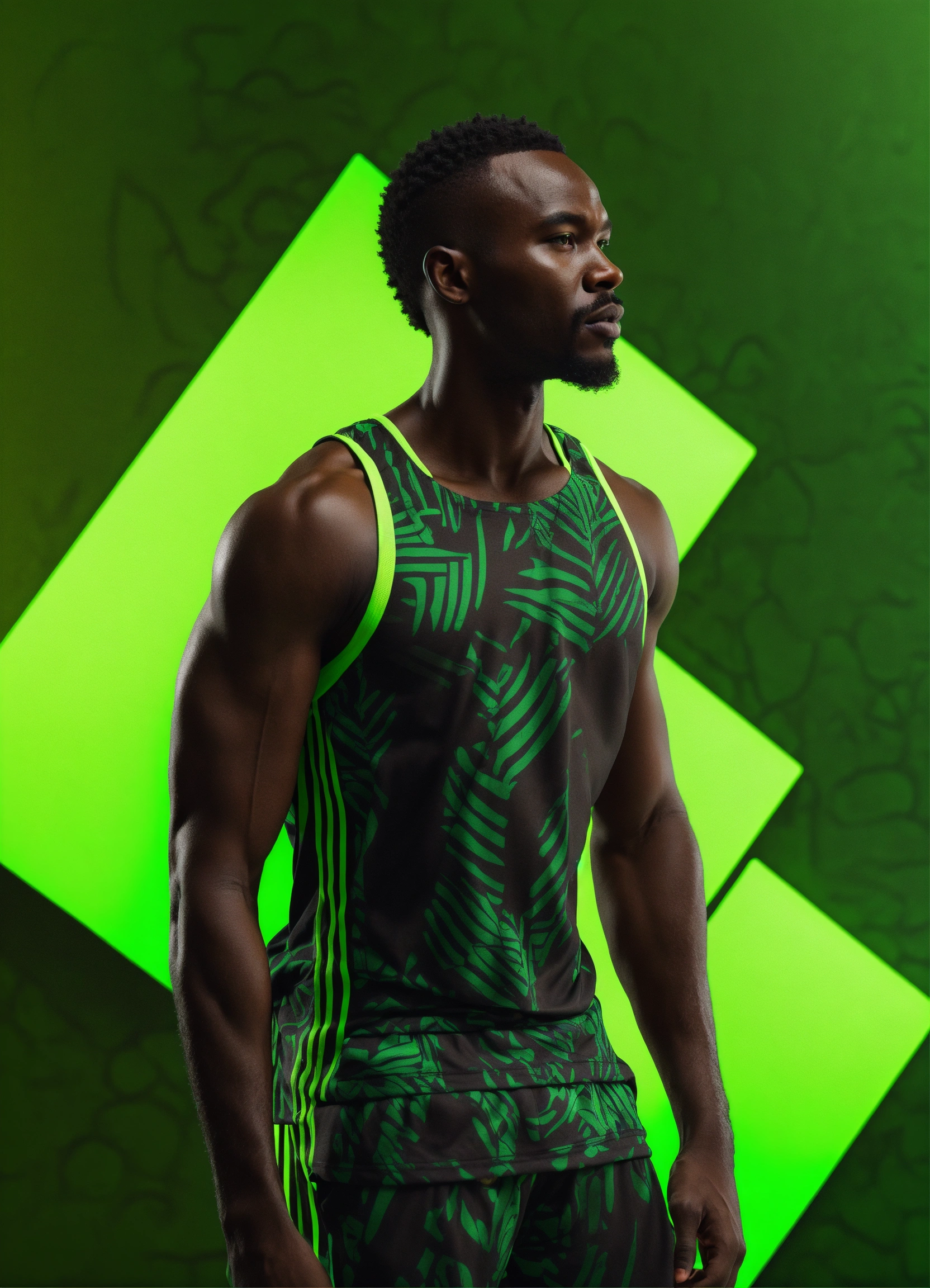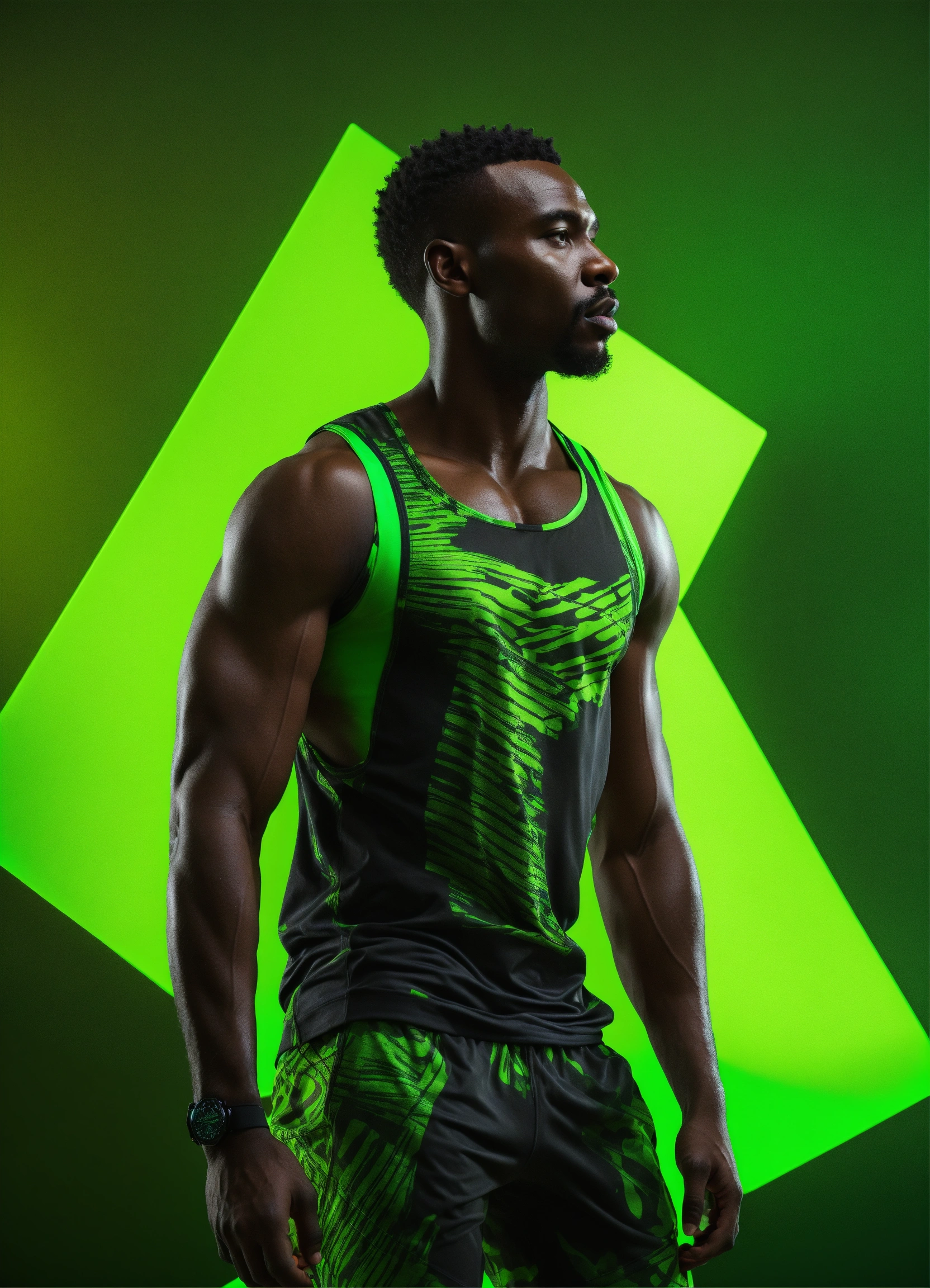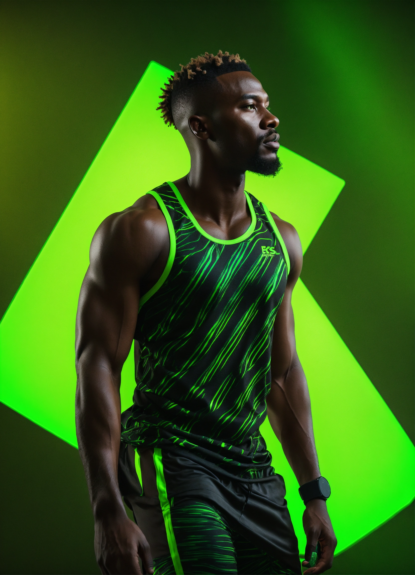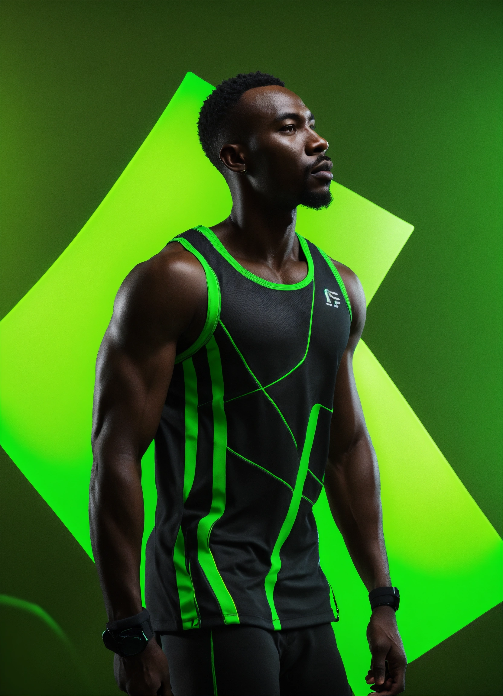 An african man black fitness wear, studio photo, hyper realistic, fashion, photorealistic, 3d render, neon green background
