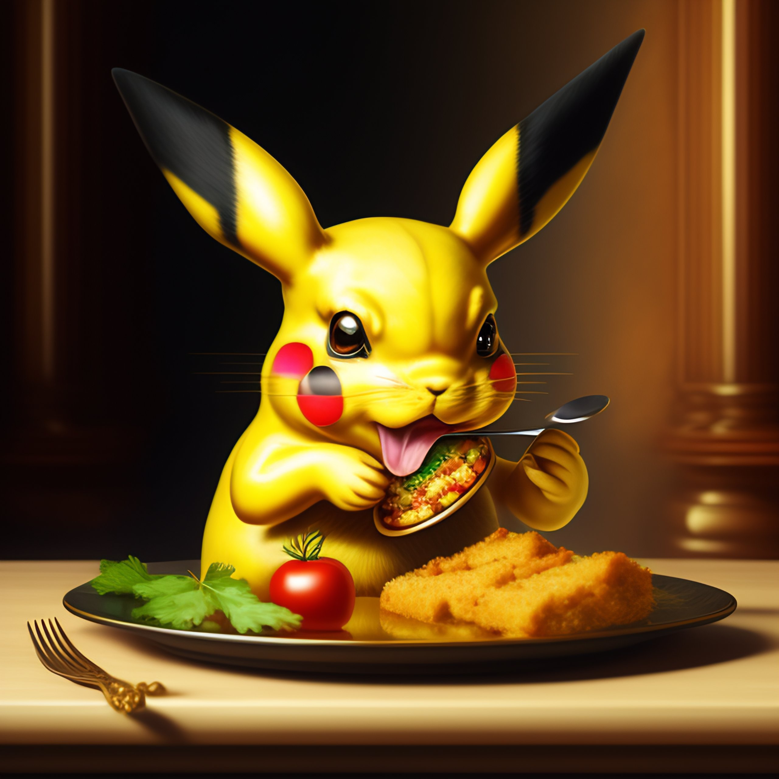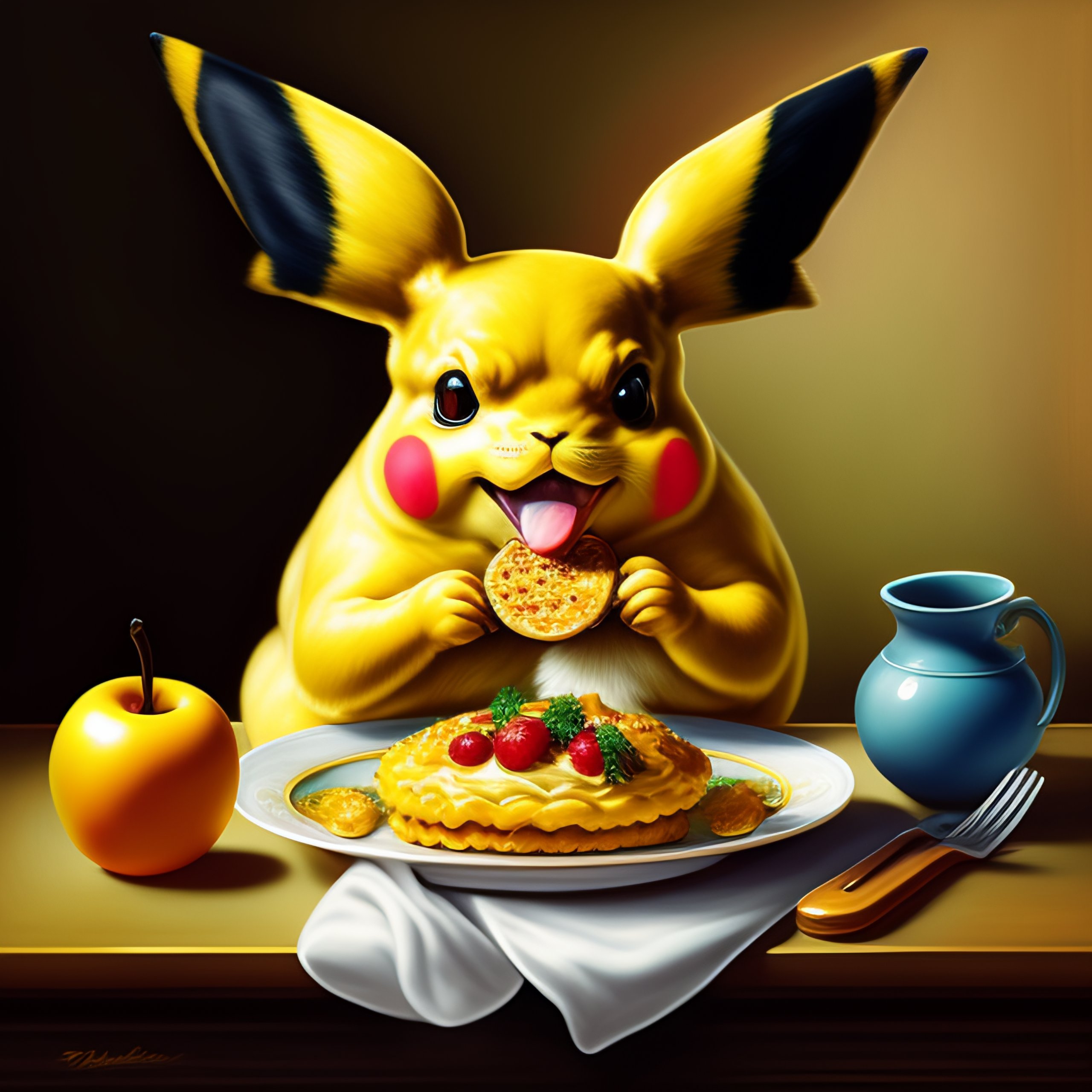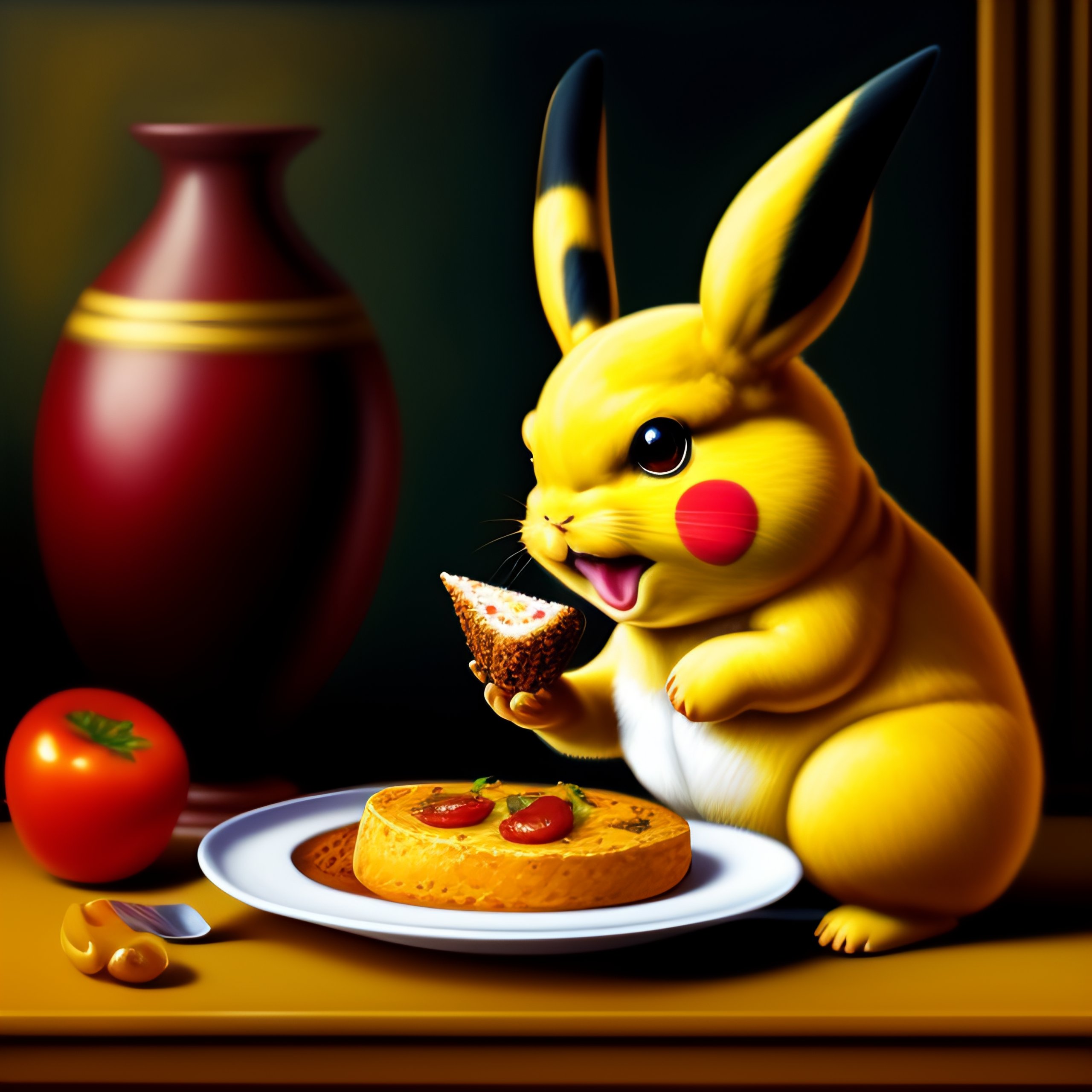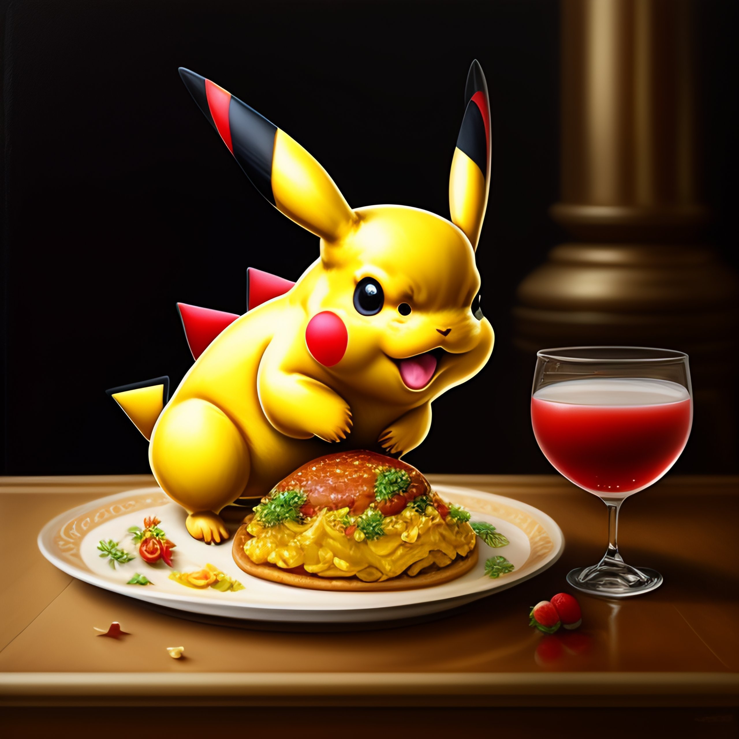 Baroque style painting of pikachu the pokémon eating food