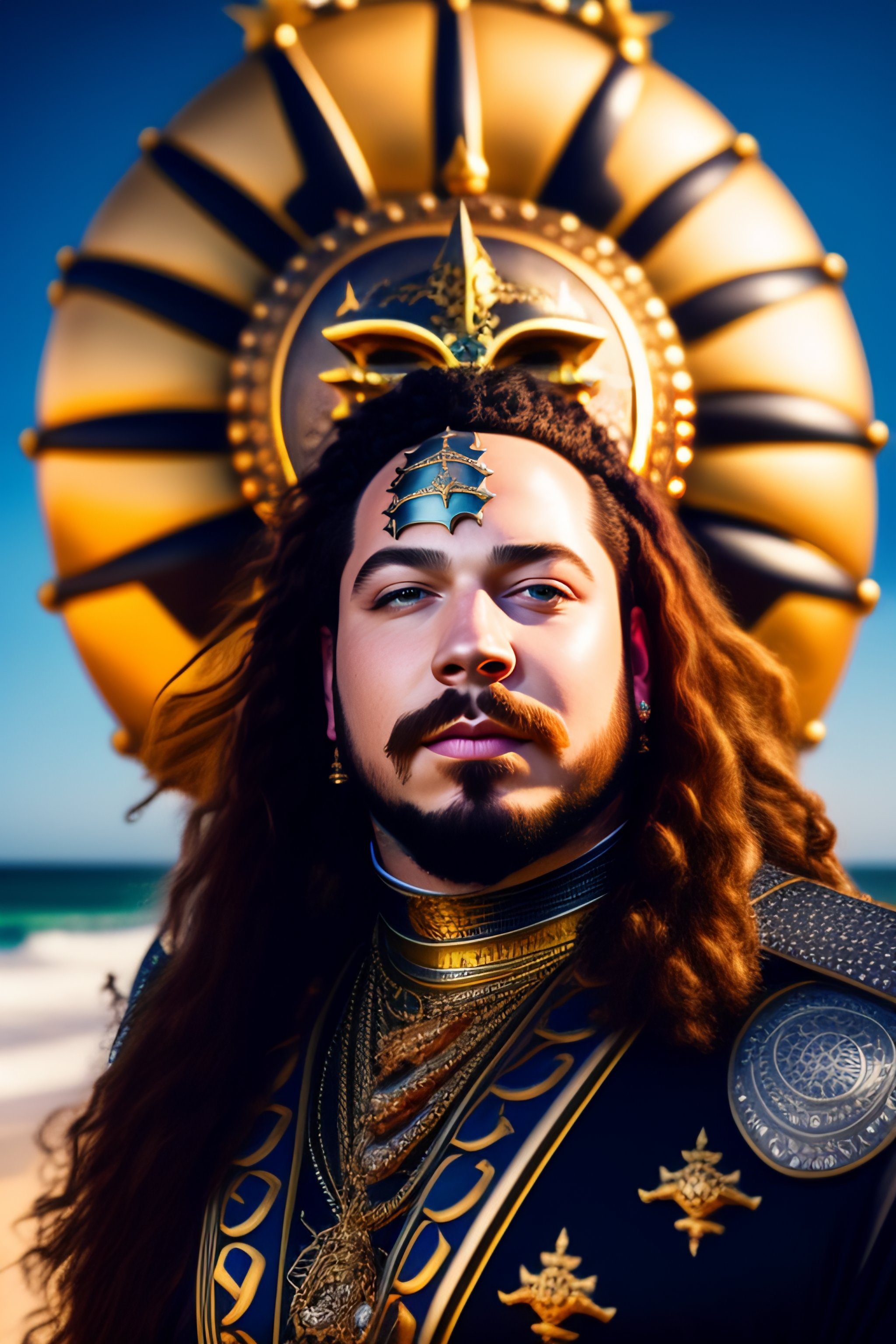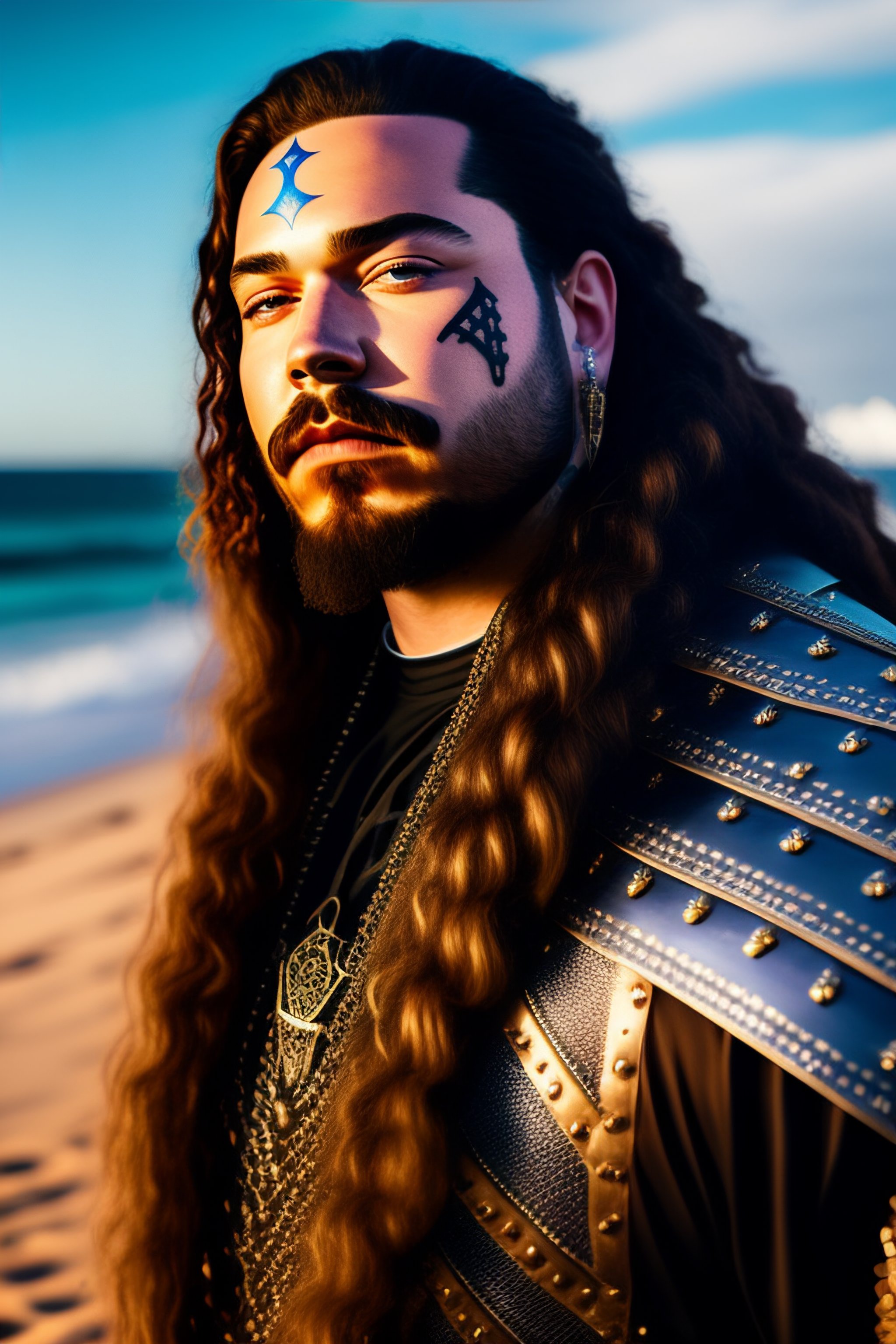A portrait image of post malone with face tattoos in medival knight metal armour standing by the beach with sun rays and giant pirate ship in backround