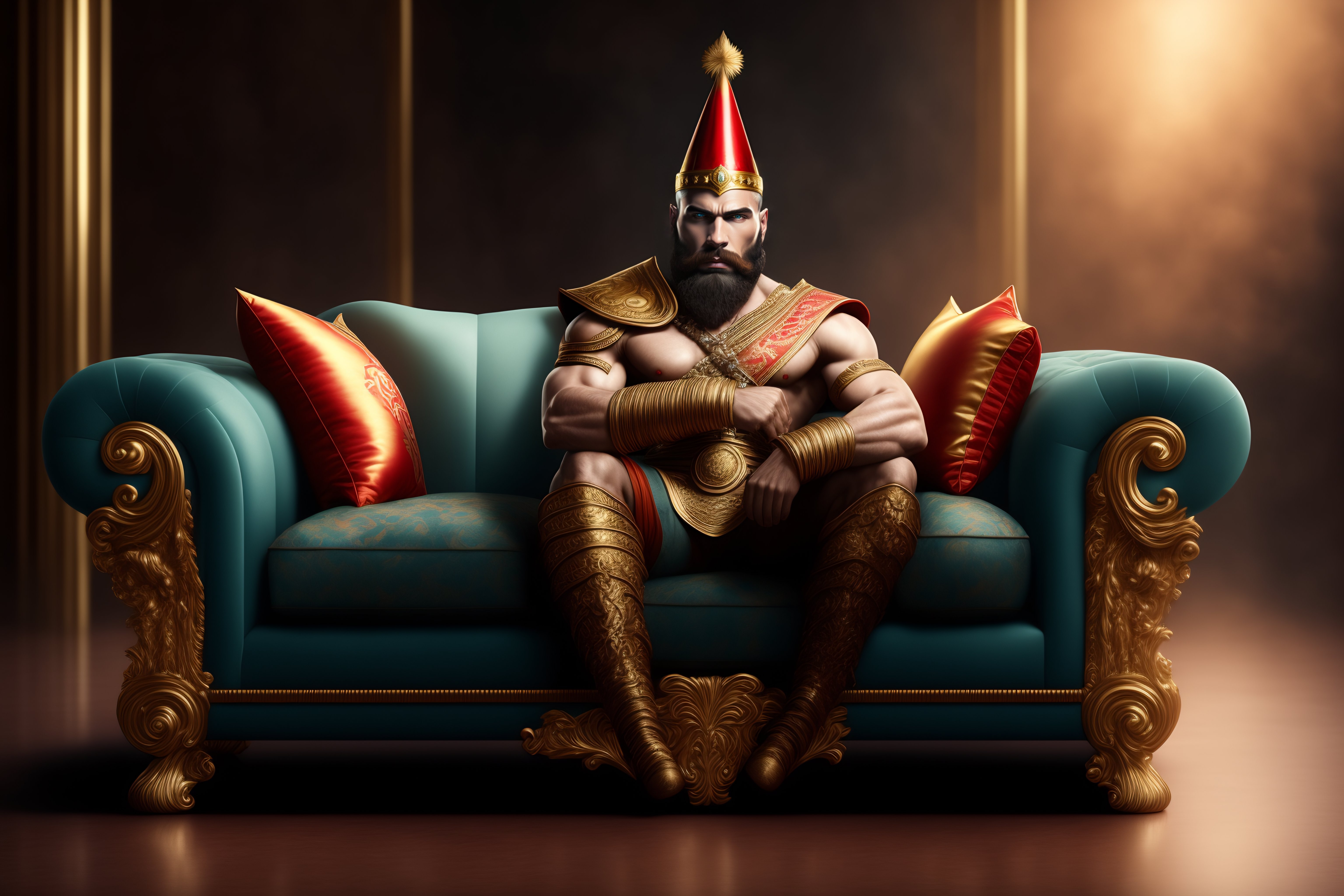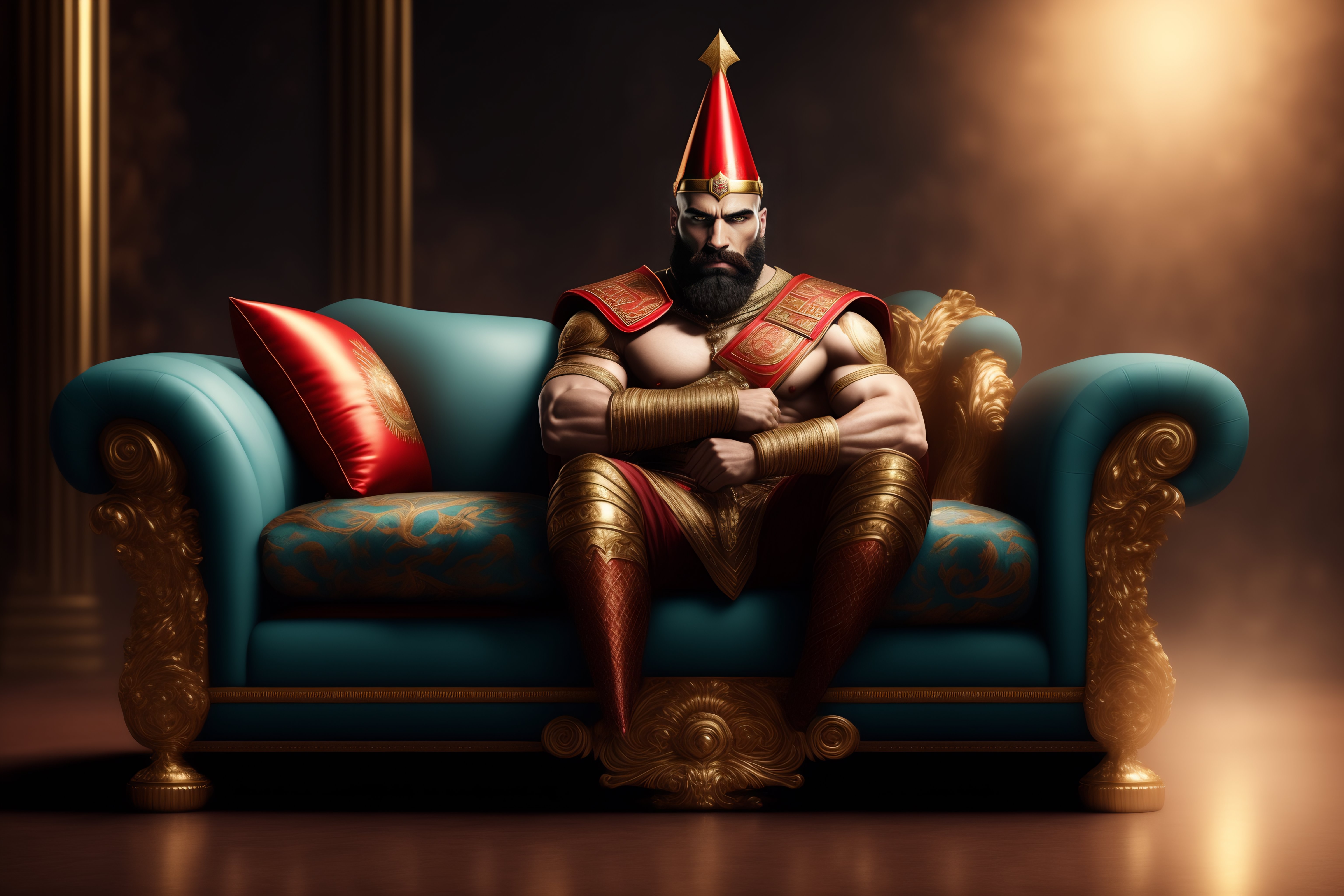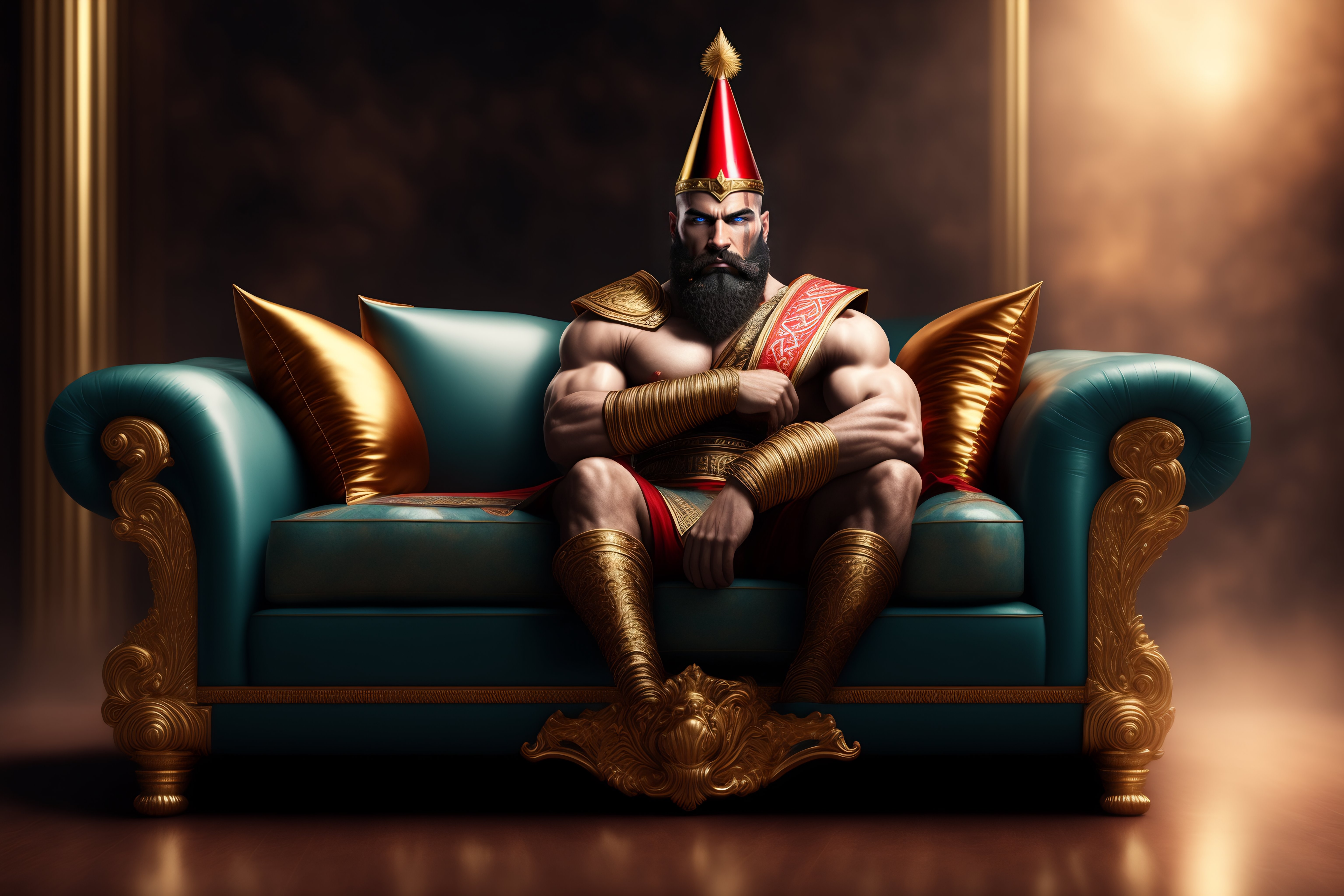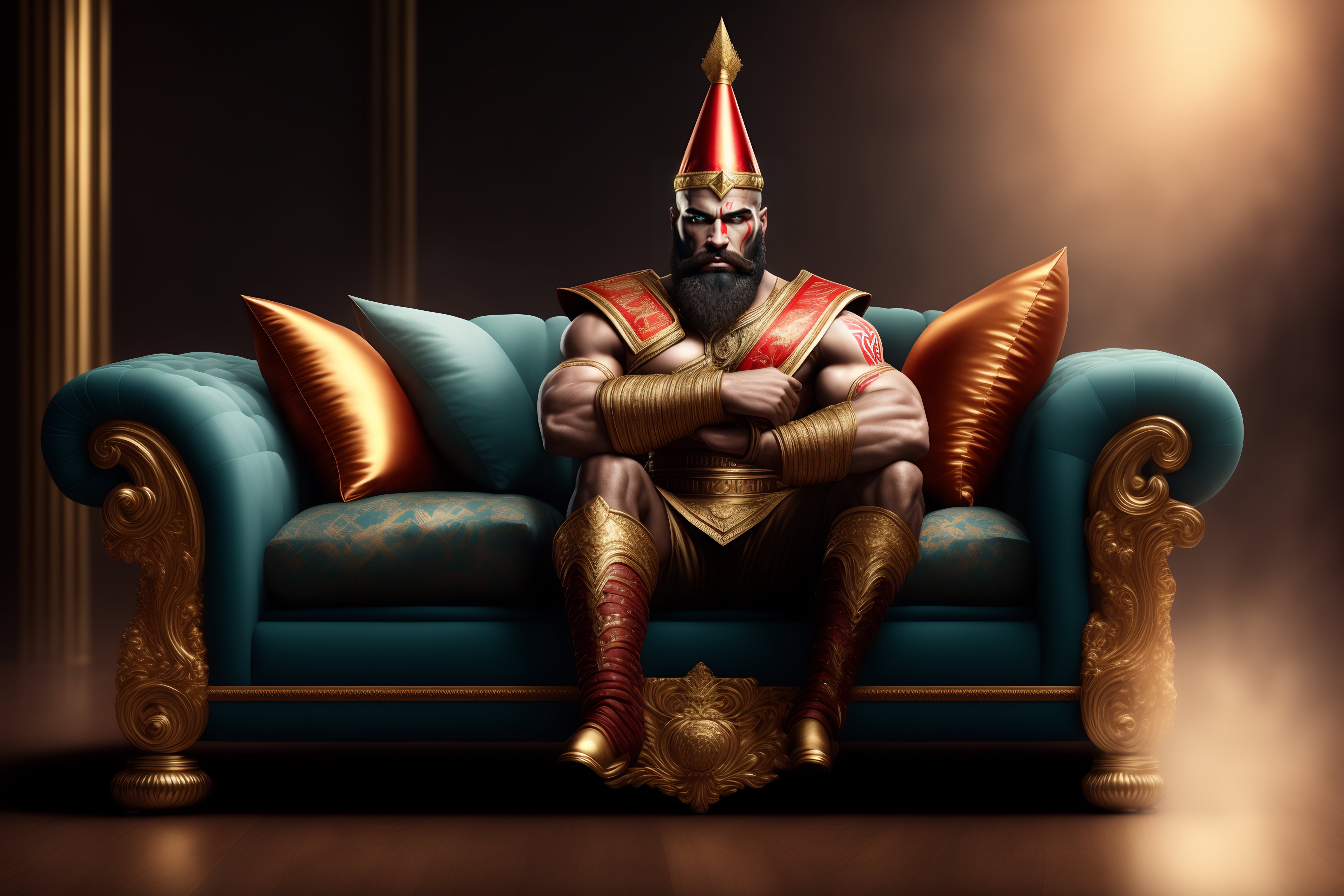 God of war sitting on a couch wearing birthday hat