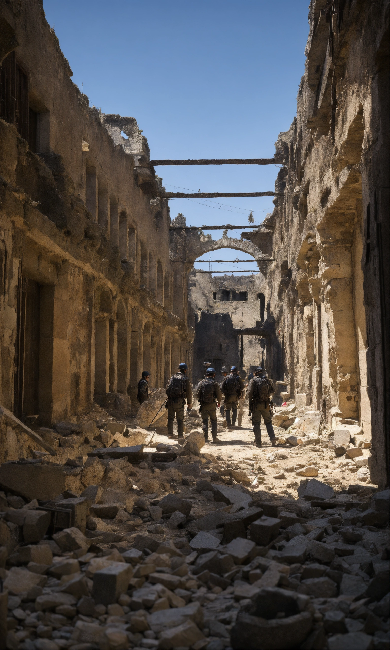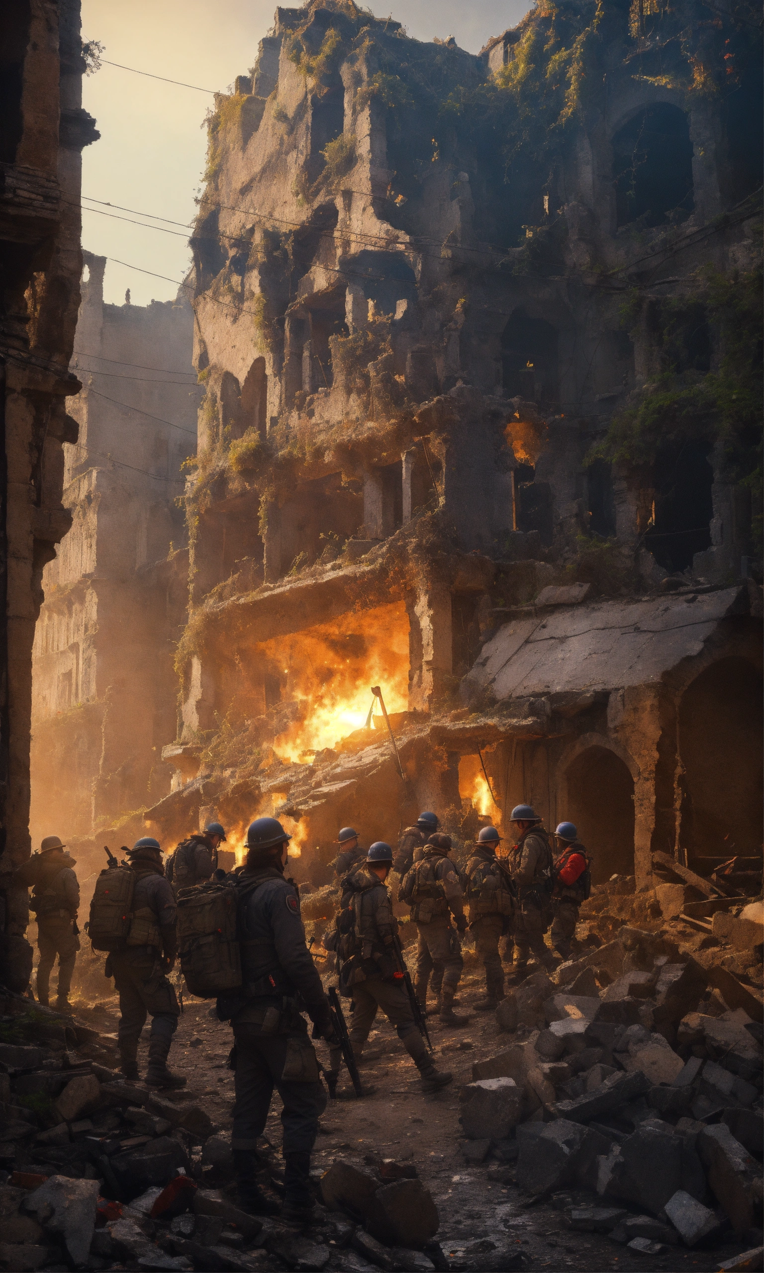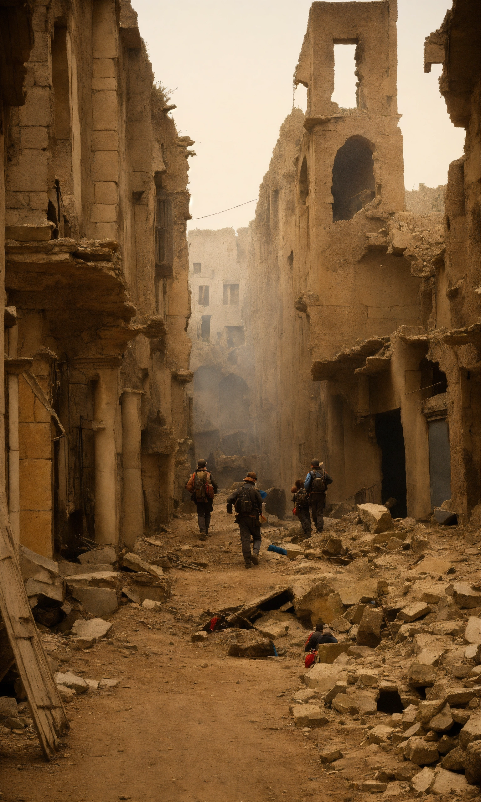 Groupes de survivants ayant la vingtaine d'années dans une ville en ruines