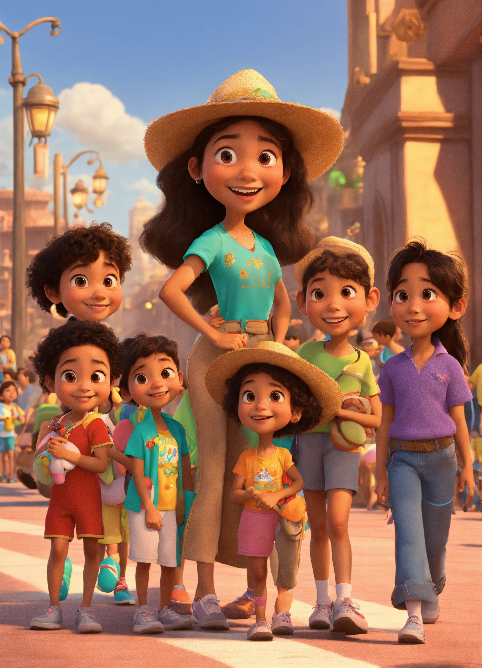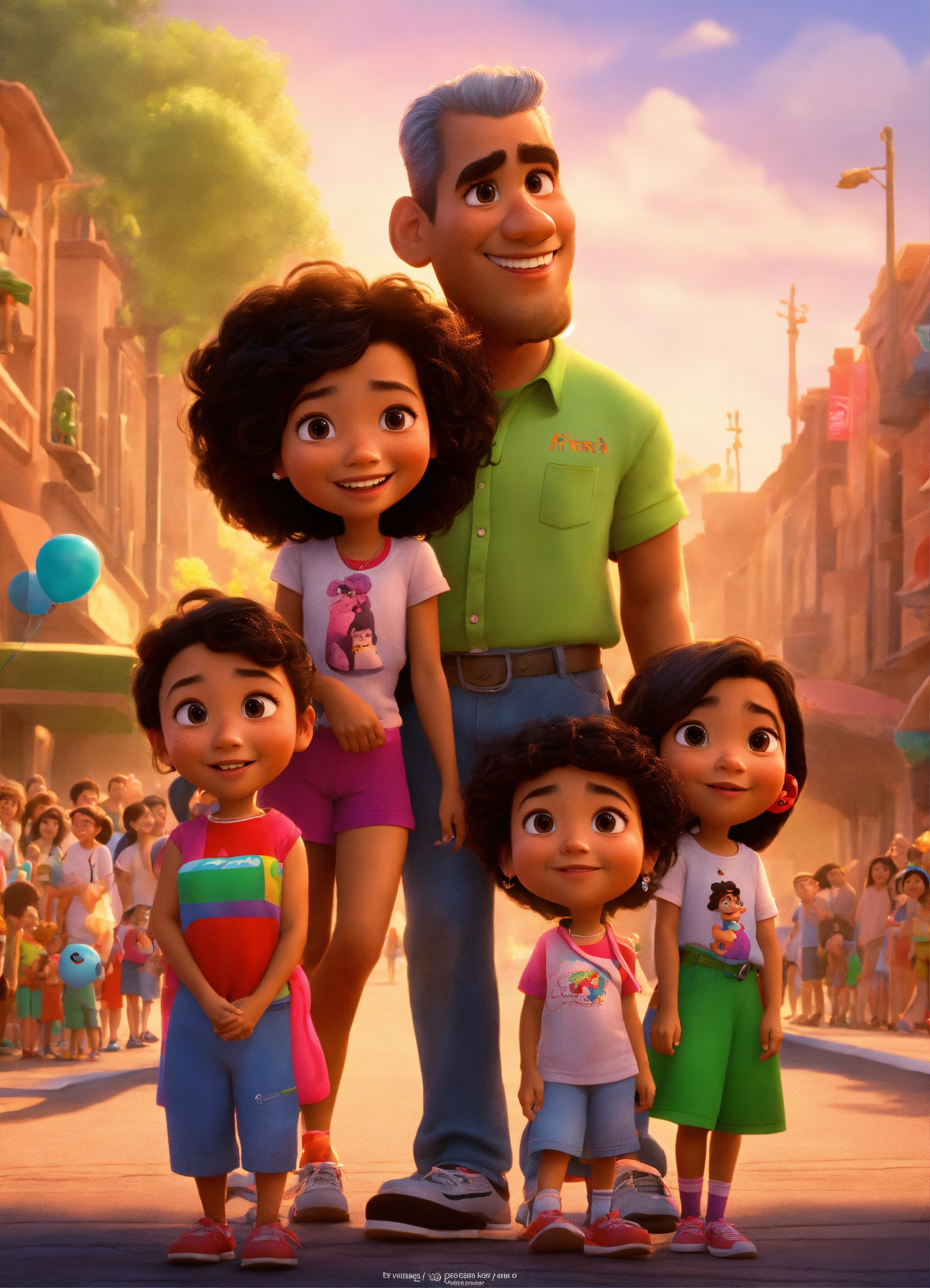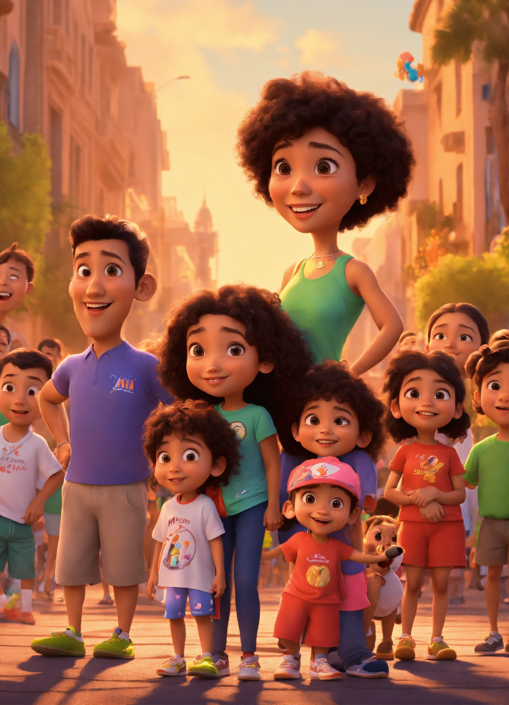 Pixar animation of hispanic 9 yera old mia and her family ensuring the crowd of people gathered at the point are ready for the charity walk, pixar style cartoon
